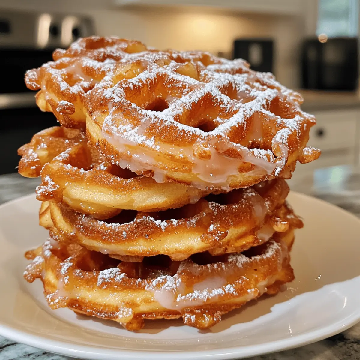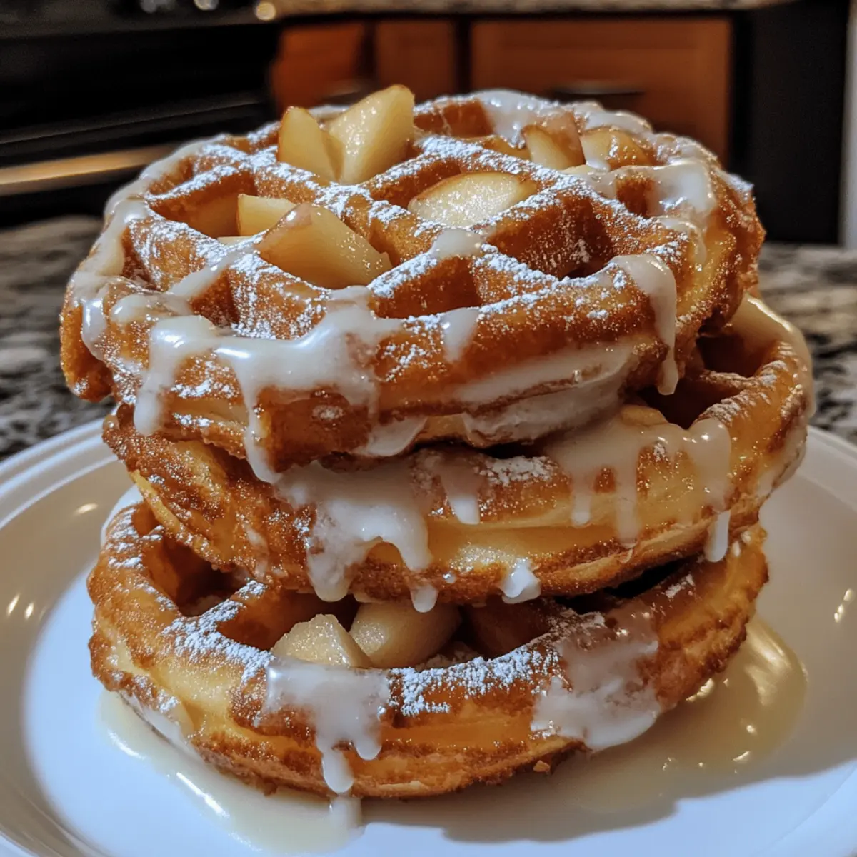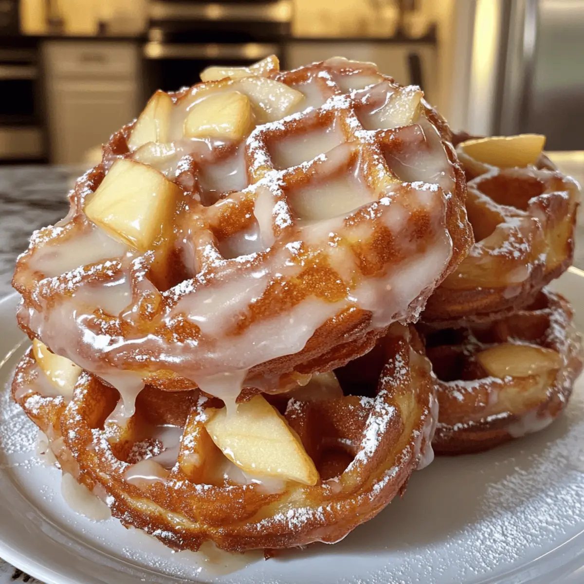 The aroma of warm apples and spices wafts through the kitchen as I fire up my waffle maker, ready to create something truly special. Today, I’m excited to share my recipe for Apple Fritter Waffle Donuts—an irresistible blend of crispy waffle goodness and tender apple fritter charm. These delightful breakfast treats come together in a snap, making them the perfect solution for anyone seeking a satisfying homemade alternative to fast food. With each bite, you’ll savor sweet apple chunks and a hint of cinnamon, all drizzled with a luscious vanilla glaze. Whether it’s a weekend brunch or a cozy breakfast on a weekday, these donuts are a crowd-pleaser that will leave them wanting more. So, aren’t you curious to discover how to whip up these amazing Apple Fritter Waffle Donuts in your own kitchen? Let’s dive into this delicious adventure together! Why are Apple Fritter Waffle Donuts so special? Crispy yet Fluffy: These Apple Fritter Waffle Donuts combine the best of both worlds, giving you that satisfying crunch from the outside and a soft, tender inside. Beginner-Friendly: Perfect for home cooks of all skill levels, this recipe comes together quickly and easily! Wholesome Ingredients: With fresh apples, warm spices, and options for gluten-free substitutes, you can indulge without guilt. Versatile Serving: Enjoy them for breakfast, brunch, or even dessert alongside your favorite coffee or fresh fruit. Sweet Surprise: The addition of a rich vanilla glaze makes each bite feel like a special treat. For more delightful breakfast ideas, don’t miss out on these incredible Cheesecake Stuffed Donuts or the aromatic Hawaiian Pineapple Carrot cake! Apple Fritter Waffle Donuts Ingredients For the Donuts • All-Purpose Flour – This forms the backbone of your donuts; for a healthier spin, try whole wheat or gluten-free flour. • Granulated Sugar – Sweetens the batter beautifully; substitute with coconut sugar or honey for a delightful twist. • Baking Powder – A crucial leavening agent for that light, fluffy texture; be sure it’s fresh for the best rise. • Salt – Enhances the flavors of all your ingredients; don’t skip this step! • Eggs – Adds richness and binds everything together; for a vegan option, consider using an egg substitute. • Milk – Moistens your batter for perfect consistency; almond milk or oat milk work well for dairy-free alternatives. • Unsalted Butter – Infuses richness and moisture; swap with coconut oil to keep it dairy-free. • Vanilla Extract – Elevates the flavor profile—always opt for pure vanilla extract for the best results. • Diced Apples – Freshness and sweetness in every bite; Granny Smith or Honeycrisp apples are recommended for balance. • Ground Cinnamon – Adds warmth that beautifully complements the apples; allspice can be a flavorful alternative. • Nutmeg – Provides a gentle sweetness and warmth; use it sparingly, as a little goes a long way. • Oil (for greasing) – Prevents sticking to the waffle maker, ensuring perfect shapes. For the Glaze • Powdered Sugar – The base for your smooth glaze, adding sweetness without grittiness. • Milk – Helps achieve the perfect glaze consistency; can be substituted with almond milk for a dairy-free option. • Vanilla Extract – Enhance the glaze flavor; use the same pure vanilla extract you used in the batter for harmony. Let’s gather these ingredients and embark on the delightful journey of baking Apple Fritter Waffle Donuts! Step‑by‑Step Instructions for Apple Fritter Waffle Donuts Step 1: Whisk the Dry Ingredients In a large mixing bowl, whisk together 2 cups of all-purpose flour, ¾ cup of granulated sugar, 2 tablespoons of baking powder, and ½ teaspoon of salt. Make sure the mixture is well combined and free of lumps, creating a light and airy base for your Apple Fritter Waffle Donuts. This step sets the foundation for the fluffiness of your donuts. Step 2: Mix the Wet Ingredients In a separate bowl, beat 2 large eggs and mix in 1 cup of milk, ¼ cup of melted unsalted butter, and 1 tablespoon of vanilla extract until smooth. This should take about a minute of vigorous mixing. The wet mixture should be creamy and well combined, providing moisture and richness to balance the dry ingredients in the batter. Step 3: Combine Ingredients Gently pour the egg mixture into the bowl of dry ingredients and use a spatula to fold them together. Mix until just combined; be cautious not to overmix as this can lead to dense donuts. You want the batter to be slightly lumpy, ensuring that the Apple Fritter Waffle Donuts maintain a fluffy texture. Step 4: Add Apples and Spices Fold in 1 ½ cups of diced apples, 1 teaspoon of ground cinnamon, and a dash of nutmeg into the batter. This mixture should be fragrant and colorful with apple pieces peeking through. The addition of apples and spices brings warmth and classic flavors, enhancing the deliciousness of your Apple Fritter Waffle Donuts. Step 5: Preheat the Waffle Maker Preheat your waffle maker while you prepare the batter, ensuring it’s hot and ready for cooking. Lightly grease the cooking surface with cooking oil to prevent the donuts from sticking. A well-preheated waffle maker is essential for achieving those perfectly golden brown Apple Fritter Waffle Donuts. Step 6: Cook the Donuts Spoon the batter into the preheated waffle maker, covering about three-quarters of the surface. Close the lid and cook for 3 to 5 minutes, or until the donuts are golden brown and slightly crisp on the outside. Keep an eye on them, as cooking times can vary depending on your specific waffle maker model. Step 7: Prepare the Glaze While the donuts are cooking, make the glaze by mixing 1 cup of powdered sugar, 2 tablespoons of milk, and 1 teaspoon of vanilla extract in a small bowl. Stir until the mixture is smooth and creamy. The consistency should be pourable but thick enough to coat without dripping off quickly; adjust by adding more mi