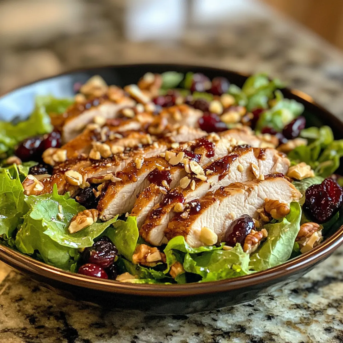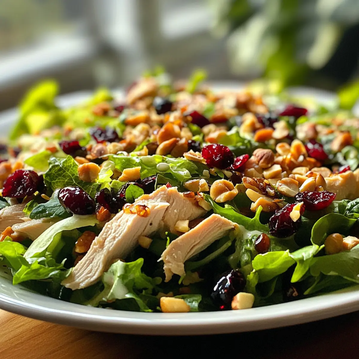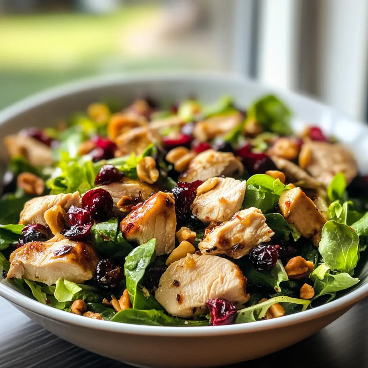As I tossed together this Quick & Easy Asian Chicken Cranberry Salad, the vibrant colors and fresh aromas instantly transported me to a sunlit picnic. In just 15 minutes, this no-cook meal bursts with crunchy textures and the sweetness of cranberries, making it a standout option for those busy weekdays. Not only is it a breeze to whip up, but it also packs a nutritious punch with protein and healthy fats. This salad isn’t just about ease; it’s a delightful way to elevate your lunch game and break free from that fast-food rut. Whether you’re prepping for a family gathering or simply craving something fresh, you’ll find this versatile dish is perfect for any occasion. Curious about how to bring this colorful bowl of goodness to your kitchen? Let’s dive in! Why Choose Asian Chicken Cranberry Salad? Quick, No-Cook Delight: This salad is a fantastic option for those busy days when you need a wholesome meal without turning on the stove. Bold Flavors: A zesty soy dressing brings the perfect balance of umami and sweetness, while the cranberries add a delightful pop of flavor. Nutrient-Packed: With tender chicken and mixed greens, you’ll enjoy a meal rich in protein, vitamins, and minerals. Endless Customization: Feel free to adapt this recipe by adding your favorite veggies or swapping in proteins like shrimp for a unique twist, just as you’d love in Buffalo Chicken Taquitos. Crowd-Pleasing: Whether for a picnic, potluck, or simple family dinner, this dish is sure to impress your guests with its vibrant colors and tastes! Asian Chicken Cranberry Salad Ingredients • Perfect for your next meal prep! For the Salad Cooked Chicken Breast – Provides protein and substance to the salad; use rotisserie chicken for extra convenience. Cranberries – Add sweetness and vibrant color; substitute dried cranberries with raisins for a different flavor. Mixed Greens (or Lettuce) – Creates a fresh base; opt for crisp varieties to enhance the salad’s crunch. For the Dressing Soy Sauce (or Tamari for gluten-free) – Adds umami depth; consider low-sodium soy sauce to keep it lighter. Olive Oil – Acts as a base for the dressing, providing richness; can be replaced with vegetable oil if needed. Rice Vinegar – Gives a tangy note; apple cider vinegar can serve as a substitute if unavailable. Honey (or Agave Syrup) – Naturally sweetens the dressing; maple syrup is a great vegan alternative. For the Topping Toasted Nuts (Pecans or Cashews) – Provide added crunch; use toasted sunflower seeds for a nut-free option. Step‑by‑Step Instructions for Asian Chicken Cranberry Salad Step 1: Prepare the Salad Base In a large mixing bowl, add your chopped cooked chicken breast, either shredded or diced for convenience. Throw in a generous handful of mixed greens, ensuring a colorful base for your salad. Then, sprinkle in dried cranberries to infuse sweetness and a pop of color. Aim for a vibrant mix within 5 minutes to kickstart your assembly. Step 2: Whisk Together the Dressing In a separate small bowl, combine 2 tablespoons of soy sauce (or tamari for gluten-free), 3 tablespoons of olive oil, 1 tablespoon of rice vinegar, and 1 tablespoon of honey. Whisk together these ingredients until they form a smooth and cohesive dressing, about 1 minute. The dressing should have a balanced flavor and a slightly glossy texture, ready to enhance your Asian Chicken Cranberry Salad. Step 3: Combine and Toss the Salad Pour the prepared dressing over the salad mixture in your large bowl. Using two forks or salad tongs, gently toss the salad to coat all ingredients evenly with the dressing. Take care not to mangle the greens or cranberries; this step should take about 1–2 minutes. The salad should appear well mixed and inviting, with a glistening finish from the dressing. Step 4: Serve and Enjoy Distribute the vibrant Asian Chicken Cranberry Salad into serving dishes, or enjoy it in lettuce cups, croissants, or wraps for added flair. You could also pair it with whole-grain crackers for a satisfying crunch. Serve immediately for the best texture; this refreshing dish is perfect for lunch or as a light snack that brings joy in every bite! Expert Tips for Asian Chicken Cranberry Salad Meal Prep Magic: Store the salad and dressing separately to keep the greens crisp and fresh until serving. Mix just before you’re ready to indulge! Crunch Factor: Add toasted nuts right before eating to maintain their delightful crunch, as they can lose texture if mixed too soon in the Asian Chicken Cranberry Salad. Dressing Control: Use a little dressing at first, then gradually add more to taste. This way, you can avoid a soggy salad and ensure each bite is perfectly flavored. Customize Freely: Feel free to swap in your favorite veggies or proteins like shrimp to make this salad uniquely yours while keeping it healthy and vibrant. Flavor Boosting: For an even zestier dressing, experiment by adding a dash of sesame oil or freshly grated ginger, giving your Asian Chicken Cranberry Salad an exciting twist! Storage Tips for Asian Chicken Cranberry Salad Fridge: Store leftovers in an airtight container for up to 2 days, keeping the salad fresh and crunchy. Dressing: Keep the dressing separate until you’re ready to serve to maintain the crispness of the greens. Nuts: If you’ve added toasted nuts, store them separately and add just before consumption for optimal crunch. Reheating: This dish is best enjoyed cold, so simply chill it after preparation and enjoy redecorating your lunch. What to Serve with Quick & Easy Asian Chicken Cranberry Salad Elevate your dining experience with delightful sides that complement this zesty salad beautifully, creating a well-rounded meal. Cucumber Salad: This refreshing side adds a cool crunch that contrasts perfectly with the savory and sweet notes of the salad. Brown Rice or Quinoa: A fluffy grain base enriches the meal, offering a healthy source of fiber and keeping hunger at bay. Toasted Garlic Bread
