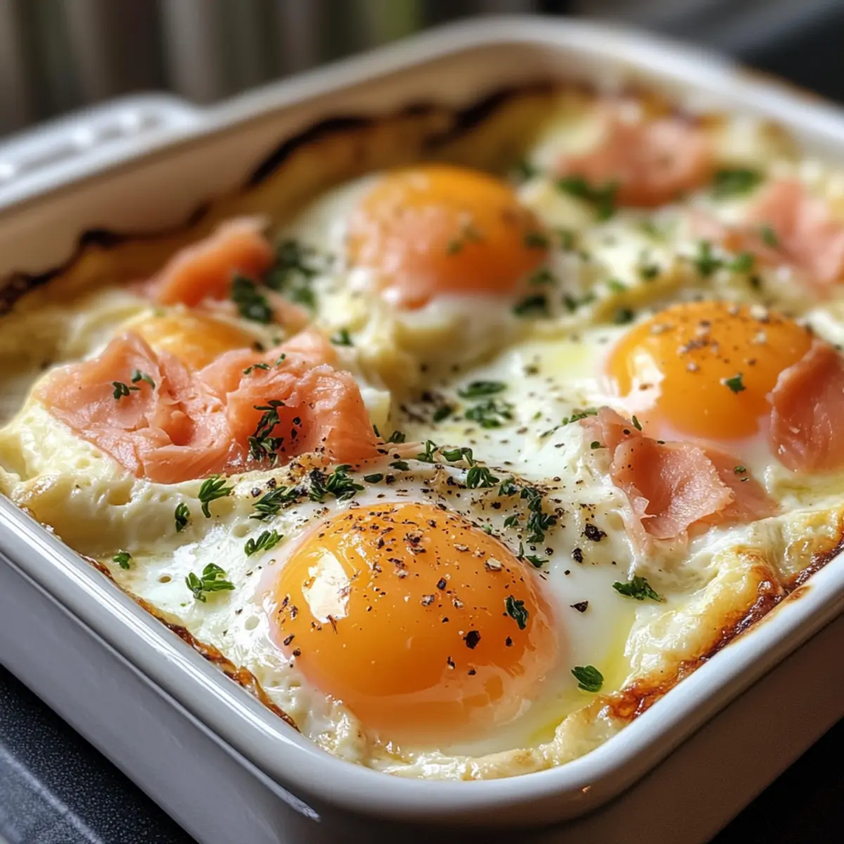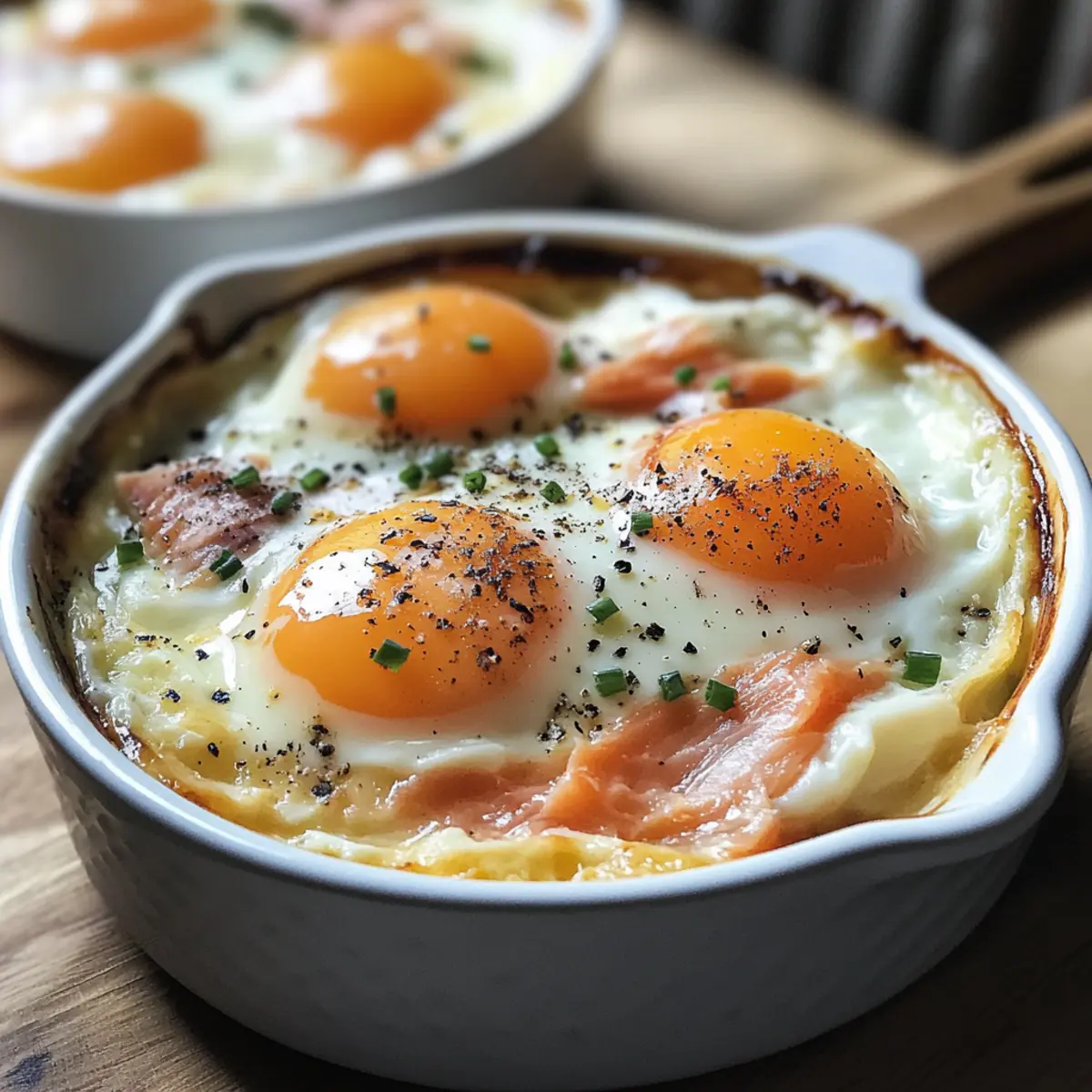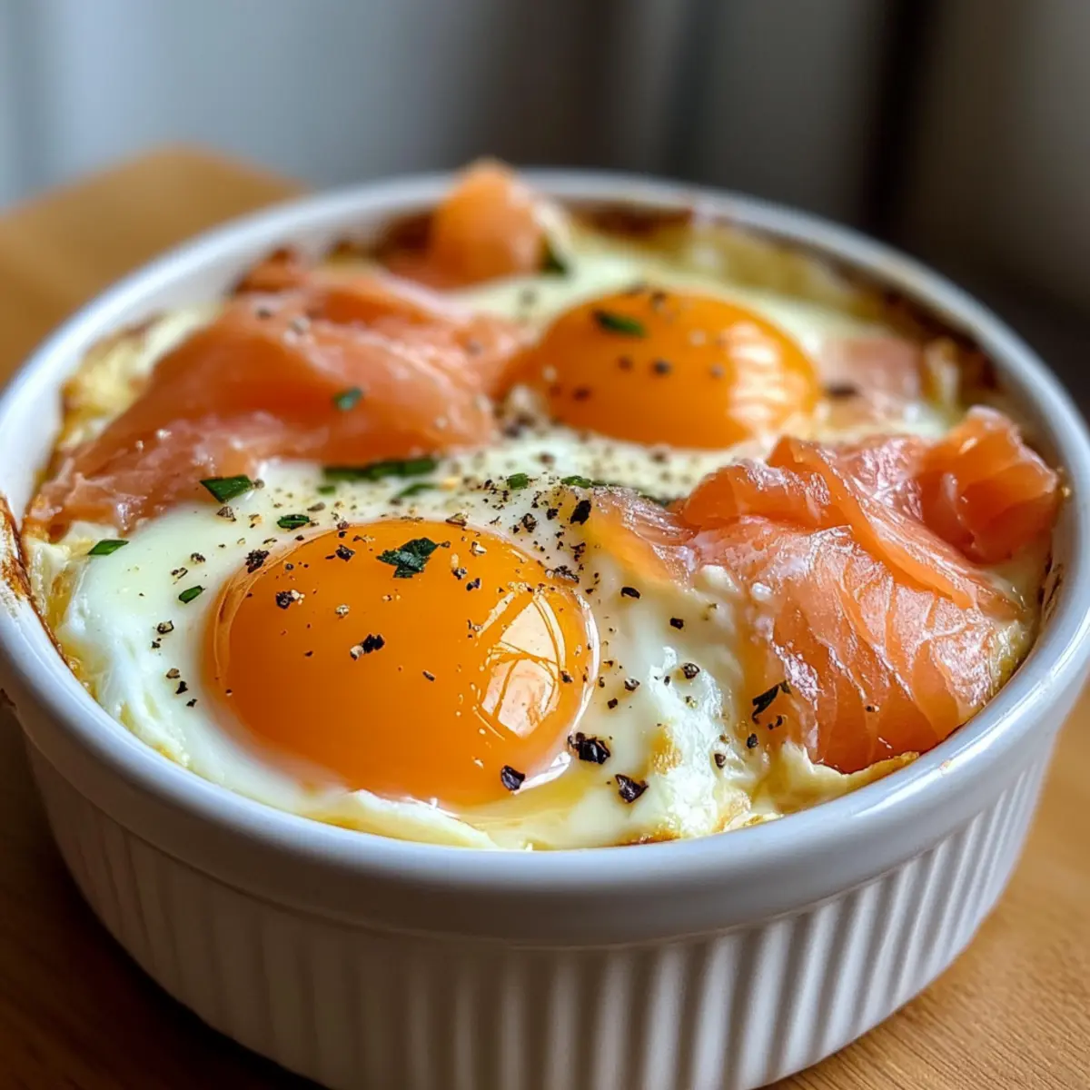 “Have you ever found yourself craving a cozy brunch that feels indulgent yet uncomplicated?” That’s how I stumbled upon the exquisite world of Baked Eggs with Smoked Salmon, or as the French call it, Eggs en Cocotte. This dish is a true triumph in terms of elegance and flavor, transforming simple ingredients into a stunning centerpiece for any breakfast table. With just 20 minutes of prep time, you’ll experience the joy of silky whites and jammy yolks swimming in a luscious mixture of crème fraîche and savory smoked salmon. Not only is this recipe a delightful gluten-free brunch option, but it also adapts beautifully, giving you the freedom to get creative with variations—think crispy bacon or Mediterranean-inspired spinach and feta. So, are you ready to elevate your next brunch gathering with this scrumptious dish? Why Baked Eggs are a Must-Try? Simplicity: This recipe is incredibly straightforward, requiring only basic cooking skills to create a stunning dish. Gourmet Vibes: The addition of smoked salmon and crème fraîche elevates your breakfast from ordinary to extraordinary, impressing everyone at the table. Versatility: Feel free to swap ingredients! Options like crispy bacon or sautéed spinach keep your brunch fresh and exciting every time. Quick Preparation: In just 20 minutes, you can whip up this elegant dish, making it perfect for busy mornings or last-minute gatherings. Crowd-Pleaser: From brunch enthusiasts to picky eaters, everyone will adore the rich flavors and creamy texture of these Eggs en Cocotte. For more delightful brunch ideas, check out my post on Baked Feta Eggs or Spicy Chili Eggs. Baked Eggs with Smoked Salmon Ingredients For the Ramekins Unsalted Butter – Ideal for greasing ramekins; you can also use oil or cooking spray as a substitute. Smoked Salmon – Provides a delicious, smoky flavor; leftover baked salmon or other smoked fish makes a great swap. Crème Fraîche – Adds creaminess and tang; feel free to substitute with sour cream if needed. Fresh Dill – Brings a burst of freshness; chives or parsley can be used as delightful alternatives. Large Eggs – The star of the dish, transforming into a creamy delight when baked. For the Creamy Base Heavy Cream – Infuses richness and depth; milk can be a lighter alternative if you prefer. Kosher Salt – Enhances the flavors beautifully; sea salt or table salt are good substitutes. Freshly Ground Black Pepper – Offers seasoning that rounds out the dish; white pepper works well too. For Cooking Boiling Water – Essential for creating a water bath that ensures even cooking; don’t skip this step! Optional Accompaniments Baguette/Brioche Sticks – Perfect for serving, adding a delightful crunchy contrast to the creamy eggs. These decadent Baked Eggs with Smoked Salmon will have everyone savoring every mouthful! Step‑by‑Step Instructions for Baked Eggs with Smoked Salmon Step 1: Preheat and Prepare Begin by preheating your oven to 375°F (190°C). While the oven warms up, use unsalted butter to generously grease four ramekins, ensuring each is well-coated for easy egg release. Place the greased ramekins inside a baking dish for a convenient setup before you move on to layering the ingredients. Step 2: Layer the Salmon and Cream In each prepared ramekin, start by layering 1 ounce of smoked salmon, allowing it to cover the base generously. Next, dollop in 1 tablespoon of crème fraîche, spreading it evenly to create a luscious bottom layer that will complement the eggs. Finish this layer by sprinkling in 1 teaspoon of fresh dill for that aromatic touch. Step 3: Add Eggs and Cream Gently crack one large egg into each ramekin, ensuring not to break the yolk. Top each egg with 1 tablespoon of heavy cream for added richness, which will create a creamy texture during baking. Season generously with kosher salt and freshly ground black pepper to enhance the flavors in your baked eggs with smoked salmon. Step 4: Prepare the Water Bath Once your ramekins are filled, carefully fill the baking dish with boiling water until it reaches halfway up the sides of the ramekins. This water bath is crucial for ensuring that your eggs cook evenly and gently, resulting in perfectly creamy whites and runny yolks. Step 5: Bake the Eggs Place the baking dish in the preheated oven and let the eggs bake for 15 to 20 minutes. Check at the 15-minute mark; the whites should be set but the yolks should remain soft and slightly jiggly. For an ideal runny yolk, aim for around 15 to 17 minutes, keeping a close eye on the doneness. Step 6: Serve Immediately Once the baking time is up, carefully remove the baking dish from the oven using oven mitts. Let the ramekins rest for a moment, then serve your luscious baked eggs with smoked salmon right away. Garnish with additional fresh dill or chives, and don’t forget some crispy baguette or brioche sticks on the side for a delightful contrast. Make Ahead Options These Baked Eggs with Smoked Salmon are perfect for busy home cooks looking to streamline brunch preparation! You can layer the ingredients—smoked salmon, crème fraîche, and dill—up to 24 hours in advance, ensuring a delightful assembly on the day of serving. Simply cover the ramekins with plastic wrap and refrigerate to maintain freshness. When you’re ready to bake, crack the eggs into the prepared ramekins, add the heavy cream, and season as desired. Bake immediately in a water bath, ensuring the lovely creamy texture remains just as delicious. This simple make-ahead method means you can whip up a restaurant-quality brunch with minimal effort! Expert Tips for Baked Eggs Crack Carefully: Avoid broken yolks by cracking eggs into a separate bowl first before transferring them to the ramekins. Watch the Time: Keep a close eye on baking times; use a timer to ensure your baked eggs with smoked salmon don’t overcook and firm up. Serve Fresh: For the best texture, serve the eggs immediately after baking to enjoy th