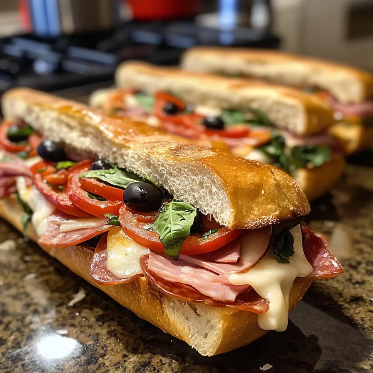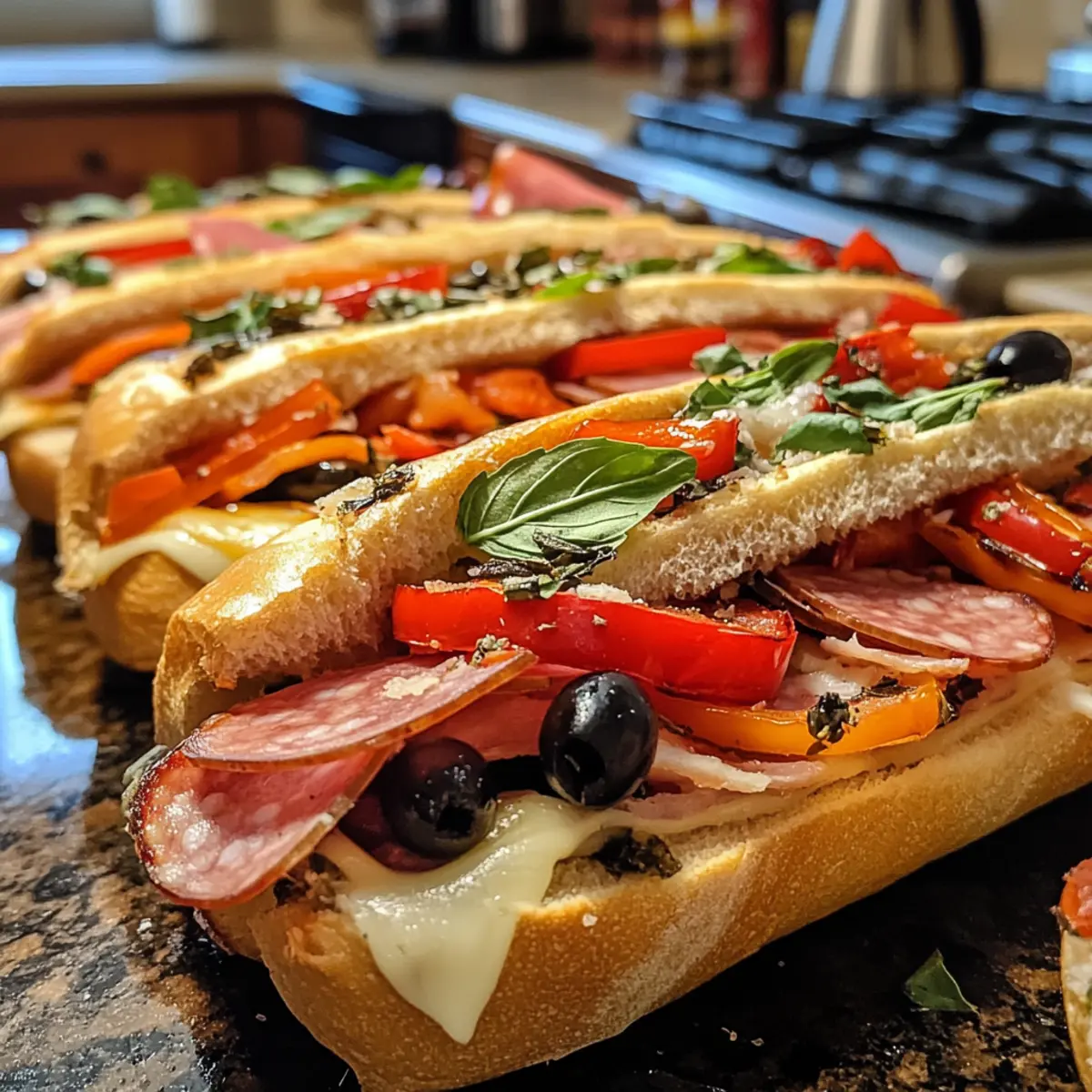 As the aroma of melting cheese and savory Italian meats wafted through my kitchen, I couldn’t help but smile. Baked Italian Grinder Sandwiches are the ultimate comfort food, perfect for cozy nights when you crave something hearty yet easy to prepare. With layers of deliciousness tucked into toasted hoagie rolls, each bite offers a delightful crunch paired with gooey cheese and zesty marinara. This recipe not only brings the flavors of a classic Italian sub to your home but also works wonders as a crowd-pleaser, making it ideal for gatherings. Whether you’re hosting friends or enjoying a quiet dinner, these sandwiches promise satisfaction. Curious about how to create this culinary masterpiece? Let’s dive into the recipe and get cooking! Why Are These Sandwiches So Irresistible? Comforting Crunch: Each bite of these Baked Italian Grinder Sandwiches delivers a delightful contrast of crispy golden bread and gooey cheese. Layered Goodness: They’re bursting with savory Italian meats and zesty marinara, elevating your sandwich game to new heights. Crowd-Pleasing Treat: Perfect for gatherings, this recipe is sure to impress guests and family alike. Quick and Easy: With simple preparation and short baking time, you can enjoy homemade goodness without the fuss. Endless Customization: Feel free to swap in grilled veggies or different cheeses to make it your own. Dive into this warm and satisfying recipe and feel the love with every bite! For a variation, check out my Giant Italian Combo for another crowd favorite! Baked Italian Grinder Sandwich Ingredients For the Sandwiches • Italian sub rolls – A sturdy bread providing softness inside and a crispy crust; can substitute with hoagie rolls or ciabatta. • Unsalted butter, melted – Adds richness and helps crisp the bread; no substitutions for flavor enhancement. • Garlic powder – Provides deep, savory aroma and flavor; substitute with minced fresh garlic if desired. • Onion powder – Enhances richness and rounds out the flavor; may be substituted with finely chopped cooked onions. • Dried oregano – An essential Italian herb that complements cheeses and meats; fresh oregano can substitute; use more than dried. • Dried basil – Adds a sweet, peppery note; substitute with fresh basil, using more for extra flavor. • Red pepper flakes – Provides a spicy kick; you can omit for milder sandwiches or use jalapeños for more heat. • Salt – Enhances all flavors; unalterable for overall seasoning. • Black pepper – Adds subtle sharpness; no substitution recommended. • Deli-sliced salami – Brings flavorful richness; substitute with turkey or roast beef for a lighter option. • Deli-sliced ham – Adds sweetness and balance to meats; turkey can be a lighter replacement. • Deli-sliced pepperoni – Contributes bold flavor; omit for vegetarian variants or use extra cheese. • Deli-sliced mozzarella cheese – Melts beautifully for creaminess; swap with provolone for different flavor profiles. • Deli-sliced provolone cheese – Adds sharp, smoky flavor; no recommended substitutions for authentic taste. • Grated Parmesan cheese – Provides a crispy, savory topping; substitute with Pecorino Romano for a sharper taste. • Roasted red peppers, sliced – Adds sweetness and color; fresh bell peppers can be used. • Sliced black olives – Provides briny contrast; omit for a different flavor profile. • Banana peppers, sliced – Adds tang and crunch; jalapeños can substitute for more heat. • Fresh basil leaves – Imparts brightness and freshness; use other greens like arugula for a variant. Step‑by‑Step Instructions for Baked Italian Grinder Sandwiches Step 1: Preheat the Oven Begin by preheating your oven to 375°F (190°C). This temperature is essential for achieving that golden, crispy exterior on your Baked Italian Grinder Sandwiches. While the oven is warming, gather your ingredients, creating an organized workspace that makes the upcoming assembly smooth and enjoyable. Step 2: Prepare the Rolls Carefully slice each Italian sub roll in half lengthwise, ensuring they remain connected at the bottom. This creates a sturdy sandwich base while allowing for easy filling. Position the rolls cut side up on a baking sheet, making sure not to overcrowd them, as this will allow for even warmth and crisping during baking. Step 3: Mix the Butter Blend In a bowl, pour in the melted unsalted butter, then add garlic powder, onion powder, dried oregano, dried basil, red pepper flakes, salt, and black pepper. Whisk the mixture until thoroughly combined. This fragrant butter blend will enhance the flavor of your Baked Italian Grinder Sandwiches, so be sure to mix it well before moving to the next step. Step 4: Brush the Rolls Using a pastry brush, generously coat the cut sides of each roll with the prepared butter blend. Ensure an even layer to promote a crispy crust while baking. As you brush, take in the savory aroma filling your kitchen; this will add depth to the overall taste of your sandwiches. Step 5: Layer the Meats Start layering your deli-sliced salami, ham, and pepperoni on the bottom half of each roll. Make sure to distribute the meats evenly to ensure every sandwich has a delightful combination of flavors. The richness of the meats is what elevates these Baked Italian Grinder Sandwiches to something truly special. Step 6: Add the Cheeses Next, sprinkle the deli-sliced mozzarella cheese over the meats, followed by the provolone and a generous scattering of grated Parmesan. This cheese trio not only adds a gooeyness but also contributes to that luscious texture in each bite. You’ll want to cover the fillings well to ensure melty goodness. Step 7: Top with Veggies Add sliced roasted red peppers and black olives on top of the cheese for sweetness and brininess. Then layer with banana peppers and fresh basil leaves, allowing these vibrant ingredients to shine through their textures and flavors. Each sandwich will