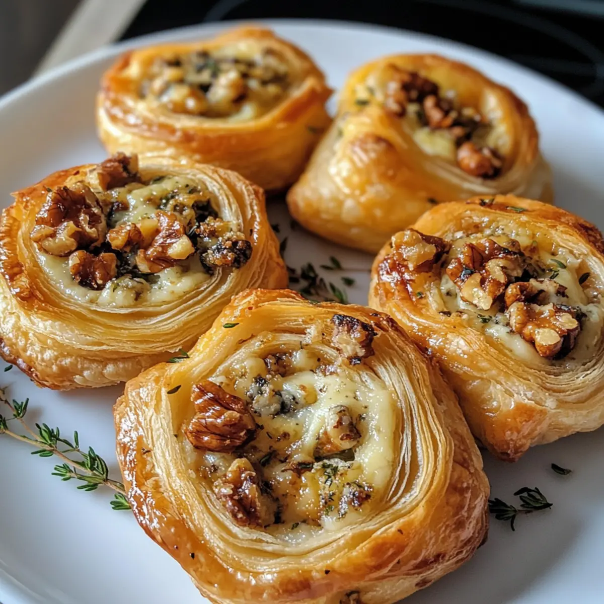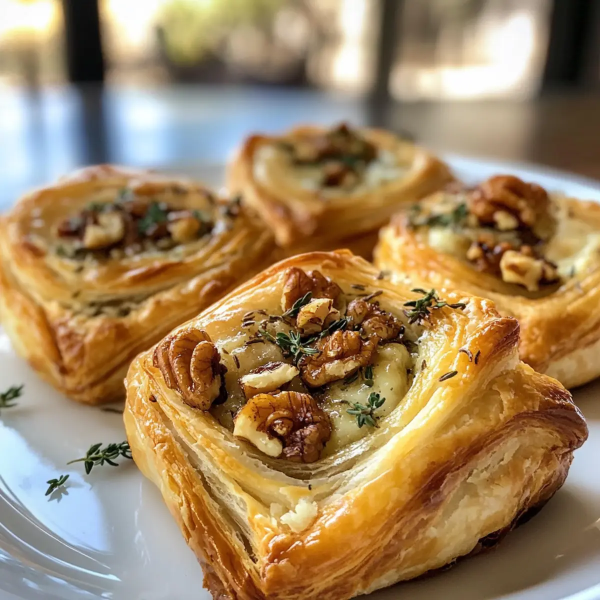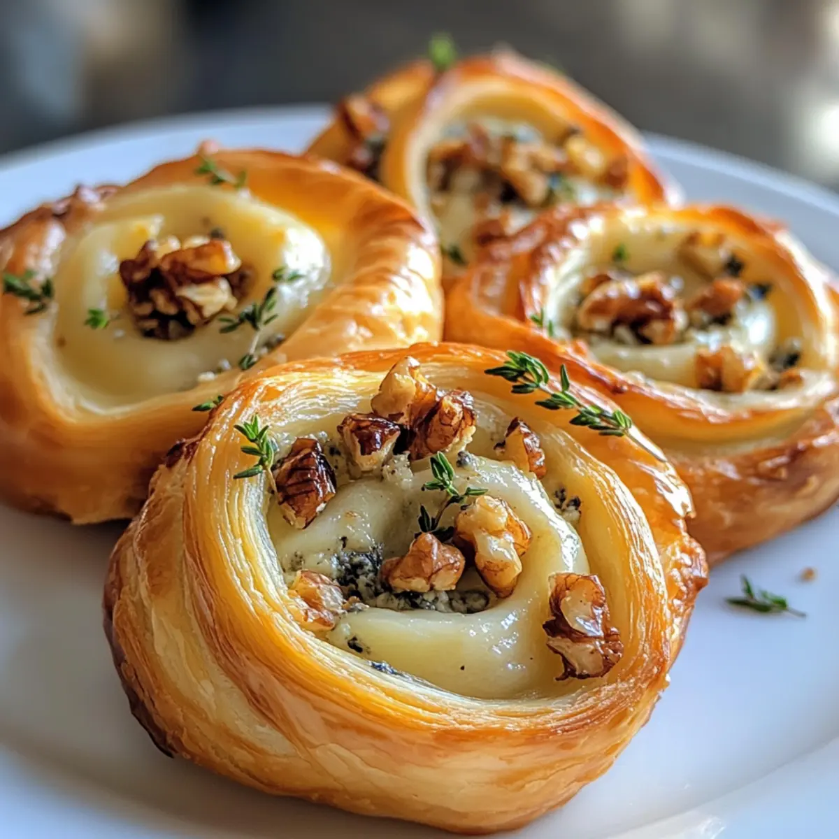 As the warm, buttery aroma of puff pastry fills the kitchen, I can’t help but feel a rush of excitement. These Savory Blue Cheese Walnut Thyme Puff Pastry Twirls are not just a dish; they’re a delightful celebration of flavors that transforms any gathering into a chic event. The rich tang of blue cheese mingles beautifully with the earthy crunch of walnuts and a hint of fresh thyme, creating a vegetarian-friendly appetizer that feels indulgent yet effortless. Perfect for impressing guests or enjoying a cozy night in, these twirls offer a delightful balance of sophistication and ease. Curious about how to make these gourmet bites that will leave everyone asking for the recipe? Let’s dive into this irresistible culinary adventure! Why Are These Puff Pastry Twirls Irresistible? Unmatched Elegance: Perfect for elevating any gathering, these twirls bring a touch of sophistication to your table. Easy to Make: With just a few simple steps, even novice cooks can impress guests with this gourmet appetizer. Versatile Ingredients: Feel free to customize by swapping blue cheese for goat cheese or omitting walnuts for a nut-free delight. Crowd-Pleasing Flavor: The combination of creamy cheese, crunchy walnuts, and aromatic thyme is sure to leave your guests raving about your cooking skills. Ideal for Any Occasion: Whether it’s a chic cocktail party or a cozy family dinner, these savory delights are perfect for sharing. For another delightful appetizer idea, try these Cheese Fatayer Savory Pockets. Blue Cheese Walnut Thyme Puff Pastry Twirl Ingredients For the Pastry • Puff Pastry – A flaky, airy base; use store-bought for convenience or homemade if you’re feeling adventurous. • Milk – Helps achieve a golden finish; substitute with nondairy milk for a vegan option. For the Filling • Blue Cheese – Adds a rich, tangy flavor; swap it out for goat cheese to suit different palates. • Parmesan Cheese – Enhances the umami goodness; use nutritional yeast as a vegan alternative. • Walnuts – Provides a delightful crunch and healthy fats; feel free to replace with sunflower or pumpkin seeds for a nut-free version. • Fresh Thyme – Infuses an aromatic quality; use dried thyme in half the amount if fresh isn’t available. • Sea Salt & Cracked Pepper – These elevate all the flavors; adjust to your taste preference. For the Sweet Note • Honey – Balances the savory with a touch of sweetness; maple syrup can be used for a different flavor twist. Embrace the irresistible combination of textures and flavors in these indulgent Blue Cheese Walnut Thyme Puff Pastry Twirls that will surely impress and satisfy. Step‑by‑Step Instructions for Blue Cheese Walnut Thyme Puff Pastry Twirl Step 1: Preheat the Oven Begin by preheating your oven to 180°C (350°F), or 200°C (390°F) for a non-fan forced oven. This step is crucial for achieving that perfectly golden and flaky texture. While the oven heats, prepare your baking sheet by lining it with parchment paper, ensuring easy cleanup after baking your delicious Blue Cheese Walnut Thyme Puff Pastry Twirls. Step 2: Prepare the Puff Pastry Lay out your puff pastry sheets on a clean, flat surface. Drizzle 1 tablespoon of honey evenly over each sheet, allowing its sweetness to seep into the pastry. This initial step adds a delightful balance to the savory filling. Take a moment to visualize the delicious layers you’re creating as the honey starts to glisten against the pastry. Step 3: Add the Filling Sprinkle the chopped walnuts, blue cheese, and Parmesan generously across the puff pastry sheets. Be sure to scatter the fresh thyme leaves, sea salt, and cracked pepper evenly on top for a burst of flavor in every bite. With this savory filling, your Blue Cheese Walnut Thyme Puff Pastry Twirls are coming to life, bringing together delightful textures and flavors. Step 4: Roll the Pastry With the filling spread evenly, carefully roll each pastry sheet tightly from one end to the other, creating a beautiful log shape. Once rolled, cut each log in half lengthwise, paying attention to keep the filling intact. Tuck in the edges if necessary to secure the delicious ingredients within, ensuring a neat and attractive presentation. Step 5: Twist and Coil Take each half of the rolled pastry and gently twist it, forming a lovely spiraled shape. Coil each twisted strand into a round shape and place it on the prepared baking sheet. This step not only adds visual appeal but also helps create the airy texture we want in our Blue Cheese Walnut Thyme Puff Pastry Twirls. Step 6: Brush and Bake Once all your pastries are shaped and placed on the baking sheet, brush the tops with milk for a stunning golden finish. Now, pop the baking sheet into the oven and bake for 25-30 minutes. Keep an eye on your pastries; they should puff beautifully and turn a lovely golden brown, filling your kitchen with mouth-watering aromas. Step 7: Serve and Garnish When your puff pastry twirls are ready, remove them from the oven and let them cool for a minute. For an extra touch, sprinkle some additional fresh thyme leaves on top just before serving. These delightful Blue Cheese Walnut Thyme Puff Pastry Twirls can be enjoyed warm or at room temperature, making them perfect for any occasion or gathering. Storage Tips for Blue Cheese Walnut Thyme Puff Pastry Twirls Fridge: Store any leftover Blue Cheese Walnut Thyme Puff Pastry Twirls in an airtight container for up to 3 days to maintain freshness and flavor. Freezer: If you’d like to keep them longer, freeze the untwisted pastries before baking. Wrap each tightly in plastic wrap and then place in a freezer bag. They can last for up to 2 months. Reheating: To reheat, preheat your oven to 180°C (350°F) and bake thawed twirls for 10-15 minutes, or until warmed through and crispy again. Room Temperature: These puff pastry twirls can be left at room temperature for about 2 hours during serving, but be sure to refrigerate any uneaten