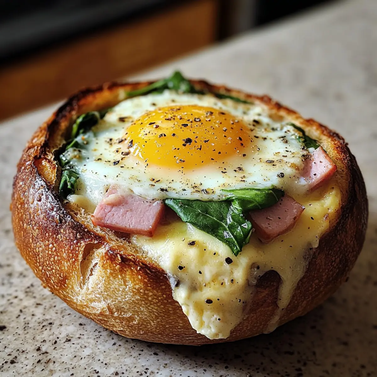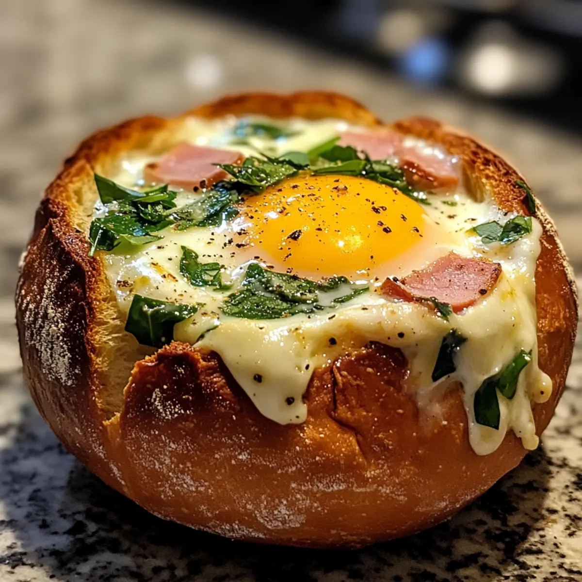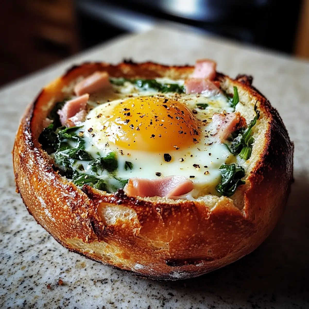 As I flipped through my recipe notebook one morning, a particular note caught my eye: “Breakfast Egg Bread Bowls.” The idea of transforming breakfast into a hearty and fun dish had me hooked right away! Perfectly portable and packed with savory ham, creamy eggs, and melted cheese, these adaptable bowls are not only a delicious way to start your day but also a fantastic 30-minute meal for busy mornings or relaxed brunches. Each bread bowl offers a delightful contrast in textures, and you can customize it to suit your cravings. Whether you stick to classic fillings or experiment with something new, these Breakfast Egg Bread Bowls are sure to impress your family and friends. Are you ready to whip up a delightful breakfast that’ll have everyone asking for seconds? Let’s dive in! Why Are Breakfast Egg Bread Bowls So Special? Simplicity at its best: These easy-to-follow bread bowls come together in just 30 minutes, making them a perfect choice for busy mornings or weekend brunches. Customizable fillings: You can switch up the flavors by adding different ingredients like turkey or veggies, ensuring there’s something for everyone! Savory satisfaction: The delightful combination of warm, creamy eggs, savory ham, and melted cheese creates a heartwarming treat that’s filling and delicious. Unique presentation: Serving breakfast in edible bowls makes for a fun, visually appealing dish that will impress your guests and elevate your brunch experience. Crowd-pleasing appeal: Whether you’re hosting a family gathering or preparing a weekday breakfast, these bowls are sure to have everyone coming back for more. For more delightful breakfast ideas, consider trying these Baked Feta Eggs or whip up some Gingerbread Pancakes for a sweet twist! Breakfast Egg Bread Bowls Ingredients • Make your breakfast memorable with these ingredients for scrumptious Breakfast Egg Bread Bowls! For the Bread Bowls • Crusty Rolls – These act as the perfect edible vessel; look for sturdy, sourdough or artisan-style rolls. For the Filling • Large Eggs – Fresh eggs provide the ideal creaminess; feel free to use free-range or organic for even better flavor. • Deli Ham – This adds a savory punch; try substituting with turkey, bacon, or a plant-based option for variety. • Shredded Mozzarella Cheese – Melts perfectly to create rich flavor; cheddar or dairy-free alternatives will work beautifully too. • Baby Spinach – Adds freshness and a pop of color; you can swap it out for kale or other leafy greens for a twist. Seasoning & Garnish • Sea Salt – Adjust according to taste; it brings out all the flavors effectively. • Green Onion – Offers a mild onion finish; feel free to replace it with chives or skip it altogether if desired. Now that you have everything ready, you’re one step closer to crafting those delightful Breakfast Egg Bread Bowls! Step-by-Step Instructions for Breakfast Egg Bread Bowls Step 1: Preheat the Oven Begin by preheating your oven to 350°F (175°C). This ensures that your Breakfast Egg Bread Bowls will be baked evenly and thoroughly. While the oven is warming up, gather all your ingredients and equipment, including a baking sheet lined with parchment paper or a silicone baking mat for easy cleanup. Step 2: Prepare the Bread Bowls Next, take your crusty rolls and carefully cut off the top quarter of each one. Using a spoon, gently hollow out the interior, removing enough bread to create space for your filling while keeping the outer structure intact. Set the hollowed bread bowls onto the prepared baking sheet, ready for filling. Step 3: Add the Ham Place a slice of deli ham at the bottom of each hollowed-out bread bowl. This base layer not only adds savory flavor but also helps to prevent the egg from making the bread soggy. Make sure the ham fits snugly, creating a sturdy foundation for your Breakfast Egg Bread Bowls. Step 4: Layer the Spinach and Cheese Now, add a handful of fresh baby spinach on top of the ham in each bowl. Follow this by sprinkling half of the shredded mozzarella cheese over the spinach. The warmth from the egg will wilt the spinach while melting the cheese, creating a deliciously savory filling. Step 5: Crack in the Eggs Carefully crack one large egg into the center of each bread bowl. Be cautious not to break the yolk unless you prefer it that way! Season each egg with a pinch of sea salt, enhancing the flavors as it bakes. The egg will create a creamy texture that binds all the delicious fillings together. Step 6: Top with More Cheese Sprinkle the remaining mozzarella cheese generously over the eggs in each bread bowl. This extra layer of cheese will melt beautifully during baking, adding a rich, gooey texture. It also creates a lovely golden-brown crust on top, making your Breakfast Egg Bread Bowls even more mouthwatering. Step 7: Bake to Perfection Place the baking sheet into your preheated oven and bake for 20-30 minutes. Keep an eye on the bowls, and remove them once the eggs are cooked to your liking. If you prefer runny yolks, check for doneness around the 20-minute mark, and adjust accordingly. Step 8: Garnish and Serve After baking, remove your Breakfast Egg Bread Bowls from the oven and let them cool for a minute. Garnish each bowl with chopped green onion for a fresh, mild onion kick. Serve these delightful bowls hot, and watch your family or guests delight in this fun and filling breakfast treat! What to Serve with Breakfast Egg Bread Bowls The perfect accompaniment can elevate your cozy breakfast experience, adding layers of flavor and enjoyment. Fresh Fruit Salad: A refreshing mix of seasonal fruits brings brightness and a hint of sweetness, balancing the savory flavors of the bread bowls. Crispy Hash Browns: Golden, crunchy hash browns offer a satisfying texture that pairs beautifully with the creamy filling of the bowls, making every bite delightful. Yogurt Parfait: Layered with granola and berries, a yogurt parfait adds a creamy and