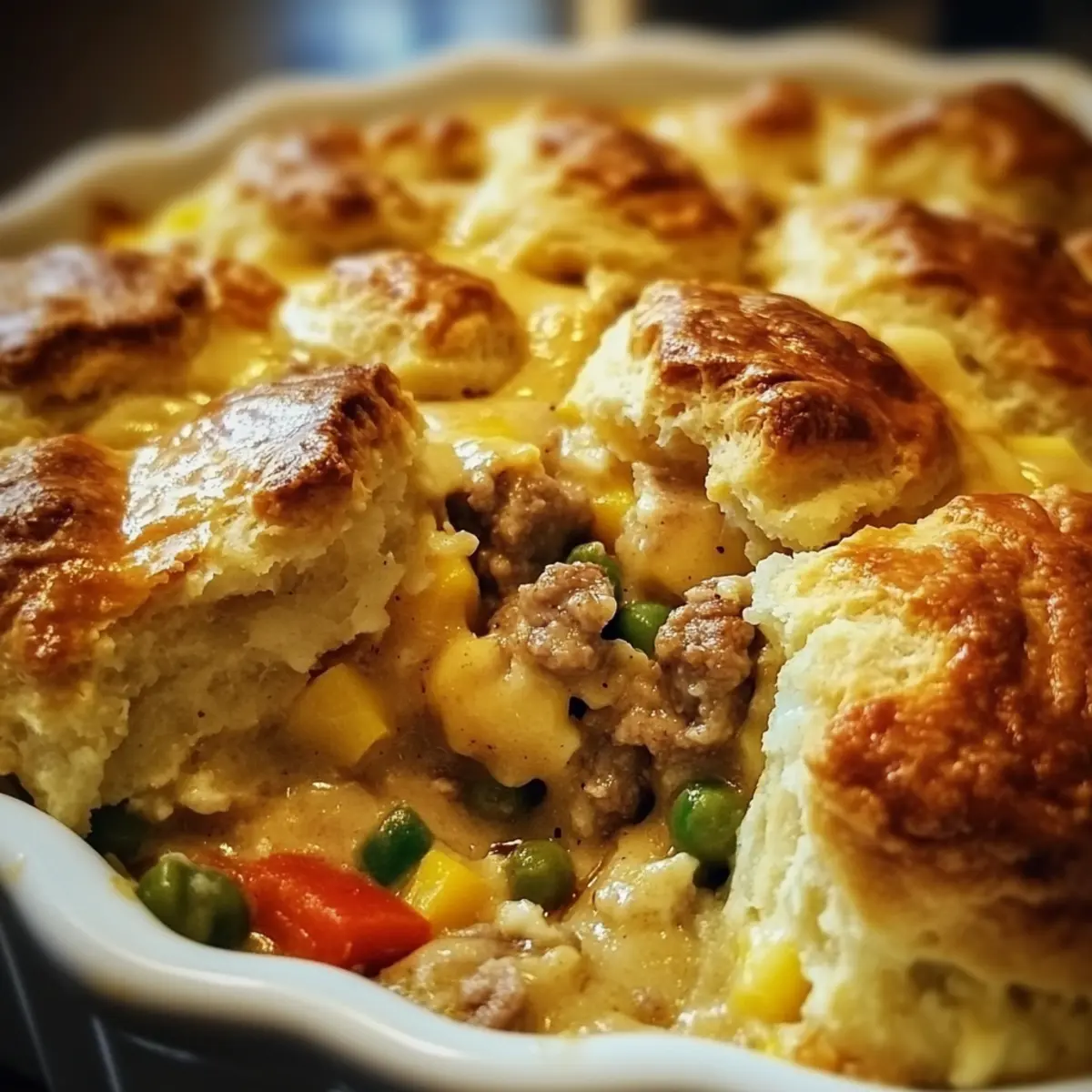 As I pulled the warm, golden Savory Breakfast Pot Pie from the oven, the enticing aroma completely enveloped my kitchen, instantly transporting me to a cozy brunch gathering with family and friends. This delightful dish, topped with a honey butter biscuit crust, marries fluffy scrambled eggs and hearty sausage gravy, ensuring comfort in every bite. The versatility of this breakfast pot pie means you can customize it with your favorite vegetables or proteins, making it perfect for any craving or occasion. Plus, it’s a breeze to prepare, allowing you to bypass the fast food lane and enjoy a wholesome, satisfying meal at home. Curious about how you can make this comforting delight your own? Let’s dive in! Why is this breakfast pot pie irresistible? Versatile Ingredients: You can easily tailor this pot pie with your favorite vegetables or proteins, allowing endless customization for every taste. Creamy Comfort: The combination of fluffy eggs and savory sausage gravy creates a warm, hearty filling that makes every bite a delight. Quick Preparation: With a simple cooking process and minimal prep time, you’ll have a delicious meal ready without the hassle. Perfect for Any Occasion: This dish shines at brunches or breakfast dinners, delighting friends and family alike. Plus, serve it alongside some fresh fruit or a light salad for a balanced meal! If you love the idea of combining flavors, don’t miss out on our Hot Honey Chicken for an equally satisfying experience. Breakfast Pot Pie with Honey Butter Biscuit Ingredients For the Filling • Mild Cheddar Cheese – Provides creaminess and flavor; feel free to swap for Monterey Jack for a different twist. • Bell Peppers – Chopped; zucchini or spinach are great substitutes if you’re looking for a change. • Onion – Chopped yellow or red onions work perfectly to enhance the overall flavor. • Salt – Vital for flavor enhancement; using kosher salt allows better control over seasoning. • Pepper – Adds a gentle heat; adjust according to your taste preference. • Breakfast Sausage – 8 oz; consider turkey or veggie sausage for a lighter option. • Heavy Cream – 2½ cups yield a rich gravy; half-and-half can lighten it up if desired. • Flour – 2 tbsp to thicken the gravy; opt for a gluten-free blend if needed. • Eggs – 6-7 large eggs are essential for the pot pie’s structure. • Unsalted Butter – 2 tbsp for cooking eggs; can substitute with olive oil. For the Biscuit Topping • Red Lobster Honey Butter Biscuit Mix – This is the base for your topping; feel free to substitute with any biscuit mix you have on hand. • Milk – ¾ cup, necessary for biscuit preparation; any milk works! • Unsalted Butter – ½ stick, softened; margarine can work as a replacement. • Honey – 1 tbsp adds a touch of sweetness to the biscuits; maple syrup is an excellent alternative. For Cooking • Oil for Cooking – Used to sauté the veggies; both olive oil and butter are fantastic options. • Olive Oil – 1 tbsp for cooking eggs; butter can easily replace it if preferred. With these ingredients, you’re just a whisk and a bake away from indulging in a delicious breakfast pot pie topped with a honey butter biscuit! Step‑by‑Step Instructions for Breakfast Pot Pie with Honey Butter Biscuit Step 1: Preheat the Oven Begin by preheating your oven to 425°F (220°C). This initial step ensures that your Breakfast Pot Pie cooks evenly and develops a gorgeous, golden crust when finished. While the oven warms up, gather all your ingredients and prepare your workspace, so everything is ready for the cooking process. Step 2: Sauté the Vegetables In a skillet over medium heat, add your preferred cooking oil. Once hot, toss in the chopped bell peppers and onions, sautéing for about 3-4 minutes until they become tender and slightly caramelized. Remove the sautéed veggies from the skillet and set them aside, allowing the flavors to blend in anticipation of their role in the pot pie. Step 3: Cook the Sausage Using the same skillet, add the breakfast sausage, cooking it for about 5-6 minutes until it is nicely browned and crispy. This will infuse the sausage with the leftover flavors from the vegetables. Once cooked, sprinkle the flour over the sausage, stirring to combine, then slowly pour in the heavy cream. Season with salt and pepper, cooking until thickened (around 2-3 minutes), before removing from heat. Step 4: Prepare the Biscuit Dough In a large mixing bowl, combine the biscuit mix with the milk, stirring gently to form a shaggy dough. Avoid overmixing to keep the biscuits light and fluffy. Set the dough aside as you prepare the filling layers for your Breakfast Pot Pie, letting it rest for a moment to ensure the best texture. Step 5: Make Honey Butter In a small bowl, mix the softened butter with honey and a pinch of salt until smooth. This honey butter will elevate the flavor of your biscuit topping. Once combined, set it aside for later; you’ll brush this buttery blend over the biscuits before serving to add a mouthwatering sweetness to your finished dish. Step 6: Scramble the Eggs In the same skillet, add a tablespoon of olive oil or butter, then pour in the beaten eggs. Cook gently over medium heat, stirring occasionally, until the eggs are just about set but still creamy (about 3-4 minutes). Season with a pinch of salt and pepper, ensuring they’re flavorful and ready to mix with the other filling components. Step 7: Layer the Ramekins Now it’s time to assemble your Breakfast Pot Pie! Begin by layering each ramekin with a spoonful of the scrambled eggs, followed by the sautéed veggies, a sprinkle of cheddar cheese, and finally a generous layer of the savory sausage gravy. These layers create a hearty filling, ready to be topped with biscuit dough. Step 8: Add Biscuit Topping Spoon the biscuit dough over the prepared filling in each ramekin, spreading it gently to cover the surface. This step is crucial for achie