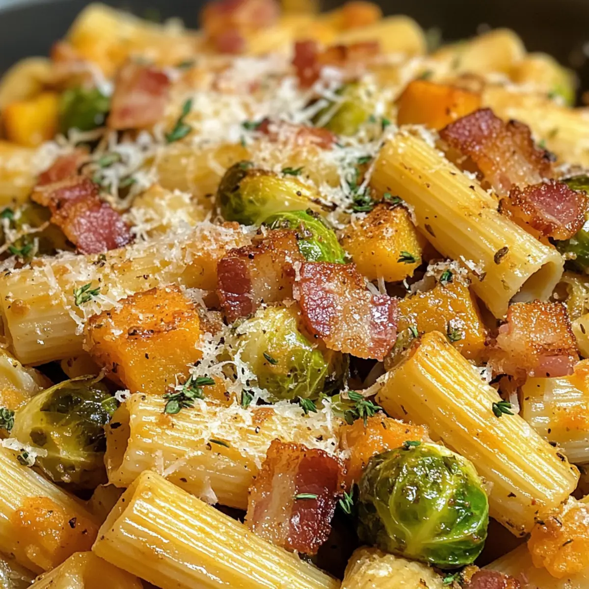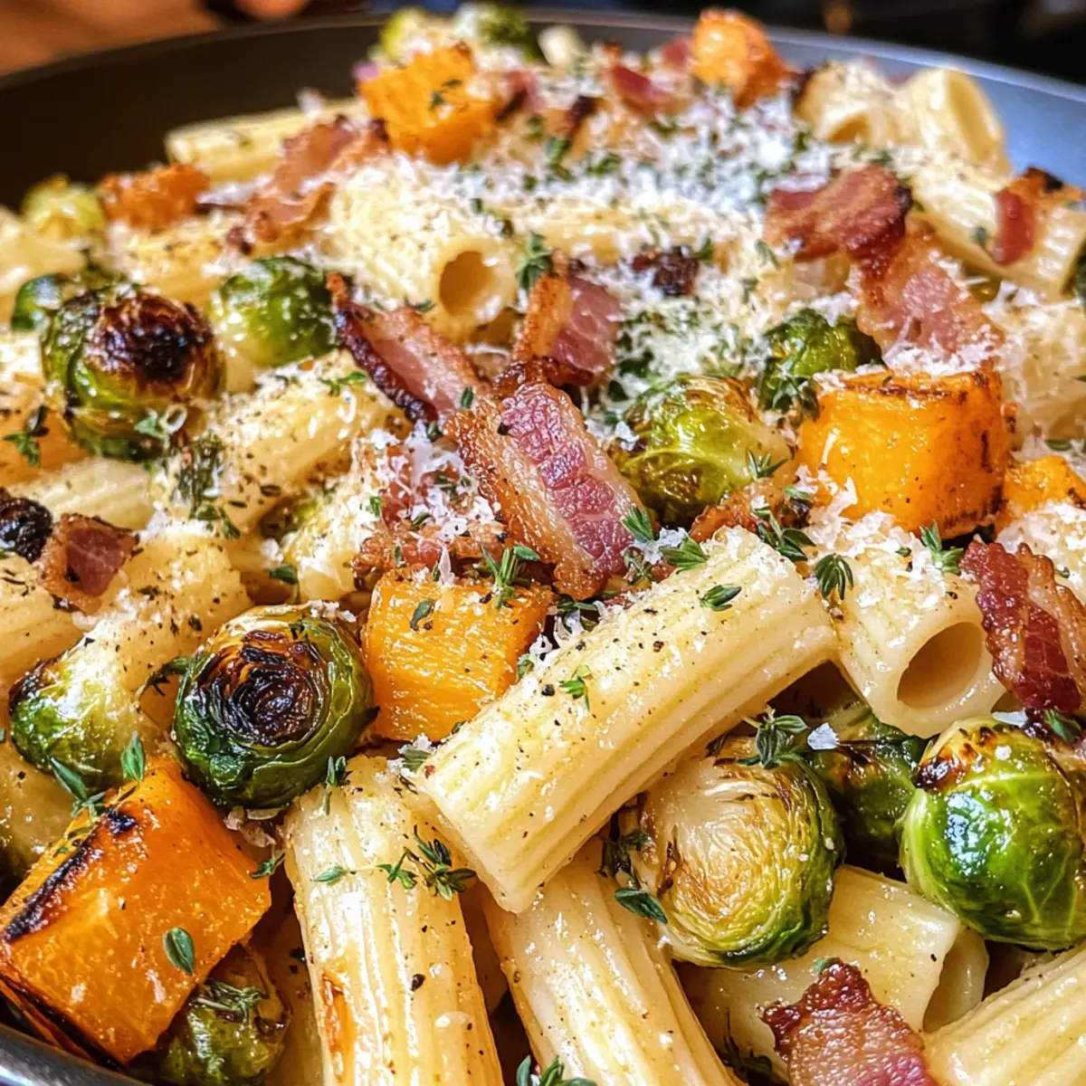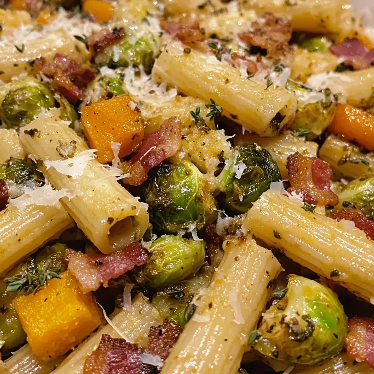 Amid the vibrant hues of fall, I found myself in a mini crisis—what to make for dinner that would warm both the heart and the belly? Enter my Bacon, Brussels Sprouts and Butternut Squash Pasta, a dish that beautifully melds roasted Brussels sprouts and sweet butternut squash with crispy bacon for a rich, savory experience. With just under an hour to prepare, this healthy pasta dish not only fits perfectly into busy weeknights but also serves as a comforting reminder of autumn’s bounty. The delightful tang of lemon juice ties everything together, making each bite a celebration of seasonal flavors. Ready to turn your kitchen into a cozy haven with this mouthwatering fall comfort food? Let’s dive in! Why is this pasta dish a must-try? Variety on Your Plate: This recipe offers you endless options! With different pasta shapes like rigatoni, penne, and farfalle, you can customize your meal to fit your mood. Hearty and Healthy: Featuring roasted Brussels sprouts and butternut squash, this dish strikes the perfect balance between nutritious and delicious, making it an ideal choice for health-conscious foodies. Quick Prep Time: In just under an hour, you can serve a gourmet meal, perfect for busy weeknights when time is of the essence. Savory Flavor Explosion: The sweet-butternut squash pairs exquisitely with the salty crunch of bacon and the earthiness of Brussels sprouts, creating a mouthwatering experience that will keep you going back for more. Impress Your Guests: Serve this dish at your next dinner party, and you’ll leave a lasting impression on friends and family, just like my Cookies Cream Cupcakes make dessert unforgettable! Adaptable Ingredients: Don’t have bacon on hand? No problem! You can easily swap it out for turkey bacon, and even substitute with vegan cheese to cater to various dietary preferences. Brussels Sprouts and Butternut Squash Pasta Ingredients For the Pasta Pasta – Choose from rigatoni, penne, or farfalle for the best texture in your Brussels Sprouts and Butternut Squash Pasta. For the Vegetables Brussels Sprouts – Adds a nutty, earthy taste; you can substitute green beans if Brussels aren’t available. Butternut Squash – The star of the show, it brings sweetness and creaminess; use fresh or frozen cubes for convenience. Shallots – Imparts a mild onion flavor; feel free to use yellow onion as an alternative. Garlic – Adds wonderful depth; adjust the amount based on your taste preferences. Olive Oil – Essential for roasting veggies to perfection; avocado oil can be used instead. Kosher Salt and Black Pepper – Enhance and brighten all flavors; use sea salt or pink Himalayan salt if you like. For the Flavor Bacon – Infuses the dish with savory richness; substitute with turkey bacon for a lighter option. Lemon Juice – Brightens the dish while balancing flavors; lime juice can stand in if needed. Fresh Thyme Leaves – Complements roasted veggies beautifully; dried thyme works too if fresh isn’t handy. Red Pepper Flakes – Add a touch of heat; omit for a milder, family-friendly dish. Parmesan Cheese – Brings creaminess and umami; swap for vegan cheese for a dairy-free treat. Step‑by‑Step Instructions for Brussels Sprouts and Butternut Squash Pasta Step 1: Preheat the Oven Begin by preheating your oven to 425°F (220°C). This high temperature is essential for achieving perfectly roasted Brussels sprouts and butternut squash, ensuring they develop a lovely caramelized exterior while staying tender inside. Preheating for at least 10 minutes will help create that irresistible texture. Step 2: Prepare the Vegetables While the oven heats, wash and trim the Brussels sprouts, cutting them in half. Next, peel and cube the butternut squash. In a large mixing bowl, toss the Brussels sprouts, butternut squash, sliced shallots, and chopped bacon with olive oil, kosher salt, and black pepper until everything is well-coated. Spread the mixture in a single layer on a baking sheet for even roasting. Step 3: Roast the Vegetables Once your oven is ready, place the baking sheet inside and roast the vegetables for 10 minutes. After this initial roasting period, give everything a gentle toss to promote even cooking. Return the sheet to the oven and roast for an additional 10 to 15 minutes until the Brussels sprouts are golden and tender, and the bacon is crispy. Step 4: Cook the Pasta While your vegetables are roasting, bring a large pot of salted water to a boil. Add your pasta of choice—rigatoni, penne, or farfalle—cooking according to package directions until al dente, usually about 8-12 minutes. Reserve 1 cup of the starchy pasta water before draining the rest, as it will help create a sauce later. Step 5: Sauté the Aromatics In a large skillet, heat 2 tablespoons of olive oil over medium heat. Once shimmering, add minced garlic and red pepper flakes, cooking for about 30 seconds until fragrant. This step adds depth to your Brussels Sprouts and Butternut Squash Pasta and enhances the flavors as they meld together. Step 6: Combine the Ingredients Reduce the heat to low and add the cooked pasta to the skillet, along with the roasted Brussels sprouts, butternut squash, and crispy bacon. Sprinkle in freshly grated Parmesan cheese and fresh thyme leaves. Squeeze in lemon juice and pour in some reserved pasta water—start with half a cup—mixing everything together until well-combined and a glossy sauce forms. Step 7: Serve and Enjoy Taste the pasta and adjust the seasoning with additional salt, pepper, or lemon juice as needed. For a touch of elegance, transfer the Brussels Sprouts and Butternut Squash Pasta to serving plates, and garnish with more Parmesan cheese and a sprinkle of fresh thyme. Enjoy your comforting fall meal! What to Serve with Bacon, Brussels Sprouts, and Butternut Squash Pasta Elevate your cozy dinner experience with delightful sides and sips that perfectly complement this warm and inviting pasta dish. Garlic Bread: This classic sid