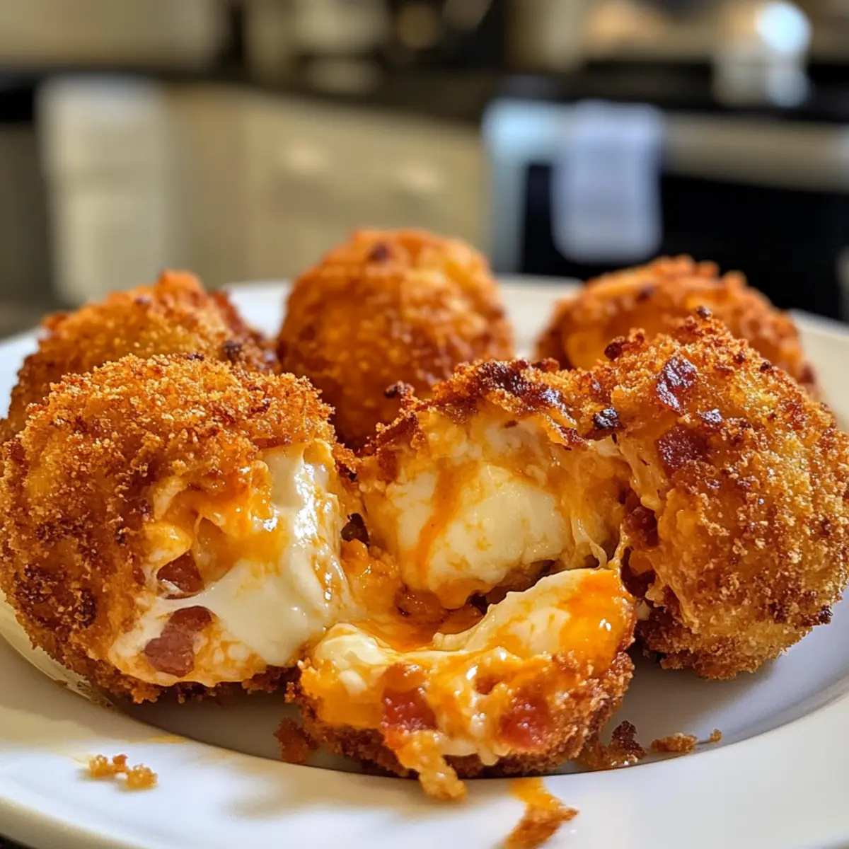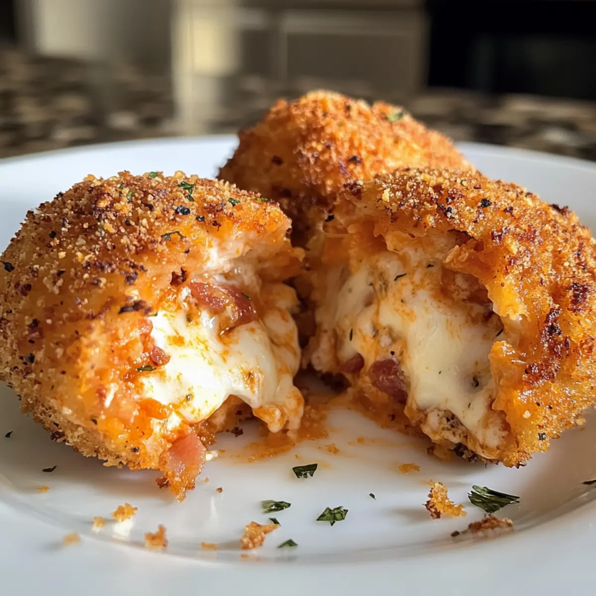 The spicy aroma that fills your kitchen as these bombs fry is simply captivating! My Spicy Buffalo Chicken Bacon Mozzarella Bombs are the ultimate game day snack, guaranteed to make your friends and family drool with anticipation. Imagine biting into a crispy exterior, only to uncover a gooey, cheesy core surrounded by savory ground chicken and smoky bacon. This recipe is not only quick to whip up, but it also accommodates gluten-free diets, ensuring everyone can indulge in this comfort food delight. Whether you’re hosting a big event or just craving something satisfying, these bombshells are the answer. Are you ready to elevate your snacking game? Let’s dive into this recipe! Why Are These Bombs a Game Changer? Irresistible flavors: Each bite bursts with the perfect harmony of spicy buffalo sauce, creamy mozzarella, and smoky bacon, creating a taste sensation that appeals to everyone. Customizable options: Easily switch ground chicken for ground turkey or even lean beef, or make a vegetarian version with cauliflower for inclusive snacking. Quick and easy: This straightforward recipe lets you prepare mouthwatering snacks in no time—all while allowing you to enjoy quality time with family and friends. Crowd-pleaser: Perfect for game day or any gathering, these delicious bombs will have everyone coming back for seconds! Try pairing them with celery sticks or blue cheese dressing for that authentic touch. Meal prep friendly: Make-ahead options ensure you can whip them out for unexpected guests or busy days, keeping your culinary creativity alive. You could even check out our Buffalo Chicken Taquitos for another delicious take on buffalo flavors! Buffalo Chicken Bacon Mozzarella Bombs Ingredients For the Cheese Center Mozzarella Cheese – Provides a creamy, gooey core; for a firmer option, consider using pre-packaged mozzarella bars cut into cubes. For the Filling Ground Chicken – Main protein source, tender and juicy; ground turkey or lean beef offer a lighter variant. Cooked Bacon – Adds savory crunch and flavor; thick-cut bacon enhances richness. Buffalo Sauce – Infuses heat and tanginess; adjust the amount to control spiciness or substitute with honey barbecue for a milder touch. Garlic Powder – Elevates overall flavor. Onion Powder – Contributes depth and sweetness. Paprika – Adds warmth and vibrant color. Salt & Black Pepper – Essential seasonings for flavor balance. For Coating and Cooking Plain Flour – Helps breadcrumbs adhere for a crispy coating. Large Eggs – Binds the breadcrumbs for a perfect crust. Breadcrumbs (Panko or Regular) – Creates a crispy outer layer; panko offers the ultimate crunch. Vegetable Oil or Canola Oil – Needed for frying to ensure a golden, delicious result. Step‑by‑Step Instructions for Buffalo Chicken Bacon Mozzarella Bombs Step 1: Prepare Cheese Begin by cutting the mozzarella cheese into 1-inch cubes and set them aside on a plate. This will make it easy to wrap the cheese later. Ensure you have a clean workspace so that the process flows smoothly and efficiently, as perfecting your Buffalo Chicken Bacon Mozzarella Bombs starts with this cheesy center. Step 2: Wrap Cheese Crumble the cooked bacon into small pieces and take a slice to wrap around each mozzarella cube completely. This adds savory richness to each bomb. Aim to cover the cheese entirely to prevent it from leaking out during cooking, ensuring that every bite of your Buffalo Chicken Bacon Bacon Mozzarella Bombs is cheesy and delightful. Step 3: Mix Chicken Filling In a large bowl, combine the ground chicken, garlic powder, onion powder, paprika, salt, black pepper, and half of the buffalo sauce. Mix these ingredients together thoroughly, making sure to incorporate them evenly. This flavorful filling is crucial for infusing your Buffalo Chicken Bacon Mozzarella Bombs with all the deliciousness they need. Step 4: Form Bombs To shape the bombs, take a small portion of the chicken mixture and flatten it in your hand. Place the wrapped cheese in the center, then carefully encase it with the chicken mixture, ensuring it’s completely covered. This step helps keep all the gooey goodness sealed inside, making your Buffalo Chicken Bacon Mozzarella Bombs a mouthwatering treat. Step 5: Coat Bombs Prepare a breading station by placing flour, beaten eggs, and breadcrumbs in separate bowls. First, roll each chicken bomb in flour, then dip it in the egg, and finally coat it with breadcrumbs. This three-step process adds a crispy outer layer, transforming your Buffalo Chicken Bacon Mozzarella Bombs into irresistible snacks! Step 6: Cook In a deep skillet, heat vegetable or canola oil to 350°F (175°C). Once hot, carefully add the bombs and fry them for 5-6 minutes, or until they achieve a stunning golden color. Alternatively, for a healthier option, bake the bombs in a preheated oven at 400°F (200°C) for 18-20 minutes, ensuring both methods yield a delightful crunch. Step 7: Finish & Serve Once golden and cooked through, remove the Buffalo Chicken Bacon Mozzarella Bombs from the oil or oven. Drizzle with the remaining buffalo sauce for an added kick and serve warm. Consider garnishing with sliced green onions or a side of blue cheese dressing for dipping, elevating your snack experience to a whole new level! Make Ahead Options These Spicy Buffalo Chicken Bacon Mozzarella Bombs are ideal for meal prep, giving you the flexibility to enjoy delicious snacks even on your busiest days. You can assemble the bombs and refrigerate them for up to 24 hours before cooking. To do this, prepare each bomb and place them on a parchment-lined baking sheet; this will help maintain their shape and prevent sticking. When you’re ready to enjoy them, simply fry or bake as directed, ensuring they’re golden and crispy. For even longer storage, you could freeze the uncooked bombs for up to 3 months, thawing them overnight in the fridge before cooking to preserve their delicious texture and flavo