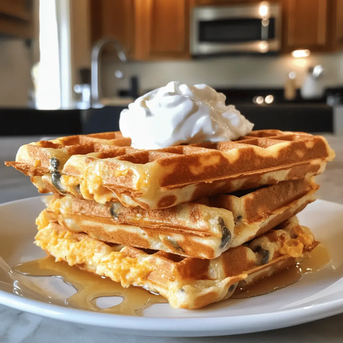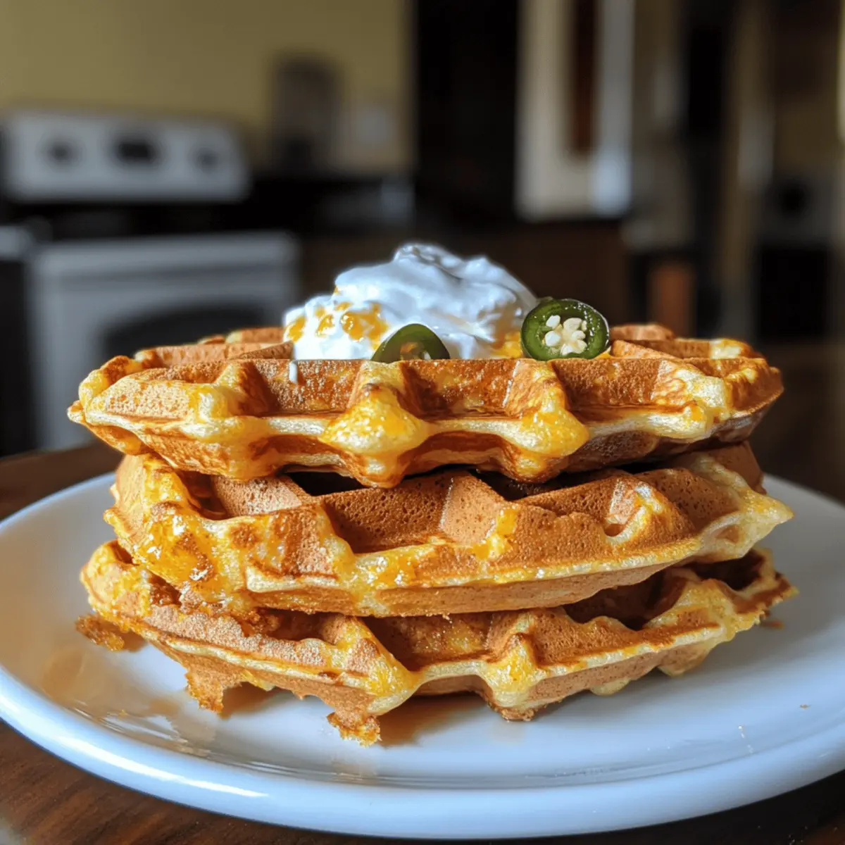 Delight in Cheddar Jalapeño Cornbread Waffles, a savory twist on breakfast that combines cornbread's sweetness with sharp cheddar and jalapeño heat.