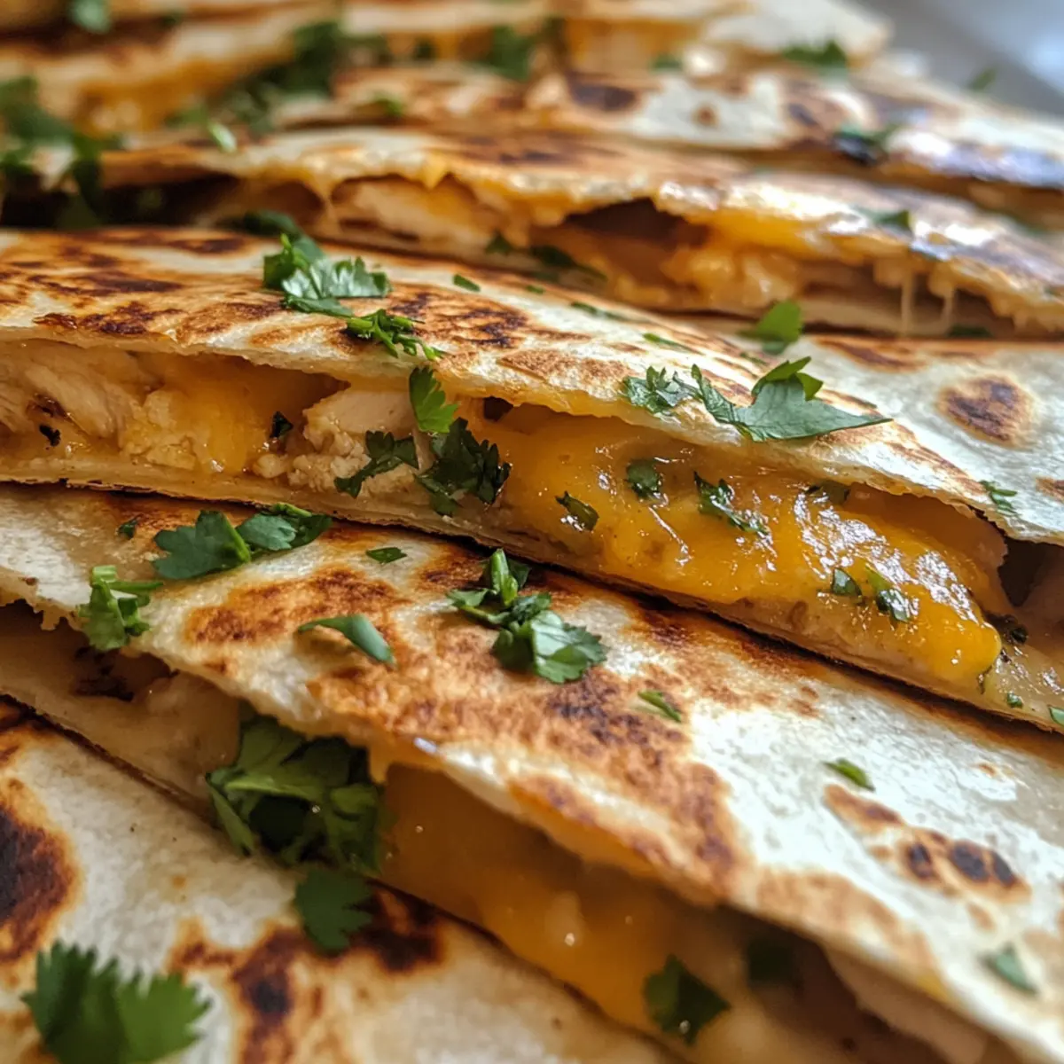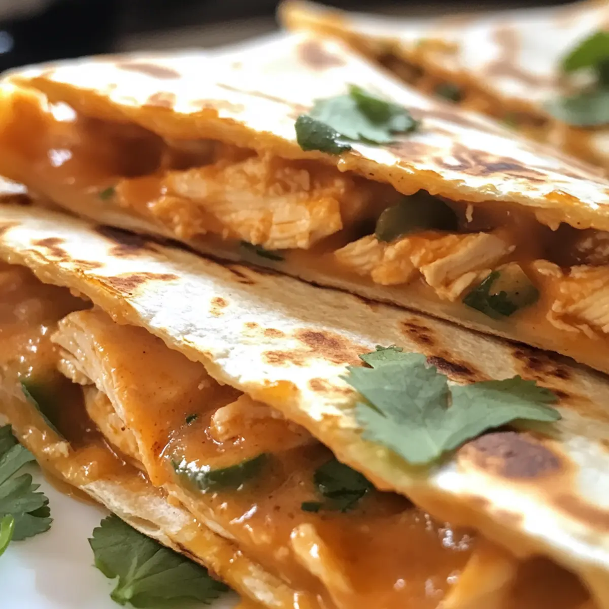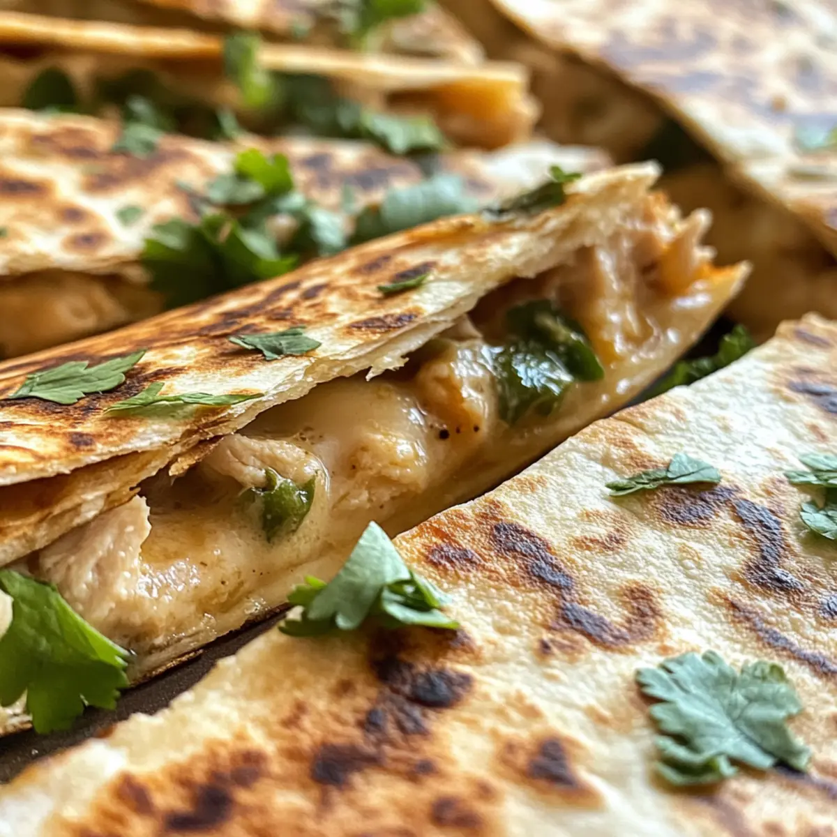 As I was rummaging through my pantry one evening, a lightbulb finally flickered on—what if I could bring together some of my favorite flavors into one satisfying dish? That’s when the idea for Cheesy Hot Honey Chicken Quesadillas with Spicy Jalapeño Cream Sauce came to life. These mouthwatering quesadillas are not just an easy weeknight dinner; they are fully customizable, ready in about 30 minutes, and can cater to any heat level you fancy. Whether you opt for tender chicken, savory steak, or a hearty vegetarian bean filling, you’ll be creating a memorable meal that pairs perfectly with friends, family, or just a cozy night in. Ready to elevate your dinner game? Let’s dive into this cheesy, spicy delight! Why are these quesadillas a must-try? Quick and Easy: Whipping up these quesadillas takes just about 30 minutes, making them ideal for busy weeknights or last-minute gatherings. Fully Customizable: Whether you prefer savory steak, hearty beans, or the featured chicken, there’s an option to satisfy everyone’s cravings. Flavor Explosion: The sweet-and-spicy combination of hot honey and juicy chicken is a delightful flavor fusion that will keep you coming back for more. Creamy Contrast: The Spicy Jalapeño Cream Sauce adds a luscious, tangy kick that beautifully balances the sweetness of the honey chicken. Crowd-Pleaser: Perfect for hosting friends, these quesadillas have something for everyone—serve them alongside some Cheesy Garlic Chicken or Chicken Taquitos Spicy for a feast they won’t forget! Cheesy Hot Honey Chicken Quesadillas Ingredients For the Chicken • Boneless, Skinless Chicken Breasts – A hearty protein base; swap with steak or beans for a vegetarian choice. • Olive Oil – Vital for cooking; adds richness and prevents sticking. • Smoked Paprika – Imparts depth, smokiness, and a burst of flavor. • Garlic Powder & Onion Powder – Enhances the chicken’s overall taste profile. • Salt & Pepper – Essential for seasoning the chicken; adjust per your preference. For the Hot Honey Sauce • Honey – Provides a sweet contrast to the spicy elements; crucial for balancing flavors. • Hot Sauce – Introduces heat; tailor the amount to suit your taste. For the Jalapeño Cream Sauce • Sour Cream – Acts as a creamy base for the sauce, enriching the flavor. • Fresh Jalapeños – Adds heat and vibrant flavor; deseed for a milder touch. • Lime Juice – Brightens the cream sauce with zesty acidity. For Assembly • Flour Tortillas – Soft and pliable, they encase the delicious filling. • Shredded Cheddar Cheese & Monterey Jack Cheese – Melty, flavorful cheeses that unify the quesadilla. • Butter – Ensures a crisp, golden-brown exterior when grilling. For Garnish • Fresh Cilantro – Adds a burst of freshness and color; an optional yet delightful touch! Step‑by‑Step Instructions for Cheesy Hot Honey Chicken Quesadillas with Spicy Jalapeño Cream Sauce Step 1: Cook the Chicken Begin by heating a tablespoon of olive oil in a large skillet over medium-high heat. Season the boneless, skinless chicken breasts with smoked paprika, garlic powder, onion powder, salt, and pepper. Cook for about 10 minutes, flipping halfway through, until the chicken is golden brown and cooked through. You want it to reach an internal temperature of 165°F and have a nice sear. Step 2: Prepare the Hot Honey Sauce While the chicken is cooking, prepare the hot honey sauce in a small bowl. Whisk together the honey and your favorite hot sauce until well combined. Once the chicken is done, remove it from the skillet, chop it, and toss it in the hot honey mixture. Keep this flavorful chicken warm while you work on the next steps. Step 3: Make the Jalapeño Cream Sauce In a separate bowl, mix together sour cream, finely chopped fresh jalapeños, lime juice, garlic powder, and a pinch of salt. Stir until all the ingredients are thoroughly combined, and then refrigerate the Spicy Jalapeño Cream Sauce until you’re ready to serve. This will provide a cool contrast to the warm, cheesy quesadillas. Step 4: Assemble Quesadillas Take a large skillet and place it over medium heat. Start by laying a flour tortilla on the skillet. Layer it with a generous amount of shredded cheddar and Monterey Jack cheese, followed by the hot honey chicken. Sprinkle more cheese on top, and finish with another tortilla to create a quesadilla. Ensure the filling is evenly distributed for a perfect bite. Step 5: Cook Quesadillas Melt a tablespoon of butter in the skillet before carefully placing the assembled quesadilla in. Cook for 2-3 minutes until the bottom is golden brown and the cheese begins to melt. Carefully flip the quesadilla using a spatula, adding more butter if necessary, and cook for another 2-3 minutes until the other side is equally golden and crisp. Step 6: Slice and Serve Once your quesadillas are perfectly golden brown and the cheese is deliciously melted, remove them from the skillet. Allow them to cool for a minute, then slice into wedges. Serve the cheesy hot honey chicken quesadillas with the Spicy Jalapeño Cream Sauce drizzled on top or on the side, and garnish with fresh cilantro for a pop of color and flavor. Make Ahead Options These Cheesy Hot Honey Chicken Quesadillas are a fantastic choice for meal prep enthusiasts! You can cook the chicken and prepare the hot honey sauce up to 24 hours in advance for a quick finish on busy days. Simply season and cook the chicken, then toss it in the hot honey sauce and refrigerate in an airtight container. You can also make the Spicy Jalapeño Cream Sauce up to 3 days beforehand; just keep it chilled in the fridge. When you’re ready to serve, quickly assemble the quesadillas and cook them in a skillet for about 5-6 minutes until golden brown. They’ll be just as delicious when warmed through, making dinner a breeze! What to Serve with Cheesy Hot Honey Chicken Quesadillas? Elevate your dining experience by pairing these ques