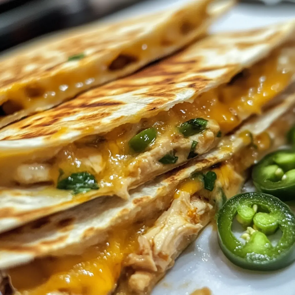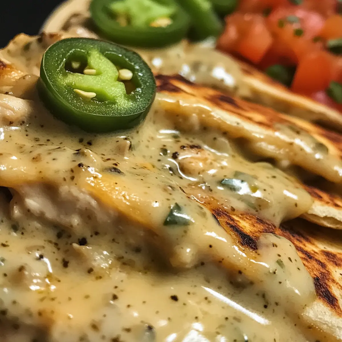 It all began with a simple question: how can I turn an ordinary weeknight into a culinary adventure? Enter my Cheesy Hot Honey Chicken Quesadillas with Spicy Jalapeño Cream Sauce, a dish that truly transforms the dinner table. The delightful contrast of sweet honey intertwined with spicy jalapeños creates a flavor explosion that’s both comforting and exciting. This recipe is not just quick to whip up; it’s also completely customizable, allowing you to swap proteins or toppings to delight every palate. Whether you’re hosting friends or seeking a cozy night in, these quesadillas promise to elevate your meal with minimal fuss. Curious about how this delicious combination will play out in your kitchen? Let’s dive in! Why Do You Need These Quesadillas? Quick Dinner Solution: In just 30 minutes, you can create a mouthwatering meal that impresses without the hassle. Fully Customizable: Switch up proteins or toppings to match your taste—try shrimp or grilled veggies for a fun twist! Crowd-Pleasing Flavor: The blend of sweet honey and spicy jalapeño ensures that every bite is bursting with excitement, making it perfect for gatherings. Versatility at Its Best: Enjoy as a snack, appetizer, or a main dish paired with sides like guacamole and salsa for a complete spread. Satisfying and Comforting: These quesadillas combine crispy exteriors with a gooey, cheesy interior, making them the ultimate comfort food experience. Try pairing them with my Cheesy Garlic Chicken or Hot Honey Chicken for a delightful meal! Cheesy Hot Honey Chicken Quesadillas Ingredients For the Chicken Boneless, Skinless Chicken Breasts – Lean protein that forms the base of the dish. For a vegetarian alternative, substitute with beans or sautéed peppers. Olive Oil – Used for cooking the chicken; provides moisture and aids in browning. For the Seasoning Smoked Paprika, Garlic Powder, Onion Powder – Seasoning mix that adds depth and flavor. Adjust quantities based on preference. Salt & Pepper – Essential for enhancing the overall flavor. For the Sweet & Spicy Sauce Honey – Sweetness that balances the heat; can be adjusted based on desired sweetness. Hot Sauce – Adds spicy kick; can vary by brand or be replaced with a milder sauce for less heat. For the Jalapeño Cream Sauce Sour Cream – Acts as the base of the jalapeño cream sauce, providing creaminess. Can be swapped with Greek yogurt for a lighter option. Fresh Jalapeños – Adds heat and texture; deseed for less spiciness. Lime Juice – Provides acidity and brightness; can substitute with lemon juice. For Assembly Flour Tortillas – Serves as the wrap; can be replaced with corn tortillas for a gluten-free option. Shredded Cheddar & Monterey Jack Cheese – Melty cheese blend for richness and flavor. Experiment with different cheese combinations as desired. Butter – Used for grilling the quesadillas; adds flavor and prevents sticking. Fresh Cilantro – Optional garnish that adds freshness. These Cheesy Hot Honey Chicken Quesadillas are just begging to be enjoyed, so gather your ingredients and get ready for a culinary adventure! Step‑by‑Step Instructions for Cheesy Hot Honey Chicken Quesadillas with Spicy Jalapeño Cream Sauce Step 1: Cook the Chicken In a large skillet, heat 1 tablespoon of olive oil over medium heat. Season the boneless, skinless chicken breasts with smoked paprika, garlic powder, onion powder, salt, and pepper. Add the chicken to the skillet and cook for about 10 minutes, flipping halfway through, until golden brown and no longer pink in the center. Step 2: Prepare the Sweet & Spicy Sauce While the chicken is cooking, in a small bowl, mix together honey and your favorite hot sauce until well combined. Once the chicken is done, remove it from the skillet, allow it to rest for a few minutes, and then slice it into bite-sized pieces. Toss the chicken in the honey-hot sauce mixture until evenly coated. Step 3: Make the Jalapeño Cream Sauce In another bowl, combine sour cream, finely chopped fresh jalapeños, lime juice, and a pinch of salt. Stir well to create a creamy sauce with a kick. Refrigerate the jalapeño cream sauce for about 10–15 minutes to allow the flavors to meld together while you assemble the quesadillas. Step 4: Assemble Quesadillas On a flour tortilla, sprinkle a generous layer of shredded cheddar and Monterey Jack cheese, followed by a portion of the honey-hot chicken. Top with more cheese and place another tortilla on top. Press down gently to help the quesadilla hold together when grilling. Step 5: Grill the Quesadillas In the same skillet, melt 1 tablespoon of butter over medium heat. Carefully place the prepared quesadilla into the skillet and grill for about 2-3 minutes until the bottom is golden and crispy. Flip it over with a spatula and grill the other side for an additional 2-3 minutes, until the cheese is melted and the quesadilla is nicely browned. Step 6: Serve Once grilled, remove the quesadilla from the skillet and let it cool for a minute. Slice it into wedges and serve hot, accompanied by the homemade spicy jalapeño cream sauce. Garnish with fresh cilantro if desired, and enjoy your Cheesy Hot Honey Chicken Quesadillas for a satisfying meal! Storage Tips for Cheesy Hot Honey Chicken Quesadillas Fridge: Store leftovers in an airtight container for up to 3 days. This keeps the quesadillas fresh and tasty for your next meal! Freezer: To freeze, assemble the quesadillas, wrap them tightly in plastic wrap, and place them in a freezer bag. They can last up to 3 months in the freezer. Reheating: For the best texture, reheat quesadillas in a skillet over low heat until warmed through, about 5 minutes per side. This prevents them from becoming soggy, maintaining that delightful crunch. Make Ahead: Prepare the chicken and jalapeño cream sauce in advance for a quicker assembly during busy weeknights. What to Serve with Cheesy Hot Honey Chicken Quesadillas Elevate your mealtime by pairing these scru