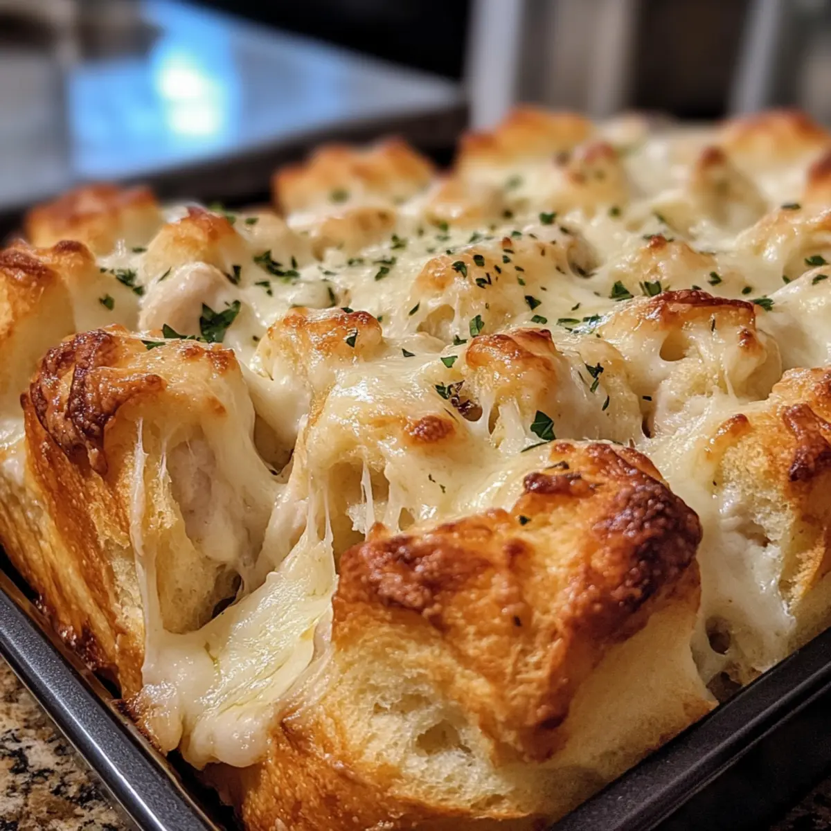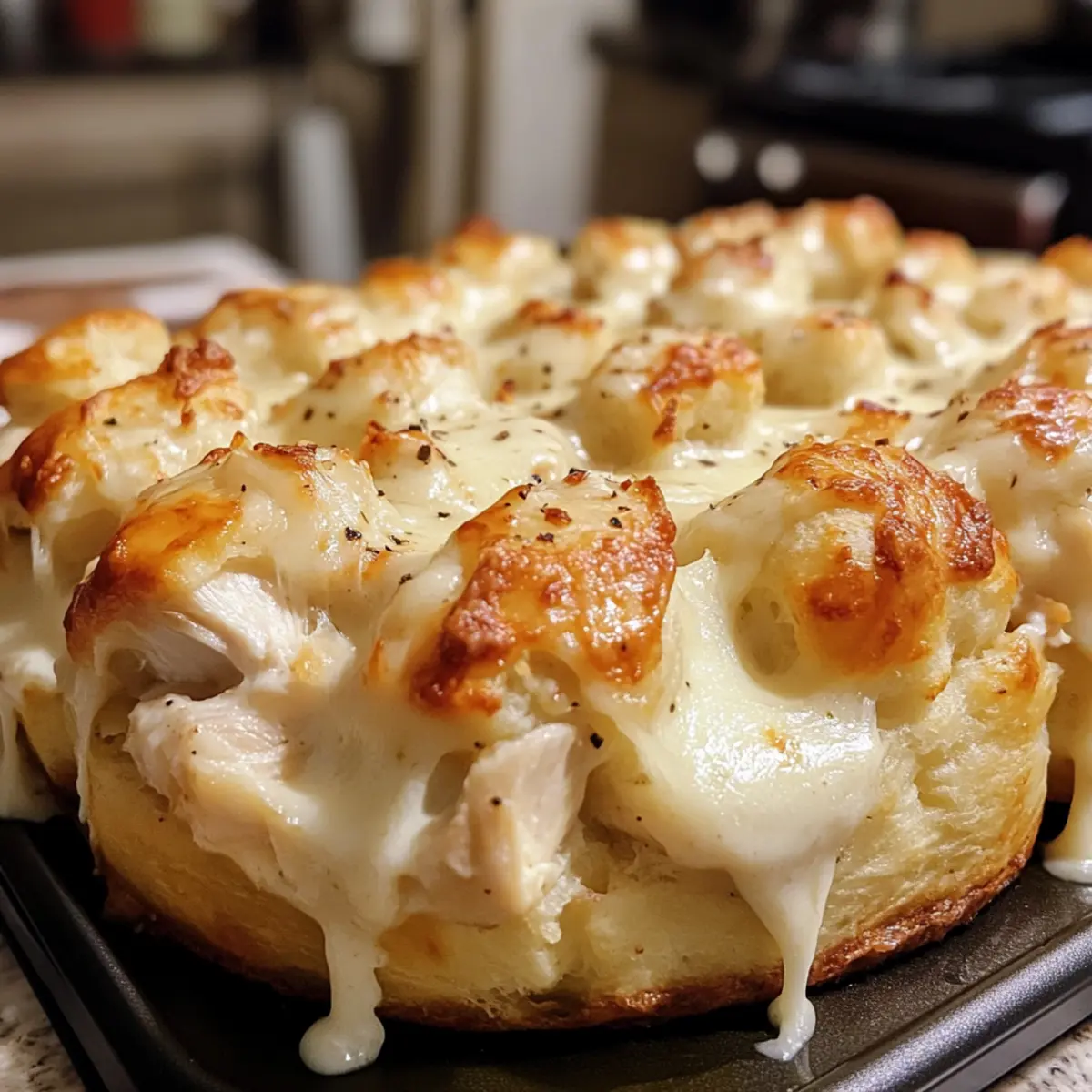 In the hustle and bustle of life, who doesn’t crave a bit of comfort food magic? Enter Chicken Alfredo Monkey Bread, a delightful blend of creamy Alfredo sauce and tender chicken, all wrapped in fluffy biscuit dough. This dish is not just about the delicious, pull-apart bites; it’s a showstopper perfect for family gatherings or cozy nights in, effortlessly combining quick preparation with joy-filled flavors. Imagine the warmth of a freshly baked centerpiece that brings everyone together, momentarily turning home into a haven. If you’re ready to impress your loved ones and satisfy those cravings, let’s dive into this cheesy, savory delight. What’s your favorite way to enjoy homemade comfort food? Why is Chicken Alfredo Monkey Bread a Must-Try? Irresistible Comfort: This dish combines creamy Alfredo with tender chicken, creating an inviting comfort food experience. Quick and Easy: With just a few ingredients and straightforward steps, you can whip this up in no time, perfect for busy evenings. Crowd-Pleaser: Ideal for family gatherings or game day, this shareable centerpiece will have everyone reaching for more! Creative Versatility: Feel free to customize with different sauces or add veggies like spinach for extra flavor. Just like in our Crockpot Chicken Corn Chowder, the options are endless! Delicious Leftovers: Enjoy fantastic leftovers, or prepare the mixture ahead of time for a fresh bake the next day, making meal prep a breeze. Each bite brings warmth and delight, making every moment special. What’s not to love? Chicken Alfredo Monkey Bread Ingredients For the Chicken Mixture • 2 cups cooked chicken – Adds protein and flavor; rotisserie chicken is an excellent time-saver. • 1 cup Alfredo sauce – Provides creaminess and richness; store-bought or homemade works well. • 1 teaspoon garlic powder – Provides depth of flavor; alternatively, use minced fresh garlic. • 1 teaspoon Italian seasoning – Adds herby flavor; feel free to adjust for personal taste. • Salt and pepper, to taste – Enhances the overall flavor. For the Dough and Cheese • 3 cups refrigerated biscuit dough – Forms the bread structure; use Pillsbury Grands or any similar variety. • 1 cup shredded mozzarella cheese – Adds cheesy pull and flavor; low-fat mozzarella is a healthier option. • 1/2 cup grated Parmesan cheese – Enhances the savory taste; consider using fresh Parmesan for better flavor. For Garnishing • 1/4 cup fresh parsley, chopped – Acts as a garnish, adding freshness; can substitute with dried parsley if needed. With these ingredients, you’ll be ready to create the comforting and flavorful Chicken Alfredo Monkey Bread that your family will adore! Step‑by‑Step Instructions for Chicken Alfredo Monkey Bread Step 1: Preheat the Oven Begin by preheating your oven to 375°F (190°C), ensuring an even cooking temperature for your Chicken Alfredo Monkey Bread. This step is crucial as it prepares the environment for that perfect golden-brown crust. While your oven heats up, make sure to gather all your ingredients and equipment so you’re ready to go! Step 2: Mix the Chicken Mixture In a large mixing bowl, combine 2 cups of shredded cooked chicken with 1 cup of Alfredo sauce, 1 teaspoon of garlic powder, 1 teaspoon of Italian seasoning, and salt and pepper to taste. Stir everything together until the chicken is well-coated in the creamy sauce. This blend of flavors forms the delicious base of your monkey bread! Step 3: Cut the Biscuit Dough Open the package of refrigerated biscuit dough and cut each biscuit into quarters. This helps the dough evenly mix with the chicken mixture, enhancing texture and flavor. As you cut, be sure to create uniform pieces for consistent baking results. Set these dough pieces aside and prepare to combine them with your flavorful chicken mix. Step 4: Combine Ingredients Gently fold the quartered biscuit pieces into the chicken mixture until all the dough is coated thoroughly. This step ensures that every bite will be bursting with the rich flavors of Chicken Alfredo. Be careful not to over-mix; you want to maintain the fluffiness of the biscuit pieces while ensuring they soak up that creamy goodness. Step 5: Add the Cheese Now, fold in 1 cup of shredded mozzarella cheese and half of your grated 1/2 cup Parmesan cheese into the mixture. This addition enhances the cheesy, melt-in-your-mouth quality of the Chicken Alfredo Monkey Bread. Make sure the cheese is evenly distributed so that every piece melts beautifully as it bakes. Step 6: Assemble in the Pan Grease a bundt pan thoroughly to prevent sticking, then carefully spoon the chicken and biscuit mixture into the pan. Try to distribute it evenly across the pan to ensure even cooking. Once layered, sprinkle the remaining Parmesan cheese on top to create a deliciously cheesy crust during baking. Step 7: Bake Place the bundt pan in your preheated oven and bake for 25-30 minutes, or until the top is golden brown and a toothpick inserted comes out clean. The key here is to watch for that beautiful color and the delightful, aromatic scent of melted cheese wafting through your kitchen—indicators that your Chicken Alfredo Monkey Bread is almost ready. Step 8: Cool and Serve After baking, let the Chicken Alfredo Monkey Bread cool in the pan for about 5 minutes. This cooling time makes it easier to invert onto a serving platter. Carefully turn the bundt pan upside down, allowing the bread to fall gracefully onto the plate. Garnish with chopped fresh parsley for a pop of color and freshness, and serve warm for the best experience! Expert Tips for Chicken Alfredo Monkey Bread Cube Creatively: Cut biscuit dough into uniform quarters for even cooking, ensuring each piece is perfectly fluffy and golden. Mix Gently: Fold the biscuit pieces and chicken mixture gently to maintain the fluffy texture, avoiding a dense outcome that can arise from over-mixing. Bundt Pan Basics: Grease your bundt pan thorough