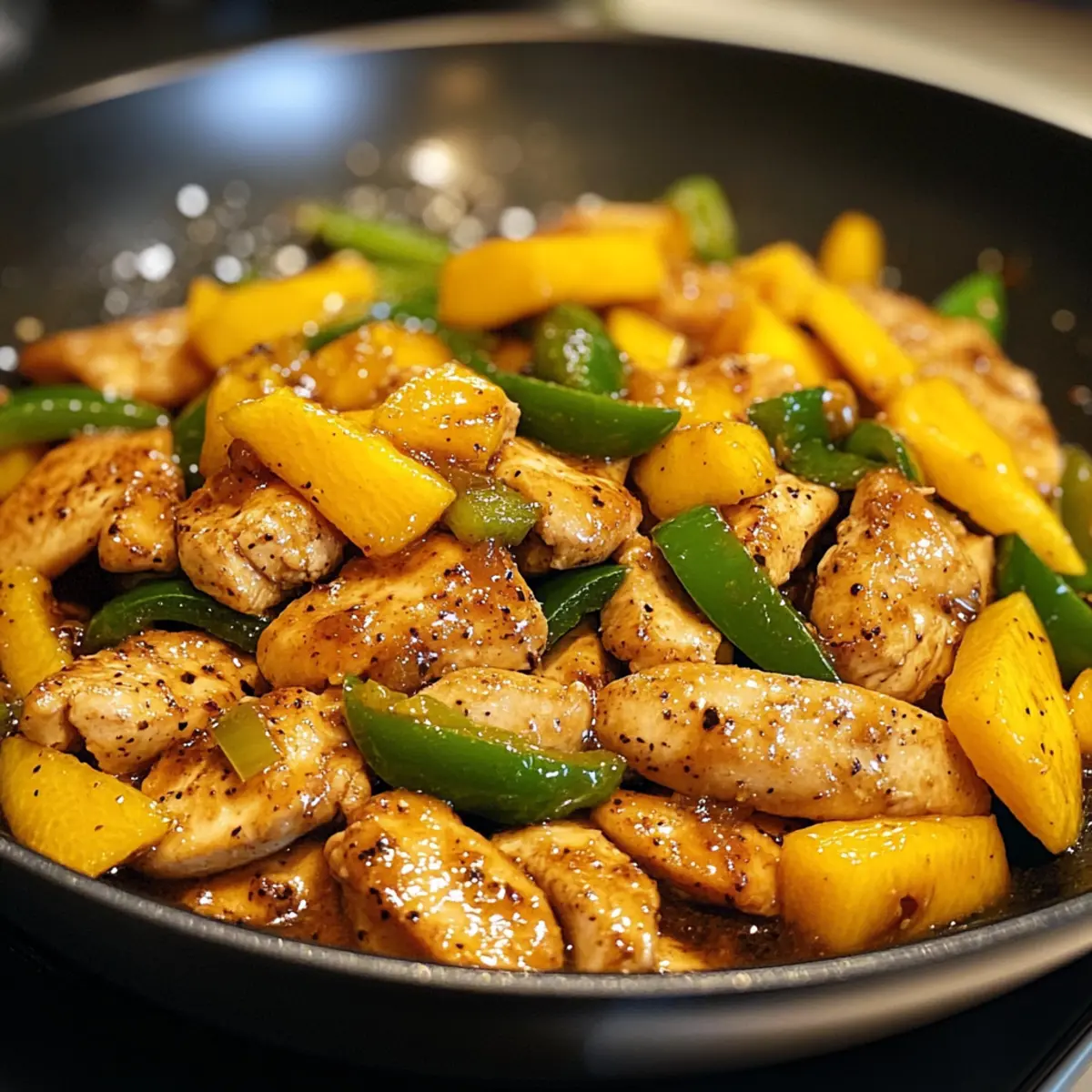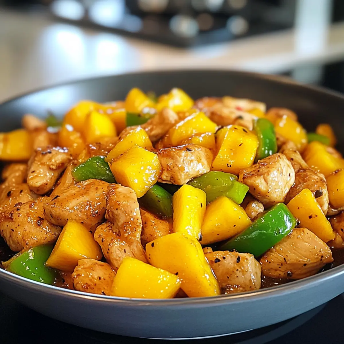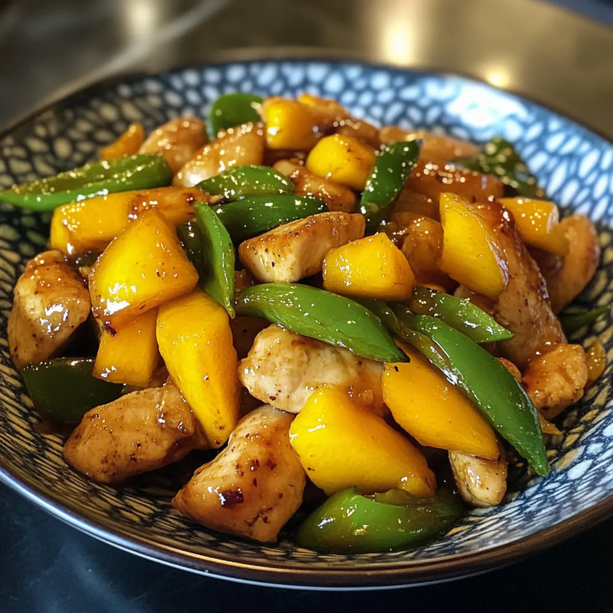 In the heart of a bustling kitchen, the aroma of sizzling chicken meets the sweet, intoxicating scent of ripe mango. As I chased down the last threads of a busy day, I discovered the magic of a 20-Minute Thai Mango Chicken Stir-Fry that transforms ordinary weeknight dinners into something extraordinary. Perfectly quick and oh-so-flavorful, this dish marries tender chicken with juicy mango in a zesty sauce that’s bound to awaken your taste buds. It’s not just a meal; it’s a feast of colors, textures, and flavors, making it a hit for both family dinners and solo lunch breaks. Plus, it’s light yet satisfying, so you can indulge without the guilt! What’s your go-to for a quick culinary escape? What makes this stir-fry special? Simplicity at its Core: This 20-Minute Thai Mango Chicken Stir-Fry is a breeze to whip up, perfect for those busy weeknights. Flavor Explosion: With its zesty combination of sweet chili sauce and fresh lime, each bite is bursting with vibrant flavors that will elevate your cooking game. Customizable Goodness: Feel free to switch out chicken for tofu or shrimp for a unique twist, or throw in extra veggies like broccoli for added nutrition—your culinary creativity knows no bounds! Crowd-Pleasing Dish: This dish is sure to impress family and friends alike, making it a favorite for gatherings or simple family dinners. Healthy Indulgence: At around 270 calories per serving, it offers a guilt-free option for those looking for nutritious meals that don’t compromise on taste. For other quick meal ideas, check out my delightful Udon Stir Fry or Mushroom Stir Fry! Chinese Style Mango Chicken Stir Fry Ingredients • Discover the essential flavors! For the Stir Fry • Chicken Breast – Lean protein that ensures tender bites; feel free to replace with tofu or shrimp for a different taste profile. • Mango – Sweet and juicy; opt for ripe but not overripe mango to maintain its integrity during cooking. • Green Pepper – Provides a delightful crunch; can be swapped with bell peppers or snap peas for added variety. • Oil – Used for sautéing; substitute with sesame oil for a nuttier flavor that pairs beautifully. • Green Onion – Offers freshness and mild onion flavor; chives make a good alternative if green onions are unavailable. • Thai Sweet Chili Sauce – Adds a perfect blend of sweetness and heat; consider making your own for a personalized touch. • Fish Sauce – Brings umami depth; omit this for a vegetarian option and opt for soy sauce as a substitute. • Fresh Lime Juice – Boosts acidity and brightness; in a pinch, lemon juice works well too. Step‑by‑Step Instructions for Chinese Style Mango Chicken Stir Fry Step 1: Prepare the Sauce In a small bowl, combine Thai sweet chili sauce, fish sauce, and fresh lime juice, mixing well to create a zesty blend. This sauce will be the flavor powerhouse of your Chinese Style Mango Chicken Stir Fry, offering a delightful balance of sweetness and acidity. Set the sauce aside while you prepare the chicken and vegetables. Step 2: Cook the Chicken Heat a tablespoon of oil in a large skillet or wok over medium-high heat. Once the oil shimmers, add thinly sliced chicken breast, cooking for 5-7 minutes until the chicken turns golden brown and is cooked through, with no pink remaining. Stir frequently to ensure even cooking and to develop a nice sear, which enhances the flavor. Step 3: Add the Vegetables Once the chicken is perfectly browned, toss in diced green pepper. Stir-fry for an additional 2-3 minutes until the peppers are bright and crisp-tender. You’ll want to keep them vibrant for that delightful crunch, which adds texture and freshness to your Chinese Style Mango Chicken Stir Fry. Step 4: Combine with Sauce Pour your prepared sauce over the chicken and vegetables in the skillet. Stir to evenly coat everything in that glossy mixture, cooking for another 1-2 minutes. The heat will help to meld the flavors together, creating a luscious coating that wraps around the chicken and peppers beautifully. Step 5: Finish with Mango Add sliced, ripe mango and chopped green onions to the skillet, stirring gently to combine. Cook for an additional minute until the mango warms through, allowing its sweetness to deepen the flavors. Be careful not to overcook the mango, so it retains some texture in your Chinese Style Mango Chicken Stir Fry. Step 6: Serve and Enjoy Remove the skillet from heat and serve your vibrant stir fry hot, ideally over a bed of fluffy steamed rice. The combination of succulent chicken, tender mango, and crisp vegetables creates an inviting dish that’s sure to impress. Relish in the delightful flavors of your homemade Chinese Style Mango Chicken Stir Fry! How to Store and Freeze Chinese Style Mango Chicken Stir Fry Refrigerator: Store leftovers in an airtight container for up to 3 days. Reheat on the stovetop over medium heat, adding a splash of water to prevent sticking. Freezer: Freeze in a sealed, freezer-safe container for up to 2 months. Thaw overnight in the fridge before reheating to maintain texture during warming. Reheating: Reheat in a skillet over medium heat until warmed through or use a microwave, covered, in 1-minute bursts for even heating. Enjoy this tasty Chinese Style Mango Chicken Stir Fry hot! Room Temperature: It’s best to avoid leaving out the dish at room temperature for more than 2 hours to ensure food safety. Expert Tips for Chinese Style Mango Chicken Stir Fry Uniform Cuts: Ensure chicken and mango are cut into similar-sized pieces for even cooking, preventing any raw or overcooked bites. High Heat Advantage: Cooking on high heat keeps the chicken juicy and ensures crispy vegetables, enhancing the overall texture of your stir fry. Fresh Ingredients: Use fresh, ripe mango for the best flavor, avoiding overly ripe fruit that can break down during cooking, muddying the dish’s vibrant taste. Sauce Control: Adjust the sweetness and heat of the sauce to your pref
