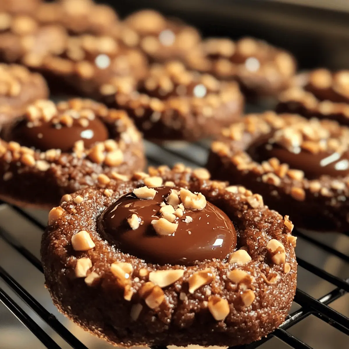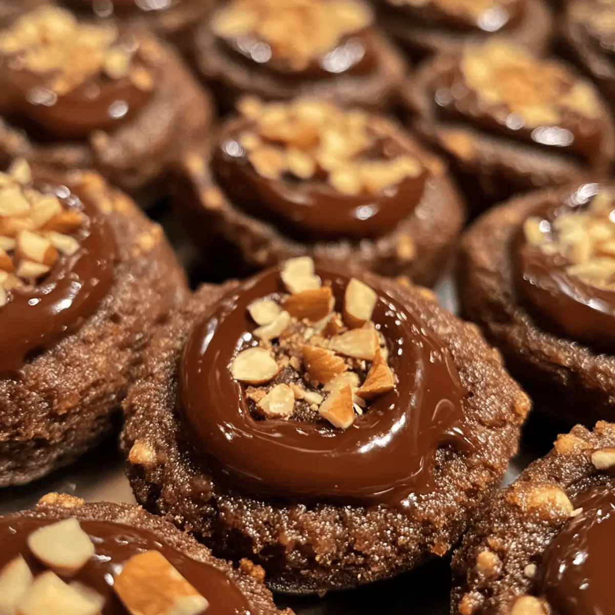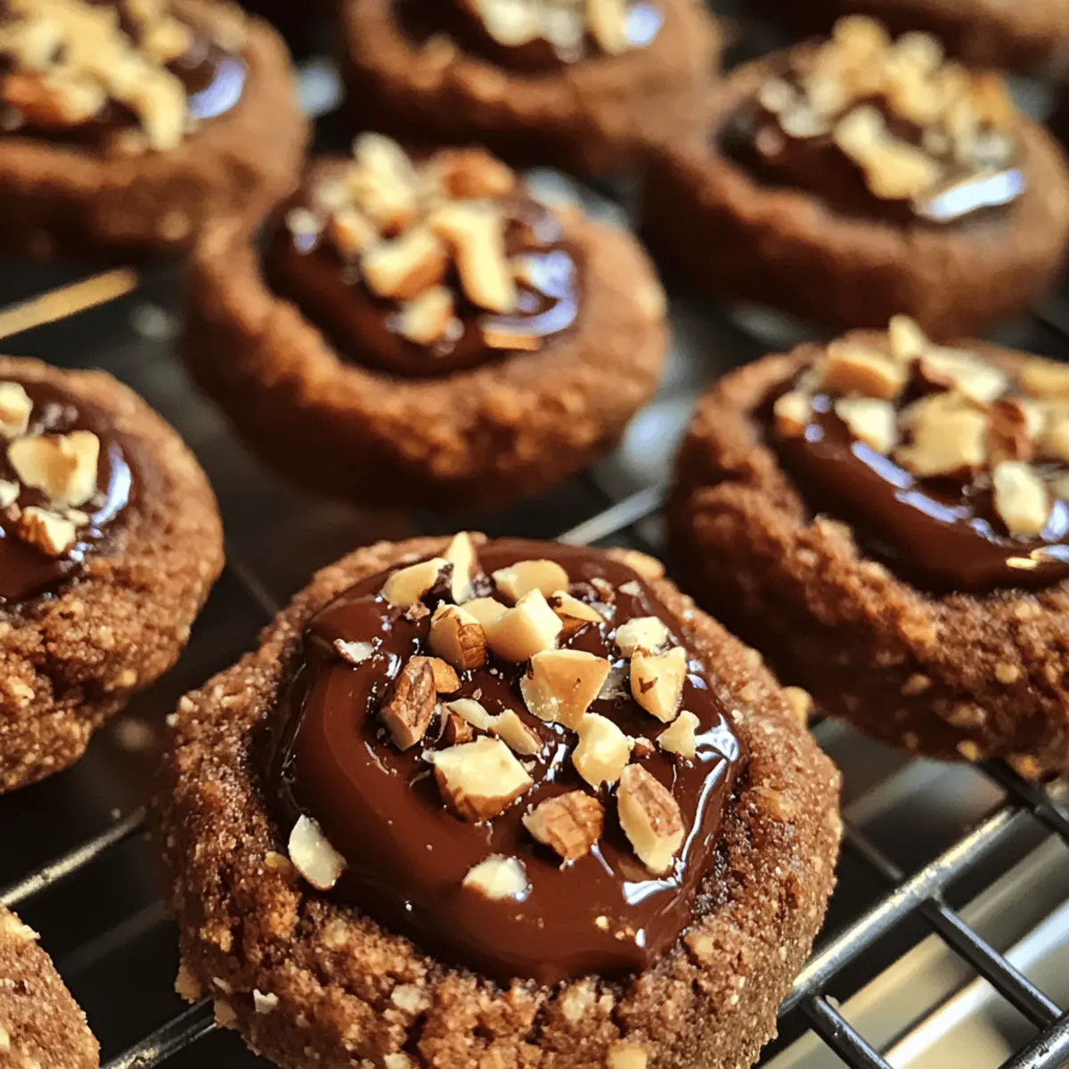 A soft, buttery cookie dough, rich with cocoa, and a swirl of luscious chocolate hazelnut spread—these are the irresistible Chocolate Hazelnut Thumbprint Cookies that promise to elevate any dessert table. As someone who finds joy in blending simple ingredients into delightful treats, I can assure you that these cookies are not only quick to whip up, but they also make for a gorgeous homemade gift that friends and family will adore. With the added crunch of finely chopped hazelnuts encasing each cookie, this versatile dessert offers a satisfying texture that is simply tempting. Who wouldn’t want to dive into a batch of cookies that can be customized with your favorite fillings, from fruity jams to dollops of cozy caramel? So, are you ready to create something truly special today? Why are these cookies a must-try? Melt-in-your-mouth goodness: The combination of buttery dough and rich cocoa creates a cookie that is irresistibly soft and scrumptious. Versatile filling options: Experiment by swapping the chocolate hazelnut spread with fruity jams or gooey caramel to surprise your taste buds! Quick and simple: With straightforward ingredients and easy steps, even beginner bakers can achieve delicious results. Perfect for gifting: These beautiful cookies make fantastic homemade gifts that showcase your baking skills without requiring hours in the kitchen. Crowd-pleasing treat: Whether for a casual snack with coffee or a dessert centerpiece at gatherings, these cookies are sure to impress everyone! Chocolate Hazelnut Thumbprint Cookies Ingredients • Get ready to make some magic! For the Dough Unsalted Butter – Ensures a rich and tender base; make sure it’s softened for easy mixing. Granulated Sugar – Sweetens the cookies and helps achieve the perfect texture. Vanilla Extract – Adds a warm, aromatic touch that brightens the flavor. All-Purpose Flour – Forms the backbone of the cookie, providing structure; avoid substitutes like high-gluten flour. Cocoa Powder – Infuses each bite with chocolatey goodness; Dutch-processed cocoa gives a smoother flavor profile. Salt – A pinch balances sweetness and enhances all the flavors beautifully. For the Coating and Filling Finely Chopped Hazelnuts – Adds a delightful crunch and ensures good adhesion to the cookies. Chocolate Hazelnut Spread – The star filling that makes these Chocolate Hazelnut Thumbprint Cookies irresistible; Nutella works wonderfully here. Whole Hazelnuts (optional) – For a decorative touch and extra crunch if you’re feeling fancy! Explore the endless possibilities with these versatile cookies, and let your creativity shine! Step‑by‑Step Instructions for Chocolate Hazelnut Thumbprint Cookies Step 1: Preheat and Prepare Preheat your oven to 350°F (175°C) and line two baking sheets with parchment paper. This will ensure the cookies bake evenly and don’t stick. Set your oven rack in the middle position for optimal heat distribution while baking these delicious Chocolate Hazelnut Thumbprint Cookies. Step 2: Cream Butter and Sugar In a large mixing bowl, cream together the softened unsalted butter and granulated sugar using an electric mixer on medium speed until the mixture is light and fluffy, about 3–4 minutes. This step creates the perfect base for your cookies, ensuring they turn out soft and tender. Step 3: Add Flavorings Add in the vanilla extract to the creamed butter and sugar mixture, beating until combined. This aromatic essence will enhance the overall flavor profile of your Chocolate Hazelnut Thumbprint Cookies. Make sure the mixture is smooth and well-blended for the best taste! Step 4: Incorporate the Dry Ingredients Gradually sift in the all-purpose flour, cocoa powder, and salt into the creamed mixture. Mix on low speed until just combined, ensuring no dry streaks remain. Take care not to overwork the dough; it should come together easily without being tough or sticky. Step 5: Shape and Coat Cookies Using your hands, roll the dough into 1-inch balls and then roll each ball in finely chopped hazelnuts until fully coated. This adds a delightful crunch to your Chocolate Hazelnut Thumbprint Cookies. Place the coated dough balls onto the prepared baking sheets, spacing them about 2 inches apart. Step 6: Create the Indentations Using the back of a rounded measuring spoon, gently press down in the center of each dough ball to create an indentation. Be careful not to press all the way through! This step is crucial for holding the decadent chocolate hazelnut filling later on. Step 7: Bake the Cookies Place the baking sheets in the preheated oven and bake for 10–12 minutes, or until the edges are set but the centers remain soft. Keep an eye on them to avoid overbaking; you want a slightly chewy texture in the center of your cookies. Step 8: Re-press Indentations Once out of the oven, let the cookies rest on the baking sheets for about 5 minutes. If the indentations have puffed up during baking, gently press the centers down again before transferring to a wire rack to cool completely. Step 9: Fill with Hazelnut Spread After the cookies have cooled, fill each indentation with a generous dollop of chocolate hazelnut spread. Use a small spoon or piping bag for precise application, making sure to fill each thumbprint generously for that rich, creamy experience in every bite. Step 10: Allow to Set and Serve Let the filled Chocolate Hazelnut Thumbprint Cookies sit for a few minutes to allow the filling to set slightly. Serve them warm or at room temperature, and keep any leftovers in an airtight container to maintain their delightful texture and flavor! How to Store and Freeze Chocolate Hazelnut Thumbprint Cookies Room Temperature: Store the cookies in an airtight container at room temperature for up to a week to maintain their soft texture and flavor. Fridge: If you prefer a chilled treat, keep them in the fridge for up to 10 days, but allow to come to room temperature before serving for the best taste. F