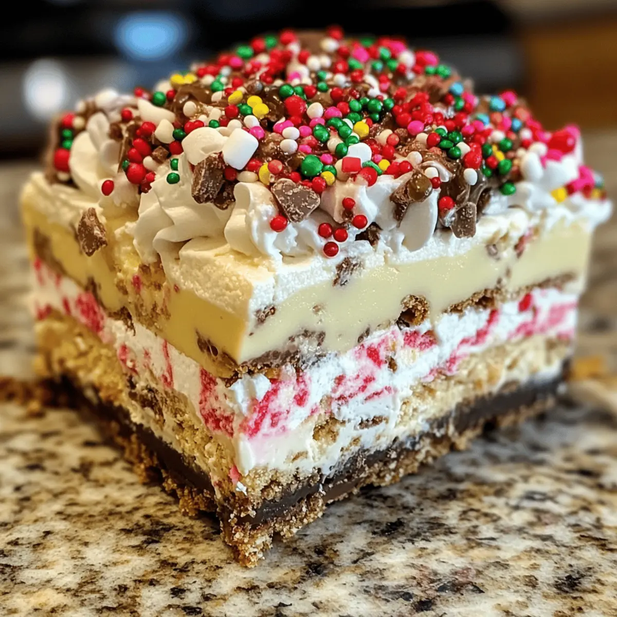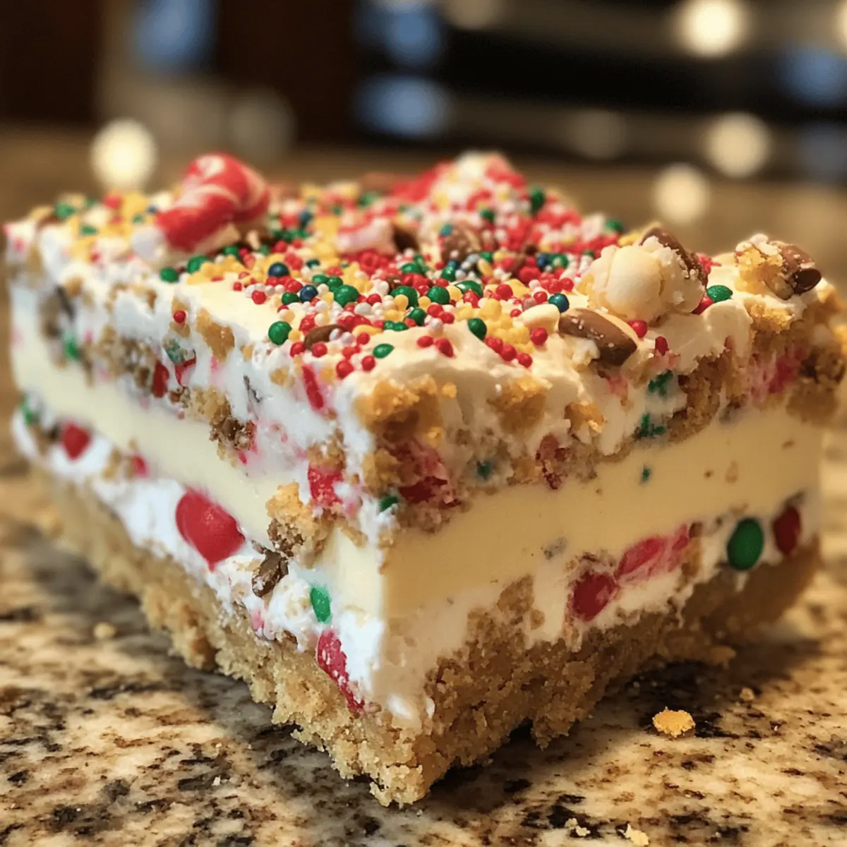 Standing in my kitchen, I can’t help but think about how the magic of the holidays often revolves around indulging in sweets that taste like pure joy. That’s why I’m excited to share my No Bake Christmas Cookie Lush—a dessert that perfectly embodies the spirit of the season without the hassle of heating up the oven. With just a few simple steps, you’ll create a festive masterpiece layered with velvety cheesecake, creamy pudding, and a buttery cookie crust that is downright irresistible. This easy holiday dessert not only saves you time but also guarantees a crowd-pleasing treat that will have everyone coming back for seconds. Ready to elevate your holiday tablescape? Let’s dive in and bring some delightful cheer to your celebrations! Why is Christmas Cookie Lush a Must-Make? Effortless Preparation: With zero baking required, this festive dessert is perfect for those busy holiday moments, allowing you to whip it up in no time. Delightful Layers: Experience the harmony of creamy cheesecake, rich pudding, and crunchy cookie layers, all adorned with bright holiday sprinkles. Crowd-Pleasing Flavor: Impress family and friends with a dessert that blends sweetness and texture, making it a guaranteed hit at any gathering. Versatile Options: Feel free to get creative! Substitute vanilla Oreos with graham crackers or add berry layers for an unexpected twist. Whether you love this recipe for its simplicity or its impressive presentation, it’s bound to become a holiday favorite. For even more delicious ideas, check out these Oreo Cheesecake Cookie cups or our delightful Peanut Butter Cookies. Christmas Cookie Lush Ingredients For the Cookie Crust Vanilla Oreo Cookies – These cookies create a sweet, creamy base and are also great for topping; feel free to swap with any vanilla-flavored sandwich cookies if desired. Butter – This rich ingredient binds the crust together; ensure to use melted butter for easy mixing. For the Creamy Layers Cream Cheese – Use full-fat cream cheese for a rich, smooth texture; remember to soften it to ensure easy blending. Powdered Sugar – This ingredient sweetens the cream cheese mixture without grittiness, making it perfectly smooth. Whipped Topping – Add a light, airy texture to the layers; opt for tub variety for convenience or substitute with homemade whipped cream for a fresher taste. For the Pudding Layer Cheesecake Instant Pudding Mix – Adds richness and flavor, but you can swap it with vanilla or white chocolate pudding if you prefer. Cold Milk – Essential for preparing the pudding mix; whole milk is recommended for a richer flavor. For Decoration & Texture Holiday Sprinkles – These vibrant colored sprinkles add a festive touch throughout the layers; choose your favorites to match your holiday theme. This No Bake Christmas Cookie Lush is the ultimate easy holiday dessert that guarantees sweet smiles all around! Step‑by‑Step Instructions for Christmas Cookie Lush Step 1: Prepare the Pan Begin by preparing your baking dish, preferably a 9×13 inch one. For easier cutting later, optionally line the bottom with parchment paper, allowing some overhang on the sides. This will help lift the dessert out once it’s set and chilled. Set the pan aside as you move on to making the crust for the Christmas Cookie Lush. Step 2: Make the Crust Crush 36 vanilla Oreo cookies into fine crumbs using a food processor or by placing them in a resealable bag and rolling over them with a rolling pin. Mix the cookie crumbs with melted butter and a handful of holiday sprinkles in a bowl until well combined. Firmly press this mixture into the bottom of your prepared baking dish, creating an even crust. Set it aside to chill while you create the creamy layers. Step 3: Cream Cheese Layer In a mixing bowl, combine softened cream cheese, peppermint extract, and powdered sugar. Using an electric mixer, beat the mixture on medium speed until smooth and creamy, about 2-3 minutes. Gently fold in one tub of whipped topping and a few holiday sprinkles until just blended. Spread this delicious cream cheese layer evenly over the cookie crust, smoothing it out with a spatula to make it nice and even. Step 4: Prepare Pudding Layer In another bowl, whisk together the cheesecake instant pudding mix and cold milk until it thickens, which should take about 2 minutes. The mixture should be thick and creamy; incorporate more sprinkles for added color and fun. Once ready, gently spread the pudding layer over the cream cheese layer, smoothing it out for an appealing finish that sets the stage for the whipped topping. Step 5: Top with Whipped Topping Take the remaining whipped topping and spread it evenly over the pudding layer, creating a fluffy layer of cream that adds texture to your Christmas Cookie Lush. Use a spatula to smooth it nicely, ensuring it covers the entire pudding layer completely. This will add a light, airy finish to the dessert and is essential for that luscious final look. Step 6: Final Touch Crumble the remaining 12 vanilla Oreo cookies over the top of the whipped topping for a crunchy garnish and added flavor. Then, sprinkle the remaining holiday sprinkles generously over the entire dessert, ensuring that it looks festive and inviting. This colorful topping enhances the visual appeal and makes it a perfect centerpiece for any holiday gathering. Step 7: Chill Refrigerate the entire dessert for at least 4 hours, or overnight for better results, allowing the layers to set and flavors to meld beautifully. For a firmer texture, you can freeze it for about 2-3 hours. When ready to serve, carefully lift the dessert from the pan using the parchment overhang, slice it into squares, and present this delightful Christmas Cookie Lush to your eager guests! Expert Tips for Christmas Cookie Lush Room Temperature Cream Cheese: Ensure your cream cheese is softened to room temperature for a smooth, lump-free mixture. This will make blending much easier! Chill for Best Results: 