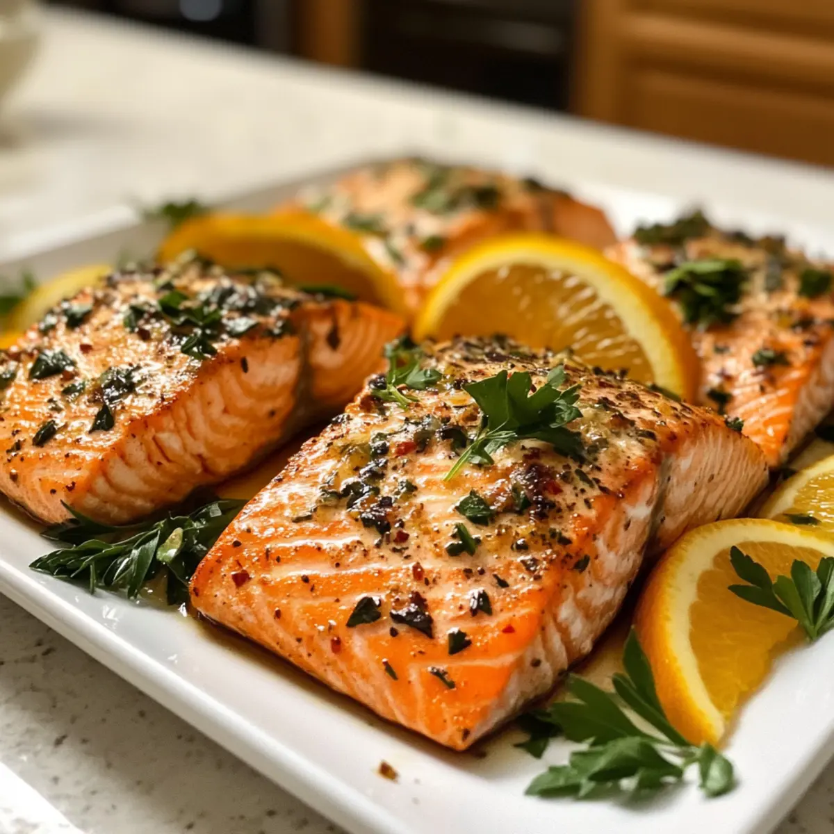 As I stood in the kitchen, the aroma of citrus and garlic from the marinating salmon filled the air, instantly transporting me to joyous holiday gatherings. This Christmas Salmon is not just a dish; it’s the festive centerpiece that will bring warmth and flavor to your holiday table. With its easy preparation and healthy profile, you can embrace indulgence without the guilt. Each succulent fillet is perfectly roasted, infused with vibrant flavors that will make your guests savor every bite. Imagine serving this stunning salmon alongside creamy mashed potatoes or roasted veggies, elevating your holiday dinner experience. Ready to impress and nourish? Let’s dive into this delightful recipe that’s designed to keep your festive spirit alive. What will your holiday table look like with this showstopper? Why is this Christmas Salmon a must-try? Deliciously Festive: This Christmas Salmon is the perfect blend of seasonal flavors, featuring zesty citrus and fragrant herbs. Easy Preparation: With straightforward steps, you can create an impressive dish without hours in the kitchen. Healthy Alternative: Packed with omega-3s, this dish balances indulgence with nutrition, making it holiday-friendly. Crowd-Pleasing Centerpiece: It’s a stunning visual and delightful flavor that will wow your guests during festive gatherings. Versatility: Pair it effortlessly with sides like creamy mashed potatoes or a fresh winter salad for a complete meal. Check out this Feta Stuffed Salmon for more salmon inspiration! Christmas Salmon Ingredients For the Marinade Salmon Fillets – Rich in omega-3 fatty acids, opt for fresh or high-quality frozen for the best flavor. Citrus (Lemon & Orange) – Adds a bright zest; you can substitute with lime or grapefruit for a different kick. Garlic Cloves – Provides aromatic depth; garlic powder is a great substitute if you’re short on fresh. Fresh Herbs (Parsley & Dill) – Elevates the flavor profile; feel free to use dried herbs, adjusting the quantity accordingly. Olive Oil – Key for marinating and roasting; avocado oil can be a healthy alternative for a different taste. For Seasoning Salt & Pepper – Essential for flavor enhancement; adjust to your personal taste. Holiday Spices – Incorporate festive spices like thyme or rosemary for added warmth and depth. This Christmas Salmon recipe is not just about cooking; it’s about creating unforgettable memories at your holiday table. Step‑by‑Step Instructions for Christmas Salmon Step 1: Preheat the Oven Start by preheating your oven to 400°F (200°C). This temperature will ensure your Christmas Salmon cooks evenly and develops a beautifully crisp exterior. While the oven is warming up, gather your ingredients and prepare your marinating space. A steady oven temperature is crucial for achieving that perfect flaky texture. Step 2: Prepare the Marinade In a medium-sized mixing bowl, combine olive oil, minced garlic, freshly squeezed lemon and orange juice, and finely chopped herbs such as parsley and dill. Whisk the mixture until it’s well blended, and don’t forget to season with salt and pepper to taste. The resulting marinade will infuse your Christmas Salmon with aromatic flavors, making every bite delightful. Step 3: Marinate the Salmon Place your salmon fillets in the bowl with the marinade, ensuring they are generously coated on all sides. Let the fillets marinate for at least 20 minutes at room temperature. This waiting period allows the flavors to penetrate the fish, ensuring a vibrant taste. While the salmon marinates, you can prepare your baking sheet for roasting. Step 4: Arrange the Salmon Line a baking sheet with parchment paper to prevent sticking and make cleanup easy. Carefully place the marinated salmon fillets skin-side down on the lined sheet. Ensure that the fillets are spaced slightly apart for even cooking. This arrangement allows hot air to circulate, promoting a beautifully roasted finish on your Christmas Salmon. Step 5: Roast the Salmon Transfer the baking sheet to your preheated oven and roast the salmon for 15-20 minutes. Look for the salmon to become opaque and to flake easily with a fork when done. The internal temperature should reach 145°F (62°C), signaling the perfect doneness, ensuring this Christmas Salmon is moist and tender for your festive gathering. Step 6: Rest and Garnish Once the salmon has finished roasting, remove it from the oven and let it rest for a few minutes. This resting period allows the juices to settle, enhancing the flavor profile. Just before serving, sprinkle some fresh herbs and arrange citrus slices on top to add a pop of color and freshness, making your Christmas Salmon a true centerpiece! What to Serve with Christmas Salmon The joy of a festive meal lies in pairing flavors that dance together beautifully on your plate. Creamy Mashed Potatoes: Their rich texture contrasts wonderfully with the flaky salmon, creating a comforting and satisfying experience. Roasted Seasonal Vegetables: The caramelized sweetness of roasted carrots and Brussels sprouts adds a delightful variability to the flavors, enhancing the fresh taste of the fish. Winter Salad: A light salad with spinach, pomegranate seeds, and a citrus vinaigrette refreshes the palate, balancing the richness of the salmon. Quinoa Pilaf: Nutty quinoa, mixed with chopped herbs and toasted nuts, provides a hearty side that complements the omega-3 richness of the salmon. Citrus Couscous: Fluffy couscous infused with lemon zest echoes the bright flavors of the salmon marinade, making it a perfect partner. Herbed Rice: Lightly seasoned rice with fresh herbs enhances the overall meal with added flavor without stealing the spotlight from the main dish. Garlic Bread: Crunchy, buttery garlic bread adds a rustic touch while providing a satisfying texture contrast when enjoyed alongside the tender salmon. White Wine Spritzer: A refreshing drink made with white wine and sparkling water keeps things light and