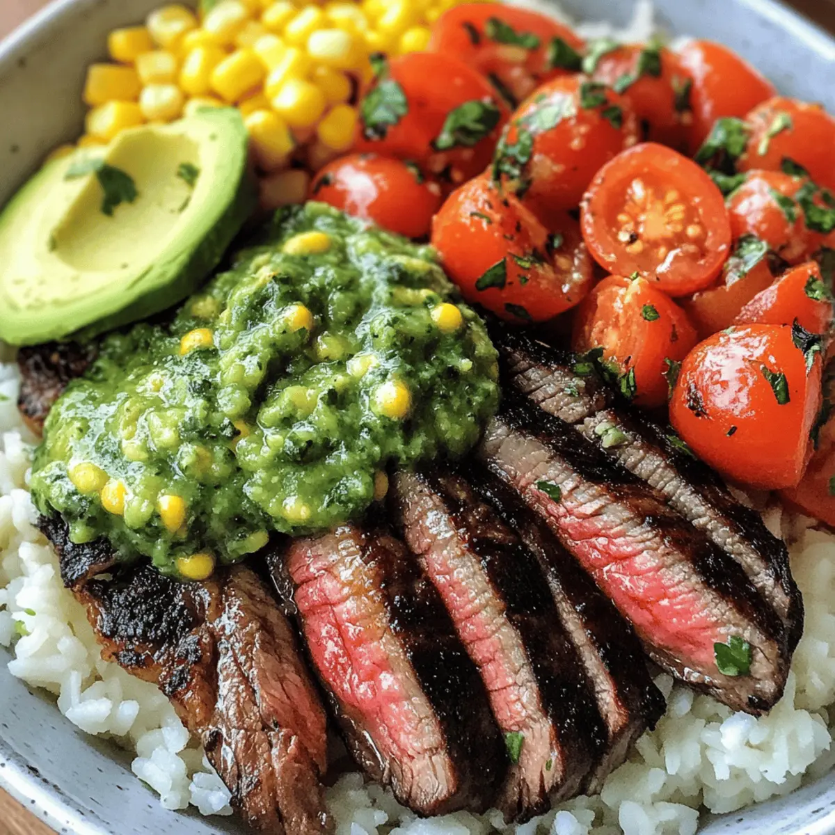 As I stood at my grill one evening, the tantalizing aroma of marinated steak filled the air, mingling with the bright scent of fresh lime and cilantro. I couldn’t help but smile, knowing that these Cilantro Lime Steak Bowls were about to transform a simple dinner into a lively celebration of flavors. This recipe strikes the perfect balance between being both satisfying and light, making it an easy dinner option or a fun meal prep idea for the week ahead. With juicy steak, crisp veggies, and creamy avocado all nestled over a bed of rice or quinoa, it’s a dish designed to please everyone at your table. Ready to discover how to whip up this delightful feast? Let’s dive into the recipe! Why Are Cilantro Lime Steak Bowls a Must-Try? Zesty Burst of Flavor: Each bite bursts with bright lime and fresh cilantro, bringing a refreshing twist to classic steak dishes. Simple to Prepare: With minimal prep time, you’ll have a delicious meal ready in no time. Perfect if you’re looking to escape fast food! Customizable Options: Feel free to swap in your favorite veggies or grains like quinoa for a low-carb version. Perfect for Meal Prep: Make ahead and store components separately; they keep well, bringing tasty ease throughout your week! Family-Friendly Appeal: These bowls are a hit with all ages, making dinner time a joyous occasion. Want more ideas? Check out my Spicy Garlic Steak or Philly Cheese Steak for more mealtime inspiration! Cilantro Lime Steak Bowls Ingredients For the Steak Marinade Flank Steak – The star of the dish; its rich flavor pairs perfectly with the zesty marinade. Fresh Lime Juice – Essential for brightening flavors; about 2 limes yield ¼ cup of juice. Olive Oil – Keeps the steak moist while marinating and helps distribute flavors evenly. Fresh Cilantro – Offers herbal freshness; can substitute with parsley for a different taste. Garlic (minced) – Elevates flavor depth; fresh is preferred, but garlic powder works too. Ground Cumin – Adds warmth and authenticity; a vital ingredient for true South American flair. Chili Powder – Use this for a mild kick; adjust based on your preferred heat level. Salt – Essential for enhancing overall flavor; don’t be shy! Black Pepper – Adds subtle heat and depth; freshly ground is always best. For the Bowls Cooked Rice (white or brown) – The perfect base; consider quinoa or cauliflower rice for a lighter option. Black Beans (1 can) – Packed with protein and fiber; pinto beans can be used as a substitute. Corn – Sweet and crunchy; fresh, frozen, or canned work nicely in this dish. Cherry Tomatoes – Freshness pops here; diced bell peppers can be a great swap. Avocado – Brings creaminess; guacamole can be used for a quick alternative. Red Onion (diced) – Offers sharpness and crunch; may substitute with green onions if desired. Feta Cheese (optional) – Adds tang and creaminess; skip for a dairy-free version. Extra Cilantro for garnish – Enhances freshness at serving. Lime wedges – Serve alongside to add an extra zesty touch to your meal. Dive into these mouth-watering Cilantro Lime Steak Bowls that promise to bring joy and flavor to your dinner table! Step‑by‑Step Instructions for Cilantro Lime Steak Bowls Step 1: Marinate the Steak In a medium bowl, whisk together ¼ cup of fresh lime juice, 3 tablespoons of olive oil, ¼ cup chopped cilantro, 2 minced garlic cloves, 1 teaspoon ground cumin, 1 teaspoon chili powder, 1 teaspoon salt, and ½ teaspoon black pepper until well combined. Place the flank steak in a shallow dish and pour the marinade over it, ensuring it’s fully coated. Cover and refrigerate for at least 30 minutes, or up to 4 hours for maximum flavor. Step 2: Prepare Rice and Beans While the steak marinates, cook rice according to package instructions, usually simmering over medium heat for about 15-20 minutes until tender and fluffy. In a small saucepan, heat one can of black beans over low heat, seasoning them to taste with salt and pepper. If using fresh corn, boil or sauté it for about 3-5 minutes until tender and sweet. Set these aside when done. Step 3: Cook the Steak Preheat your grill or a cast-iron skillet to medium-high heat. Once hot, carefully remove the flank steak from the marinade, allowing excess marinade to drip off. Grill the steak for 4-5 minutes per side, or until it reaches a medium-rare internal temperature of 130°F. Let it rest for 5-10 minutes after grilling, which is essential for juicy steak, then slice thinly against the grain. Step 4: Assemble Bowls To create your vibrant Cilantro Lime Steak Bowls, divide the cooked rice among four serving bowls. On top of the rice, evenly distribute the heated black beans, fresh corn, halved cherry tomatoes, sliced avocado, diced red onion, and the grilled steak slices. If desired, sprinkle crumbled feta cheese over each bowl for an extra layer of flavor. Step 5: Garnish and Serve Finish off your Cilantro Lime Steak Bowls by garnishing with additional chopped cilantro and serving with lime wedges on the side. This final touch enhances the dish’s zesty experience, inviting you to squeeze fresh lime juice over the top just before enjoying your flavorful creation. How to Store and Freeze Cilantro Lime Steak Bowls Fridge: Store assembled bowls in airtight containers for up to 3 days. Keep steak and vegetables separate from rice to maintain freshness. Freezer: For longer storage, freeze cooked steak and rice separately in freezer-safe bags for up to 2 months. Thaw overnight in the fridge before reheating. Reheating: Gently reheat in the microwave or on the stovetop to keep steak tender. Avoid overcooking to retain the juicy texture you love in your Cilantro Lime Steak Bowls. Meal Prep Tip: Consider prepping individual components, like rice and beans, ahead of time. This makes it easy to assemble fresh bowls throughout the week! Cilantro Lime Steak Bowls Variations Feel free to personalize your Cilantro Lime Steak Bowls and make