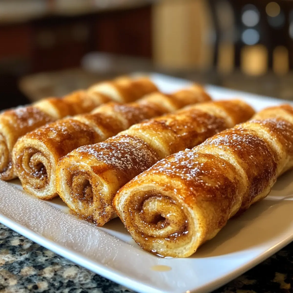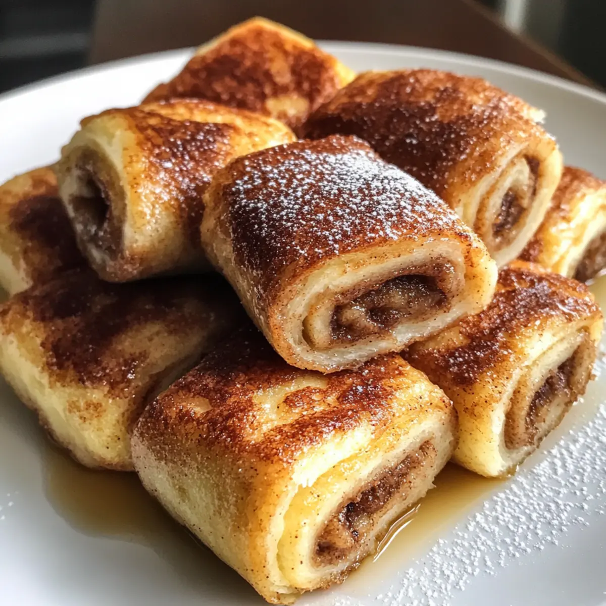 As I flipped through my recipe book on a cozy weekend morning, the aromas of cinnamon and vanilla danced in the air, leading me to a mouthwatering idea: Cinnamon Roll French Toast Roll-Ups. This delightful twist on breakfast combines the soft, gooey goodness of cinnamon rolls with the crunchy indulgence of French toast. Perfect for those who believe that breakfast should be anything but ordinary, these roll-ups are not only quick to prepare but also make a stunning centerpiece for family brunches or lazy Sunday mornings. Imagine the joy on your loved ones’ faces as they bite into the sweet, sticky surprise. Are you ready to elevate your breakfast game with this irresistible treat? Let’s dive into the magic of making these roll-ups! Why Are These Roll-Ups a Must-Try? Irresistible Flavor: The combination of cinnamon, sugar, and gooey warmth creates a breakfast experience that’s sure to impress. Simple Preparation: With just a few ingredients and easy steps, you can whip up a batch in no time—perfect for busy mornings or special occasions! Versatile Variations: Discover endless possibilities by switching out the fillings; try cream cheese or fruit preserves for a sweet twist. Crowd-Pleasing Delight: Family gatherings or brunch with friends? These Cinnamon Roll French Toast Roll-Ups are an instant hit, leaving everyone asking for seconds! Make Ahead Magic: Prepare them in advance to save time on busy mornings; they freeze beautifully and reheat easily for a perfect breakfast every time. Want more wonderful breakfast ideas? You’ll also love these Cinnamon Roll Pancakes and Cookie Butter Cinnamon Rolls that add a delicious twist to your morning! Cinnamon Roll French Toast Roll-Ups Ingredients • For the Roll-Ups White Sandwich Bread – Provides a soft and flexible base for easy rolling. Melted Butter (3 tablespoons) – Adds richness and helps the filling stick to the bread. Brown Sugar (3 tablespoons) – Infuses sweetness and flavor; substitute with white sugar for a lighter taste. Ground Cinnamon (2 tablespoons) – Essential for that signature cinnamon roll taste; feel free to add more for spice lovers. Large Eggs (3) – Binds the mixture together in the French toast batter. Milk (1 tablespoon) – Adds moisture; can be replaced with non-dairy milk for lactose-free options. Ground Cinnamon (½ teaspoon) – Enhances the coating’s spice for additional flavor. Vanilla Extract (½ teaspoon) – Gives a warm aroma to the egg mixture; don’t skip it! Butter for Frying (2-3 tablespoons) – Ensures a golden, crispy exterior; use clarified butter for a higher smoke point if desired. These Cinnamon Roll French Toast Roll-Ups are a delectable start to any day! Step‑by‑Step Instructions for Cinnamon Roll French Toast Roll-Ups Step 1: Prepare the Bread Begin by removing the crusts from your white sandwich bread slices. Using a rolling pin, flatten each slice until it’s about ¼ inch thick, making them pliable for rolling. This step is crucial for achieving the perfect Cinnamon Roll French Toast Roll-Ups without tearing. Step 2: Make the Cinnamon Filling In a small bowl, mix together the melted butter, brown sugar, and 2 tablespoons of ground cinnamon until well combined. Spread this delicious mixture evenly over each flattened bread slice, taking care to leave a small border around the edges. This filling will add a warm, gooey surprise in every bite. Step 3: Roll the Slices Carefully roll each slice of bread tightly, starting from one end and sealing the edges with gentle pressure as you go. Ensure the filling stays inside to keep your Cinnamon Roll French Toast Roll-Ups intact. Set the rolled-up slices aside, seam-side down, as you prepare the egg mixture. Step 4: Prepare the Egg Mixture In a shallow bowl, whisk together the eggs, milk, ½ teaspoon of ground cinnamon, and vanilla extract until the mixture is smooth and well blended. This egg bath will coat the roll-ups, giving them that classic French toast texture and flavor. Step 5: Heat the Skillet Place a non-stick skillet over medium heat and add 2-3 tablespoons of butter. Allow the butter to melt and begin to bubble, which will ensure an even cooking surface. This step is vital for creating that beautiful golden-brown crust on your roll-ups. Step 6: Coat the Roll-Ups Carefully dip each rolled slice into the egg mixture, making sure every part is evenly coated. Avoid oversoaking the rolls, as this could make them soggy. Once coated, place the roll-ups seam-side down in the hot skillet to start cooking. Step 7: Cook Until Golden Cook the roll-ups for 2-3 minutes, rotating them occasionally to achieve a golden brown color on all sides. Keep an eye on them to prevent burning; they should be crispy on the outside and the filling gooey and warm on the inside. Step 8: Serve Warm Once cooked to perfection, remove the Cinnamon Roll French Toast Roll-Ups from the skillet and place them on a serving platter. These delightful treats are best enjoyed warm. Consider serving them with a drizzle of maple syrup or a dusting of powdered sugar for an extra sweet touch! Expert Tips for Cinnamon Roll French Toast Roll-Ups Fresh Bread Essentials: Always use fresh, soft white sandwich bread to ensure easy rolling without tears. Stale bread can complicate the process. Control Egg Soaking: Be cautious not to oversoak the roll-ups in the egg mixture. A quick dip ensures they stay crispy without becoming soggy. Even Cooking Temperature: Maintain medium heat while cooking to get a beautiful, golden exterior. If it’s too hot, the outside may burn before the inside warms through. Prep Ahead: Consider preparing the rolls in advance for busy mornings. They freeze well and can be reheated in a skillet or microwave for quick breakfasts. Tasty Fillings: Don’t hesitate to get creative with the filling! Adding cream cheese or nut butter can elevate your Cinnamon Roll French Toast Roll-Ups to a new level. Cinnamon Roll French Toast Roll-Ups Variations Ex