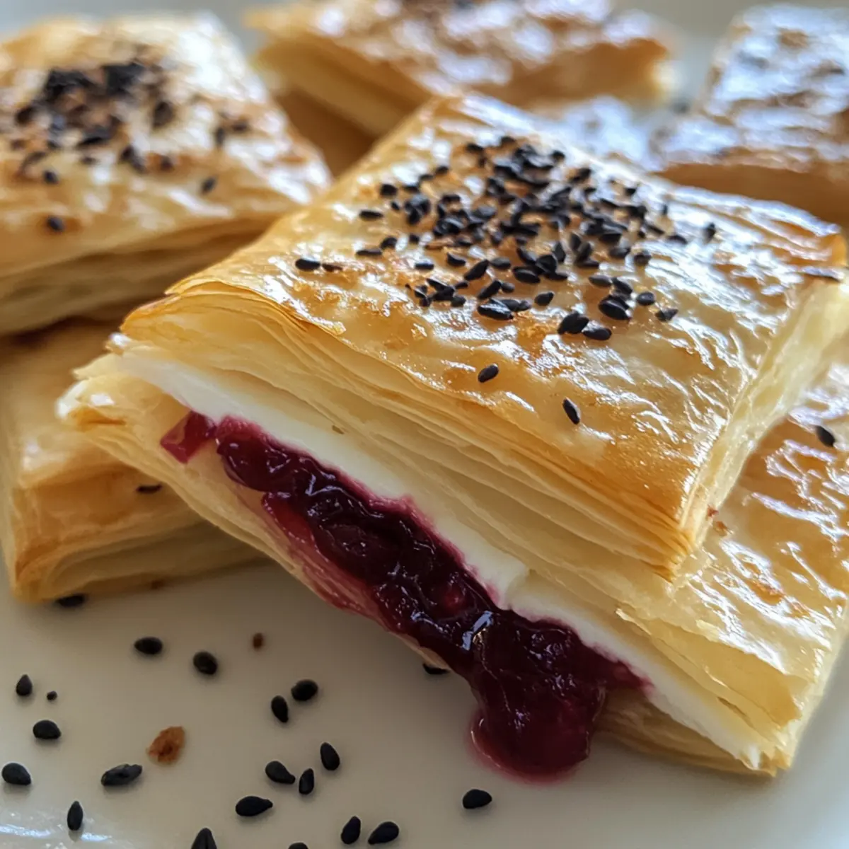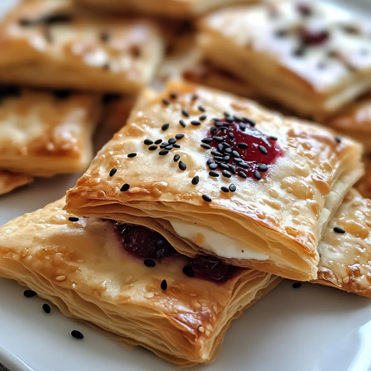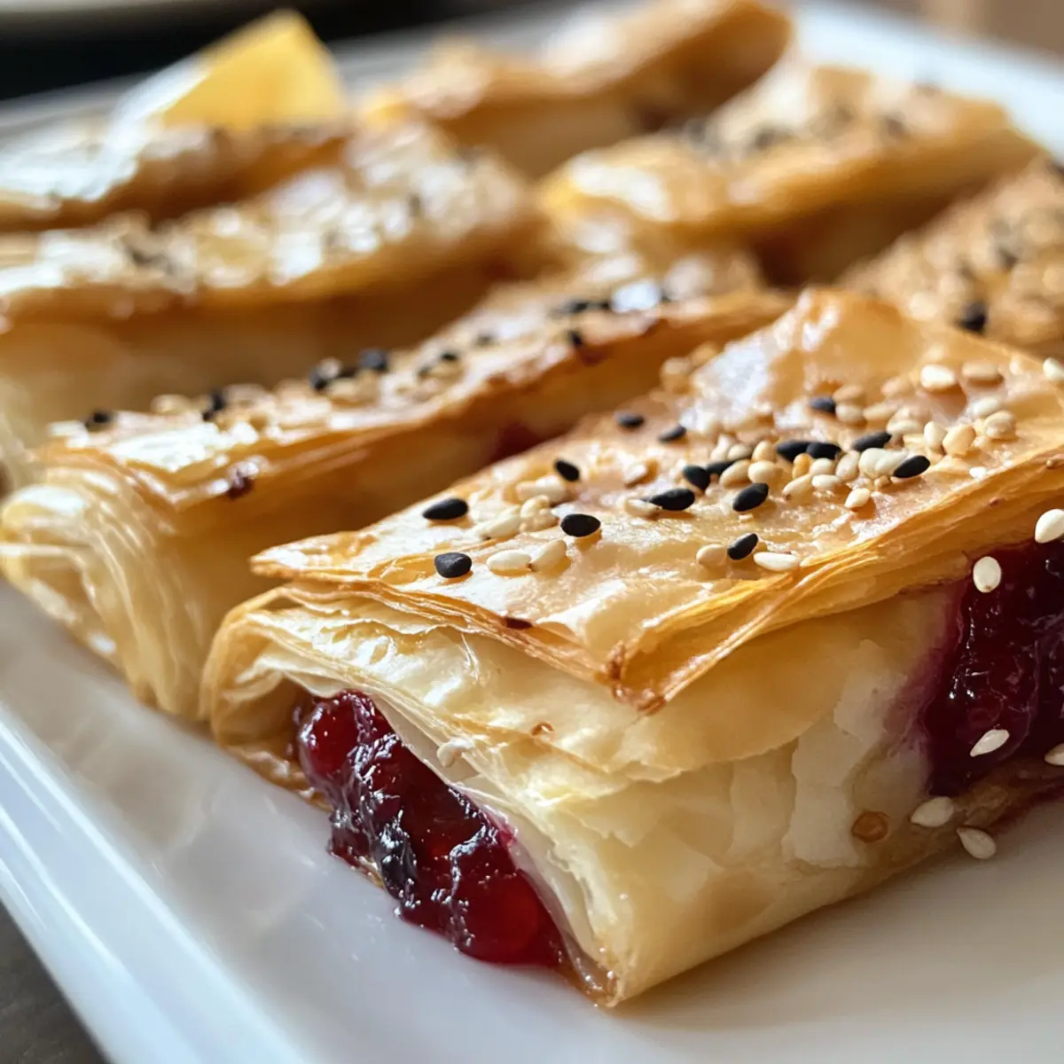 The first puff of warm, flaky pastry hitting the oven ignites memories of holiday gatherings where joy and comfort are in every bite. Let me introduce you to my festive Cranberry and Brie Filo Crackers, a delightful upgrade to traditional appetizers that will leave your guests raving. With buttery, delicate filo pastry hugging a melty slice of rich brie paired with sweet cranberry sauce, these bites promise to bring a burst of cheer to your entertaining. They’re quick to assemble, making them perfect for those last-minute holiday preparations, and they’re guaranteed to please your crowd, whether served warm from the oven or cool alongside a charcuterie board. Are you ready to elevate your holiday menu with these irresistible treats? Why Choose Cranberry and Brie Crackers? Irresistible Flavor: The harmony of creamy brie and sweet cranberry sauce creates a flavor explosion that will have everyone coming back for more. Quick Prep Time: Assemble these crackers in just minutes, giving you more time to enjoy the festivities and less time worrying about appetizers. Crowd-Pleasing Appeal: Perfect for holiday gatherings, they’re a hit with both adults and kids alike—watch them vanish from the table! Versatile Options: Feel free to customize with different cheeses or savory add-ins to suit your taste, making these crackers as unique as your holiday spirit. Elegant Presentation: These beautiful bites are not just tasty but also add a touch of sophistication to your entertaining spread—ideal alongside a Cranberry Orange Bundt or paired with Cookies Cream Cupcakes. Cranberry and Brie Filo Crackers Ingredients For the Crackers • Filo Pastry – This flaky pastry is the star of the show; make sure it is fully thawed before use for the best texture. • Butter – Adds a rich flavor and ensures a golden, crispy finish; substitute with olive oil for a dairy-free option. • Brie – The creamy heart of these crackers with a tangy kick; camembert works well if you’re looking for a change. • Cranberry Sauce – The perfect sweet element; feel free to use store-bought or your homemade version for a personal touch. For the Crunch • Flaked Almonds – Offers delightful crunch; walnuts or hazelnuts can be swapped in for a different flavor profile. • Black Sesame Seeds – Adds nutty notes and visual pop; poppy seeds can be a great alternate if you’re out of sesame. Celebrate the festive season with your homemade Cranberry and Brie Filo Crackers that are not only delicious but also memorable! Step‑by‑Step Instructions for Cranberry and Brie Filo Crackers Step 1: Prep the Pastry Begin by preheating your oven to 180°C (350°F). While the oven heats, line two baking trays with parchment paper to prevent the crackers from sticking. Ensure your filo pastry is fully thawed as this will help achieve the delicate, flaky texture that is essential for your Cranberry and Brie Filo Crackers. Step 2: Cut Filo Once ready, take the thawed filo sheets and place them on a clean, dry surface. Carefully cut the sheets into 36 square pieces by dividing each sheet into thirds, then cutting each third in half. This ensures that your pastry is perfectly sized for wrapping the delicious filling that you’ll create. Step 3: Assemble Now it’s time to assemble your crackers! Brush one filo square with melted butter, and at the end of the square, place a slice of creamy brie, followed by a teaspoon of cranberry sauce, and a sprinkle of flaked almonds. Gently roll the pastry away from you, sealing the ends tightly to prevent any filling from leaking out while baking. Step 4: Brush & Sprinkle Transfer the assembled crackers onto the prepared baking trays, ensuring they have space between them for even cooking. Brush the tops of the crackers with any remaining melted butter to enhance their golden color while baking. Next, sprinkle black sesame seeds over the tops for added flavor and visual appeal, making your Cranberry and Brie Filo Crackers irresistible! Step 5: Bake It’s time to bake! Place the trays in your preheated oven and let the crackers bake for 15-20 minutes. Keep an eye on them; they should turn a beautiful golden brown and emit a mouthwatering aroma. This bake time might vary slightly depending on your oven, so you may need to adjust as necessary for perfect results. Step 6: Serve Warm Once baked, remove your Cranberry and Brie Filo Crackers from the oven and allow them to cool for a few minutes before serving. For the best taste experience, enjoy them warm while the brie is still gooey and the outer layer is delightfully crispy. These festive treats are sure to be a hit at any gathering! Tips for the Best Cranberry and Brie Filo Crackers Thaw Properly: Ensure your filo pastry is completely thawed to prevent tearing; this is crucial for perfect Cranberry and Brie Filo Crackers. Watch Your Butter: Too much melted butter can make the pastry soggy; use just enough to coat without drenching. Seal Well: Pinch the ends tightly while rolling to avoid filling leaks during baking; a tight seal ensures crispy, neat crackers. Bake in Batches: Avoid overcrowding the trays; give each cracker space to expand and brown evenly for the best texture. Serve Immediately: For the ultimate experience, serve these crackers warm as soon as they come out of the oven—everyone loves gooey brie! Cranberry and Brie Filo Crackers Variations Feel free to let your creativity shine as you explore these delightful twists on the classic recipe! Cheese Swap: Substitute brie with creamy goat cheese or sharp cheddar for different flavor profiles. Each cheese brings a unique richness that ensures a memorable bite. Fruity Layer: Add a layer of apple or pear slices under the brie for a sweet, fruity crunch. This combination creates a refreshing contrast, elevating your crackers to a new level of deliciousness. Nutty Crunch: Experiment with pistachios or pecans instead of flaked almonds. The nutty notes will add an exciting twist and t