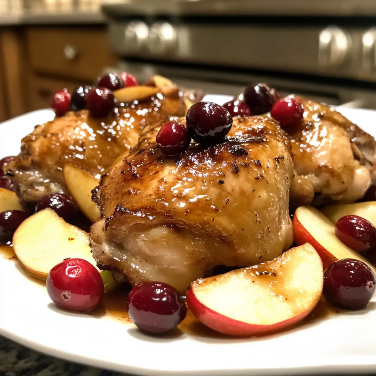 As I took a deep breath, the aroma of roasting chicken and sweet apples transformed my kitchen into a cozy haven, reminiscent of autumn gatherings. This Maple-Glazed Roast Chicken with Apples and Cranberries promises not only a delicious meal but also an easy-to-make feast that elevates any occasion—from holiday celebrations to a simple weeknight dinner. The secret lies in its enchanting combination of juicy chicken thighs, tender fruit, and a luscious maple glaze that brings it all together. Not only does this dish provide a nutritious balance of flavors, but it also lets you enjoy a comforting and indulgent dinner without spending hours in the kitchen. Who wouldn’t want to discover a go-to recipe that satisfies both cravings and schedules? Why is this chicken recipe a must-try? Simplicity, this Maple-Glazed Roast Chicken requires minimal prep yet delivers big flavors, making it ideal for busy weeknights. Aromatic ingredients like rosemary and garlic infuse the dish with depth and intrigue. Versatile options mean you can tailor it to your preferences, whether using boneless chicken or mixing up the fruit. Crowd-pleasing delight, this dish is sure to impress guests at holiday gatherings or cozy dinners. Serve it alongside roasted vegetables or grains like quinoa for a complete meal. For a touch of sweetness, don’t forget to pair it with Sweet Honey Glazed carrots to make a well-rounded feast. Enjoy the magic of seasonal flavors in every bite! Cranberry Glazed Chicken Ingredients • Spice up your dinner with these wholesome ingredients! For the Chicken Chicken Thighs – Bone-in provides rich flavor and juiciness. Can be swapped with boneless skinless thighs or breasts, adjusting cooking time as needed. Salt and Pepper – Essential for seasoning, enhancing the overall flavor of the chicken. For the Glaze Butter – Adds richness and helps in searing the chicken to golden perfection. Replace with olive oil for a dairy-free option. Olive Oil – For searing chicken until golden brown; a neutral oil works great if you prefer. Minced Garlic – Infuses the glaze with a depth of flavor; feel free to omit if avoiding garlic. Balsamic Vinegar – Balances sweetness and acidity in the glaze; apple cider vinegar can be a suitable substitute. Maple Syrup – The key ingredient for a delicious glaze; consider honey or agave syrup for alternatives. For the Fruit Fresh Cranberries – Offer a tart contrast to sweetness; if unavailable, use drained canned cranberries. Apples – Add texture and sweetness; opt for Honeycrisp or Gala for the best flavor. Herb & Spice Elements Fresh Rosemary – Adds aromatic notes; you can substitute with thyme or sage. For Serving Carrots and Sweet Potatoes – Roasted alongside the chicken, they bring homey flavors to complement the dish. Consider using these for a fantastic Cranberry Glazed Chicken with Carrots & Sweet Potatoes experience! Embrace the warmth of this comforting meal, bringing together sweetness, tartness, and savory goodness in a delightful harmony. Step‑by‑Step Instructions for Cranberry Glazed Chicken with Carrots & Sweet Potatoes Step 1: Preheat the Oven Begin this delightful journey by preheating your oven to 375°F (190°C). This ensures that your Cranberry Glazed Chicken will cook evenly and develop that irresistible golden-brown color. Use a reliable oven thermometer if needed to confirm the temperature, setting the stage for a beautifully roasted dish. Step 2: Season the Chicken While the oven heats up, generously season the bone-in chicken thighs with salt and pepper, ensuring an even coating on both sides. This vital step enhances the overall flavor of your chicken, setting a robust base for the sweet and tangy elements to shine through in your Cranberry Glazed Chicken. Step 3: Sear the Chicken In an oven-safe skillet, melt 2 tablespoons of butter and add 1 tablespoon of olive oil over medium-high heat. When the mixture is hot and bubbling, place the seasoned chicken thighs skin-side down in the skillet, searing them for 2-3 minutes until they turn a deep golden brown. This creates a mouthwatering crust that locks in moisture. Step 4: Add the Fruit and Herbs Once the chicken is beautifully seared, remove the skillet from heat and arrange sliced apples, fresh cranberries, and a few sprigs of rosemary around the chicken. Their sweet and tart flavors will meld with the chicken, creating a festive and aromatic base for the Cranberry Glazed Chicken with Carrots & Sweet Potatoes. Step 5: Roast in the Oven Transfer the skillet to your preheated oven and roast for 25-30 minutes. The chicken should reach an internal temperature of 165°F (74°C), while the apples become soft and luscious. Keep an eye on the chicken’s color and aroma to ensure it roasts to perfection, filling your kitchen with a delightful scent. Step 6: Prepare the Maple Glaze As the chicken roasts, prepare the luscious maple glaze. In a small skillet over medium-high heat, sauté 2 cloves of minced garlic in 1 tablespoon of olive oil until fragrant, about 1 minute. Stir in ¼ cup of balsamic vinegar and ½ cup of maple syrup, bringing the mixture to a boil before reducing the heat. Simmer for about 5 minutes until the glaze thickens slightly. Step 7: Drizzle and Serve Once your chicken is cooked and ready, carefully drizzle the savory maple glaze over the top, allowing it to coat and enhance the flavors of the juicy chicken. Serve your beautiful Cranberry Glazed Chicken with Carrots & Sweet Potatoes alongside a fresh garden salad or some roasted veggies for a complete and satisfying meal. Variations & Substitutions for Cranberry Glazed Chicken Feel free to play with this recipe and make it your own, embracing the delightful harmony of flavors! Dairy-Free: Substitute butter with additional olive oil to maintain richness without dairy. Boneless Chicken: Use boneless skinless thighs or breasts; cut down cooking time to prevent drying out for juicy, tender meat. Different A