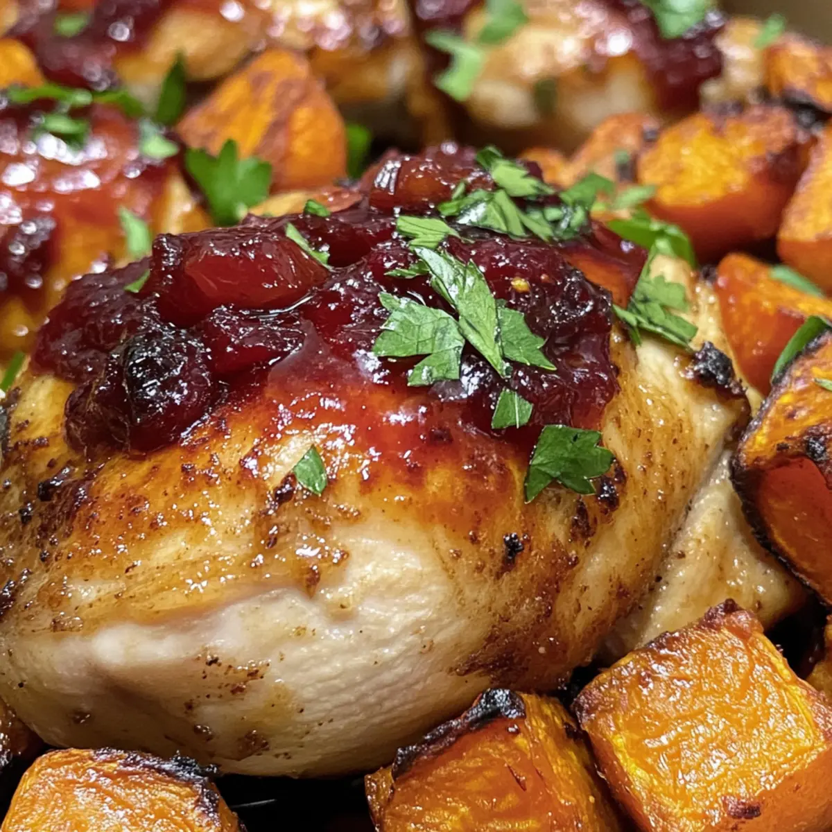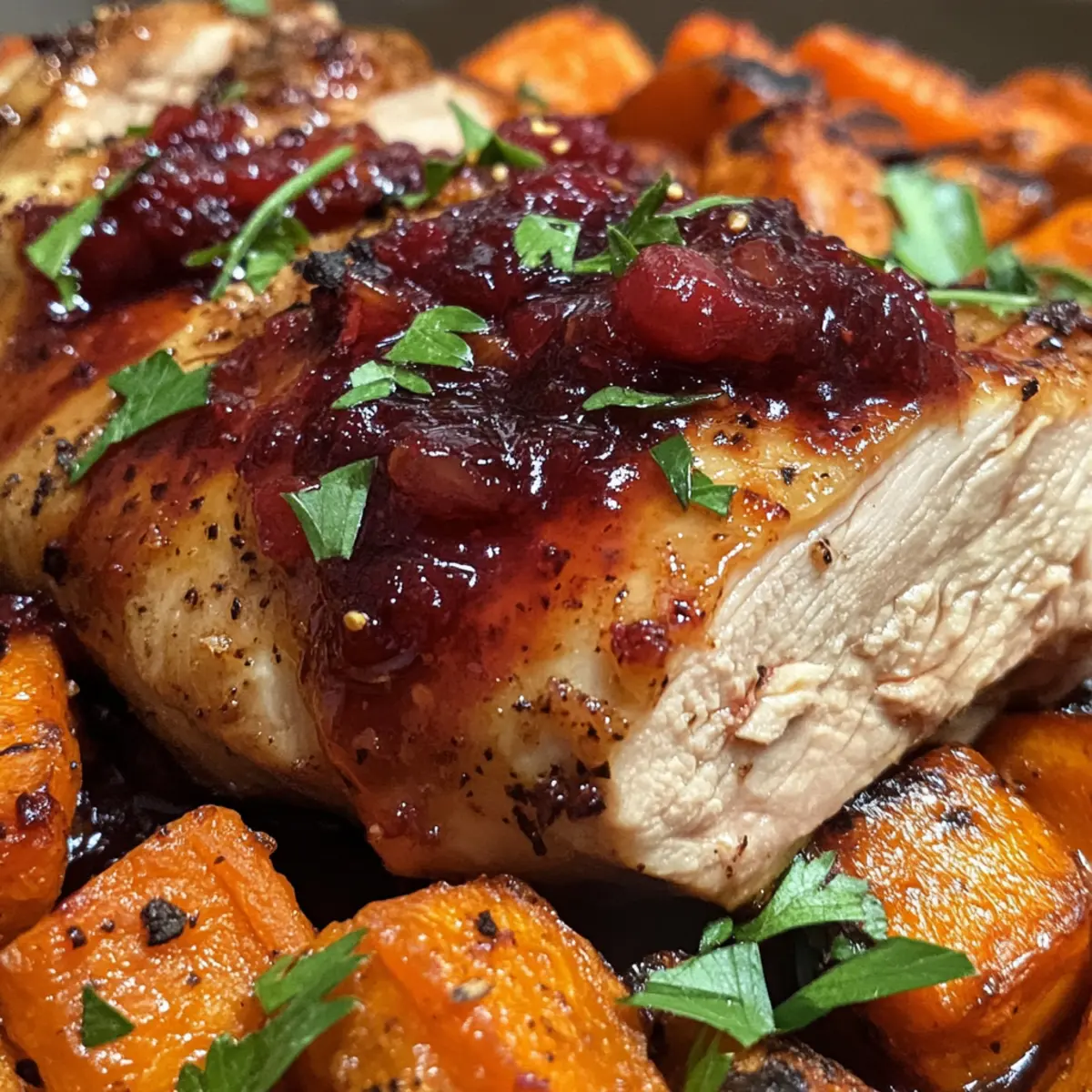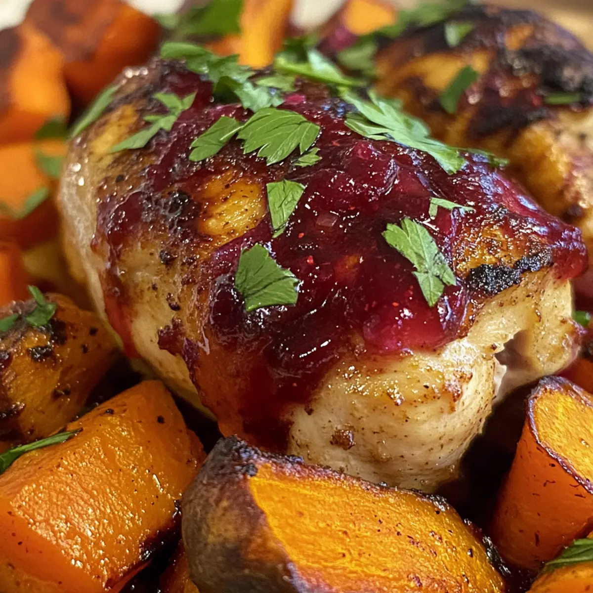 As the first chill of autumn wraps around us, I find myself longing for a dish that brings warmth and comfort. That’s where my Cranberry Glazed Chicken with Roasted Carrots & Sweet Potatoes comes in—a perfect embrace for those cozy family dinners. This recipe is an easy prep masterpiece that not only showcases the vibrant seasonal flavors of tart cranberries and sweet vegetables, but also wraps them in a loving glaze that tantalizes your taste buds. Plus, it’s a healthier twist on comfort food, ensuring you can enjoy those rich flavors guilt-free. Whether you’re gathering friends for a festive feast or just treating yourself after a long day, this dish holds the promise of nourishment and joy. Are you ready to elevate your dinner routine and bring a splash of holiday spirit to the table? Why is this dish a must-try? Comforting Wholesomeness: This Cranberry Glazed Chicken with Carrots & Sweet Potatoes is the ultimate cozy meal, perfect for fall evenings. Health-conscious Indulgence: The dish is not only delicious but also incorporates seasonal produce, making it a nutrient-rich choice. Effortless Preparation: With simple steps and minimal fuss, you can have a gourmet meal on the table in no time! Pair it with crusty bread for soaking up that luscious glaze, or enjoy it with a fresh salad. This recipe is designed to impress at family gatherings or cozy dinner nights, ensuring everyone asks for seconds! Cranberry Glazed Chicken Ingredients • The key to creating this seasonal delight lies in the ingredients. For the Chicken Chicken Breasts – The main protein source that stays lean and tender when roasted. For the Glaze Cranberries – Provides the tart flavor that makes the glaze shine; fresh is preferred. Honey or Maple Syrup – Sweetens the glaze, balancing the tartness of cranberries; choose based on your sweetness preference. Balsamic Vinegar – Adds depth and tang to the glaze; can be substituted with apple cider vinegar for a different flavor note. Dijon Mustard – Enhances the complexity of the sauce; substitute with whole grain mustard for a coarser texture. For the Vegetables Carrots – Adds sweetness and vibrant color; parsnips can be used as a delightful substitute. Sweet Potatoes – Provides earthiness and natural sweetness; regular potatoes can be swapped for a different texture. Olive Oil – Helps roast the chicken and vegetables, adding moisture; other oils can work, but olive offers a richer flavor. Garlic Powder – Adds savory depth; feel free to use fresh minced garlic for a bolder punch. Paprika – Introduces warmth and color; try smoked paprika for an extra layer of flavor. Salt and Pepper – Essential for seasoning; adjust to fit your taste. Garnish Fresh Parsley – Brightens the dish as a garnish; thyme or other fresh herbs would work beautifully, too. With these carefully selected Cranberry Glazed Chicken with Carrots & Sweet Potatoes ingredients, you’re all set to create a meal that’ll warm hearts and fill tummies! Step‑by‑Step Instructions for Cranberry Glazed Chicken with Carrots & Sweet Potatoes Step 1: Preheat Your Oven Begin by preheating your oven to 400°F (200°C). While it warms up, prepare a large baking sheet by lining it with parchment paper or drizzling it with olive oil to prevent sticking. This will be the stage where your flavorful Cranberry Glazed Chicken and vibrant vegetables come to life. Step 2: Prepare the Vegetables In a spacious bowl, toss together the cut carrots and sweet potatoes with olive oil, garlic powder, paprika, salt, and pepper. Make sure every piece is well-coated for even roasting. Once seasoned, arrange the vegetables in a single layer on the prepared baking sheet, ensuring they have enough space to caramelize beautifully. Step 3: Make the Cranberry Glaze In a medium saucepan over medium heat, combine fresh cranberries, honey (or maple syrup), balsamic vinegar, and Dijon mustard. Stir occasionally as the mixture cooks for about 8-10 minutes, until the cranberries start to burst and the glaze thickens to a delightful consistency. This glaze will add a beautiful tart sweetness to your chicken. Step 4: Prepare the Chicken While the glaze simmers, pat the chicken breasts dry and rub them with the remaining olive oil. Season both sides generously with salt and pepper. Place the seasoned chicken on the same baking sheet as the vegetables. This way, the chicken can soak up those delicious flavors as everything roasts together. Step 5: Glaze the Chicken Once your cranberry glaze is ready, generously brush it over the chicken breasts, making sure to cover them completely for maximum flavor. Save a bit of the glaze for serving later. This will add a beautiful sheen and delicious taste to your Cranberry Glazed Chicken, enhancing its appeal. Step 6: Roast Everything Together Transfer the baking sheet to the preheated oven and roast for 25-30 minutes. Keep an eye on the chicken and vegetables; aim for the chicken to reach an internal temperature of 165°F (74°C) while the vegetables become tender and slightly caramelized. This is when you’ll see your vibrant dish coming together. Step 7: Rest and Serve Once cooked, remove the baking sheet from the oven and let the chicken rest for about 5 minutes. This resting period allows the juices to redistribute within the meat. After resting, slice the chicken and serve over the roasted carrots and sweet potatoes, drizzling any remaining cranberry glaze on top and finishing with a sprinkle of fresh parsley for that lovely touch. Helpful Tricks for Cranberry Glazed Chicken Uniform Cuts: Ensure your carrots and sweet potatoes are cut evenly to guarantee uniform roasting. This prevents some pieces from burning while others remain undercooked. Space Matters: Give your chicken and vegetables enough space on the baking sheet. Overcrowding will steam the veggies instead of roasting them, resulting in a less appealing texture. Sweetness Balance: Taste and adjust the sweetness of 