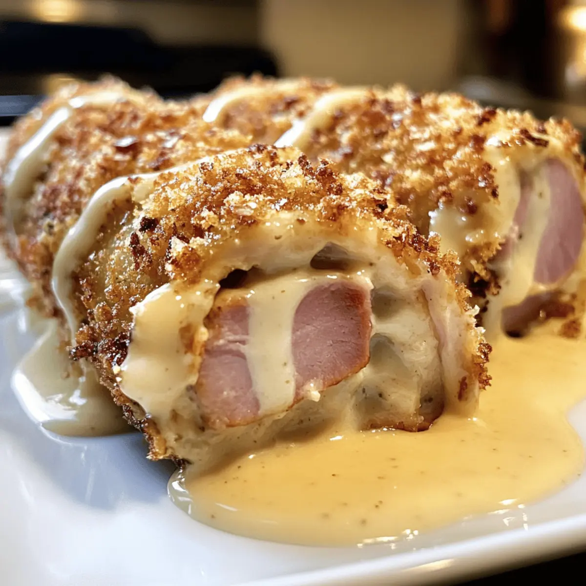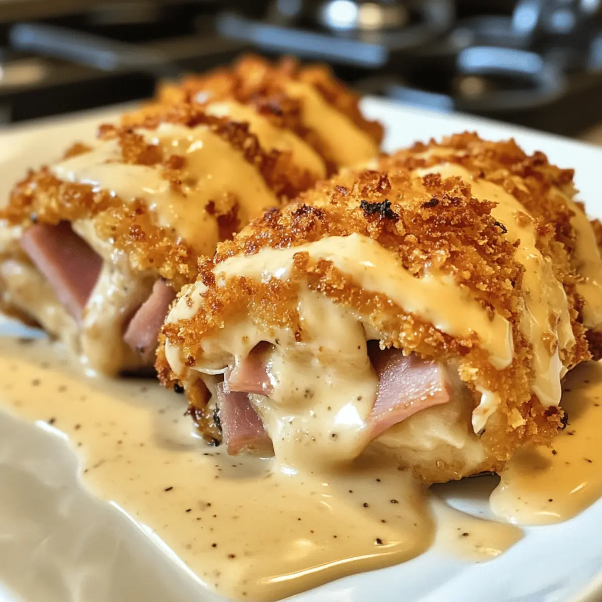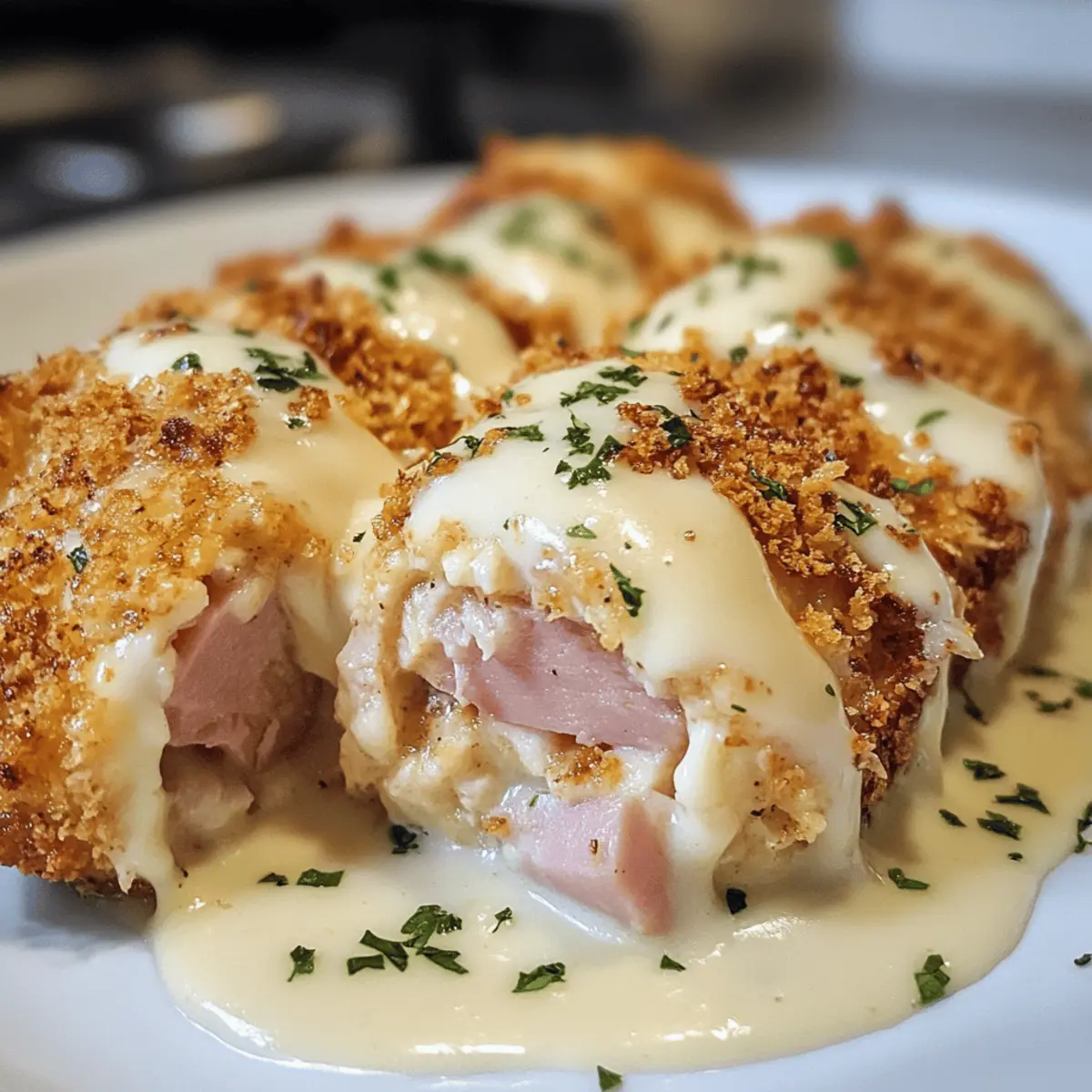 “Have you ever found yourself pondering how to elevate a weeknight dinner into something truly special? Let me introduce you to my Deliciously Creamy Chicken Cordon Bleu—a comforting classic that’s bound to impress. This dish combines juicy chicken breasts, savory ham, and perfectly melted Swiss cheese, all enveloped in a golden, crispy crust. The best part? It’s not only delicious but also straightforward to make, transforming your kitchen into a cozy haven without hours of prep. Plus, with options for low-fat and gluten-free adaptations, you can cater to your family’s needs while keeping flavor at the forefront. So, are you ready to discover the creamy perfection of this beloved recipe?” Why Is This Chicken Cordon Bleu Special? Comforting Delight: Imagine the satisfying crunch of the crispy coating combined with the tender chicken and creamy cheese—it’s a flavor hug! Quick Prep: With straightforward ingredients, it takes just 30 minutes from prep to plate, perfect for busy weeknights or when you want to impress guests. Customizable Options: You can effortlessly tailor this dish by swapping cheeses or using gluten-free breadcrumbs, ensuring everyone can enjoy it. Crowd-Pleasing Flavor: This dish appeals to all palates, making it ideal for family dinners or special occasions—a sure way to win over picky eaters! For another cozy comfort option, check out my Crockpot Chicken Corn or indulge in some Buffalo Chicken Taquitos for a fun twist! Creamy Chicken Cordon Bleu Ingredients • Discover the essentials for this comfort food delight! For the Chicken Chicken Breasts – The main protein source providing tenderness and moisture. Ham (8 slices) – Adds savory richness; use pre-sliced for convenience. Swiss Cheese (8 slices) – Melts smoothly to create that creamy texture. For the Coating All-Purpose Flour (1 cup) – Creates a crispy outer layer; gluten-free flour works as a substitute. Eggs (2, beaten) – Helps the breadcrumbs stick; consider flaxseed meal as a vegan alternative. Breadcrumbs (1 cup) – Forms that delightful crunch; swap for whole wheat breadcrumbs for a healthier option. For the Flavor Salt and Pepper – Essential for enhancing the dish’s flavor profile. Butter (2 tbsp) and Olive Oil (1 tbsp) – Adds richness for sautéing; use a lighter oil for a lower fat version. Heavy Cream (1 cup) – The star of the creamy sauce; light cream or Greek yogurt can be used for a lighter take. Dijon Mustard (1 tbsp) – Provides a zesty kick to the sauce. Garlic Powder (1 tsp) and Onion Powder (1 tsp) – Elevate the dish’s aromatic profile. Parmesan Cheese (½ cup, grated) – Enhances umami in the creamy sauce. Chopped Parsley – A fresh garnish to brighten the presentation. Explore the comforting flavor of this Creamy Chicken Cordon Bleu, perfect for a delightful family dinner! Step‑by‑Step Instructions for Creamy Chicken Cordon Bleu Step 1: Preheat Your Oven Begin by preheating your oven to 350°F (175°C). This ensures it’s perfectly hot for the Chicken Cordon Bleu when you’re ready to bake it. While the oven warms up, gather your ingredients and tools, such as a meat mallet, baking dish, and a large skillet, to keep your cooking process smooth. Step 2: Pound the Chicken Take your chicken breasts and place them between two sheets of plastic wrap or parchment paper. Using a meat mallet, gently pound the chicken to about ¼ inch thickness; this helps them cook evenly and remain tender. You’ll know it’s ready when it’s flattened with a consistent thickness across the surface, making it easy to roll. Step 3: Season the Chicken Sprinkle salt and pepper on both sides of the flattened chicken breasts to enhance the flavors in your Creamy Chicken Cordon Bleu. Take a moment to ensure each piece is evenly coated, as this simple seasoning step plays a crucial role in bringing out the deliciousness of the dish when cooked. Step 4: Add the Ham and Cheese Place two slices of ham and two slices of Swiss cheese on each chicken breast. Make sure they are evenly distributed, covering the surface of the chicken, as this ensures every bite is packed with flavor. This layering of ingredients is essential for achieving that ideal creamy texture and savory taste. Step 5: Roll the Chicken Breasts Start at one end and carefully roll each chicken breast tightly, enclosing the ham and cheese inside. Secure the rolls with toothpicks to prevent the filling from escaping during cooking. You’ll want to ensure the rolls are tight yet not overly compressed, as this helps maintain their shape while baking. Step 6: Dredge the Chicken Prepare three shallow dishes: one with flour, another with beaten eggs, and the last with breadcrumbs. Dredge each chicken roll in flour, then dip it into the egg, and finally coat it with breadcrumbs for a crispy exterior. Ensure there is an even coating of breadcrumbs, which will create that satisfying crunch in the finished dish. Step 7: Heat the Skillet In a large oven-proof skillet, combine butter and olive oil. Heat over medium heat until the butter is melted and begins to foam, signifying it’s hot enough for sautéing. This mixture will provide rich flavors to your Creamy Chicken Cordon Bleu while ensuring the exterior gets that perfect golden-brown color. Step 8: Brown the Chicken Rolls Carefully place the chicken rolls in the skillet and brown them for about 4-5 minutes on all sides. Use tongs to turn them as they cook, ensuring an even golden crust forms. Look for a rich golden-brown hue on the outside, indicating they are ready to move on to the next step. Step 9: Bake the Chicken Once browned, transfer the skillet to your preheated oven. Bake the chicken rolls for 20-25 minutes, or until the internal temperature reaches 165°F (75°C). The chicken should be fully cooked through, and the cheese should be bubbling, signaling the deliciousness of your Creamy Chicken Cordon Bleu is almost ready. Step 10: Prepare the Creamy Sauce While