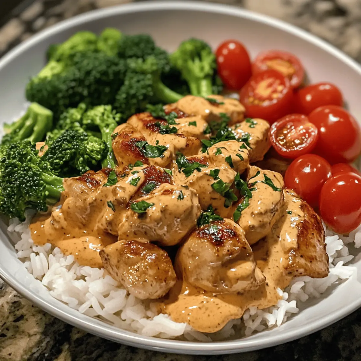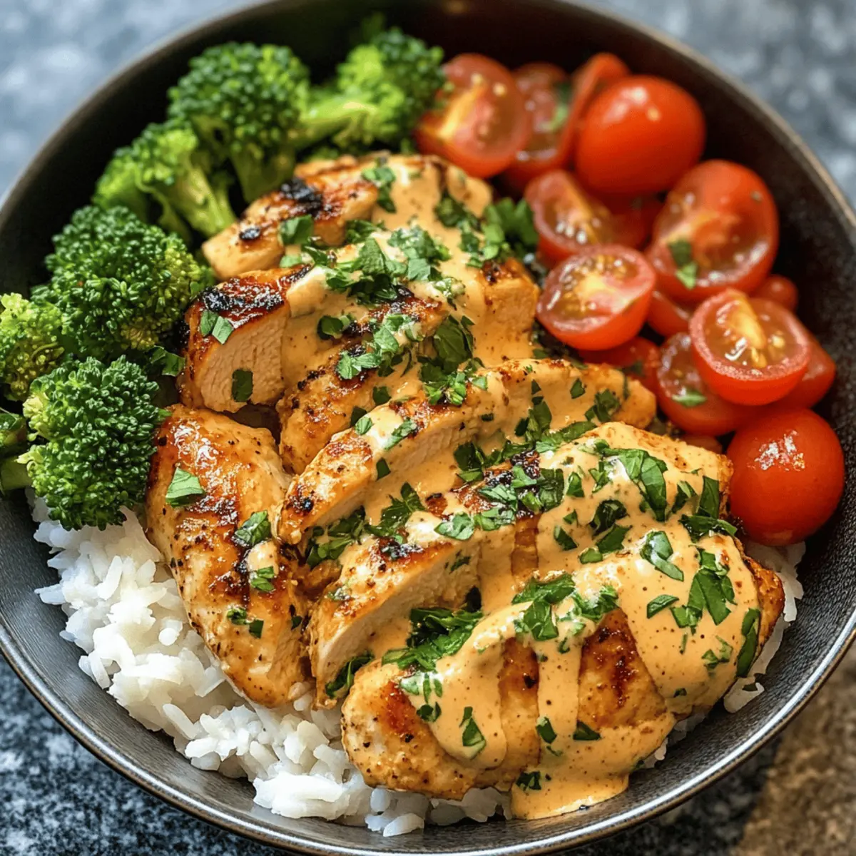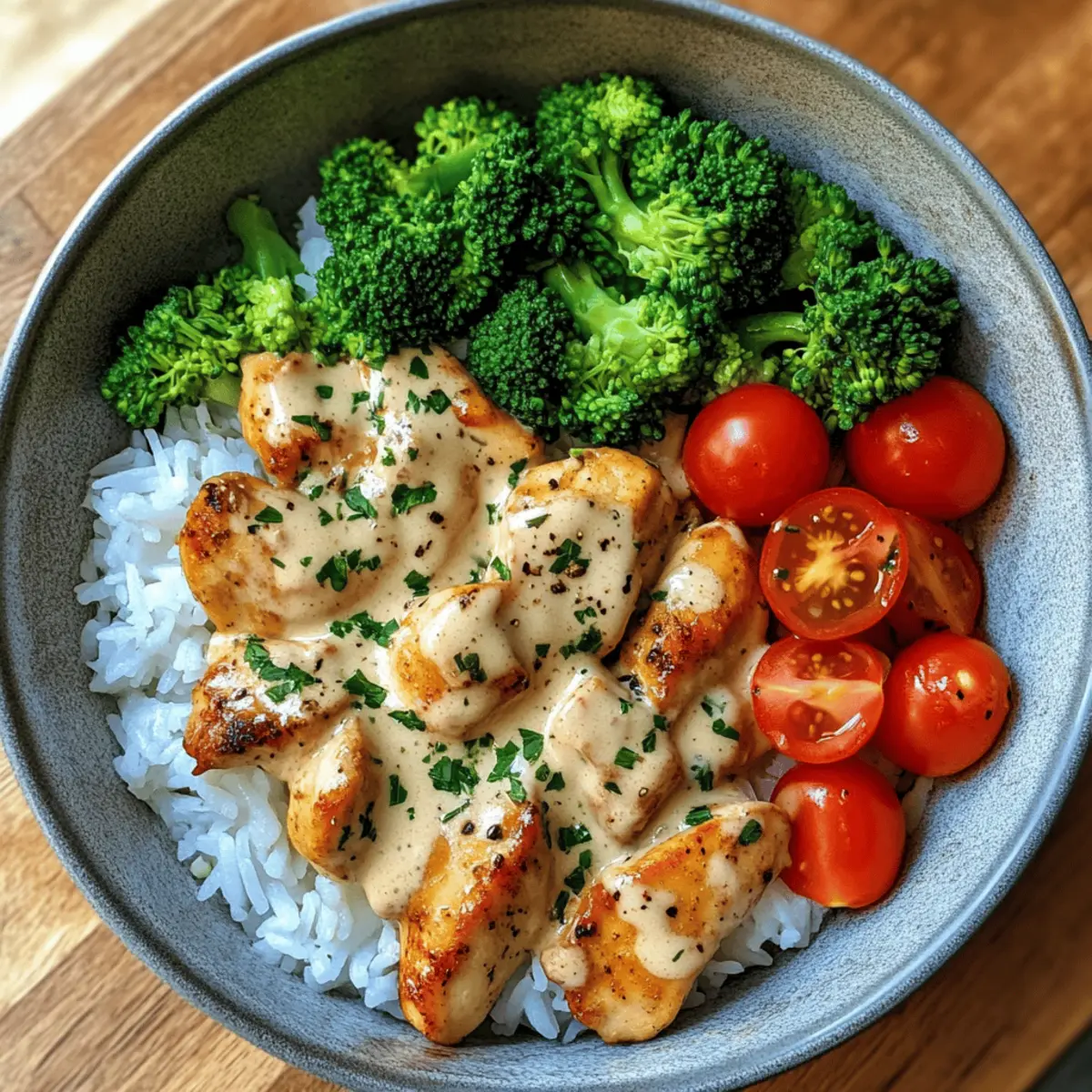 The aroma wafting through your kitchen can make even the busiest weeknight feel special. With my Creamy Garlic Chicken Bowls, you’ll have a delightful dinner ready in under 30 minutes, capturing the essence of comfort food without the fuss. This dish features tender chicken smothered in a luscious, garlicky cream sauce, beautifully served over fluffy rice or your preferred grain. It’s the ultimate quick and easy option for those evenings when you crave something hearty yet elegant. Plus, it’s adaptable—whether you’re a meat lover or a fan of veggies, this recipe can easily accommodate your preferences. Intrigued by how to elevate your weeknight dinners? Let’s dive into this mouthwatering recipe! Why are Creamy Garlic Chicken Bowls a hit? Quick & Easy: This recipe requires minimal prep and cooking time, making it perfect for busy weeknights. Flavor Packed: The creamy garlic sauce, complemented by Parmesan and herbs, delivers layers of flavor that will impress anyone. Versatile Options: Feel free to substitute chicken with shrimp or tofu, allowing you to cater to dietary preferences. One-Pan Wonder: Cooking everything in one pan simplifies cleanup, so you can focus on enjoying your meal. Crowd-Pleasing: With its rich taste and comforting ingredients, this dish is sure to become a family favorite. For more delicious meals, you might want to check out my Cheesy Garlic Chicken or Crockpot Chicken Corn for hassle-free dining options! Creamy Garlic Chicken Bowls Ingredients Experience the joy of cooking with these delightful ingredients! For the Chicken Boneless, Skinless Chicken Breasts – Main protein; feel free to swap with shrimp or tofu for a non-meat option. Olive Oil – Essential for cooking; adds richness and prevents sticking. For the Sauce Garlic Powder – Provides a base garlic flavor; use fresh garlic for a more aromatic touch. Minced Garlic – Enhances the overall flavor; sauté briefly for a fragrant sauce. Onion Powder – Adds depth of flavor; adjust according to your taste preference. Paprika – Gives a mild smokiness; perfect for those who enjoy a bit of warmth. Dried Thyme – A hint of herby freshness; it pairs beautifully with the creamy sauce. Salt & Black Pepper – Essential seasonings; adjust to taste for a balanced flavor. Butter – Creates a rich sauce base; substitute with olive oil for a dairy-free option. Chicken Broth – Provides liquid for the sauce, enhancing the overall chicken flavor. Heavy Cream – Forms the creamy texture; consider light cream for a lighter sauce, though thickness may vary. Parmesan Cheese – Adds salty depth; grated or shredded varieties work well. Red Pepper Flakes – Optional heat; adjust to your spice preference for the perfect kick. For Serving Fresh Parsley – A garnish that adds color and freshness; chop finely for even distribution. Cooked Rice (White, Brown, or Cauliflower) – Your choice of base; perfect for soaking up that delicious sauce. Steamed Broccoli & Cherry Tomatoes – Add color and nutrition; feel free to substitute with veggies you enjoy. Lemon Wedges – Optional for serving; a squeeze adds a refreshing brightness to the dish. Dive into these Creamy Garlic Chicken Bowls, and let each bite transport you to cozy family dinners filled with warmth and love! Step‑by‑Step Instructions for Creamy Garlic Chicken Bowls Step 1: Prepare Chicken Begin by placing boneless, skinless chicken breasts in a bowl. Drizzle with olive oil and season generously with garlic powder, onion powder, paprika, dried thyme, salt, and black pepper. Toss to coat the chicken evenly in the spices. This flavor-packed mixture sets the stage for your Creamy Garlic Chicken Bowls. Step 2: Cook Chicken Heat a large skillet over medium-high heat and add the prepared chicken. Sear the chicken for 5–7 minutes on each side, until it’s golden brown and cooked through with an internal temperature of 165°F. Once done, transfer the chicken to a plate, allowing it to rest while you prepare the delectable sauce. Step 3: Make Sauce In the same skillet, lower the heat to medium and add butter, letting it melt. Quickly sauté 2–3 cloves of minced garlic for about 30 seconds, stirring frequently to prevent burning. The fragrant aroma will fill your kitchen, creating a perfect base for the creamy sauce that will enhance your Creamy Garlic Chicken Bowls. Step 4: Simmer Broth Pour in chicken broth, scraping the bottom of the skillet to release any flavorful bits stuck to the pan. Allow the broth to simmer for 2–3 minutes, letting it reduce slightly. This step ensures a rich, savory depth to your sauce while infusing the essence of the earlier spices into the broth. Step 5: Thicken Sauce Reduce the heat to low and stir in heavy cream, ensuring a smooth consistency. Allow the sauce to gently simmer for 3–5 minutes until it thickens nicely, coating the back of a spoon. Keep an eye on it to prevent boiling, as a gentle simmer creates that velvety texture characteristic of the Creamy Garlic Chicken Bowls. Step 6: Add Cheese Mix in the grated Parmesan cheese and optional red pepper flakes, stirring until the cheese melts into the sauce. Taste and adjust the seasoning with more salt or pepper as needed. This cheesy addition not only enriches the flavor but also enhances the creaminess of your sauce. Step 7: Combine Chicken Return the cooked chicken breasts to the skillet, ensuring each piece is well-coated in that luscious sauce. Toss gently to combine and heat through, allowing the chicken to absorb some of that delicious sauce for about 2 minutes. This step makes your Creamy Garlic Chicken Bowls irresistible. Step 8: Garnish & Serve Finally, sprinkle fresh chopped parsley over the chicken for a pop of color and freshness. Serve the creamy chicken over your choice of cooked rice, with vibrant steamed broccoli and cherry tomatoes arranged around the bowl. This not only makes for a beautiful presentation but also completes your comforting meal.