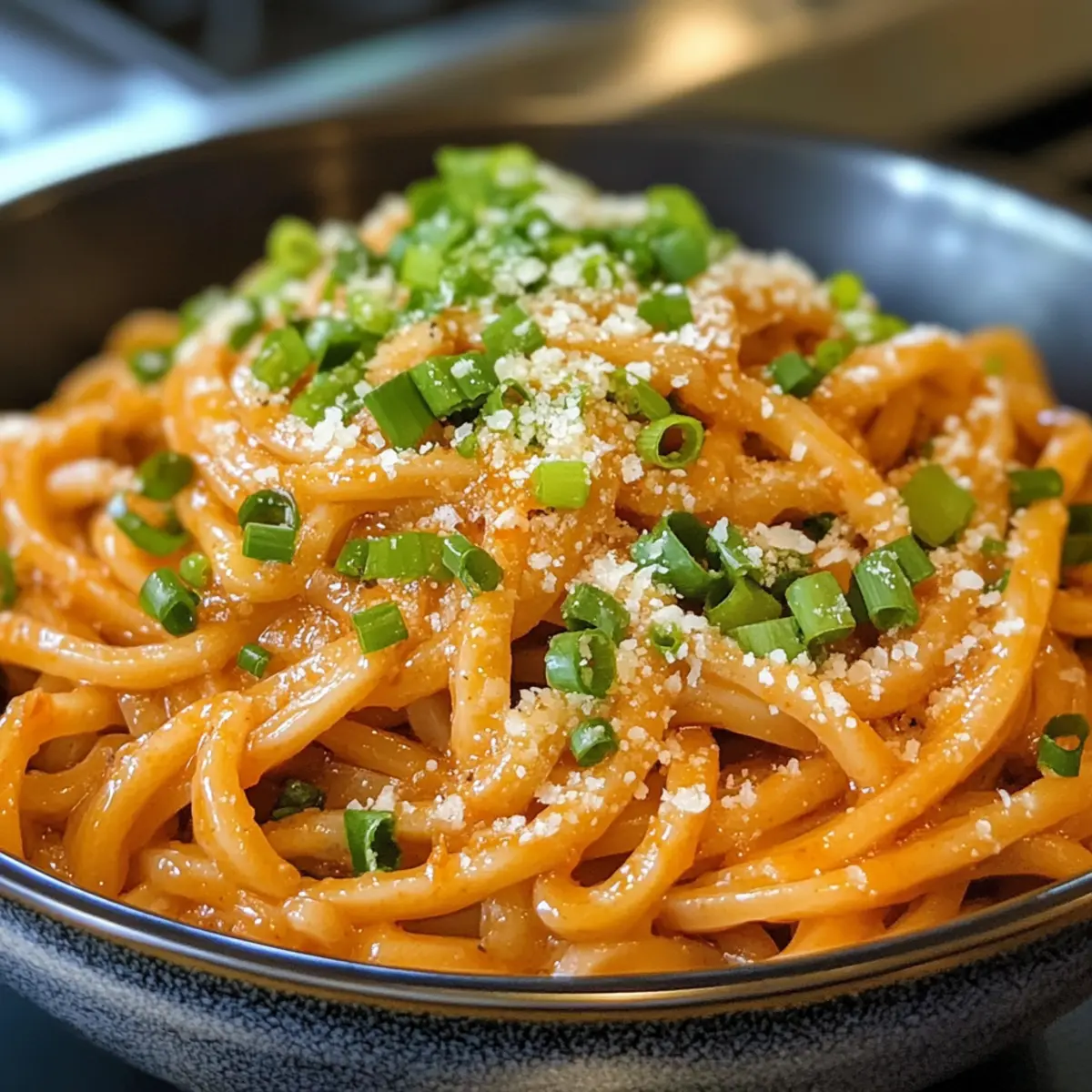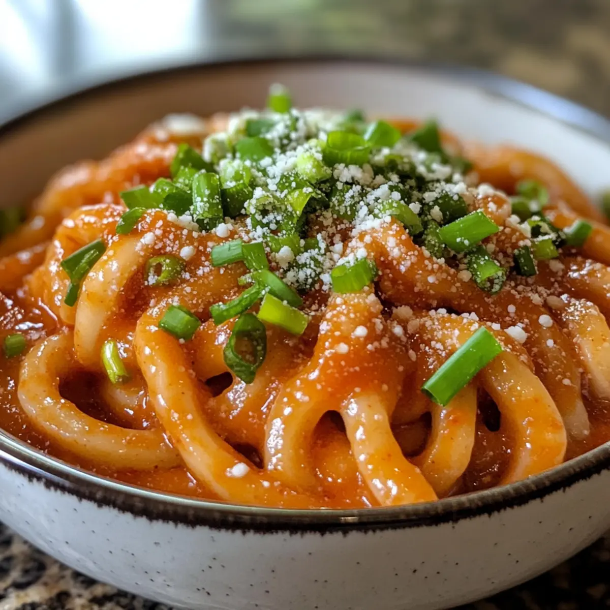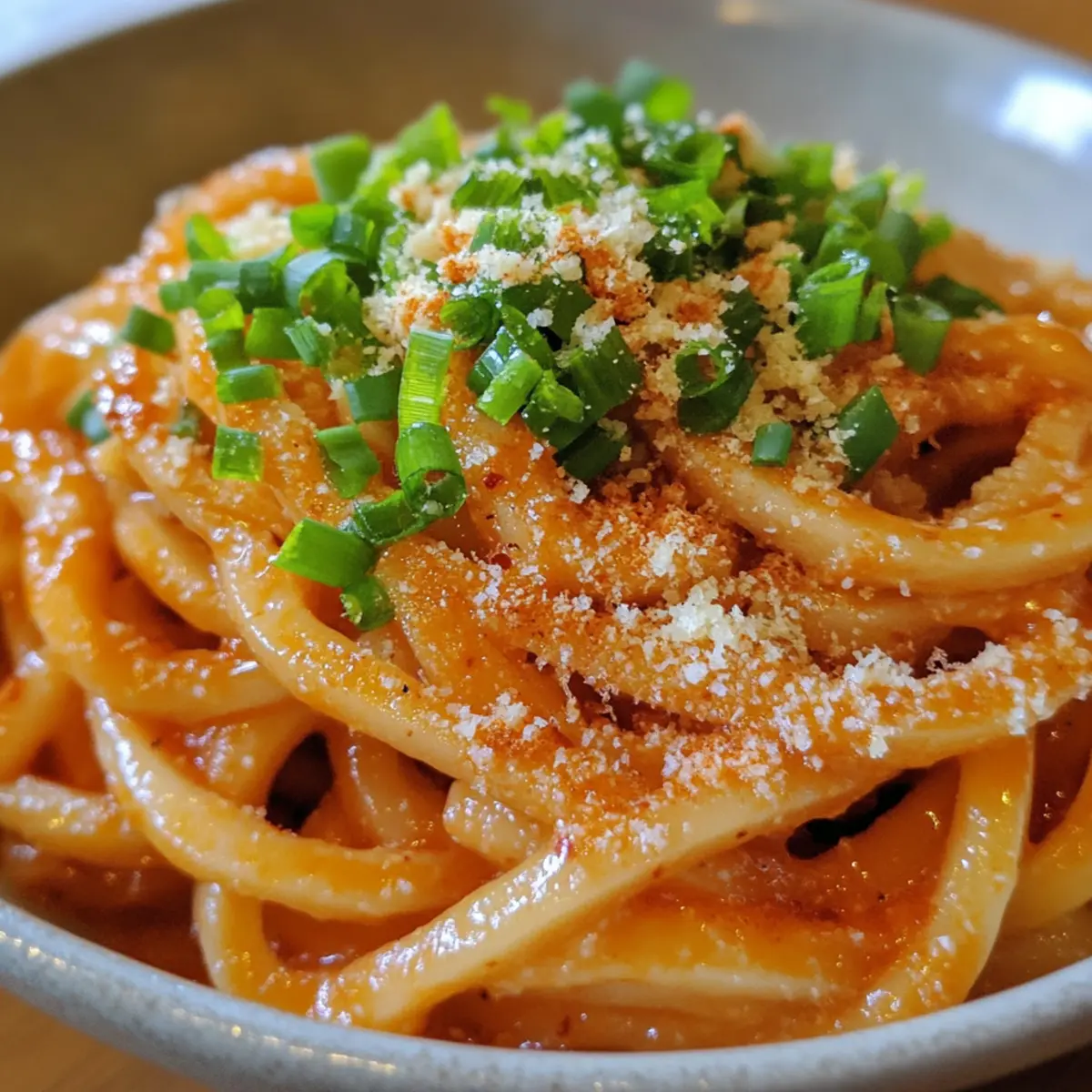 The moment I first savored a bowl of creamy gochujang udon noodles, I knew I had stumbled upon something magical. This dish perfectly blends the comforting, chewy texture of udon with a rich, spicy sauce that’s impossibly easy to whip up—it all comes together in just 20 minutes! Whether you’re seeking a quick weeknight dinner or a sumptuous way to pamper yourself after a long day, creamy gochujang udon noodles are your answer. Plus, they’re vegetarian-friendly and customizable, allowing room for creativity with your favorite veggies or proteins. Curious about how this fusion of Korean flavors can transform your next meal? Let’s dive into the recipe! Why Are Creamy Gochujang Udon Noodles a Hit? Quick Cooking: You can enjoy this dish in just 20 minutes, making it ideal for busy weeknights when you crave comfort without the wait. Flavor Explosion: The fusion of creamy richness and spicy gochujang creates a flavor profile that dances on the palate, pleasing lovers of distinct tastes. Versatile Ingredients: You have the freedom to customize by adding your favorite veggies or proteins like shrimp or tofu, making this dish adaptable for any dietary preference. Crowd-Pleasing Appeal: Perfect for impressing guests or simply enjoying a cozy night in, these noodles certainly feel elevated yet approachable. If you love simple yet delicious meals, don’t forget to check out my Garlic Shrimp Food or Thai Peanut Noodles for more easy options! Creamy Gochujang Udon Noodles Ingredients For the Noodles • Udon Noodles – The star of this dish, providing a chewy, satisfying base; feel free to use frozen udon noodles for convenience. For the Sauce • Butter – Adds a rich, velvety texture; you can substitute with olive oil for a lighter option. • Garlic – Freshly minced garlic enhances the fragrance and flavor; it’s essential for depth in the creamy gochujang udon noodles. • Shallots – Sweetness and complexity come from shallots; if you don’t have them on hand, onions make a great substitute. • Gochujang – This Korean chili paste brings the spice and umami; adjust the amount for your desired heat level. • Heavy Cream – Provides that luscious creaminess; if you’re looking for a non-dairy option, coconut cream works beautifully. • Soy Sauce – Adds a savory depth; tamari is a fantastic gluten-free alternative. • Gochugaru – For extra heat and flavor; if unavailable, feel free to skip it. For the Toppings • Grated Parmesan Cheese – Adds salty umami goodness; omit for a vegan version and try nutritional yeast instead. • Green Onion – Freshness and color come from green onion; parsley can serve as an alternative garnish. • Egg Yolk – Enhances richness when served on top; leave it out for a vegan adaptation. With just these ingredients, you’re on the way to crafting a delicious bowl of creamy gochujang udon noodles that will satisfy any craving! Step‑by‑Step Instructions for Creamy Gochujang Udon Noodles Step 1: Cook Noodles Begin by cooking the udon noodles according to the package instructions, typically about 6-8 minutes in boiling water. Stir occasionally to prevent sticking and ensure even cooking. Once tender, reserve ½ cup of the noodle water, then drain the noodles and set them aside in a warm bowl. Step 2: Sauté Aromatics In a large skillet, melt 2 tablespoons of butter over medium heat. Add in 2 minced garlic cloves and 1 diced shallot, stirring for about 2-3 minutes until they turn golden and fragrant. This aromatic base will bring depth to your creamy gochujang udon noodles, creating a welcoming foundation for the sauce. Step 3: Prepare Sauce Next, stir in 3 tablespoons of gochujang and cook for 30 seconds to release its rich flavors. Gradually whisk in the heavy cream and reserved noodle water, making sure to blend the ingredients smoothly. After that, incorporate 1 tablespoon of soy sauce and 1 teaspoon of gochugaru, allowing the sauce to simmer on low heat for about 5 minutes until thickened, stirring occasionally. Step 4: Combine Carefully add the cooked udon noodles to the creamy sauce in the skillet. Toss the noodles gently for about 2-3 minutes, ensuring every strand gets coated in the luscious sauce. The creamy gochujang udon noodles should appear rich and inviting, with a nice balance of spice and creaminess. Step 5: Serve Transfer the creamy gochujang udon noodles into serving bowls. Top with grated Parmesan cheese, chopped green onions for brightness, and place an egg yolk in the center for an extra touch of richness. Serve hot and enjoy a delightful fusion of flavors in this cozy, creamy gochujang udon dish! What to Serve with Creamy Gochujang Udon Noodles Elevate your dining experience with complementary flavors and textures that enhance each bite of your creamy noodle dish. Pickled Vegetables: The tangy crunch of pickled radishes or cucumbers adds a refreshing contrast to the creamy richness. Steamed Bok Choy: Lightly steamed bok choy offers a delicate crunch and a subtle green flavor to balance the spice. Sesame Green Beans: Tossed in sesame oil and garlic, these beans provide a nutty aroma and delightful snap. Spicy Korean Fried Chicken: For a tangy kick, pair your noodles with crispy fried chicken glazed in gochujang sauce—perfect for spice lovers! Coconut Water: Stay refreshed with this subtly sweet drink; its lightness complements the richness of the noodle dish beautifully. Light Salad: A simple salad with mixed greens and a tangy vinaigrette brightens up the meal, introducing freshness to the palate. Mango Sticky Rice: Indulge your sweet tooth with this dessert, which uniquely balances the heat of the noodles with a comforting sweetness. Make Ahead Options These Creamy Gochujang Udon Noodles are perfect for meal prep enthusiasts! You can prepare the sauce up to 3 days in advance; simply sauté the garlic and shallots, then stir in the gochujang, heavy cream, and soy sauce before storing in an airtight container. Ref