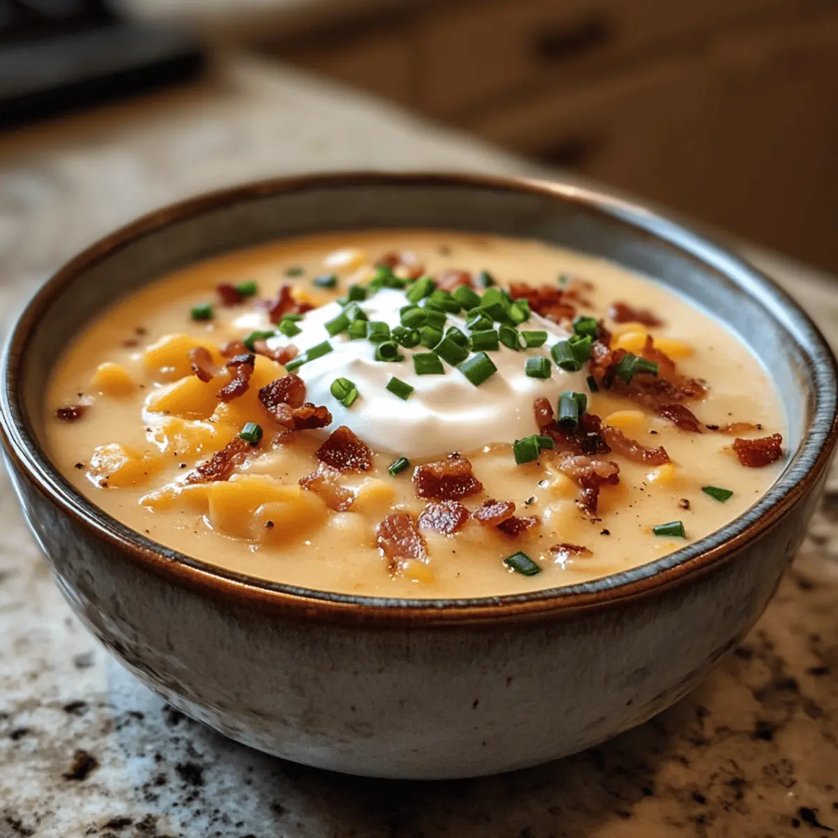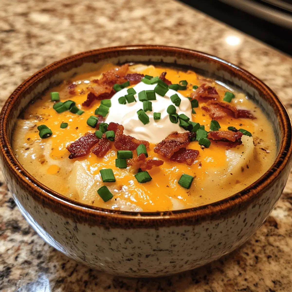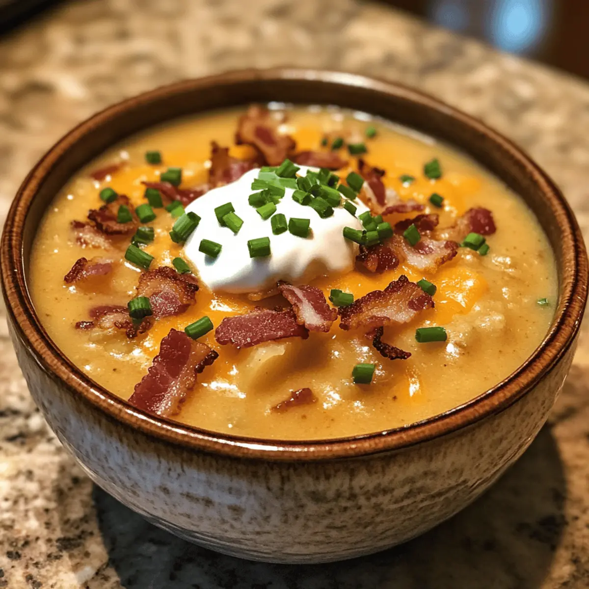As the chilly season wraps us in its cozy embrace, there’s nothing quite like a warm bowl of Creamy Loaded Baked Potato Soup to soothe the soul. This recipe combines the rich flavors of smoky bacon, sharp cheddar cheese, and the comforting texture of creamy potatoes, making it an instant classic in my kitchen. One of the best things about this soup is not just its decadent taste, but also the fact that it comes together in a matter of minutes—perfect for those busy weeknights when you crave something hearty without the fuss. It’s a surefire crowd-pleaser that brings everyone together around the dinner table, and the leftovers? They’re even better for lunch the next day! Are you ready to bring a little comfort to your bowl? Why Is This Soup So Irresistible? Simplicity: This Creamy Loaded Baked Potato Soup comes together quickly, making it a favorite for busy weeknights. You’ll find minimal prep, perfect for both novice cooks and seasoned chefs alike! Flavor Explosion: The combination of smoky bacon and sharp cheddar creates a robust taste that echoes the best loaded baked potatoes. It’s pure decadence in every spoonful! Crowd-Pleaser: This soup appeals to everyone, from kids to adults, making it ideal for family dinners or cozy gatherings. Pair it with some crusty bread, and you’ll have a complete meal! Versatility: Want to jazz it up? Add jalapeños for heat or swap in sautéed mushrooms for a tasty vegetarian twist. The options are endless! Leftover Lovin’: Enjoy the soup again for lunch; it tastes even better the next day, making it a perfect meal prep champion! Creamy Loaded Baked Potato Soup Ingredients For the Soup Base • Potatoes – Use starchy potatoes like Russets for a creamy texture. • Broth (chicken or vegetable) – Opt for low-sodium options to control the salt level. • Butter – Adds richness; consider using olive oil for a lighter twist. For the Flavor • Bacon – Smoky and savory; turkey bacon works as a lighter alternative. • Sharp Cheddar Cheese – This is crucial for that bold flavor; try mild cheddar or a dairy-free alternative if desired. • Sour Cream – Provides that creamy tanginess; Greek yogurt can be used for a healthier swap. For the Finishing Touches • Chives – They add a fresh flavor and pop of color; green onions can be a good substitute. • Onions (optional) – Sauté in bacon fat for an extra depth of flavor. Each ingredient plays a key role in crafting the ultimate Creamy Loaded Baked Potato Soup that warms your heart and soul! Step‑by‑Step Instructions for Creamy Loaded Baked Potato Soup Step 1: Prep Potatoes Begin by peeling and dicing about four medium-sized Russet potatoes into even, small cubes—this ensures they cook uniformly. Stack the potatoes on a cutting board and use a sharp knife for precision. Set the diced potatoes aside in a bowl of cold water to prevent browning while you prepare the other ingredients. Step 2: Cook Bacon In a large pot, place 6-8 slices of chopped bacon over medium heat. Cook for about 8-10 minutes, stirring occasionally, until the bacon is crispy and golden brown. Once cooked, use a slotted spoon to remove the bacon and place it on paper towels to drain excess grease, leaving about two tablespoons of bacon fat in the pot for added flavor. Step 3: Sauté Vegetables In the bacon fat, add a finely chopped onion (if using) to the pot and sauté for about 5 minutes until translucent and fragrant. Stir occasionally to ensure the onions don’t stick and burn. This step infuses the base of your Creamy Loaded Baked Potato Soup with an aromatic depth that complements the other ingredients beautifully. Step 4: Add Potatoes and Broth Next, stir in the prepped diced potatoes, ensuring they’re coated with the onion mixture. Pour in 4 cups of low-sodium chicken or vegetable broth, and bring the mixture to a boil over high heat. Once boiling, reduce the heat to low and let it simmer for 15-20 minutes, or until the potatoes are fork-tender and easily mashable. Step 5: Blend for Creaminess After the potatoes have softened, carefully use an immersion blender to puree the soup to your desired consistency—smooth for a creamy texture or slightly chunky for more bite. If you don’t have an immersion blender, you can ladle the soup into a blender in batches. Just remember to allow it to cool slightly before blending to avoid splattering. Step 6: Incorporate Dairy Return the blended soup to the pot and switch the heat to low. Gradually stir in 1-2 cups of sharp cheddar cheese, allowing it to melt into the soup. Add in half a cup of sour cream, stirring until fully combined and creamy. This will elevate your Creamy Loaded Baked Potato Soup to new delicious heights! Step 7: Season Taste the soup and adjust the seasoning with salt and freshly ground black pepper as desired. You might want to add a little more cheese if you love that cheesy goodness! Make sure every bite has that perfect blend of flavors for an inviting, hearty meal. Step 8: Serve Ladle the hot Creamy Loaded Baked Potato Soup into bowls, garnishing with the crispy bacon bits, a sprinkle of fresh chives, and extra cheese on top, if desired. Optional toppings like a drizzle of sour cream can add an extra touch of indulgence to this cozy dish. Enjoy the warm, comforting flavors! Creamy Loaded Baked Potato Soup Variations Feel free to let your creativity shine as you customize this delightful soup! Each variation adds a unique twist that’ll make your taste buds dance. Spicy Kick: Add diced jalapeños or a dash of hot sauce for a satisfying heat that enhances the comforting flavors. If you’re looking for an extra warming touch, consider pairing it with a side of homemade cornbread. Vegetarian Delight: Swap bacon for sautéed mushrooms to create a hearty vegetarian-friendly version. The mushrooms will absorb the rich flavors, making every spoonful feel indulgent! Cheesy Goodness: Experiment with different types of cheese, such as pepper