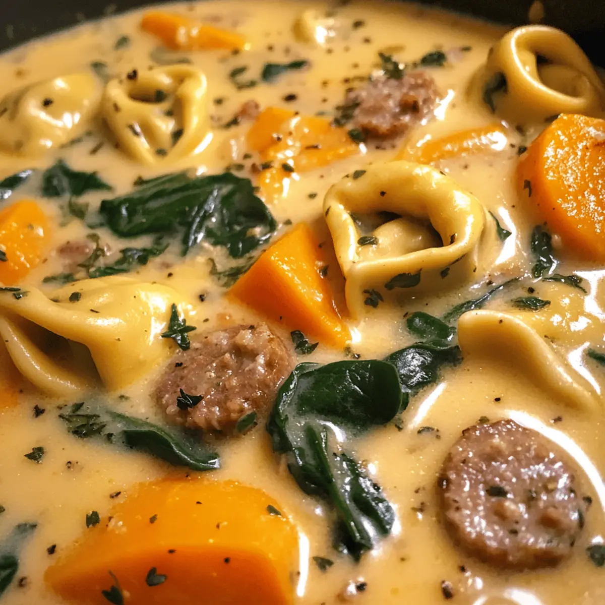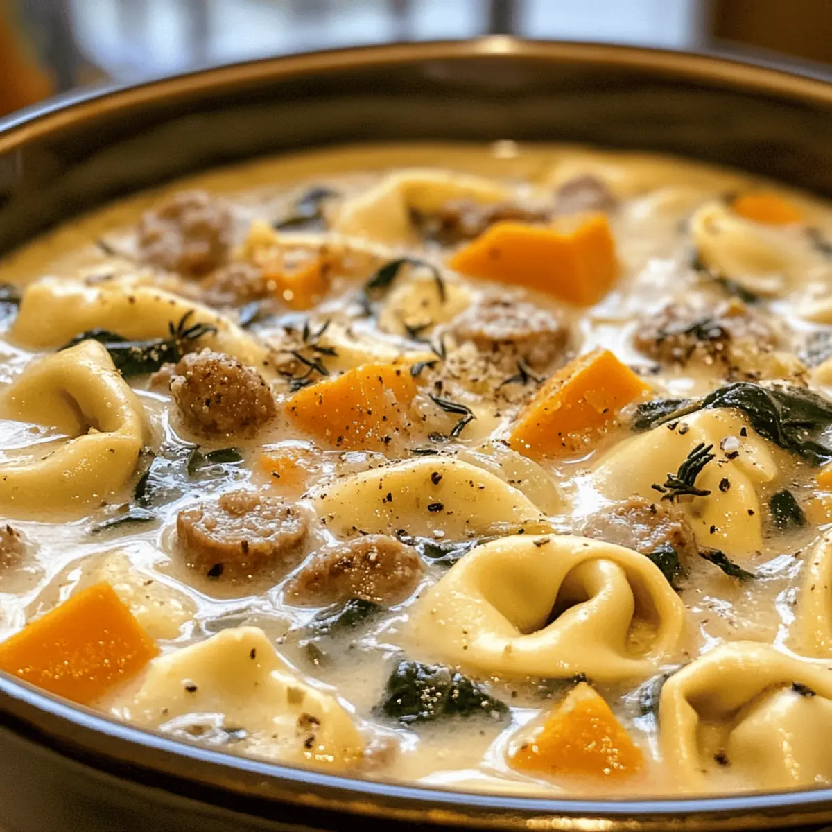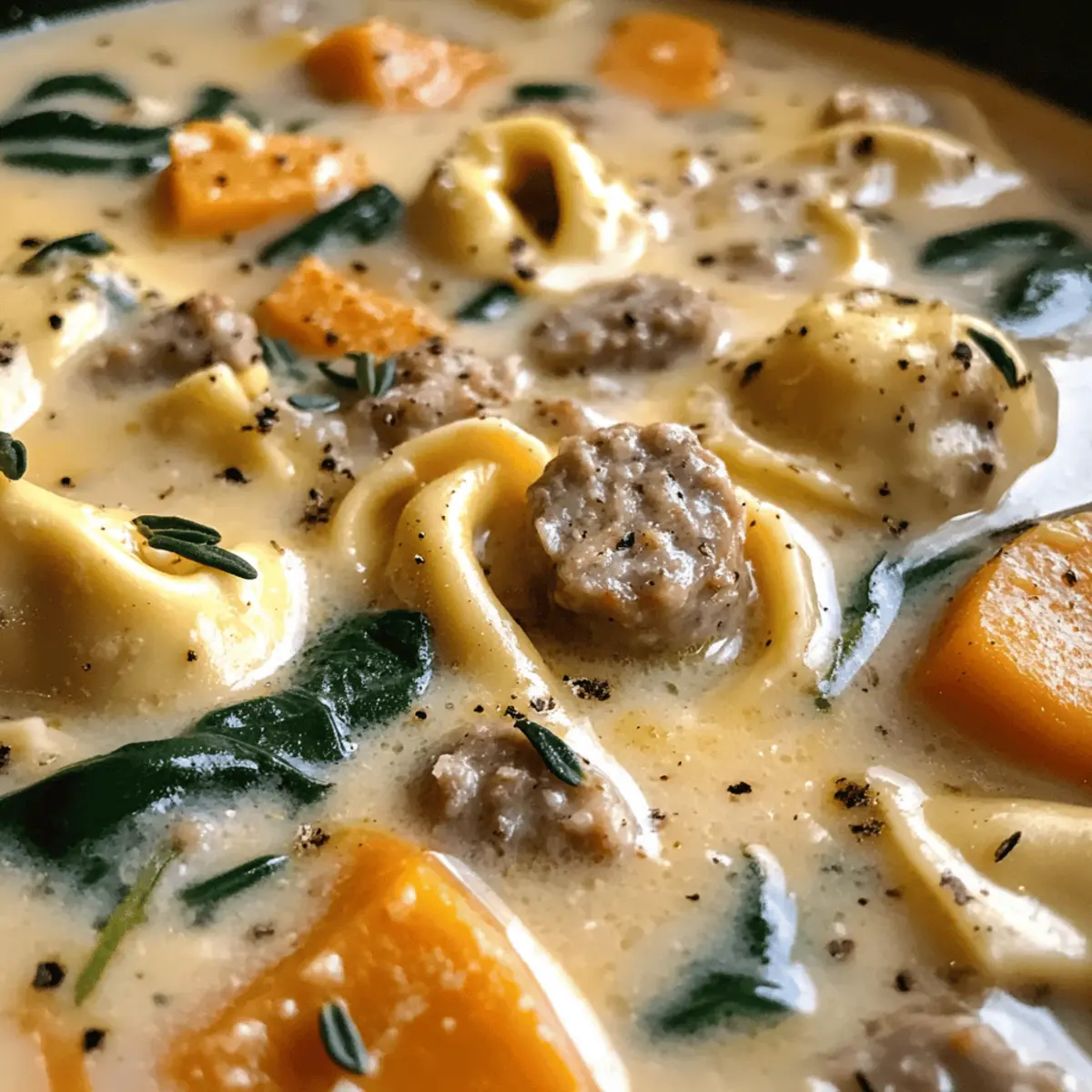 As I walked into my cozy kitchen on a chilly evening, the inviting aroma of sautéed sausage and herbs enveloped me like a warm embrace. It’s moments like these that remind me why I love cooking at home. Today, I’m excited to share my Creamy Sausage Tortellini Soup, a delightful one-pot meal that combines the comforting sweetness of sweet potatoes, the heartiness of three-cheese tortellini, and the vibrant freshness of spinach. This soup not only comes together in just 40 minutes but also means minimal cleanup—perfect for busy nights when you crave something nourishing yet simple. With its creamy texture and rich flavors, this dish will undoubtedly become a favorite in your household. What comforting flavors will you discover in this delightful bowl of warmth? Why is this soup a must-try? Simplicity: This one-pot meal is perfect for those hectic weeknights, allowing you to whip up a hearty dish with just a few steps. Creamy Texture: The blend of heavy cream and sweet potatoes creates a luxurious, velvety soup that coats each bite. Flavor Explosion: Spicy Italian sausage and warm spices infuse every spoonful with rich flavors you’ll adore. Versatile Ingredients: Customize this recipe with your favorite fillings, like spinach tortellini, or switch to turkey sausage for a lighter touch! Crowd-Pleaser: Whether it’s a cozy family dinner or a gathering with friends, this recipe will impress and satisfy everyone. Creamy Tortellini Soup with Sausage Ingredients For the Soup Sausage – Spicy Italian sausage adds robust flavor; turkey sausage can be used for a healthier option. Olive Oil – Used for sautéing the sausage; enhances flavor throughout the dish. Italian Seasoning – A delightful blend of herbs that perfectly complements the soup. Paprika – Adds a smoky flavor; regular or smoked can be chosen based on your taste preference. Sweet Potato – Provides natural sweetness and texture; use one large or two smaller ones, peeled and cubed. Garlic – Freshly minced for a depth of flavor and aromatic touch. Red Pepper Flakes – Add a hint of spice; adjust according to your heat preference. Tomato Paste – Brings richness and a vibrant color to the soup. Water – Acts as the base; feel free to swap in chicken stock for added depth. Tortellini – Three-cheese tortellini offers heartiness; fresh or refrigerated varieties work best. Fresh Spinach – Added at the end to maintain its bright color and nutrients. Heavy Cream – Ensures creaminess; swap with coconut milk for a delicious dairy-free alternative. Fresh Thyme – Adds a refreshing herbal note; optional if you don’t have any on hand. Optional Garnish Fresh Thyme – Adds a pop of color and extra flavor; sprinkle on top right before serving for visual appeal. This Creamy Tortellini Soup with Sausage is sure to become a cherished recipe in your home! Step‑by‑Step Instructions for Creamy Tortellini Soup with Sausage Step 1: Heat the Oil In a large, high-sided pot, heat 2 tablespoons of olive oil over medium heat. Swirl the oil to coat the bottom of the pot, allowing it to shimmer. This will be the foundation for your Creamy Tortellini Soup with Sausage, enhancing the flavors as they build. Step 2: Cook the Sausage Add 1 pound of crumbled spicy Italian sausage to the pot. Cook for about 5–7 minutes, stirring occasionally until the sausage is browned and no longer pink. Make sure to break it up into smaller pieces as it cooks so it incorporates evenly into the soup. Drain any excess grease to keep the soup hearty yet clean. Step 3: Add Seasonings Sprinkle in 1 tablespoon of Italian seasoning and 1 teaspoon of paprika over the cooked sausage. Stir well to combine and allow the spices to toast for about 1 minute, releasing their aromatic flavors. This step enriches the profile of your Creamy Tortellini Soup with Sausage, providing a warm kick. Step 4: Incorporate Vegetables Add 1 peeled and cubed large sweet potato, 2 minced garlic cloves, ½ teaspoon red pepper flakes, and 2 tablespoons of tomato paste to the pot. Stir everything until the sweet potatoes are well coated in the mixture. Cook for an additional 2 minutes to soften the garlic, which will enhance the overall flavor. Step 5: Pour in the Liquid Carefully pour in 6 cups of water, or substitute with chicken stock for an even richer base. Bring the mixture to a rolling boil, then reduce the heat to low. Cover the pot and let it simmer for 15 minutes, or until the sweet potatoes are tender, stirring occasionally to prevent sticking. Step 6: Add the Tortellini Once the sweet potatoes are tender, stir in 3 cups of fresh or refrigerated three-cheese tortellini. Cover the pot again and let it boil for about 10 minutes. Keep an eye on the packaging for specific cooking times, as this will affect the texture of your Creamy Tortellini Soup with Sausage. Step 7: Stir in the Spinach After the tortellini is fully cooked, add 4 cups of fresh spinach to the pot. Gently stir until the spinach wilts, which will take about 2 minutes. This not only adds great color but also boosts the nutrition in your soup, making each bowl feel more wholesome. Step 8: Mix in the Cream Remove the pot from heat and stir in 1 cup of heavy cream for that luxurious, creamy finish. Adjust the seasoning with salt and additional red pepper flakes according to your taste. This step will elevate the richness of the Creamy Tortellini Soup with Sausage, giving it a velvety texture. Step 9: Serve and Garnish Ladle the soup into bowls and optionally garnish with fresh thyme for added flavor and visual appeal. This last touch makes your Creamy Tortellini Soup with Sausage even more inviting, perfect for serving to family or friends as a soothing meal. What to Serve with Creamy Sausage Tortellini Soup Pair this comforting soup with delightful sides that enhance its rich flavors and make your meal unforgettable. Crusty Garlic Bread: The perfect vessel for soaking up every drop of creamy broth, this bread adds 