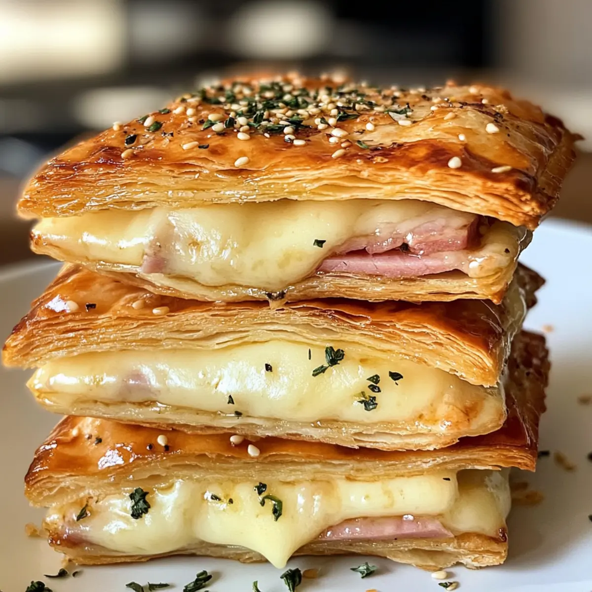 As I settled into my weekend routine, the tantalizing aroma of fresh-baked pastries wafting through the air brought me back to memories of charming cafés in Paris. This inspired me to whip up some delightful Crispy Ham & Cheese Puff Pastry Stacks that would evoke that same cozy magic right at home. The beauty of this recipe lies in its simplicity—transforming ordinary ingredients into gourmet snacks and brunch ideas in under 50 minutes! Whether you need a savory pick-me-up for a busy weekday lunch or a showstopper for your next brunch gathering, these flaky pastries promise both quick prep and satisfying flavors. Ready to bring a slice of Parisian charm to your kitchen? Let’s dive into this delectable adventure together! Why are these stacks so irresistible? Easy to Make: With just a few ingredients, you can quickly whip up Crispy Ham & Cheese Puff Pastry Stacks that impress at any gathering. Gourmet Touch: Each bite offers that café-quality experience, allowing you to feel like a chef in your own home. Perfect for Any Occasion: Whether it’s brunch, a light lunch, or a savory snack, these stacks are versatile enough to fit any meal or event. Customizable Greatness: Feel free to swap out the ham for turkey or add vegetables like spinach to make them your own! Crowd-Pleasing Flavor: The delightful combination of flaky pastry and gooey cheese guarantees smiles around the table, making them a dedicated favorite. Turn your kitchen into a charming café with these stacks, and don’t forget to check out my other delightful recipes like Mini Rolo Cheesecakes for dessert inspiration! Crispy Ham & Cheese Puff Pastry Stacks Ingredients Get ready to gather everything you need to create these delightful stacks! For the Pastry Puff Pastry Sheets – Use high-quality frozen puff pastry for the best flaky results. For the Filling Ham – A savory staple; feel free to switch to turkey or salami for a twist. Cheese (Swiss, Gruyère, or Cheddar) – Melts beautifully, enhancing the texture of your Crispy Ham & Cheese Puff Pastry Stacks. Dijon Mustard (optional) – Adds a zingy kick that cuts through richness nicely. For the Egg Wash Egg (beaten) – Ensures a golden, shiny crust while sealing your stacks. Milk – Lightens the egg for an even, velvety wash. For Flavoring Salt and Pepper – Essential for elevating the overall flavor without overwhelming the dish. Fresh Herbs (optional) – For a splash of color and a hint of freshness to garnish. Now that you have all your ingredients ready, let’s bring these delightful Crispy Ham & Cheese Puff Pastry Stacks to life! Step‑by‑Step Instructions for Crispy Ham & Cheese Puff Pastry Stacks Step 1: Preheat the Oven Begin by preheating your oven to 400°F (200°C). While it heats up, prepare a baking sheet by lining it with parchment paper. This not only prevents sticking but also helps your Crispy Ham & Cheese Puff Pastry Stacks achieve that perfect crispy texture. Step 2: Roll Out the Puff Pastry Next, take your high-quality frozen puff pastry sheets and roll them out gently on a lightly floured surface to smooth out any creases and slightly enlarge them. Aim for even thickness to ensure all layers puff beautifully, adding to that flaky puff pastry characteristic we adore. Step 3: Cut the Pastry Sheets Once rolled, cut each puff pastry sheet into four equal squares, giving you a total of eight squares for your stacks. Lay them out on the prepared parchment-lined baking sheet, making sure to leave enough space between each piece for optimal puffing during baking. Step 4: Create the Egg Wash In a small bowl, whisk together the beaten egg and milk until smooth. This egg wash will create a beautiful golden crust on your Crispy Ham & Cheese Puff Pastry Stacks as they bake. Use a pastry brush to apply a thin layer to the edges of each pastry square for an even coating. Step 5: Layer Your Filling On each square, place a slice of ham followed by a slice of cheese—be it Swiss, Gruyère, or Cheddar. For an extra flavor boost, you can spread a thin layer of Dijon mustard on the pastry before adding the fillings. These layers will meld together wonderfully when baked. Step 6: Season and Add Herbs Sprinkle a pinch of salt and freshly cracked pepper over the cheese and ham layers. If you’re using fresh herbs, now’s the time to sprinkle them on as well, adding both flavor and a pop of color to your Crispy Ham & Cheese Puff Pastry Stacks. Step 7: Seal with Another Pastry Square Take another square of puff pastry and place it on top of your layered filling, ensuring you seal the edges. Use a fork to crimp and secure the seams, preventing any oozing filling from escaping during baking. This step is crucial for maintaining that perfect stack shape. Step 8: Brush with Egg Wash After sealing the stacks, generously brush the tops with the remaining egg wash for a golden, shiny finish as they bake. This step is essential for achieving that appetizing color, adding to the overall appeal of your Crispy Ham & Cheese Puff Pastry Stacks. Step 9: Bake to Perfection Slide the baking sheet into your preheated oven and bake for 20–25 minutes. Keep an eye on them; you’re looking for a golden puffed-up appearance and that irresistible flaky texture to shine through. Step 10: Cool and Serve Once baked, remove the stacks from the oven and let them cool on the baking sheet for a few minutes. This cooling period helps the flavors settle and makes them easier to handle. Serve your Crispy Ham & Cheese Puff Pastry Stacks warm for the ultimate indulgent experience! What to Serve with Crispy Ham & Cheese Puff Pastry Stacks Whether you’re hosting brunch or enjoying a cozy dinner at home, pairing the right sides with these delightful stacks adds layers of flavor and texture to your meal. Fresh Green Salad: A crisp green salad with vinaigrette dressing balances the richness of the stacks, offering a refreshing contrast that’s hard to resist. Creamy Tomato Soup: This classic pa