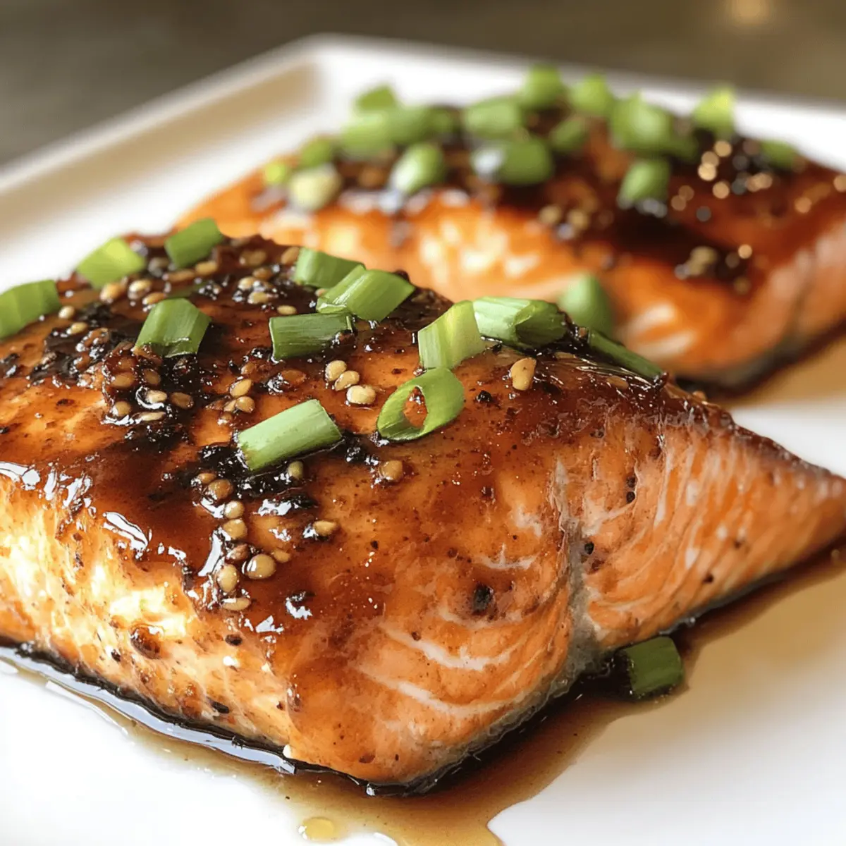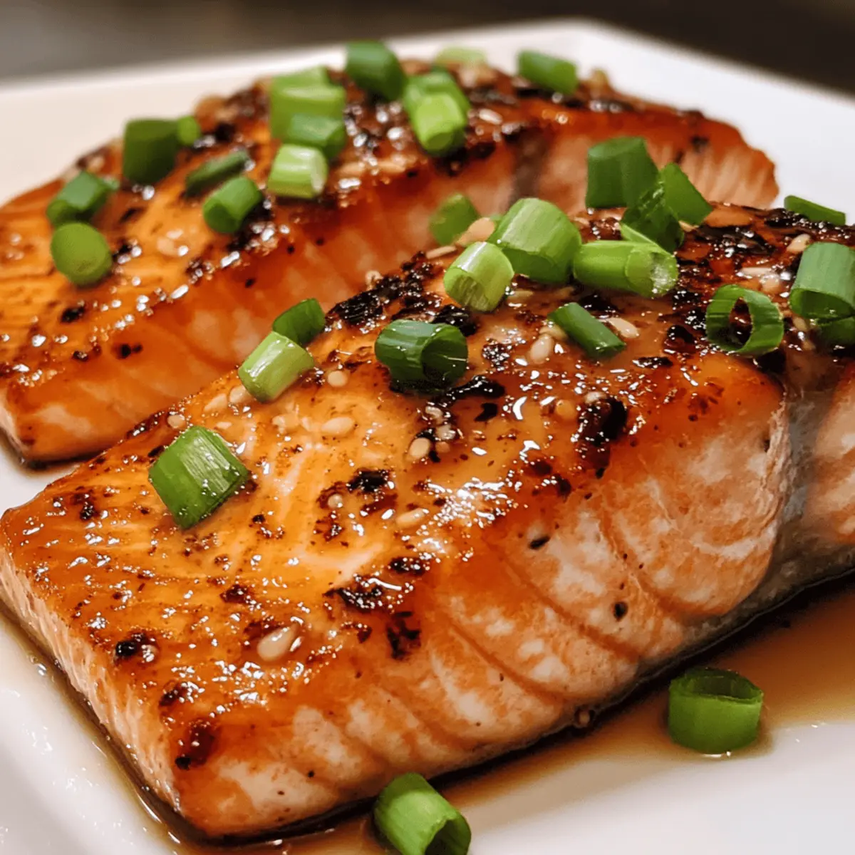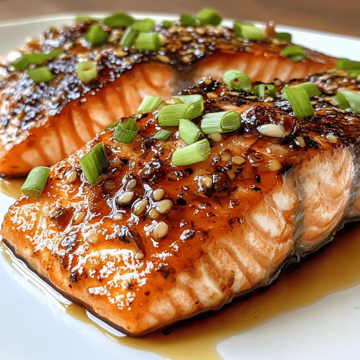 As I was flipping through my favorite recipe book, I stumbled upon a little treasure that quickly became a weeknight hero: Crispy Honey Garlic Glazed Salmon. This dish is a delightful blend of sweet and savory that’s not only tantalizing to the taste buds but also ready in a brisk 25 minutes. With minimal ingredients and quick prep, it’s the perfect option for those busy nights when you crave something homemade yet impressive. Whether you’re cooking for yourself or hosting a gathering, this recipe will surely elevate your dinner game. Curious how a few simple ingredients can come together to create such magic? Let’s dive into the recipe! Why is this salmon recipe a must-try? Simplicity: This recipe shines with minimal ingredients, making it accessible for every home cook. Quick and Delicious: Ready in just 25 minutes, it’s perfect for busy nights when you want to impress without spending hours in the kitchen. Flavor Explosion: The sweet honey and garlicky glaze creates a mouthwatering contrast to the crispy salmon, elevating your meal effortlessly. Customizable: With variations like maple glaze or a spicy kick, you can easily adapt this dish to suit your mood or dietary preferences. Pair it with some Cheesy Garlic Chicken for a delicious feast! Crowd-Pleaser: Whether serving family or guests, this dish is sure to impress everyone at the table with its gourmet appeal. Crispy Honey Garlic Glazed Salmon Ingredients For the Salmon • Salmon fillets (4, skin-on) – The skin keeps the salmon moist while cooking, enhancing its rich flavor. For the Glaze • Honey (¼ cup) – Provides the sweet element that caramelizes beautifully; substitute with maple syrup for a different flavor twist. • Low-sodium soy sauce (2 tablespoons) – Adds a punch of umami flavor and balances the sweetness of the honey. • Garlic (3 cloves, minced) – This aromatic adds a depth of flavor; fresh garlic is always best for a robust taste. For Cooking • Olive oil (2 tablespoons) – Essential for searing the salmon to achieve that coveted crispy exterior. For Garnish • Chopped green onions – These bring a touch of freshness and color that brightens up the dish beautifully. Now that you’ve gathered these essential ingredients for your crispy honey garlic glazed salmon, you’ll see how effortlessly they come together to create a dish that dazzles—and all in just 25 minutes! Step‑by‑Step Instructions for Crispy Honey Garlic Glazed Salmon Step 1: Prep the Salmon Begin by rinsing the salmon fillets under cold water and patting them dry with paper towels. This step is crucial for achieving that crispy texture everyone loves. Ensure the skin is thoroughly dried, as moisture can prevent the skin from crisping up nicely during cooking. Step 2: Make the Glaze In a small bowl, combine ¼ cup of honey, 2 tablespoons of low-sodium soy sauce, and 3 cloves of minced garlic. Whisk these ingredients together until you achieve a smooth mixture. This simple yet flavorful glaze is what makes your crispy honey garlic glazed salmon so irresistible, and it’ll infuse the fish with delicious sweetness. Step 3: Sear the Salmon Heat 2 tablespoons of olive oil in a large skillet over medium-high heat. Once the oil shimmers, place the salmon fillets skin-side down in the pan. Allow the salmon to cook for approximately 4 minutes, or until the skin turns golden brown and crispy. Avoid moving the salmon during this time to develop a beautiful crust. Step 4: Glaze and Finish Cooking Gently flip the salmon fillets over using a spatula and brush the top with half of the honey garlic glaze. Continue to cook for another 3-4 minutes until the salmon is cooked through, ensuring it reaches an internal temperature of 145°F. The glaze will caramelize beautifully during this time, enhancing the flavors of the crispy honey garlic glazed salmon. Step 5: Serve and Garnish Once the salmon is fully cooked, remove it from the skillet and drizzle the remaining glaze over each fillet. For a burst of freshness, sprinkle chopped green onions on top. This final touch not only adds flavor but also enhances the visual appeal of your crispy honey garlic glazed salmon, making it ready to impress at the dinner table. Crispy Honey Garlic Glazed Salmon Variations Feel free to make this recipe your own by adding your unique spin to it! Maple Glazed Salmon: Swap the honey for maple syrup to introduce a warm, earthy sweetness. Spicy Kick: Mix in crushed red pepper flakes into the glaze for a delightful heat that balances the sweetness. Asian Twist: Add a teaspoon of sesame oil to the glaze for an aromatic, nutty flavor that truly enhances each bite. Citrus Burst: Squeeze in some fresh lemon or lime juice to the glaze for a zesty contrast that brightens the dish beautifully. It adds a refreshing depth to the salmon’s richness. Coconut Flavor: Replace olive oil with coconut oil and add a bit of shredded coconut on top after baking for a tropical twist that transports you to paradise. Herb Infusion: Mix in finely chopped fresh herbs, like cilantro or basil, to the glaze for an aromatic lift that adds a vibrant finish. Pineapple Salsa on Top: Serve the salmon with a fresh pineapple salsa—diced pineapple, red onion, and cilantro combined for a sweet-savory punch. It’s a perfect complement that dances with flavor. Sweet Soy Sauce: Use teriyaki sauce instead of soy sauce for a sweeter, thicker glaze. This alternative can turn a simple meal into a delightful feast! Pair this variation with some Teriyaki Salmon Avocado for a full-on flavor experience. Expert Tips for Crispy Honey Garlic Glazed Salmon Proper Drying: Ensure the salmon is completely dry before cooking to achieve a crispy skin; moisture will trap steam and hinder crispiness. Hot Skillet: Preheat your skillet adequately before adding the salmon. A hot pan helps develop that enticing golden crust that defines crispy honey garlic glazed salmon. Minimal Movement: Avoid flipping or moving the 