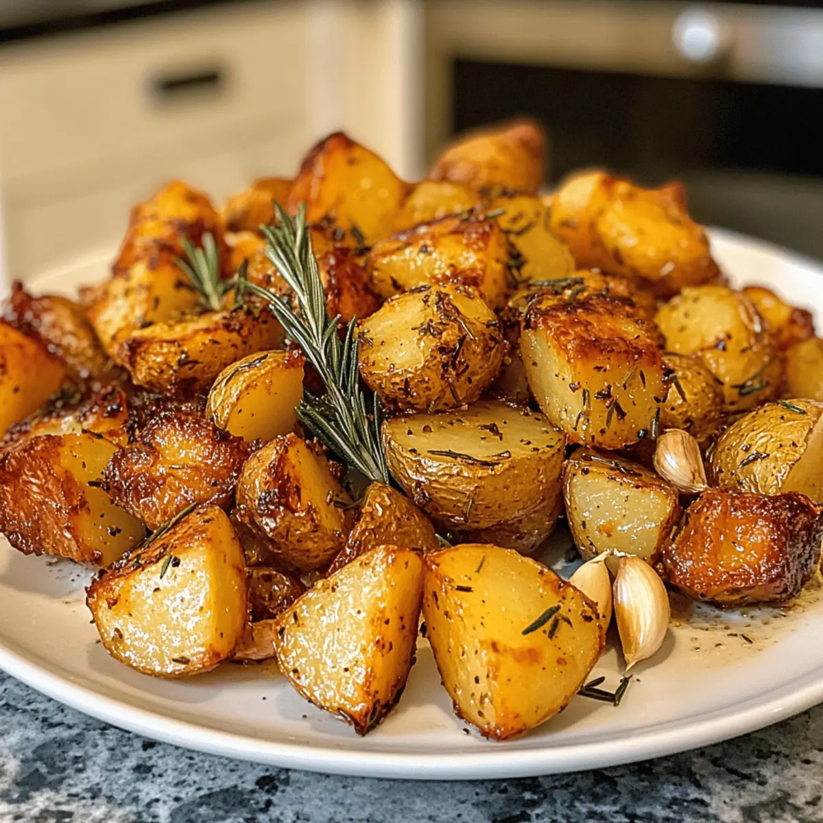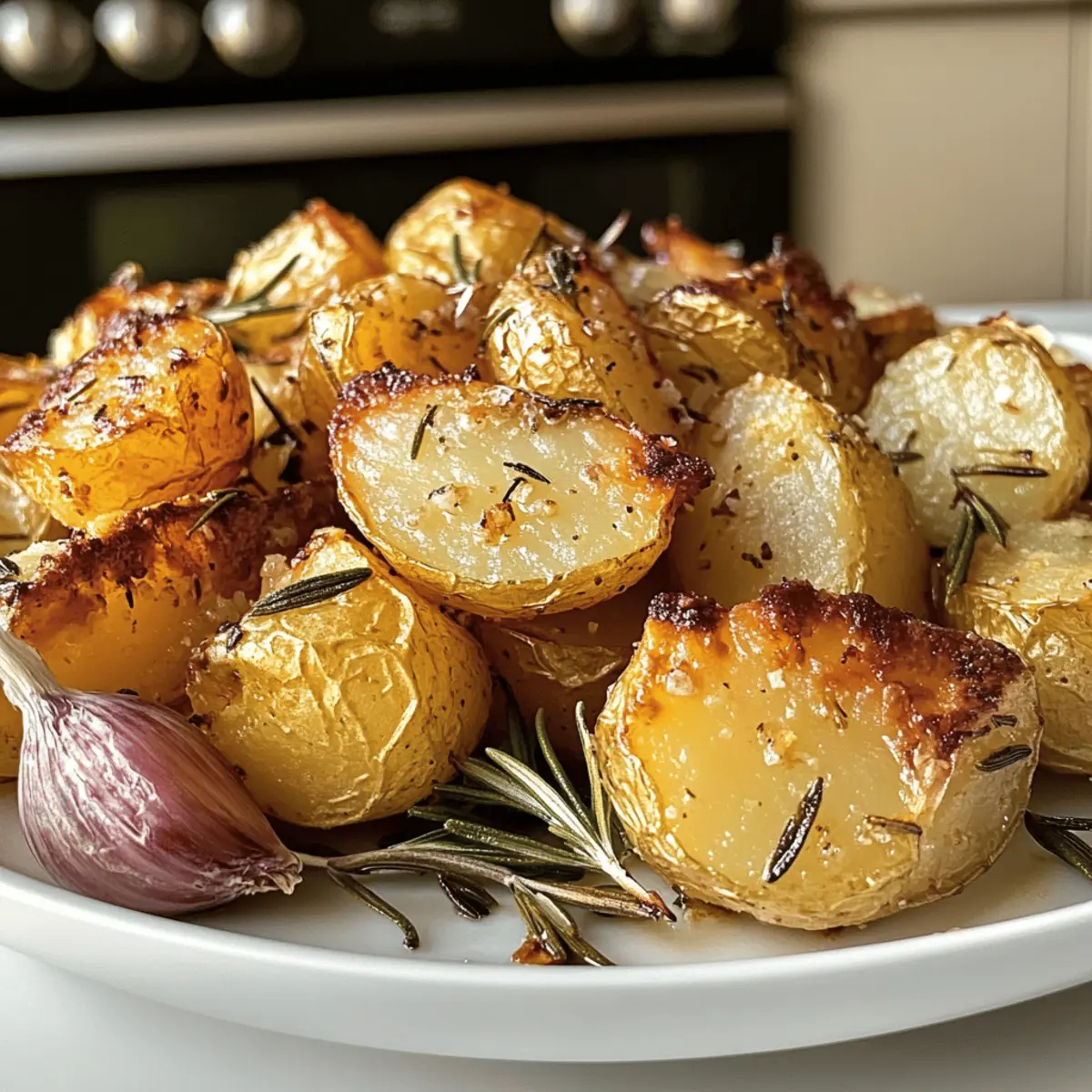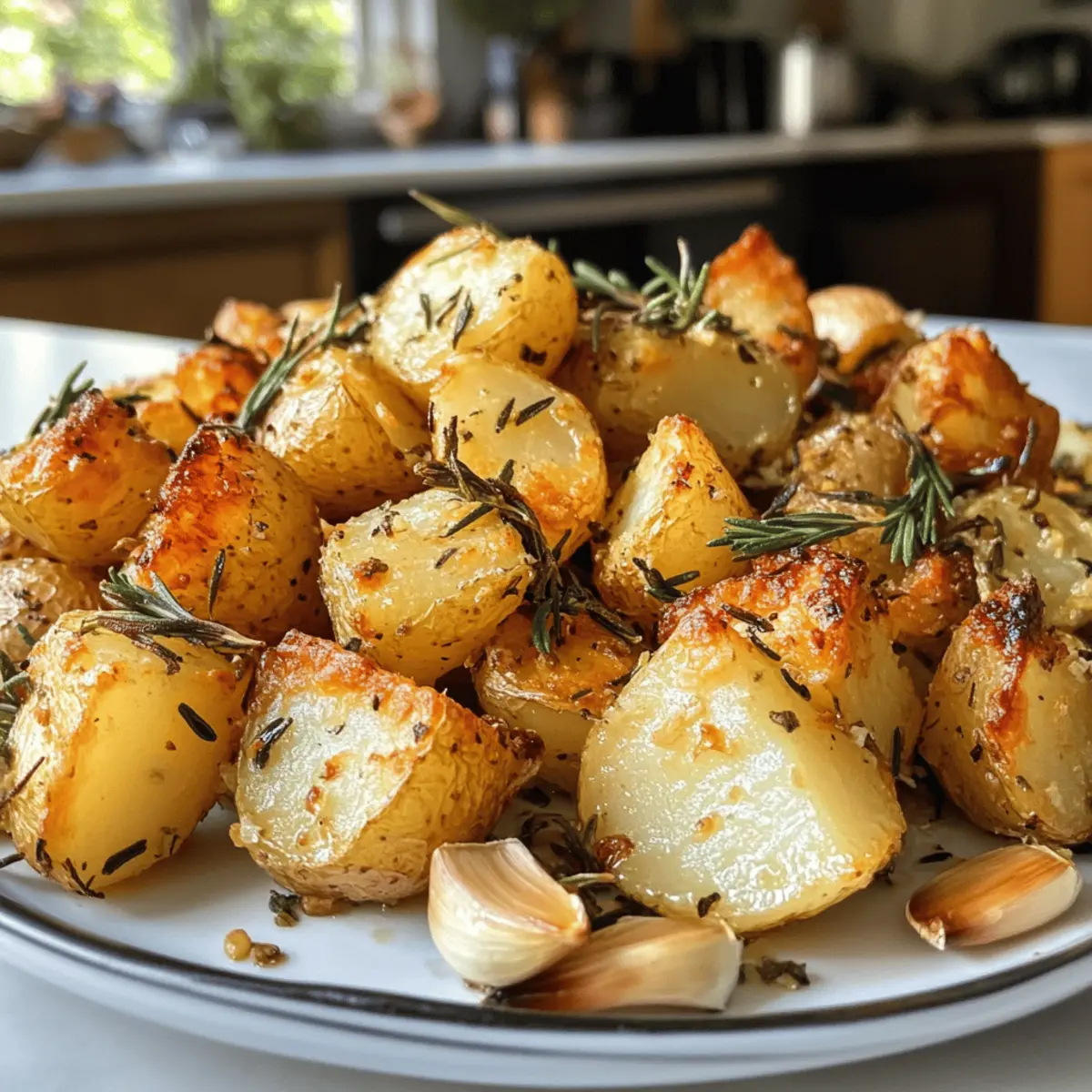 A tantalizing aroma wafts through my kitchen, bringing back memories of family gatherings where crispy roast potatoes were the star of the show. These Crispy Roast Potatoes with Rosemary and Garlic are not just a side dish; they elicit happiness and comfort with every bite. With their crunchy exterior and fluffy interior, they blend the best textures of French fries and mashed potatoes. Even better, this recipe is simple to whip up, making it the perfect choice for busy weeknights or festive occasions. Plus, it’s Whole30 compliant and gluten-free, so you can indulge without any guilt. Ready to make your mealtime memorable? Let’s dive into how you can bring these delicious potatoes to your table! Why Are These Potatoes So Irresistible? Crispy exterior: The parboiling technique ensures a crunchy outside that contrasts beautifully with the fluffy inside. Herb-infused goodness: Fresh rosemary and garlic meld together, creating an aroma that makes your mouth water. Simplicity reigns: With just a few ingredients, you can whip up a side dish that steals the spotlight at any meal. Versatile pairing: These potatoes complement everything from grilled steaks to roasted vegetables, fitting seamlessly into any feast. If you’re craving more wholesome sides, check out Lemon Herb Roasted or Garlic Shrimp Mashed for inspiration! Meal-prep friendly: Make ahead by parboiling and roasting for a quick, tasty addition to weeknight dinners. Crispy Roast Potatoes with Rosemary and Garlic Ingredients • Note: Gather these key ingredients to embark on the delicious journey of creating crispy roast potatoes that are Whole30 compliant and gluten-free! For the Potatoes Yellow Potatoes – These are the backbone of your dish, providing structure and texture. Try using Yukon Gold or red potatoes for a different flavor profile. Kosher Salt – This essential seasoning enhances the potatoes’ flavor and aids in achieving that coveted crispy exterior. Sea salt can be a great alternative too. Baking Soda – A secret ingredient to elevate crispiness; it helps create an even crunch. You can omit it if it’s not available, as it’s not required. For the Cooking Fat Duck Fat – Rich and flavorful, this fat promotes beautiful browning. Substitute with olive oil, ghee, beef tallow, or avocado oil for a variation in taste. Extra-Virgin Olive Oil – A finishing touch that adds flavor and moisture to your crispy potatoes. Grass-fed butter offers a richer flavor if preferred. For Flavoring Whole Head Garlic – Provides an aromatic infusion and depth of taste. If you’re in a hurry, garlic powder works, but fresh is always best. Chopped Fresh Rosemary – This herb adds an earthy aroma and taste. If you don’t have rosemary on hand, feel free to substitute with thyme or oregano. Freshly-Cracked Black Pepper – Offers a warm note, enhancing overall flavor. Adjust the amount to your personal preference; white pepper can be used for a milder flavor. For Finishing Touches Flaky Sea Salt – A sprinkle just before serving enhances flavor and visuals. Feel free to adjust to taste for that perfect finishing touch. Step‑by‑Step Instructions for Crispy Roast Potatoes with Rosemary and Garlic Step 1: Prepare the Potatoes Start by peeling the yellow potatoes and cutting them into large chunks—leave the smaller ones whole, halve medium-sized ones, and quarter the larger pieces. Rinse them under cold water to remove excess starch, which helps achieve that signature crispy texture. Set aside while you prepare for the next step. Step 2: Parboil the Potatoes Fill a large pot with water and add a generous pinch of kosher salt. Bring the water to a boil, then add your potato chunks. Parboil them for about 10 minutes until they’re just fork-tender but not fully cooked. Drain the potatoes well, then allow them to cool to prevent browning before moving on to the roasting phase. Step 3: Preheat and Heat the Fat While the potatoes cool, preheat your oven to 425°F (220°C). In the meantime, in a roasting pan, add duck fat (or your chosen alternative) and place it in the oven to heat for about 10 minutes. You’ll know it’s ready when the fat is shimmering and almost smoking, creating the perfect environment for crispy roast potatoes. Step 4: Coat the Potatoes Once the fat is hot, carefully remove the roasting pan from the oven. Add the cooled, parboiled potatoes to the pan and toss them gently to coat each piece thoroughly in the hot fat. This step is crucial as it helps to create a deliciously crispy exterior on your Crispy Roast Potatoes with Rosemary and Garlic. Step 5: Roast the Potatoes Return the coated potatoes to the oven and roast them for 45 minutes to 1 hour. Halfway through, flip the potatoes to ensure even browning and crispiness. Keep an eye on them; they should develop a beautiful golden color and a crunchy texture as they roast to perfection. Step 6: Add Garlic and Rosemary During the last 10 minutes of roasting, take your whole head of garlic and chopped fresh rosemary and add them to the pan. This allows their flavors to infuse the potatoes, enhancing your Crispy Roast Potatoes with Rosemary and Garlic, and filling your kitchen with a tantalizing aroma. Step 7: Finish and Serve Once the potatoes are golden brown and crispy, remove the pan from the oven. Sprinkle the crispy roast potatoes generously with flaky sea salt while they’re still hot, allowing the seasoning to stick. Serve immediately, enjoying the deliciously crispy exterior and fluffy interior of these irresistible potatoes! What to Serve with Crispy Roast Potatoes with Rosemary and Garlic Pair these delightful potatoes with a variety of dishes to create a well-rounded meal that’s sure to please everyone at your table. Grilled Chicken: The juicy, smoky flavors of grilled chicken contrast beautifully with the crispiness of the potatoes, making for a satisfying pairing. Roasted Vegetables: Add some color and nutrition — a mix of seasonal vegetable