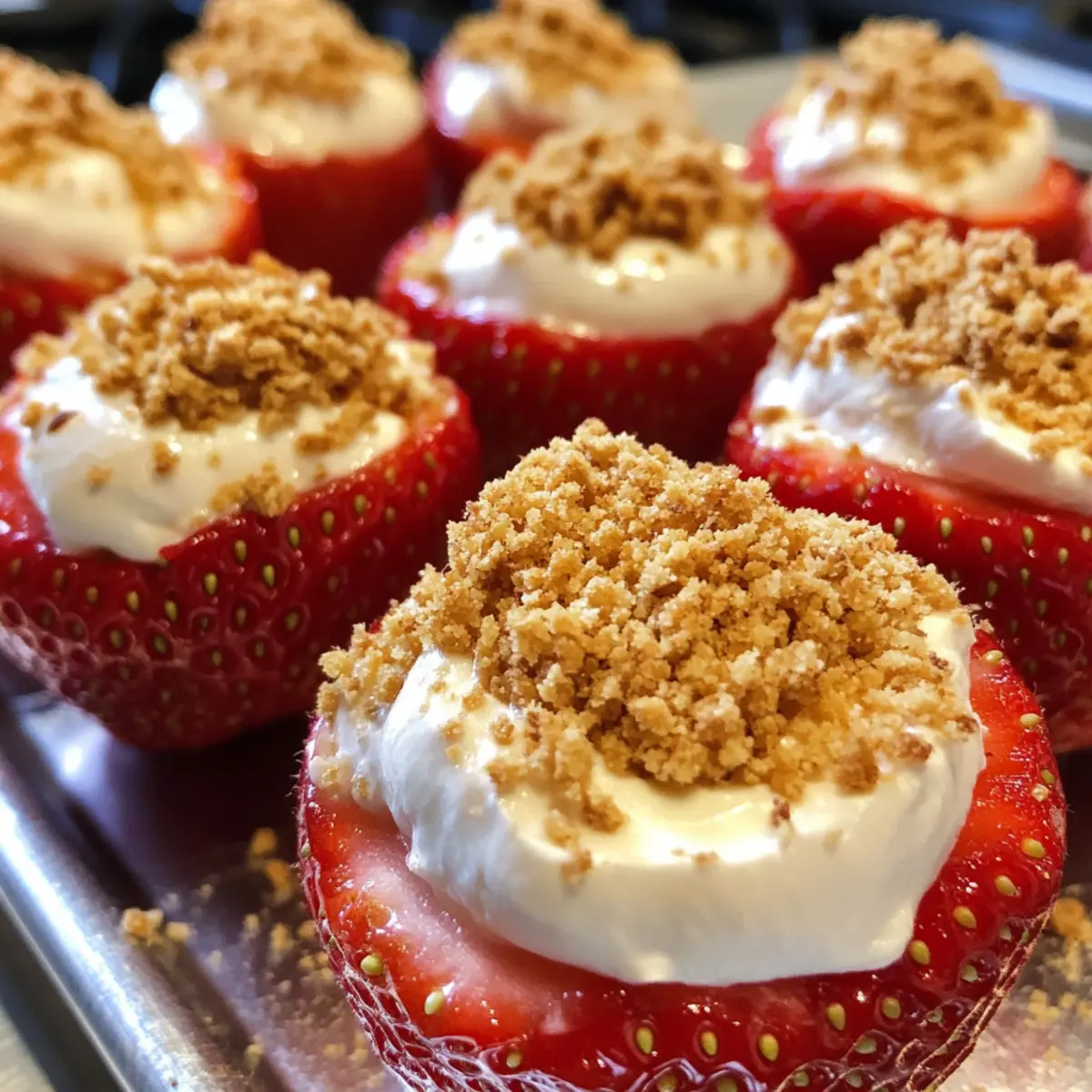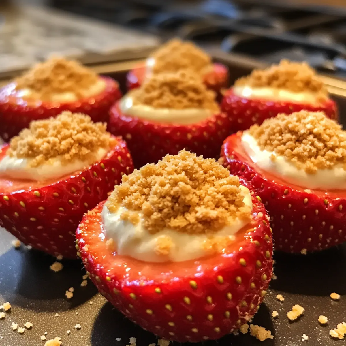 Sprinkle graham cracker crumbs over the tops of each filled strawberry, adding a delightful crunch to your Deviled Strawberries. This topping mimics the crust of a traditional cheesecake and enhances the overall flavor. Be generous here, as it adds a lovely texture that perfectly balances the creamy filling. Allow the garnished strawberries a moment to set before serving.