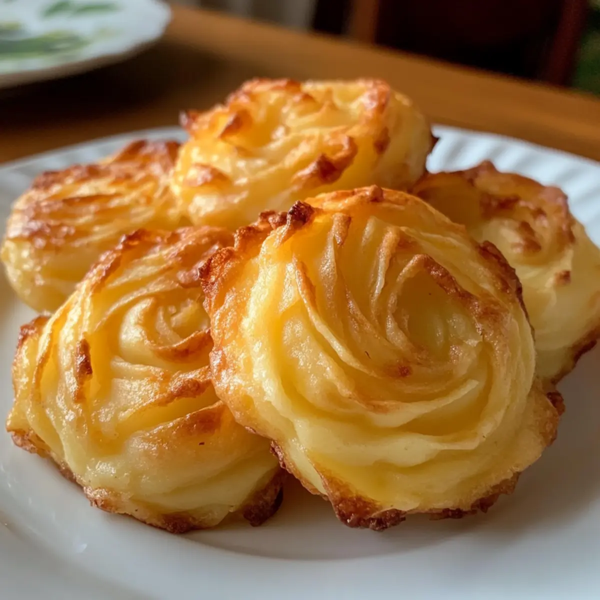 Every time I serve Duchess Potatoes, I’m reminded of the magic that turns ordinary spuds into an exquisite culinary masterpiece. These fancy side dishes can elevate any meal, boasting a perfect harmony of cloud-like creaminess and a crispy, golden exterior that’s simply irresistible. Infused with butter, cream, and a touch of Parmesan, Duchess Potatoes strike the ideal balance between comfort food and gourmet elegance. Whether you’re preparing for a festive gathering or simply seeking to impress at dinner, this make-ahead recipe ensures a stress-free experience, letting you enjoy the moment with your guests. Isn’t it time to give your dining table a touch of sophistication? Let’s dive into making these delightful potatoes! Why are Duchess Potatoes so special? Elegance on a Plate: Duchess Potatoes are not just a side dish; they are a stunning centerpiece that adds sophistication to any meal. Make-Ahead Magic: Prep them in advance to save time, making your hosting experience seamless. Flavor Boost: The combination of rich butter, cream, and Parmesan creates an indulgent flavor profile that complements any main dish beautifully. Versatile Pairing: These potatoes harmonize with a variety of proteins, from roast meats to fresh salads, making them perfect for any occasion. For something equally delicious, consider serving alongside Shrimp Mashed Potatoes or the savory Lemon Herb Potatoes. Duchess Potatoes Ingredients For the Base Russet or Yukon Gold Potatoes – Choose these for their starchiness to ensure a fluffy texture; other starchy potatoes may work, but avoid waxy varieties. Unsalted Butter – This rich ingredient enhances flavor; use unsalted to better control seasoning. Heavy Cream – Crucial for a smooth, creamy consistency; you can substitute with half-and-half for a lighter texture. Grated Parmesan Cheese – Adds a savory richness; consider Gruyère or a dairy-free option if needed. Seasoning Essentials Salt – Essential for elevating flavor both in cooking and final seasoning; adjust based on the saltiness of butter and cheese. Black Pepper – Enhances warmth in flavor; feel free to omit for a milder option. Binding and Garnish Egg Yolks – Adds richness and acts as a binder for the potato mixture; for a vegan alternative, you might use a flax egg or omit. Chives or Parsley – Fresh herbs lend a burst of color and freshness; any fresh herb can work beautifully for garnish. Finishing Touches Sea Salt – Flaky salt enhances flavor and presentation; Maldon or fleur de sel provides a lovely textural contrast. Duchess Potatoes are truly a fancy side dish perfect for any occasion! Step‑by‑Step Instructions for Duchess Potatoes Step 1: Boil the Potatoes Begin by peeling and chopping 2 pounds of Russet or Yukon Gold potatoes into even chunks. Place them in a large pot, cover with cold salted water, and bring to a boil over medium-high heat. Cook for 15-20 minutes, or until tender; a fork should easily pierce through. Drain the potatoes well and return them to the pot for the next step. Step 2: Preheat the Oven While the potatoes are boiling, preheat your oven to 425°F (220°C). Line a baking sheet with parchment paper to prevent sticking. This high temperature will help achieve the desirable golden, crispy finish on your Duchess Potatoes as they bake. Step 3: Melt Butter and Warm Cream In a small saucepan, melt 2 tablespoons of unsalted butter over low heat. Once melted, add 1/2 cup of heavy cream and warm it gently without boiling. Set aside this creamy mixture as it will enhance the overall texture and richness of your Duchess Potatoes. Step 4: Mash the Potatoes Drain the boiled potatoes completely and return them to the pot over low heat to evaporate any excess moisture. Mash the potatoes until smooth using a potato masher or ricer. Incorporate the melted butter, warm cream, 1/2 cup of grated Parmesan cheese, 2 egg yolks, and salt and pepper to taste. Mix thoroughly until all ingredients are well combined and creamy. Step 5: Pipe the Mixture Transfer the luscious potato mixture into a piping bag fitted with a star tip. Pipe small mounds or swirls (about 2 inches wide) onto the prepared baking sheet, leaving space between each portion for even cooking. The design will create beautiful, crispy edges on your Duchess Potatoes. Step 6: Bake to Crispy Perfection Brush the tops of the piped potato mounds with the remaining melted butter to encourage browning. Bake in the preheated oven for 15-20 minutes or until the tops are golden brown and crispy, giving a tantalizing contrast to the creamy insides of these Duchess Potatoes. Step 7: Garnish and Serve Once baked, remove the Duchess Potatoes from the oven and let them cool for a minute. Garnish with chopped chives or parsley for a fresh touch, then sprinkle with flaky sea salt for added flavor. Serve them warm as a delightful, elegant side dish that completes any meal! Expert Tips for Duchess Potatoes Drain Well: Ensure potatoes are thoroughly drained after boiling to prevent a watery mash, which can ruin the texture. Pipe Generously: Pipe mounds that are about 2 inches wide to allow space for crisping. Crowding can lead to soggy edges. Watch the Bake: Keep an eye on the Duchess Potatoes as they bake; removing them just as they turn golden ensures optimal flavor and texture without burning. Use Cold Ingredients: For a smooth mixture, ensure your butter is melted and cream is warm, but don’t let either cool too much before combining with the potatoes. Customize Flavor: Don’t hesitate to enhance your Duchess Potatoes with garlic, fresh herbs, or spices for an exciting twist; they adapt well to many flavors! Make Ahead: Preparing Duchess Potatoes ahead of time makes mealtime easier. Simply freeze before baking and pop them in the oven when needed for a stress-free side dish. Make Ahead Options Duchess Potatoes are fantastic for meal prep, allowing you to spend less time in the kitchen on busy weeknights! You can prepa