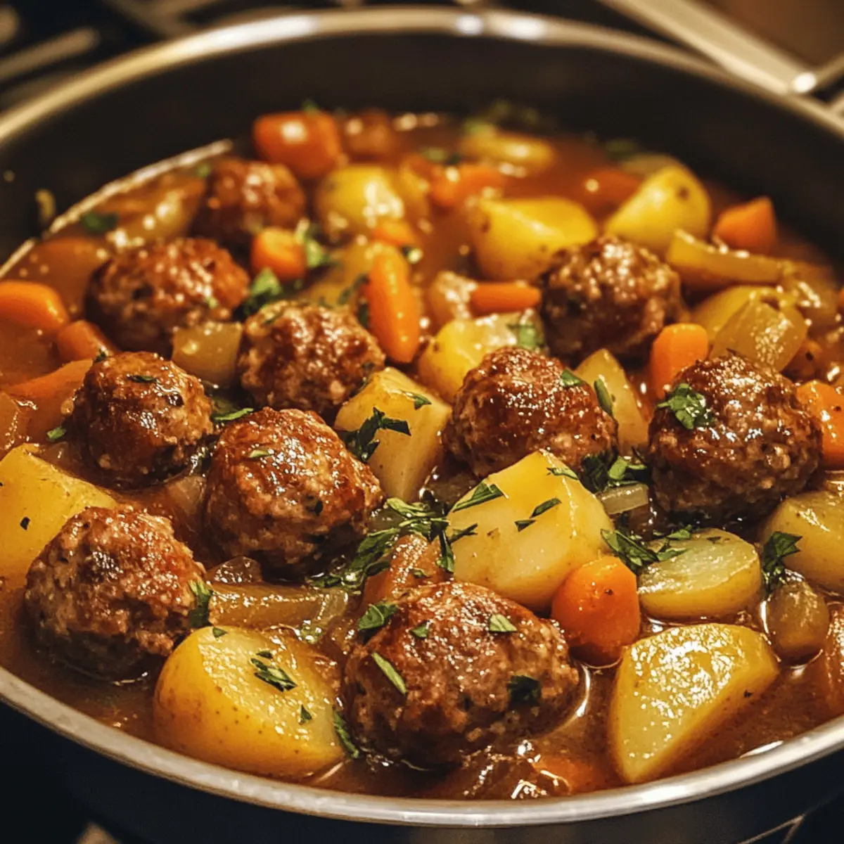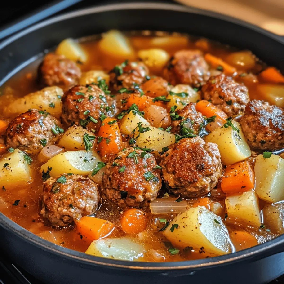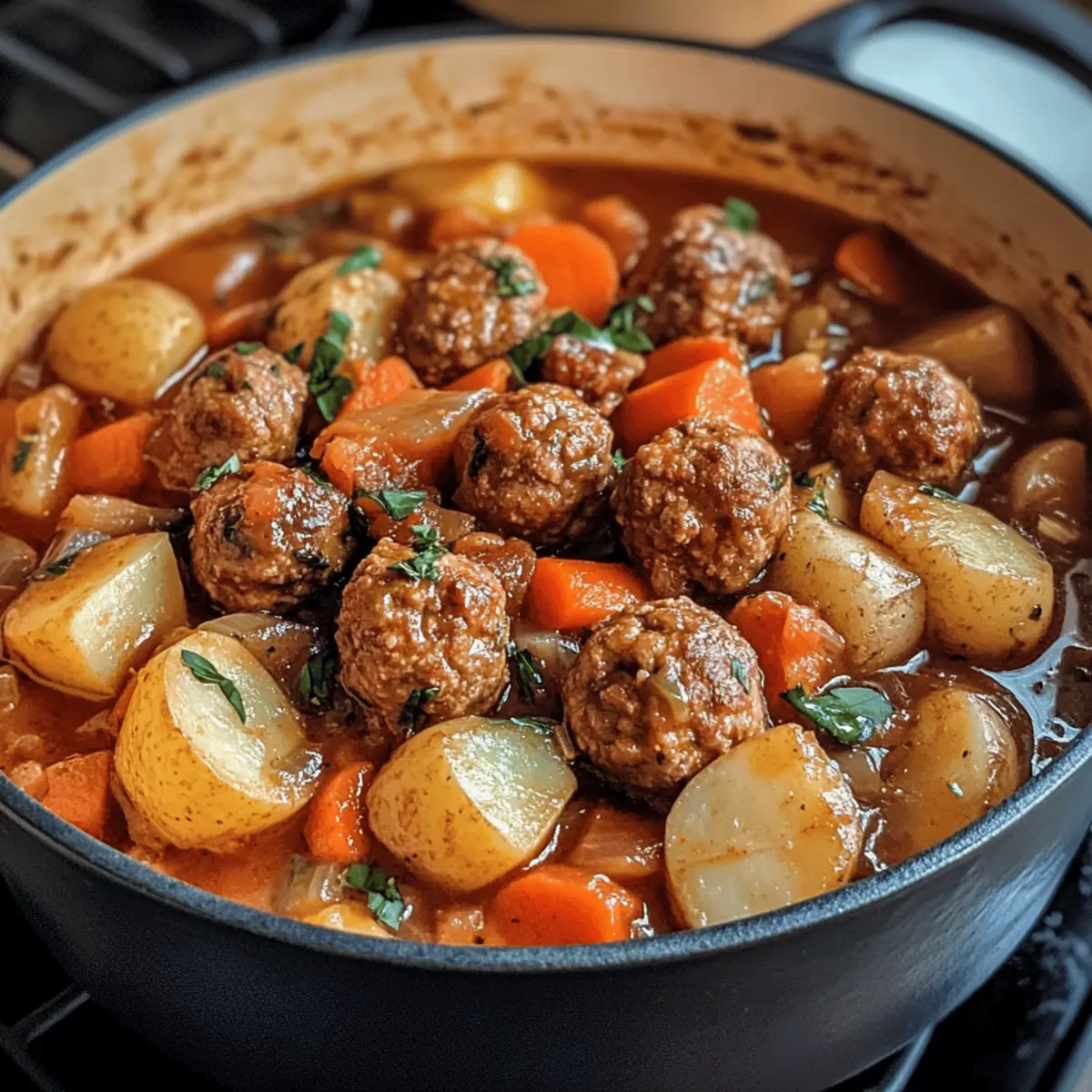 As I stirred the simmering pot of my Easy One-Pot Meatball Stew, the rich aroma wafted through my kitchen, instantly evoking a sense of warmth and comfort. This stew is like a cozy hug on a chilly evening, filled with juicy meatballs, tender potatoes, and vibrant vegetables, all brought together in a savory broth. Perfect for busy weeknights, this simple recipe requires just one pot and minimal cleanup, making it not only a delicious option but also a huge time-saver. Plus, it’s freezer-friendly, so you can easily prepare a batch for those days when cooking feels like a chore. Ready to dive into a bowl of heartwarming delight? Let’s get started! Why is This Stew So Irresistible? Comforting Warmth: This Easy One-Pot Meatball Stew brings a cozy sensation, perfect for chilly evenings. Quick and Simple: With just one pot, you can whip it up easily, making weeknight meals stress-free. Versatile Ingredients: Adapt every batch to your taste! Swap in different meatballs or seasonal veggies to keep things exciting. Crowd-Pleasing Flavor: Rich broth meets tender meatballs and hearty veggies, ensuring everyone at the table will ask for seconds. Freezer-Friendly Goodness: Make a big batch, and freeze leftovers for a delicious, ready-to-go meal on busy days! If you love easy preparations, check out my Chicken Taquitos Spicy and Cinnamon Roll Pancakes for more comforting recipes! Easy One-Pot Meatball Stew Ingredients For the Stew Base Olive Oil – Adds richness and helps to sauté the vegetables; feel free to substitute with any neutral cooking oil. Onion – Provides aromatic sweetness; yellow or white onions work best for this recipe. Garlic – Enhances flavor with a pungent aroma; fresh garlic is highly recommended for optimal taste. Beef Broth – Forms the heart of the stew; use chicken or vegetable broth for a lighter flavor profile. Tomato Paste – Adds depth and a beautiful color to the stew; don’t skip it, though substitutes like tomato sauce can work in a pinch. Worcestershire Sauce – Brings umami richness; soy sauce can be used as a gluten-free alternative. Dried Thyme & Paprika – Both spices contribute savory notes; feel free to substitute with other dried herbs as per preference. Salt & Black Pepper – Enhances overall flavors; adjust these to your personal taste. For the Veggies Baby Potatoes – Hold their shape well and soak up flavors; Yukon golds or chopped russets are great alternatives. Carrots – Add a touch of sweetness and texture; any variety, whether baby or regular, will do the trick. Frozen Peas – Offer a pop of color and sweetness; swap with other frozen veggies like green beans or corn if desired. For the Meatballs Frozen or Homemade Cooked Meatballs – The star of the stew; using pre-cooked options can save you precious time and effort. For Thickening Cornstarch & Water – Used to thicken your stew; ensure it’s mixed well before adding to prevent clumping. For Garnish Fresh Parsley (optional) – Adds brightness and a splash of color to your dish before serving; it’s optional but lovely! With these ingredients gathered, you’re just one step closer to enjoying an enchanting bowl of Easy One-Pot Meatball Stew! Step‑by‑Step Instructions for Easy One-Pot Meatball Stew Step 1: Sauté Aromatics In a large pot, heat 2 tablespoons of olive oil over medium heat. Once shimmering, add 1 diced onion and sauté for 4–5 minutes until translucent. Stir in 3 minced garlic cloves and cook for an additional 30 seconds until fragrant, releasing a beautiful aroma that sets the stage for your Easy One-Pot Meatball Stew. Step 2: Build the Base Next, stir in 2 tablespoons of tomato paste along with 4 cups of beef broth and 2 tablespoons of Worcestershire sauce. Sprinkle in 1 teaspoon of dried thyme, 1 teaspoon of paprika, and season with salt and black pepper to taste. Mix everything together well, allowing the flavors to meld for about 2 minutes. Step 3: Add Veggies and Meatballs Incorporate 1 pound of baby potatoes, 2 chopped carrots, and your choice of frozen or homemade cooked meatballs into the pot. Bring the mixture to a rolling boil, then reduce the heat to low and let it simmer uncovered for 30–35 minutes. Stir occasionally until the vegetables are fork-tender and the meatballs are heated through. Step 4: Thicken the Stew In a separate small bowl, mix 2 tablespoons of cornstarch with 2 tablespoons of water to create a slurry. Stir this mixture into the simmering stew and cook for an additional 5 minutes, or until the broth thickens to your desired consistency, enhancing the heartiness of your Easy One-Pot Meatball Stew. Step 5: Finish with Peas Finally, stir in 1 cup of frozen peas, letting them warm through for about 2–3 minutes. This adds a burst of color and sweetness to the stew. Taste and adjust seasoning as needed, making sure every spoonful is bursting with flavor. Step 6: Serve Ladle the hearty Easy One-Pot Meatball Stew into bowls, garnishing with a sprinkle of fresh parsley if desired. Pair with crusty bread for a satisfying meal that comforts the soul and delights the taste buds. Storage Tips for Easy One-Pot Meatball Stew Fridge: Store leftover stew in an airtight container for up to 3 days. Ensure it’s fully cooled before refrigerating to maintain freshness. Freezer: For longer storage, freeze the stew in freezer-safe bags or containers for up to 3 months. Portioning makes it easy to thaw and reuse! Thawing: Thaw your Easy One-Pot Meatball Stew in the fridge overnight before reheating. This helps retain texture and flavor. Reheating: Reheat gently on the stovetop over low heat until warmed through, stirring occasionally. Add a splash of broth or water if it’s too thick. Expert Tips for Easy One-Pot Meatball Stew Pre-Cooked Convenience: Opt for pre-cooked meatballs to save prep time. It’s a quick way to make your Easy One-Pot Meatball Stew without sacrificing flavor. Don’t Omit Tomato Paste: The tomato paste adds essential depth to