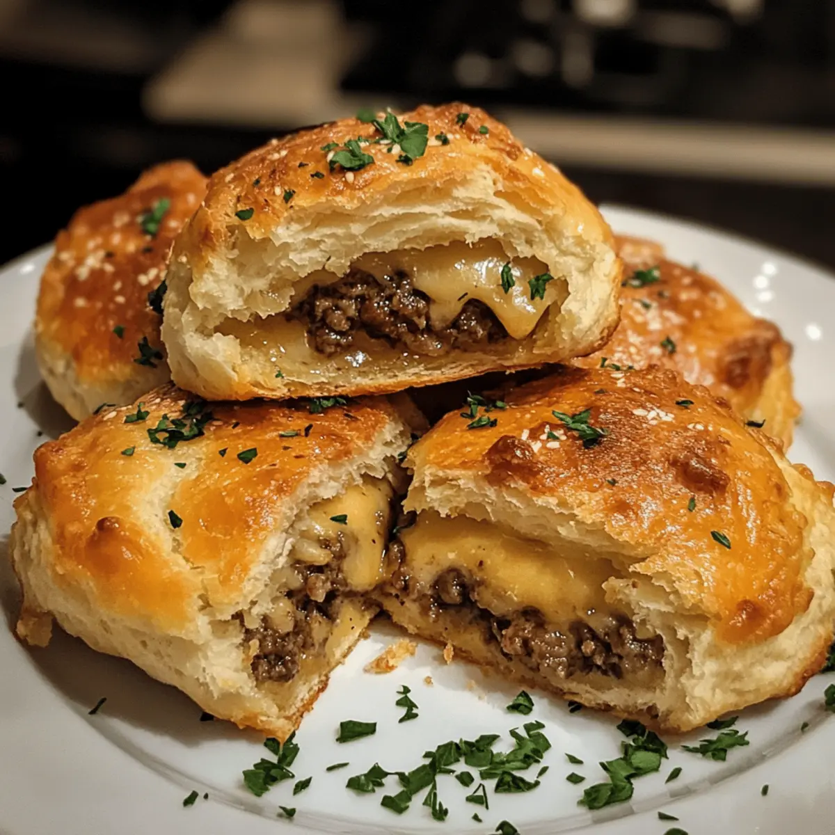 Delicious Garlic Parmesan Cheeseburger Bombs filled with juicy beef, wrapped in flaky dough, topped with garlic butter and Parmesan.