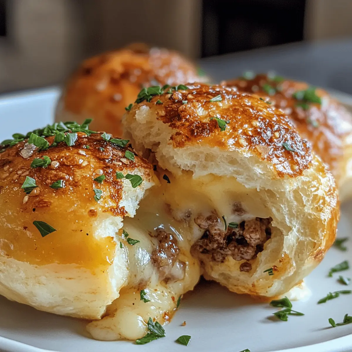 Once baked, remove the bombs from the oven and let them cool slightly for about 5 minutes. Before serving, garnish with freshly chopped parsley for a burst of color and flavor. Now, your Garlic Parmesan Cheeseburger Bombs are ready to impress family and friends at your gathering!