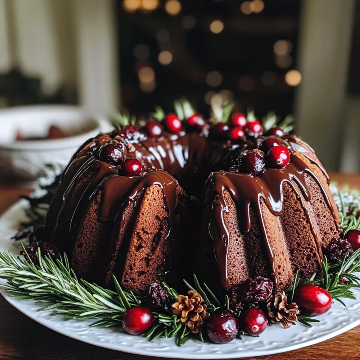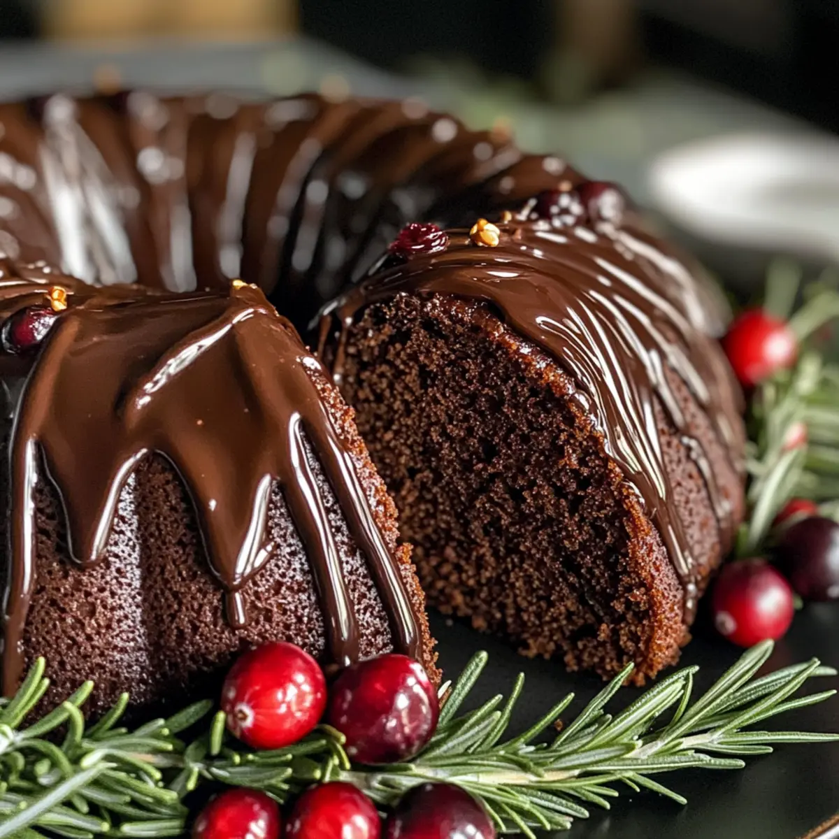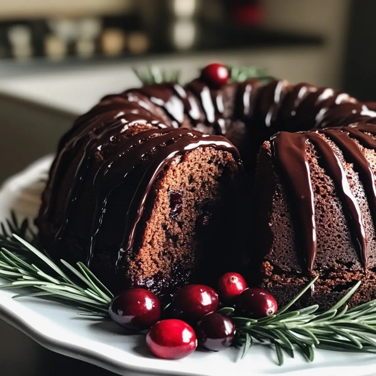 As I sifted through my spice cabinet, the warm, inviting scent of ginger and nutmeg set the mood for holiday baking. This Gingerbread Chocolate Bundt Cake Christmas Wreath is not just a treat; it’s a festive centerpiece that brings joy to any holiday gathering. Made with the perfect balance of spiced gingerbread and rich chocolate, this cake is sure to capture both the eyes and taste buds of your guests. Not only is it easy to whip up, but it’s also a delightful way to usher in the holiday spirit, transforming your home into a cheerful sanctuary. Imagine serving this show-stopping creation, glazed to perfection and adorned with seasonal decorations, as your friends and family gather around the table. Ready to make your holiday celebrations a little sweeter? Let’s dive into this unforgettable recipe! Why is this cake a holiday favorite? Festive Appeal: This Gingerbread Chocolate Bundt Cake is not just delicious; it also serves as a stunning table centerpiece. Decadent Flavor: The rich chocolate pairs perfectly with warm gingerbread spices, creating an irresistible combination that will have everyone wanting a second slice. Easy to Make: With simple instructions and readily available ingredients, this cake is a breeze to assemble, making it perfect for both novice and experienced bakers. Make It Yours: Want to switch things up? Try adding nuts for crunch or even a drizzle of peppermint chocolate for a holiday twist! Perfect for Sharing: This cake is sure to impress your guests, making it an ideal treat for holiday gatherings, alongside options like Chocolate Nostalgia Cake or Chocolate Swirl Cheesecake. Stays Fresh: Keep your cake stored in an airtight container for several days, letting you enjoy the festive flavors long past the holidays! Gingerbread Chocolate Bundt Cake Ingredients • A delightful combination of flavors starts with the following essential ingredients! For the Batter All-Purpose Flour (260g) – Provides structure and texture; swap with gluten-free flour if needed. Sugar (200g) – Adds sweetness to balance the bitterness of cocoa. Cocoa Powder (90g) – Gives the cake a rich chocolate flavor; opt for Dutch-processed cocoa for a deeper taste. Baking Soda (2 tsp) – Acts as a leavening agent for rise. Baking Powder (1 tsp) – Works alongside baking soda to ensure proper rising. Lebkuchen Spice (1 tsp) – Infuses the cake with traditional gingerbread flavor; can be substituted with mixed spices like cinnamon and nutmeg. Salt (1/2 tsp) – Enhances the overall flavor of the cake. Eggs (2 large) – Provides moisture and helps bind the ingredients. Buttermilk (160ml) – Adds acidity for tenderness; regular milk plus a splash of vinegar works too. Sour Cream (80g) – Contributes to moisture and ensures a tender crumb. Sunflower Oil (80ml) – Keeps the cake moist; feel free to replace it with a neutral oil like canola. Vanilla Extract (2 tsp) – Introduces a depth of flavor that rounds out the cake. Fresh-brewed Coffee (240ml) – Enhances the chocolate flavor; use decaf if you prefer. Ritter Sport Lebkuchen Chocolate (100g, chopped) – Provides a unique taste that’s key to the recipe; any spiced chocolate can substitute if needed. For the Glaze Semi-sweet Chocolate (200g) – Used for the glaze, creating a luscious coating that completes the cake; dark chocolate is an excellent alternative for less sweetness. Coconut Oil (1 tsp) – Softens the chocolate glaze, making it easy to drizzle. For Decoration Fresh Cranberries/Raspberries – Adds a fresh, tart contrast and an appealing pop of color. Rosemary Stems – Provides a lovely, festive touch that enhances the presentation. This Gingerbread Chocolate Bundt Cake is an enchanting addition to your holiday celebrations! Step‑by‑Step Instructions for Gingerbread Chocolate Bundt Cake Christmas Wreath Step 1: Preheat and Prepare the Pan Begin by preheating your oven to 350°F (180°C). While it’s heating, grease your bundt pan thoroughly with butter or non-stick spray, then dust it with cocoa powder to prevent sticking. This beautiful bundt cake will need a solid foundation to rise beautifully, so make sure every crevice is well-coated. Step 2: Brew Coffee and Chop Chocolate Brew 240ml of fresh coffee and set it aside to cool slightly. While the coffee is cooling, chop the Ritter Sport Lebkuchen chocolate into small pieces, allowing it to blend seamlessly into the batter later. The aromatic scent of the coffee will enhance the rich chocolate flavor in the Gingerbread Chocolate Bundt Cake. Step 3: Combine Dry Ingredients In a stand mixer bowl, combine 260g of all-purpose flour, 200g of sugar, 90g of cocoa powder, 2 teaspoons of baking soda, 1 teaspoon of baking powder, 1 teaspoon of lebkuchen spice, and ½ teaspoon of salt. Give these dry ingredients a quick mix on low speed until they are well blended; this will create a solid base for the cake. Step 4: Mix Wet Ingredients In a separate bowl, whisk together 2 large eggs, 160ml of buttermilk, 80g of sour cream, 80ml of sunflower oil, and 2 teaspoons of vanilla extract until smooth. Gradually pour this wet mixture into the dry ingredients while mixing on low speed. Add the warm brewed coffee slowly until everything is just combined, ensuring the batter remains smooth and lump-free without overmixing. Step 5: Fold in Chocolate Gently fold the chopped Ritter Sport chocolate into the batter using a spatula. This unexpected burst of spiced chocolate will elevate the flavor of your Gingerbread Chocolate Bundt Cake, creating a festive delight. Once the chocolate is evenly distributed, carefully spoon the batter into your prepared bundt pan, leveling it off as you go. Step 6: Bake the Cake Place your filled bundt pan in the preheated oven and bake for 45-50 minutes. To check for doneness, insert a skewer into the center; it should come out clean when the cake is ready. The aroma of spiced gingerbread will fill your kitchen, creating anticipation as it bakes beautiful