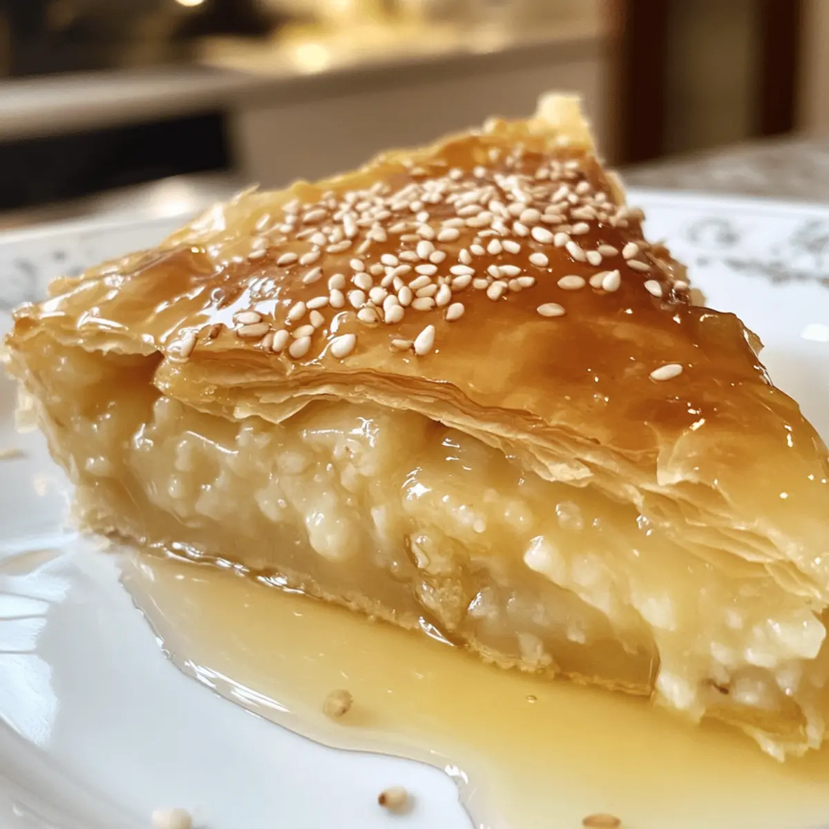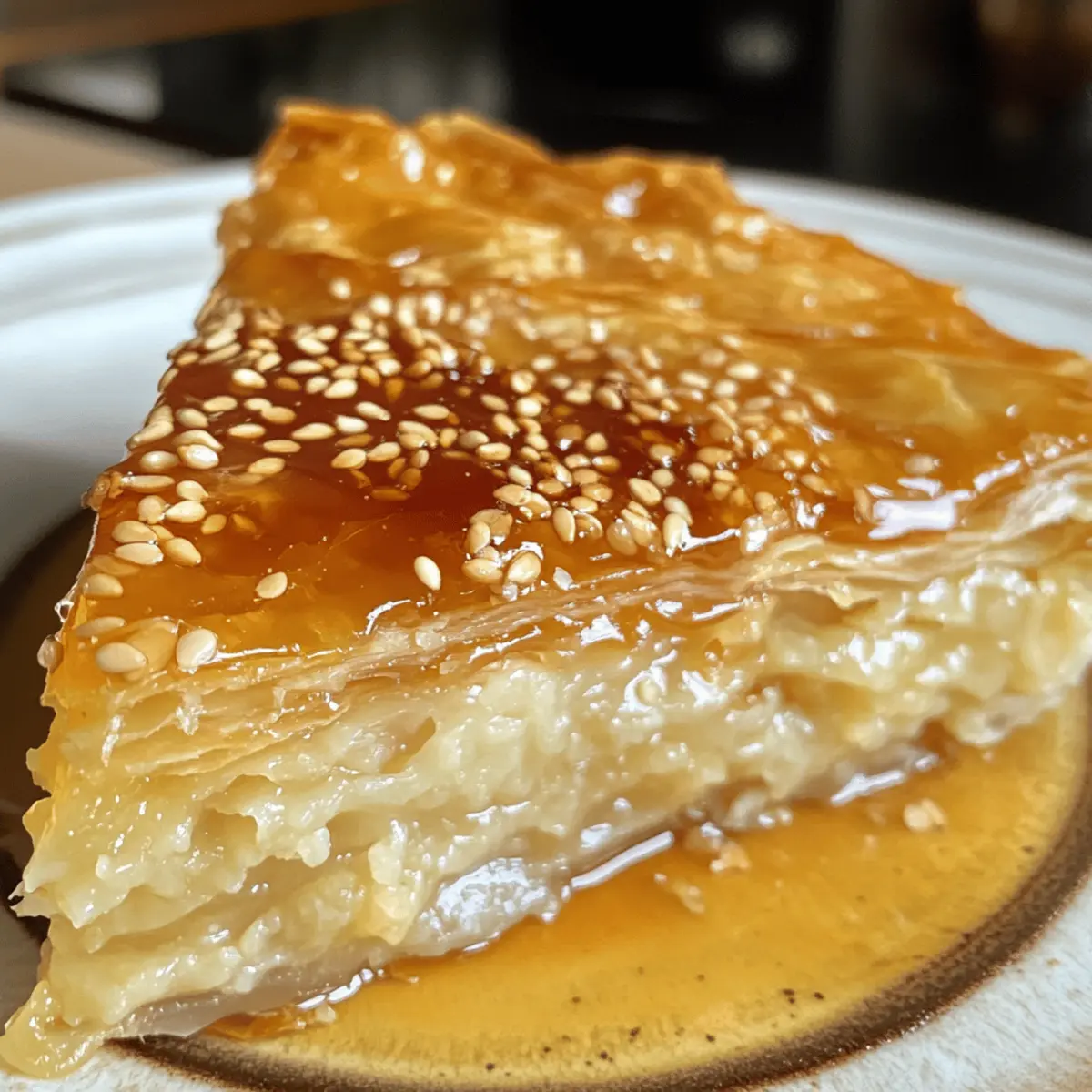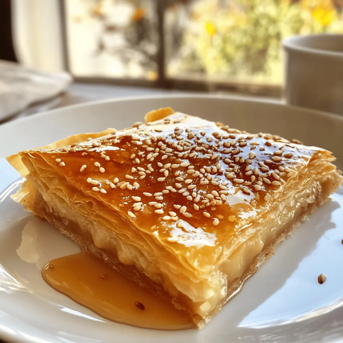 As I wandered through the vibrant markets of Greece, the sweet aroma of honey and warm spices beckoned me to a quaint bakery. It was there I first encountered the Golden Greek Honey Pie, or Melopita, a dessert that perfectly marries golden, flaky phyllo dough with a luscious, creamy semolina filling. What strikes me most about this traditional Greek dessert is how effortlessly it combines simplicity with indulgence—making it a delightful treat for both special occasions and casual afternoons alike. With its gluten-free option and vegetarian ingredients, this pie not only pleases the palate but also fits a variety of diets. Curious to bring a taste of the Mediterranean into your kitchen? Let’s dive into this recipe and create a dessert that’s sure to impress! Why is Golden Greek Honey Pie irresistible? Simplicity at its finest: This recipe is straightforward, requiring minimal culinary skills while delivering a gourmet dessert. Rich, Creamy Texture: The velvety semolina filling contrasts beautifully with the flaky phyllo, creating a satisfyingly indulgent bite. Versatile Servings: Whether it’s a festive gathering or a cozy afternoon coffee break, this pie fits perfectly into any occasion. Customizable Options: Feel free to adapt for dietary needs with gluten-free or dairy-free alternatives, ensuring everyone can enjoy a slice. Crowd-Pleaser: Serve it warm or at room temperature, and drizzle with honey for an impressive touch that’s sure to wow your guests! If you’re intrigued by honey desserts, check out our delicious Golden Greek Honey for more sweet inspiration, or try making our savory Hot Honey Chicken for a balanced meal! Golden Greek Honey Pie Ingredients • Here’s what you’ll need for a mouthwatering experience! For the Crust Phyllo Dough – use 8 sheets, ensuring to keep unused sheets covered to prevent drying out. Unsalted Butter – use 1 cup, melted; this creates richness and a perfectly crispy texture, or substitute with a dairy-free alternative. For the Filling Semolina Flour – use 1 cup to give structure to the creamy filling; cornstarch can be used for a gluten-free version. Eggs – use 3 large; they act as a binder, and flax eggs can be substituted for a vegan option. Granulated Sugar – use 3/4 cup for sweetness; you can try coconut sugar for a flavor twist. Whole Milk – use 2 cups to achieve a creamy filling texture; for dairy-free, opt for almond, oat, or coconut milk. Ground Cinnamon – use 1 tsp for warm, comforting flavor; adding nutmeg (1/2 tsp) deepens the spice profile. Ground Nutmeg – use 1/2 tsp; it’s optional but enhances the overall taste. Pinch of Salt – balances the sweetness and intensifies flavor. For the Topping Honey – use 1/2 cup, warmed to drizzle over the pie for added sweetness and gloss; maple syrup or agave works for a vegan alternative. Toasted Sesame Seeds – use 2 tbsp to add delightful crunch and a nutty touch, perfectly complementing the sweetness. Step‑by‑Step Instructions for Golden Greek Honey Pie Step 1: Preheat the Oven Begin by preheating your oven to 350°F (175°C). Grease a 9×13-inch baking dish with a little melted butter, ensuring it’s evenly coated to prevent the pie from sticking. This preparation will create a wonderful golden base for your Golden Greek Honey Pie once it’s time to bake. Step 2: Layer the Phyllo Dough Take one sheet of phyllo dough and lay it flat in the greased baking dish. Brush it generously with melted butter using a pastry brush, ensuring it’s well-coated. Repeat this process for six more sheets, layering them neatly on top of each other to create a flaky, crispy base for the pie. Step 3: Prepare the Filling In a mixing bowl, whisk together the semolina flour, eggs, granulated sugar, whole milk, ground cinnamon, ground nutmeg, and a pinch of salt until you achieve a smooth consistency. This creamy filling will be a delightful contrast to the crispy layers beneath, so take your time and ensure it’s lump-free before proceeding to the next step. Step 4: Assemble the Pie Carefully pour the creamy filling over the prepared phyllo base, spreading it evenly to cover the layers. After this, place a final sheet of phyllo on top of the filling, brushing it lightly with melted butter to keep it crisp. To make slicing easier later, gently score the top layer of phyllo with a sharp knife, creating a diamond pattern without going all the way through the filling. Step 5: Bake the Pie Place the assembled Golden Greek Honey Pie in the oven and bake for 40-45 minutes. Keep an eye on it as it bakes; you’re looking for a beautiful golden brown color on the top and the filling to be set. The aroma of warm spices will fill your kitchen, making it hard to wait! Step 6: Drizzle with Honey Once your pie is golden and baked, remove it from the oven and let it cool for about 10 minutes. While it cools, warm the honey slightly to make it easier to drizzle. Once cooled, generously drizzle the warm honey over the top of the pie, allowing it to soak into those flaky layers. Step 7: Add Finishing Touches Finally, sprinkle the toasted sesame seeds over the pie for an added layer of flavor and texture. This step gives your Golden Greek Honey Pie a lovely crunch and a hint of nuttiness that perfectly complements the sweetness of the honey and richness of the filling. Step 8: Serve and Enjoy Slice the pie into desired portions and serve it warm or at room temperature. Pair with a cup of coffee or tea for an exquisite homemade dessert experience. Enjoy the sweet, decadent layers and the delightful flavors of this traditional Greek treat! What to Serve with Golden Greek Honey Pie? Indulging in this delightful pie opens up a world of satisfying meal combinations that will elevate your dessert experience. Greek Yogurt: A dollop of Greek yogurt adds a creamy, tangy balance that beautifully complements the sweetness of the pie. Fresh Berries: Juicy berries provide a burst of freshness, offering a delig