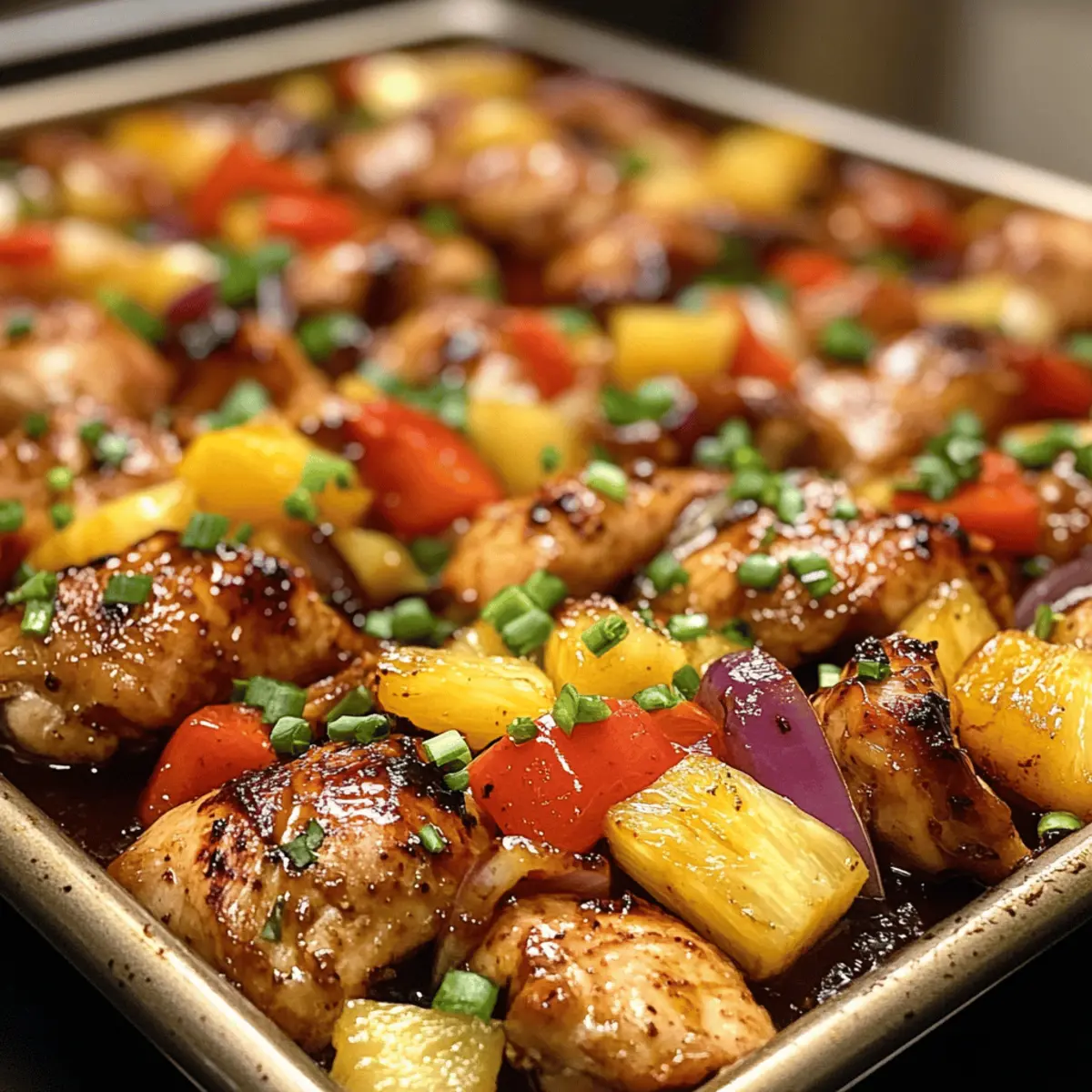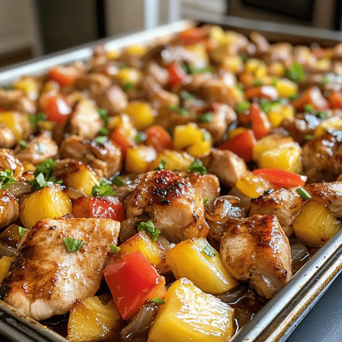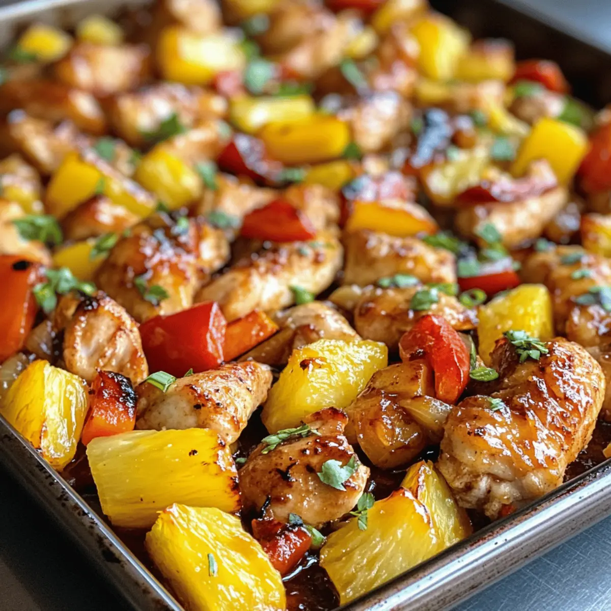 As I stepped into the kitchen, a wave of tropical inspiration washed over me, igniting my excitement for a flavorful dish that’s both easy to whip up and pleasing to the eyes. Enter the Hawaiian Chicken Sheet Pan—a harmonious medley of tender chicken, sweet pineapple, and vibrant veggies, all baked to perfection in one pan. This quick and easy recipe is not just a family pleaser; it’s also a healthy way to bring a taste of the islands to your dinner table. Plus, the colorful presentation makes it feel like a special occasion, even on busy weeknights. Are you ready to turn your evening meal into a mini getaway? Let’s dive into this delicious adventure together! Why Choose Hawaiian Chicken Sheet Pan? Convenience: This dish is an absolute time-saver! With everything cooked on one sheet pan, cleanup is a breeze, giving you more time to enjoy your meal. Bursting with Flavor: The combination of juicy chicken, sweet pineapple, and colorful veggies creates a delightful medley that dances on your taste buds. Versatile Options: Switch things up with shrimp or tofu for a different twist. You can even experiment with various sauces like sweet and sour for an exciting change! Healthy & Nutritious: Packed with protein and vitamins, this meal is perfect for those seeking a wholesome option that doesn’t compromise on taste. Crowd-Pleasing: Ideal for family dinners or entertaining guests, the vibrant colors and alluring aroma will keep everyone coming back for seconds. For more delicious meals, check out our tasty Cheesy Garlic Chicken or try the flavorful Buffalo Chicken Taquitos. Hawaiian Chicken Sheet Pan Ingredients For the Chicken Chicken breasts – A fantastic source of lean protein, essential for a balanced diet. Substitute with shrimp or tofu for a different protein option. For the Pineapple Pineapple chunks – They add a sweet, tropical flavor; fresh or canned works wonderfully! For the Vegetables Bell peppers – These colorful veggies offer both crunch and a boost of nutrition. Feel free to mix in broccoli or snap peas for extra variety! Onions – They provide depth of flavor to the dish, complementing the sweetness of the pineapple. For the Sauce Teriyaki sauce – This savory sauce is the star of the show, adding a rich glaze; a mix of soy sauce, honey, and garlic also makes a great substitute. For Roasting Olive oil – Ideal for roasting to perfection; swap it for another cooking oil if desired. Step‑by‑Step Instructions for Hawaiian Chicken Sheet Pan Step 1: Preheat the Oven Begin by preheating your oven to 400°F (200°C). This temperature ensures that your Hawaiian Chicken Sheet Pan bakes evenly and achieves the perfect caramelization on the chicken and vegetables. While the oven warms up, prepare your sheet pan by lining it with parchment paper or lightly greasing it with olive oil for easy cleanup. Step 2: Prepare the Pan Drizzle a generous amount of olive oil over the prepared sheet pan, making sure to coat the surface evenly. This step is crucial for ensuring that your chicken and vegetables roast beautifully without sticking. Using a brush or your hands, spread the oil across the pan, creating a shiny base where the flavors of the Hawaiian Chicken Sheet Pan will meld together. Step 3: Assemble the Ingredients Next, gather your chicken breasts, pineapple chunks, and colorful veggies such as bell peppers and onions. Place the chicken in the center of the sheet pan, then scatter the pineapple and vegetables around the chicken. Ensure a vibrant mix of colors, which not only looks appealing but also enhances the flavors during baking. Step 4: Add the Sauce Drizzle teriyaki sauce generously over the chicken, pineapple, and veggies. With a pair of tongs or your hands, toss everything together gently to ensure an even coating of the sauce. The Hawaiian Chicken Sheet Pan will be bursting with flavor, so take care to mix thoroughly, combining all those delicious ingredients for a harmonious dish. Step 5: Bake to Perfection Place the assembled sheet pan into the preheated oven and bake for 25-30 minutes. Halfway through, check the chicken for even cooking and give the pan a gentle shake to redistribute the ingredients. You know it’s ready when the chicken reaches an internal temperature of 165°F (74°C) and the veggies are tender with a slight caramelization on the edges. Step 6: Serve and Enjoy Once baked, remove the Hawaiian Chicken Sheet Pan from the oven and let it cool for a few minutes before serving. For a delightful meal, serve hot over cooked rice or with a fresh green salad. The colorful presentation and inviting aroma will make this dish a family favorite, perfect for any occasion. Hawaiian Chicken Sheet Pan Variations Feel free to explore creative ways to customize this recipe and make it your own! Shrimp Swap: Substitute shrimp for chicken to create a quick and delicious seafood version. Just adjust the cooking time as shrimp cooks faster! Tofu Option: For a plant-based twist, replace chicken with firm tofu. It absorbs the teriyaki flavor beautifully and is perfect for vegetarians. Sauce Variation: Swap the teriyaki sauce for sweet and sour sauce for a zingy flavor profile that takes your dish to the next level. Veggie Boost: Add sliced carrots or baby corn for extra crunch and color, making this dish even more vibrant and nutritious. Pineapple Twist: Experiment with mango or papaya instead of pineapple for a tropical twist that adds a different flavor dimension to your meal. Heat it Up: Sprinkle with chili flakes or add sliced jalapeños for those who enjoy a spicy kick that complements the sweetness. Herb Infusion: Top with fresh cilantro or green onions after baking to brighten up the dish and enhance its flavor profile. Nuts for Crunch: Finish with a sprinkle of toasted sesame seeds or slivered almonds to introduce a delightful texture contrast in every bite. For more delightful flavor combinations, try making our Hot Honey Chicken or the unique Tzatziki C