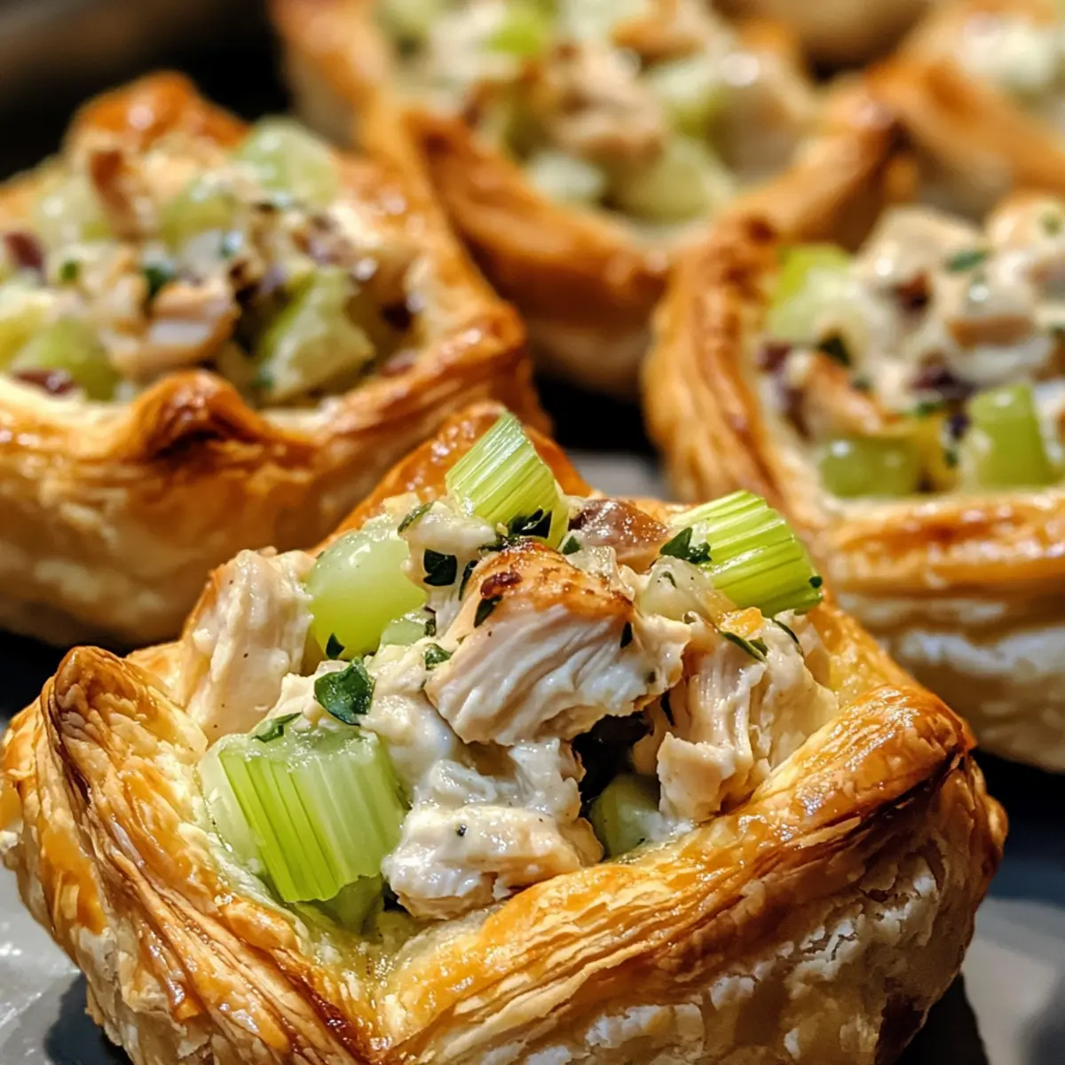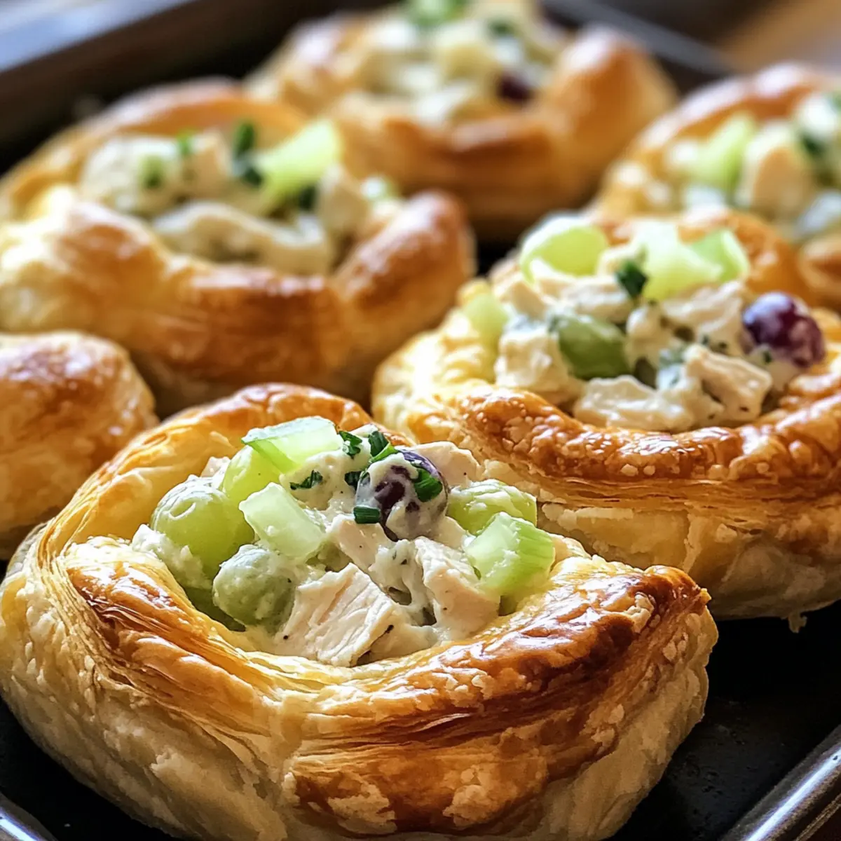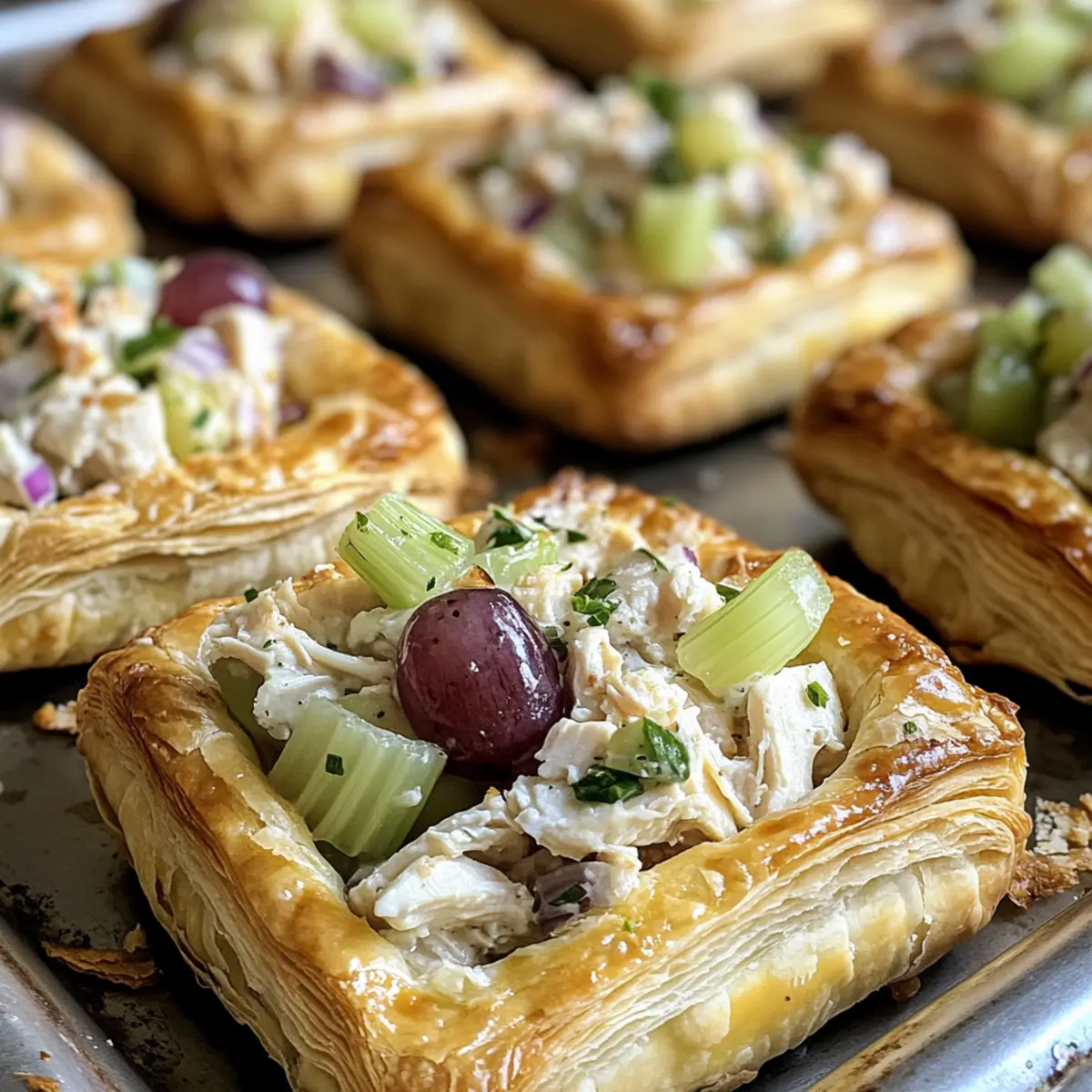 As I rummaged through my fridge, the familiar scent of grilled chicken drifted in the air, instantly inspiring a delicious idea: Healthy Chicken Salad Puffs! These little marvels combine the classic goodness of chicken salad nestled within flaky, buttery puff pastry, making them not just a delightful appetizer but also a perfect light meal. With their quick prep time and crowd-pleasing appeal, these puffs are truly adaptable for any gathering, from elegant soirées to casual potlucks. Plus, you can whip up the chicken salad a day in advance, ensuring a stress-free assembly. Ready to impress your friends or simply treat yourself? Let’s dive in! Why Are These Puffs So Irresistible? Quick & Easy: You can whip these Healthy Chicken Salad Puffs together in no time, perfect for last-minute gatherings or a busy weeknight. Flavor Fusion: The blend of crunchy celery and sweet grapes creates an unforgettable burst of flavor in every bite. Versatile Filling: Customize your chicken salad by swapping in seasonal ingredients or using your favorite proteins like rotisserie chicken for convenience. Perfect for Any Event: Whether a fancy cocktail party or a casual get-together, these puffs are sure to impress your guests! You can also check out my other crowd-pleasers like Buffalo Chicken Taquitos for more fun finger food options. Healthy Chicken Salad Puffs Ingredients • Get ready to create something delicious! For the Puff Pastry Puff Pastry – Look for high-quality, store-bought options made with real butter for that perfect flaky texture. For the Chicken Salad Cooked Chicken – Use grilled or rotisserie chicken, chopped into small, uniform pieces for easy filling. Celery – Adds a delightful crunch and freshness to the filling. Grapes – Introduce a sweet pop of flavor; both red and green grapes work beautifully. Mayonnaise – Binds everything together, adding a creamy texture; full-fat is best for richness. Onion – Offers depth of flavor; finely chop for a subtle taste. Salt & Seasoning (Tony’s) – Enhances the overall flavor; adjust to your taste preference. These Healthy Chicken Salad Puffs will become a favorite for any gathering, so don’t hesitate to make them your own! Step‑by‑Step Instructions for Healthy Chicken Salad Puffs Step 1: Prepare Puff Pastry Thaw your puff pastry by placing it in the fridge overnight. About 15-20 minutes before using, let it sit at room temperature for easy handling. Preheat your oven to 400°F (200°C). Cut the pastry into 12 equal squares from each sheet and place them on a lined baking sheet. Brush with melted butter and sprinkle a touch of salt. Bake for 12-14 minutes, until they are puffed and golden, then allow them to cool before slicing. Step 2: Prepare Chicken Salad Filling While the puff pastry is baking, grill your seasoned chicken breasts until cooked through, which usually takes about 6-8 minutes per side, depending on thickness. Let the chicken cool, then chop it into small, uniform pieces for the chicken salad. In a large mixing bowl, combine the chopped chicken, diced celery, halved grapes, chopped onion, and mayonnaise, stirring until everything is evenly coated and well combined for a delicious Healthy Chicken Salad Puffs filling. Step 3: Assemble Puffs Once your puff pastry shells have cooled, carefully slice each one in half to create a top and bottom. Spoon 2-3 tablespoons of the chicken salad filling into each bottom half, ensuring not to overfill to prevent sogginess. Gently press the top halves back onto the filled bottoms. For easy handling, secure each puff with a toothpick if desired. Now your Healthy Chicken Salad Puffs are ready to be served, perfect for gatherings! How to Store and Freeze Healthy Chicken Salad Puffs Fridge: Store any leftover Healthy Chicken Salad Puffs in an airtight container in the fridge for up to 3 days. Freezer: For long-term storage, freeze assembled puffs (without baking) on a lined baking sheet until firm, then transfer to a freezer bag for up to 3 months. Reheating: When ready to enjoy, bake frozen puffs at 400°F (200°C) for about 20-25 minutes until hot and crispy. Assemble Before Serving: For the best texture, bake puff pastry shells in advance and fill them just before serving, keeping the filling refrigerated until ready to use. Make Ahead Options These Healthy Chicken Salad Puffs are a fantastic choice for meal prep, saving you precious time on busy weeknights. You can prepare the chicken salad filling up to 2 days in advance; simply mix the chopped chicken, celery, grapes, onion, and mayonnaise, then store it in an airtight container in the refrigerator to keep it fresh and prevent browning. The puff pastry shells can also be baked a few hours ahead and left at room temperature, allowing them to maintain their crispiness. When you’re ready to serve, fill the cooled pastry shells with the chicken salad mixture and secure with a toothpick if desired—voilà! You’ll enjoy the same deliciously flaky and creamy results with minimal effort. Healthy Chicken Salad Puffs Variations Feel free to mix things up and create your own delicious twist on these puffs! Dairy-Free: Swap mayonnaise for avocado or a dairy-free alternative to keep it creamy and dairy-free. The avocado not only adds creaminess but also a lovely green hue. Plus, it’s packed with nutrients! Fruit Twist: Substitute grapes with diced apples or dried cranberries for a different sweet note. Each option brings its unique sweetness and texture, adding a delightful surprise to every bite. Greek Yogurt: Use Greek yogurt instead of mayonnaise for a lighter version packed with protein. This not only lightens the dish but also adds a tangy flavor, making it even more refreshing! Herb Infusion: Add fresh herbs like dill or parsley to the chicken salad for an aromatic boost. These herbs enhance the dish’s freshness and can elevate your cooking game effortlessly. Rotisserie Chicken: Use store-bought rotisserie chicken for a short