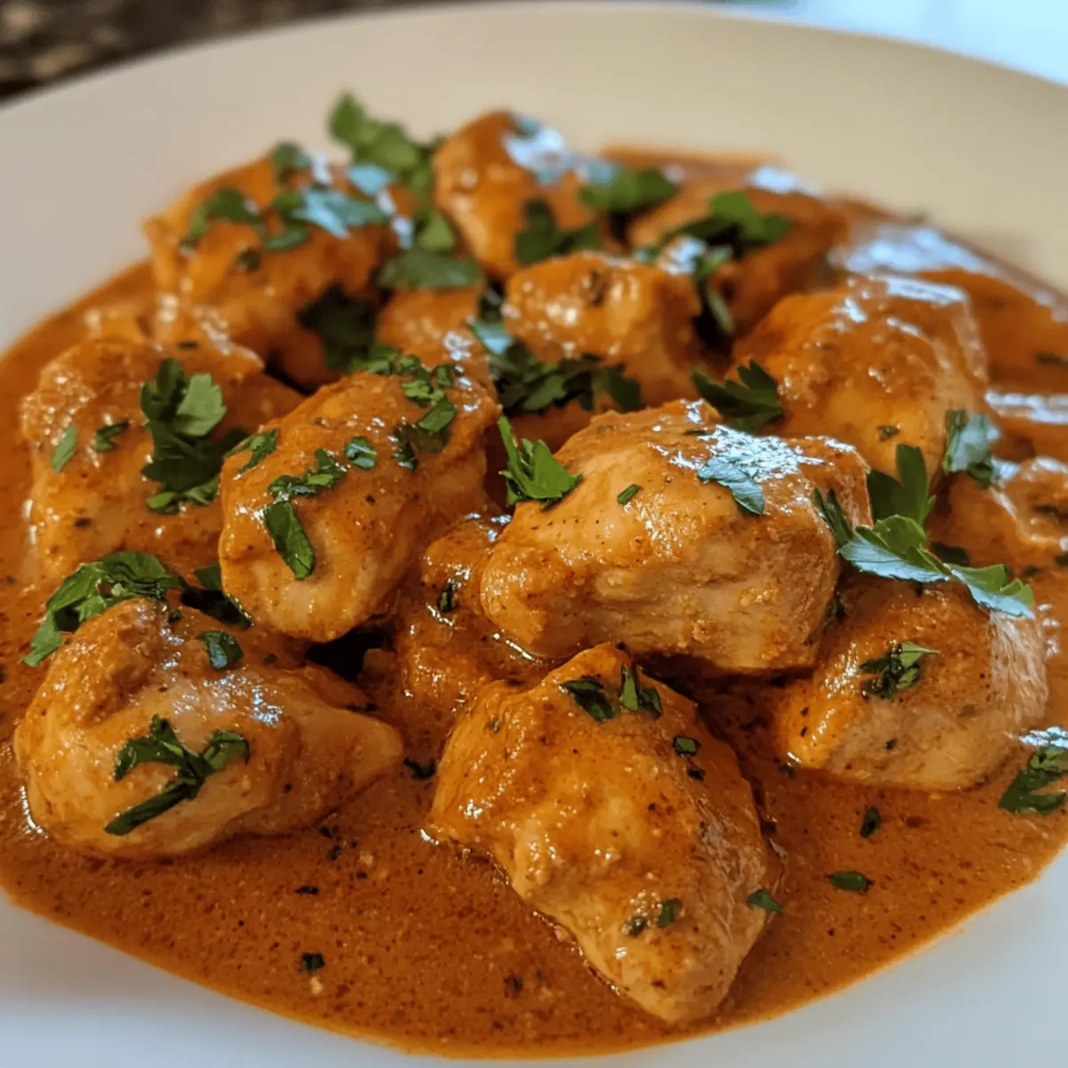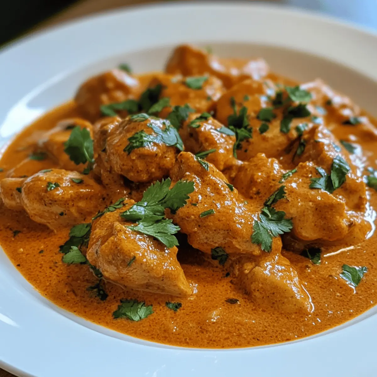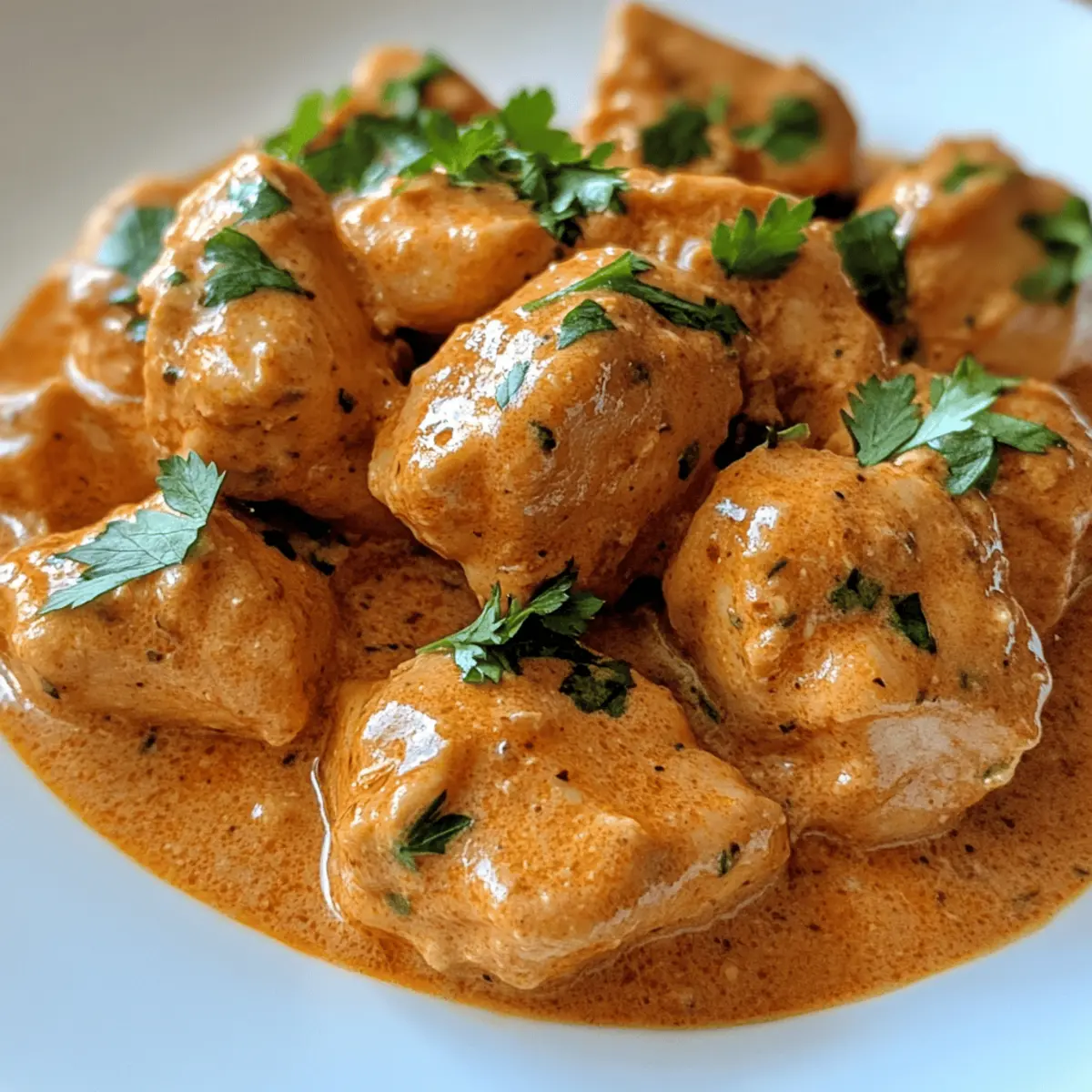 As the aroma of spices wafts through my kitchen, I can’t help but feel a surge of excitement. Cooking is my joyful escape, and there’s nothing quite like creating a comforting dish like Quick & Easy Homemade Butter Chicken. This recipe turns an ordinary weeknight into an extraordinary feast, wrapping tender chicken in a lush, creamy tomato sauce. The beauty of this dish lies not just in its delightful flavors but also in its simplicity—perfect for time-crunched evenings or those moments when you want to impress without the fuss. Plus, it’s a one-pot wonder, making cleanup a breeze! Pair it with warm naan or fluffy basmati rice, and you’ll have everyone at the table asking for seconds. Ready to indulge in this creamy delight? Let’s dive in! Why is Homemade Butter Chicken a Must-Try? Simplicity: This recipe features a straightforward approach, requiring minimal prep and cooking time. Rich, Creamy Sauce: The luscious tomato-cream blend is bursting with flavor, ensuring every bite is a delight. One-Pot Wonder: All the magic happens in one pan, making it not only delicious but also easy to clean up. Versatile Pairing: Serve with naan bread or basmati rice, creating a complete meal that’s sure to please the whole family. Impressive flavor in no time: Perfect for weeknight dinners or gatherings, everyone will think you’ve spent hours in the kitchen! Homemade Butter Chicken Ingredients • Dive into the vibrant flavors of homemade butter chicken with this simple ingredient list! For the Marinade Chicken Thighs – A juicy protein that stays tender; chicken breasts can be a lean substitute but watch for overcooking. Salt – Elevates flavor; kosher salt is preferable for accurate seasoning control. Greek Yogurt – Adds creaminess and tenderizes the chicken; can swap with plant-based yogurt for a dairy-free option. Paprika – Brings a touch of mild heat and beautiful color to the dish. Curry Powder – The key spice that delivers the signature flavor of homemade butter chicken. Garlic Powder – Infuses a savory depth; fresh garlic can replace it (1 clove = 1/8 tsp of garlic powder). For the Sauce Butter – Creates richness while sautéing; combine with oil for cooking without losing flavor. Onion – The sweet base of the sauce, sautéed to perfection for depth. Tomato Sauce – Provides acidity and vibrant color; canned crushed tomatoes work just as well. Sugar – Balances any acidity from the tomatoes; consider brown sugar for added flavor. Black Pepper – Introduces a gentle warmth; fresh-ground offers the best taste. Heavy Cream – Gives the sauce its luxurious creamy texture; coconut cream works for a dairy-free version. Garam Masala – An aromatic spice blend that deepens flavor complexity; mix cumin, coriander, cinnamon, and cloves if needed. Parsley or Cilantro – Fresh herbs that lend color and brightness when garnishing the dish. Optional Cayenne Pepper – Perfect for those who crave heat; adjust according to your spice tolerance. This ingredient list is perfect for whipping up a comforting homemade butter chicken that your family will love! Step‑by‑Step Instructions for Homemade Butter Chicken Step 1: Marinate Chicken In a mixing bowl, combine chicken thighs with salt, garlic powder, paprika, curry powder, and Greek yogurt. Toss until the chicken is fully coated in the marinade. Let it rest for at least 15 minutes to enhance flavor and tenderness, allowing the spices to infuse while you prepare the other ingredients. Step 2: Sear Chicken Heat a skillet over medium-high heat and add half of the butter along with a drizzle of oil to prevent sticking. Once hot, add the marinated chicken in a single layer, cooking for about 4-5 minutes on each side until golden brown. Remove the chicken from the skillet and set aside, leaving the delicious browned bits behind for the sauce. Step 3: Build Sauce In the same skillet, add a little more butter if needed, then sauté chopped onion until it turns translucent and fragrant, about 3-4 minutes. Stir in minced garlic and cook for an additional minute before adding tomato sauce, sugar, salt, black pepper, curry powder, and optional cayenne pepper. Bring the mixture to a gentle simmer. Step 4: Make Creamy Sauce Lower the heat and gradually stir in the heavy cream, ensuring it blends smoothly with the sauce. Let it simmer for 5-7 minutes, stirring occasionally, until the sauce thickens and becomes creamy, clinging beautifully to the back of a spoon. The vibrant color and rich aroma indicate your homemade butter chicken sauce is nearly ready. Step 5: Combine Return the seared chicken thighs along with any juices back into the skillet. Sprinkle in the garam masala and gently stir to integrate all flavors, letting the chicken simmer for another 8-10 minutes until fully cooked and tender. Taste and adjust the seasoning if necessary, ensuring each bite is bursting with flavor. Step 6: Serve Once cooked, remove from heat and garnish your homemade butter chicken with freshly chopped parsley or cilantro for a touch of color. Serve it warm alongside fluffy basmati rice or warm naan, allowing everyone to enjoy dipping and savoring the luscious creamy sauce that envelops the chicken. How to Store and Freeze Homemade Butter Chicken Fridge: Store leftover homemade butter chicken in an airtight container for up to 3 days. Make sure it has cooled down before sealing to prevent condensation. Freezer: For longer storage, freeze the butter chicken in a freezer-friendly container for up to 2 months. Leave some space at the top to allow for expansion. Reheating: When ready to enjoy, thaw overnight in the fridge. Reheat gently in a skillet over low heat, adding a splash of cream or water to maintain its creamy texture. Portioning: For convenience, consider freezing in single-serving portions. This makes it easy to grab a quick meal without needing to defrost the entire batch! Make Ahead Options These Quick & Easy Homemade Butter Chicken preparati