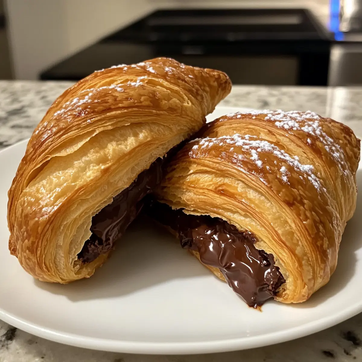 As the sun peeks through the kitchen window, the scent of butter and chocolate dances through the air, instantly whisking me away to a cozy Parisian bakery. There’s something magical about crafting homemade chocolate croissants, or pain au chocolat, that transforms an ordinary day into a delightful culinary adventure. These flaky, buttery pastries are not just a treat; they provide a fulfilling hands-on experience that rewards patience and skill. Not only are they a true crowd-pleaser, but they also elevate any breakfast or snack time with a touch of elegance and sweet indulgence. Are you ready to roll up your sleeves and create something that will impress not just your taste buds, but also your loved ones? Let’s dive into the art of making these delectable delights! Why Are Homemade Chocolate Croissants Irresistible? Flaky Layers: Each bite unravels tender, flaky layers that elevate your pastry experience to new heights. Decadent Chocolate: The rich, melted chocolate filling adds an indulgent twist that is simply irresistible. Bake Ahead: Make a batch and freeze unbaked croissants for a quick, gourmet breakfast option—they’re sure to impress! Versatile Creations: Try different fillings like almond paste or fruit preserves to keep things exciting and cater to diverse tastes. Elegant Treat: Perfect for special occasions or just a cozy morning at home, these croissants infuse a touch of sophistication into any meal. Transform your kitchen into a Parisian bakery and delight in these homemade chocolate croissants. Need more inspiration? Check out our Bakery-Level Homemade Chocolate Croissants for expert tips! Homemade Chocolate Croissants Ingredients For the Dough All-Purpose Flour – Provides structure to the croissant; use unbleached for best results. Granulated Sugar – Adds subtle sweetness; adjust based on personal taste preferences. Salt – Enhances flavor and strengthens the dough; do not omit for the best taste. Instant Yeast – Acts as a leavening agent for an airy texture; instant yeast is quick and convenient. Cold Whole Milk – Hydrates the dough and activates the yeast; ensure it’s cold to maintain the dough’s integrity. Unsalted Butter – Essential for buttery flavor and layering; high-quality butter yields the best results. For the Butter Layer All-Purpose Flour – Bonds with butter to create a spreadable paste essential for lamination; helps maintain the layers. For the Filling Chocolate Batons/Semi-Sweet Chocolate – Main filling; good quality chocolate makes a significant difference in flavor. For the Egg Wash Egg – Provides a shiny, golden finish for the croissants; enhances appearance. Milk – Combined with the egg to enhance glossiness in the egg wash; ensures a rich color when baked. For Garnish Confectioners’ Sugar – Optional for dusting before serving; adds a lovely decorative touch to your pastries. Step‑by‑Step Instructions for Homemade Chocolate Croissants Step 1: Prepare the Dough In a stand mixer, combine all-purpose flour, granulated sugar, salt, and instant yeast. Gradually mix in cold whole milk until a soft dough forms. Knead the mixture on medium speed for about 5 minutes, or until the dough is smooth and elastic. It should look slightly glossy and be soft to the touch. Step 2: Make the Butter Layer In a separate bowl, combine softened unsalted butter and a bit of all-purpose flour until you achieve a smooth paste. Shape the mixture into a rectangle, about ¼ inch thick, and wrap it in plastic wrap. Chill the butter layer in the refrigerator for at least 30 minutes until firm, which is essential for creating flaky layers in your homemade chocolate croissants. Step 3: Encase the Butter After chilling, roll out your dough on a floured surface to a large rectangle, approximately 16 inches by 10 inches. Place the chilled butter layer in the center of the dough. Fold the edges of the dough over the butter, sealing them tightly. This creates a secure pocket for the butter, setting the stage for the flaky layers of your pastries. Step 4: Roll and Fold Gently roll the dough into a larger rectangle about 24 inches long, ensuring the butter remains encased. Perform a single fold of the dough into thirds, like a letter, and wrap it in plastic. Refrigerate for another 30 minutes. This rolling and folding technique is crucial for developing the flaky texture in your homemade chocolate croissants. Step 5: Perform Additional Turns After chilling, repeat the rolling and folding process two additional times—roll out the dough, fold, and chill between each turn for about 30 minutes. Each turn contributes to the layers and airiness unique to homemade chocolate croissants. Ensure the dough stays cold for best results. Step 6: Shape the Croissants Once your final fold is complete, roll out the dough again to about ¼ inch thick and cut it into triangles, approximately 4 inches wide at the base. Place a piece of chocolate baton on the wide edge of each triangle, then roll them tightly toward the tip. Curve the ends towards each other to form a crescent shape, ensuring the tips are tucked underneath. Step 7: Proof the Croissants Arrange the shaped croissants on a parchment-lined baking sheet, leaving space between them. Let them proof at room temperature for about 1 hour or until they have doubled in size. For best results, refrigerate them for an additional hour to enhance the texture of your homemade chocolate croissants. Step 8: Preheat the Oven Preheat your oven to 400°F (204°C) while the croissants are proofing. Prepare an egg wash by whisking together one egg with a splash of milk until smooth. Brush the mixture gently over each croissant to give them a golden, glossy finish as they bake. Step 9: Bake the Croissants Bake the croissants in the preheated oven for 20 minutes, rotating the pan halfway through to ensure even browning. The pastries should turn a beautiful golden brown and puff up impressively. Remove them from the oven once they 