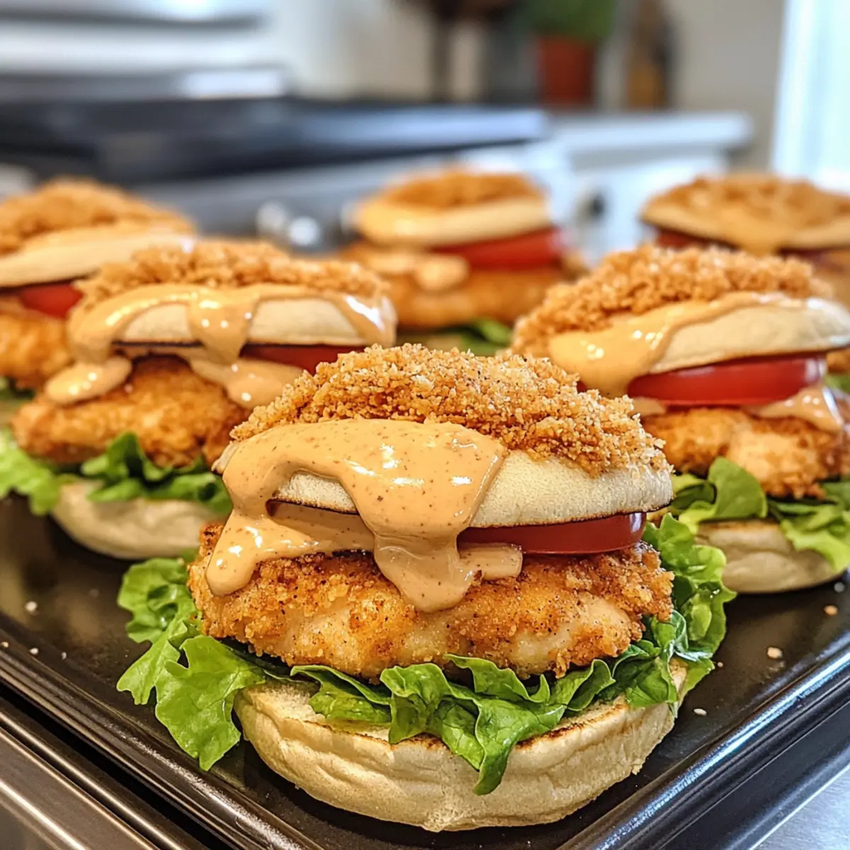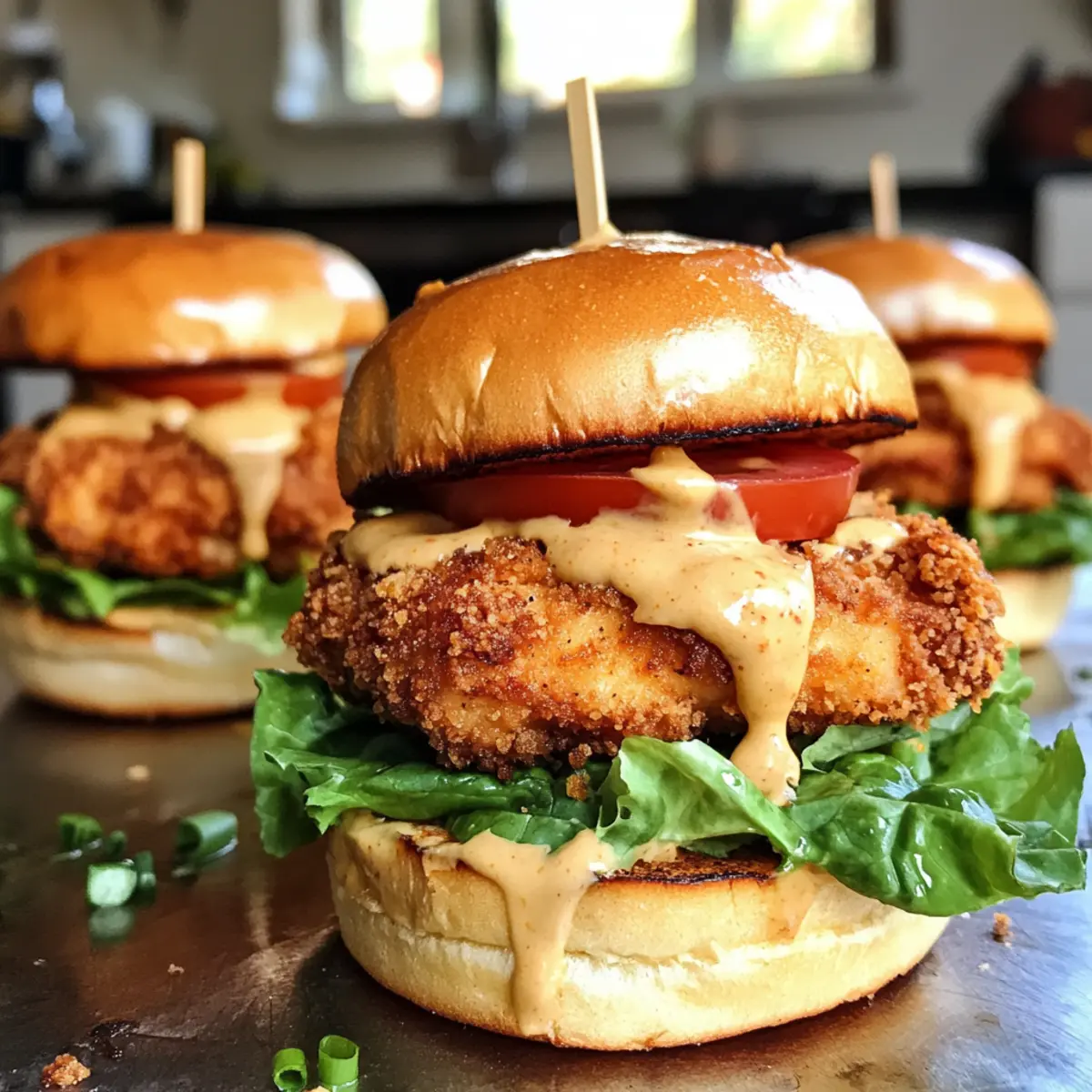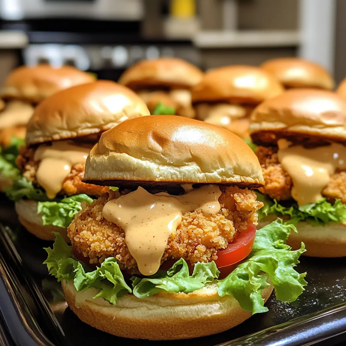 As I flipped through my recipe book, a craving for something quick yet indulgent struck me. Enter these Honey Mustard Chicken Sliders, a delightfully easy meal that combines juicy chicken with the perfect balance of sweet and tangy honey mustard sauce, all tucked into soft slider buns. Not only are they ready in a flash, making them ideal for busy weeknights, but they’re also customizable enough to impress at any gathering, from game nights to casual parties. Whether you’re a seasoned home chef or just starting your cooking journey, these sliders let you flex your culinary creativity. What delicious twist will you add when you make them? Why Are These Sliders So Irresistible? Juicy, Flavorful Chicken: You’ll love how the chicken stays tender while being coated in a sweet and tangy honey mustard sauce, making each bite a flavor explosion. Quick & Easy: With straightforward steps, this recipe is perfect for busy weeknights or last-minute gatherings. Customizable Options: Whether you prefer spiciness with jalapeños or creaminess with avocado, you can easily adapt these sliders to suit your taste. Crowd-Pleasing Treat: Whether it’s game day or a family get-together, these sliders will vanish fast and leave everyone asking for more! Perfect Pairings: Enjoy them alongside crispy sweet potato fries or refreshing coleslaw for a well-rounded meal that satisfies. Elevate your slider experience even further by drizzling some hot honey like in Hot Honey Chicken or combining them with a zingy dip like Buffalo Chicken Taquitos for a fun twist! Honey Mustard Chicken Sliders Ingredients For the Chicken Boneless, Skinless Chicken Breasts – Main protein source, providing moisture and tenderness; thighs can enhance flavor. All-Purpose Flour – Coating for the chicken, making it crispy; substitute with gluten-free flour if needed. Paprika – Adds a mild pepper flavor and color; try smoked paprika for added depth. Garlic Powder – Enhances savory notes; fresh garlic is a stronger alternative. Onion Powder – Offers sweetness and depth; fresh onions can be swapped in. Cayenne Pepper (optional) – Infuses heat for those who like it spicy; omit for a milder version. Salt & Black Pepper – Crucial for seasoning; adjust to your taste. Eggs (beaten) – Binds the breading to the chicken; use a flax egg for vegan adaptations. Panko Breadcrumbs – Creates a delightful crunchy layer; substitute with regular breadcrumbs if desired. Vegetable Oil – For frying, ensuring a crisp texture; canola or peanut oil are good substitutes. For the Honey Mustard Sauce Mayonnaise – Base for the sauce, adding creaminess; Greek yogurt is a healthier swap. Dijon Mustard – Brings tanginess to the sauce; yellow mustard can be a milder option. Honey – Sweetens and balances the mustard; maple syrup offers a vegan alternative. Apple Cider Vinegar – Adds tanginess to the sauce; white vinegar works well too. For Serving Slider Buns – Perfect vehicles for your creation; consider Hawaiian rolls for sweetness or pretzel buns for a savory twist. Cheddar Cheese (optional) – Melts beautifully; try Swiss or pepper jack for different flavors. Optional Toppings – Add lettuce, sliced tomatoes, or pickle chips for freshness and crunch. Craft these Honey Mustard Chicken Sliders to suit your taste, and watch them disappear at your next gathering! Step‑by‑Step Instructions for Honey Mustard Chicken Sliders Step 1: Prepare the Chicken Begin by cutting the boneless, skinless chicken breasts into slider-sized pieces, about 2-3 inches square. This ensures even cooking and perfect portion sizes for your Honey Mustard Chicken Sliders. Set aside while you prepare the breading station. Step 2: Set Up the Breading Station In three shallow dishes, set up your breading station: one filled with all-purpose flour mixed with paprika, garlic powder, onion powder, cayenne pepper, salt, and black pepper; the second with beaten eggs; and the third with panko breadcrumbs. This will create a crispy exterior that complements the juicy chicken. Step 3: Coat the Chicken Take each piece of chicken and dredge it in the seasoned flour, ensuring it’s evenly coated. Next, dip it into the beaten eggs, allowing any excess to drip off, and finally roll it in the panko breadcrumbs for a crunchy finish. This coating adds texture to your sliders. Step 4: Rest the Breaded Chicken Once all chicken pieces are coated, let them rest for 10-15 minutes on a wire rack. This resting time allows the breading to adhere better and results in crispier Honey Mustard Chicken Sliders when cooked. Step 5: Heat the Oil In a large skillet, heat vegetable oil over medium-high heat. You’ll know it’s ready when a drop of water sizzles upon contact or when you drop in a few breadcrumbs, and they bubble up. Aim for an oil temperature around 350°F (175°C) for best frying results. Step 6: Fry the Chicken Carefully add the breaded chicken pieces to the hot oil, ensuring they’re not overcrowded. Fry for about 3-4 minutes per side until golden brown and crisp, with an internal temperature of 165°F (74°C). Use a meat thermometer for accuracy to guarantee moist and well-cooked chicken. Step 7: Drain Excess Oil Once the chicken is perfectly golden, transfer it to a wire rack set over a baking sheet to drain any excess oil. This keeps your Honey Mustard Chicken Sliders from becoming soggy, maintaining that delectable crunch. Step 8: Make the Honey Mustard Sauce In a bowl, whisk together mayonnaise, Dijon mustard, honey, apple cider vinegar, and garlic powder until smooth. Adjust the ingredients to taste; a perfect balance of sweet and tangy will elevate your Honey Mustard Chicken Sliders to the next level. Step 9: Toast the Slider Buns Lightly toast the slider buns on a skillet or in a toaster. This step adds a lovely crunch and warmth, making them a perfect vessel for your sliders. Removing the moisture from the buns also helps them hold up against the juicy chicken and s