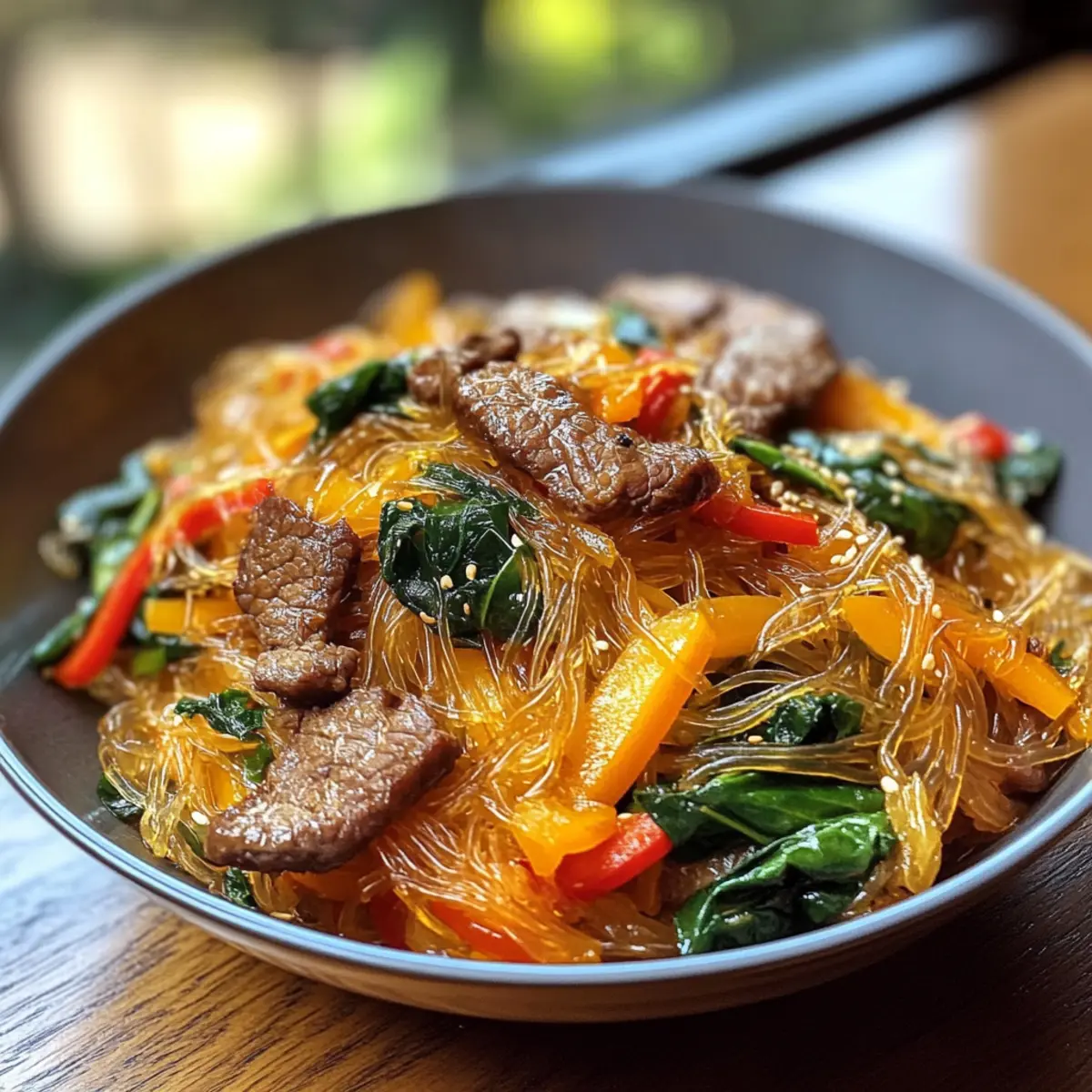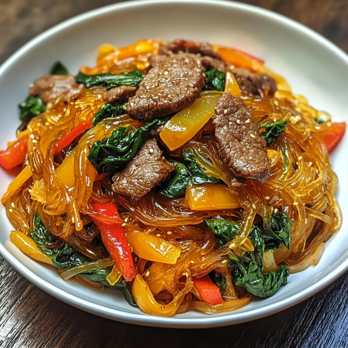 As I sift through my pantry, I stumble upon a colorful array of vegetables and chewy sweet potato noodles, sparking inspiration for tonight’s dinner. Enter Korean Japchae—my go-to dish that’s as comforting as it is vibrant. This beloved stir-fry is an elegant blend of tender beef, fresh veggies, and those delightful glass noodles, all bathed in a rich sesame-soy sauce that feels like a warm embrace. Not only is this recipe a mouthwatering crowd-pleaser, but it’s also incredibly versatile, inviting you to add your favorite proteins or whatever seasonal vegetables you have on hand. Plus, it’s a gluten-free option if you choose the right soy sauce! Curious how to bring this traditional Korean delight to your kitchen? Let’s dive into the details and make some magic happen! Why is Korean Japchae so beloved? Comforting, yet Exciting: This dish perfectly balances familiar flavors with intriguing textures. Versatile Ingredients: Tailor it with your choice of beef, chicken, or tofu, and toss in seasonal veggies for a fresh twist. Quick to Prepare: In less than 30 minutes, you can create a stunning meal that’s sure to impress. Nutrient-Rich: With sweet potato noodles and colorful veggies, it’s not just tasty but also nutritious. Perfect for Sharing: Whether it’s a cozy family dinner or a festive gathering, Korean Japchae is a true crowd-pleaser that brings everyone together. Try serving it alongside a delicious Korean Pork Belly for an unforgettable feast! Korean Japchae Ingredients For the Noodles • Sweet Potato Noodles – The heart of the dish, providing a chewy texture that absorbs the flavors beautifully. Substitution Note: Can use gluten-free noodles for a gluten-sensitive option. For the Protein • Beef (or Chicken/Tofu) – Adds richness and heartiness to the meal. Substitution Note: Choose any protein based on your preference or dietary needs. For the Vegetables • Carrots – Adds vibrant color and a slight crunch. • Bell Peppers – Sweetens the dish while contributing to the beautiful medley of colors. • Spinach – Provides essential nutrients and a lovely green hue. Substitution Note: Use any favorite vegetables to make it your own! For the Sauces • Soy Sauce – The key flavor booster, infusing the dish with umami. Substitution Note: Use gluten-free soy sauce for a gluten-free version. • Sesame Oil – Elevates the aroma and adds a nutty flavor. Substitution Note: Can replace with a neutral oil if necessary. For Garnish • Green Onions – Offers freshness and a pop of color on top. Substitution Note: Chives can work as a lovely alternative. Step‑by‑Step Instructions for Korean Japchae Step 1: Prep Noodles Begin by soaking the sweet potato noodles in warm water for about 30 minutes. This softens them, allowing for that ideal chewy texture. You’ll know they’re ready when they become pliable and translucent. After soaking, drain the noodles in a colander and set them aside to ensure they don’t become soggy during cooking. Step 2: Cook Protein In a large skillet or wok, heat a tablespoon of oil over medium heat. Add your sliced beef (or chicken/tofu) to the skillet and cook for about 5–7 minutes until browned and cooked through. Stir occasionally to prevent sticking. Once done, remove the protein from the skillet and set it aside, keeping it warm for the next step. Step 3: Stir-fry Vegetables In the same skillet, add an additional tablespoon of oil if needed. Toss in your carrots, bell peppers, and spinach, then stir-fry the vegetables for about 4–5 minutes until they are tender yet vibrant. The colors should pop, showcasing the freshness of your veggies. This step enhances the flavors and brings that delightful crunch to your Korean Japchae. Step 4: Combine Ingredients Next, reintroduce the cooked protein and the drained sweet potato noodles back into the skillet with the vegetables. Using tongs or a spatula, gently toss everything together to combine. This helps the noodles absorb the delicious flavors from the vegetables and protein. Stir for about 2–3 minutes to ensure everything is evenly mixed. Step 5: Season Drizzle the mixture with soy sauce and sesame oil, allowing it to infuse the ingredients with savory and nutty notes. Stir-fry for an additional 5 minutes, making sure everything is well-coated and heated through. The noodles should start to shimmer, indicating they are thoroughly mixed and ready to serve. Step 6: Garnish and Serve Once everything is combined and heated through, remove the skillet from heat. Transfer the Korean Japchae to a serving platter and garnish with chopped green onions for a fresh finish. Serve hot as a delightful main dish or a crowd-pleasing side at your next gathering. Enjoy the colorful medley of flavors and textures! Variations & Substitutions for Korean Japchae Unlock new flavors and textures by customizing your Korean Japchae to suit your taste and pantry! Protein Swap: Choose beef, chicken, or tofu to match your dietary needs, ensuring each version remains hearty and satisfying. Spicy Kick: Add gochujang or fresh chili peppers for a fiery boost, awakening your senses with each bite. Spice lovers will really appreciate this twist! Vegetable Medley: Incorporate seasonal or favorite veggies like mushrooms, zucchini, or snap peas for freshness and variety. Every color adds more nutrients to your dish! Gluten-Free Option: Use gluten-free soy sauce to make this delicious dish suitable for gluten-sensitive friends and family. Enjoy the same incredible taste with ease! Nutty Flavor: Swap sesame oil for peanut oil if you’re looking for a different nutty taste. It complements the dish beautifully while offering a delightful twist. Extra Crunch: Top your Japchae with toasted sesame seeds or crushed peanuts for added texture and depth in flavor. This makes every bite a bit more exciting! Umami Boost: Try adding a splash of mushroom soy sauce for an enhanced umami flavor that deepens the richness of your Ja
