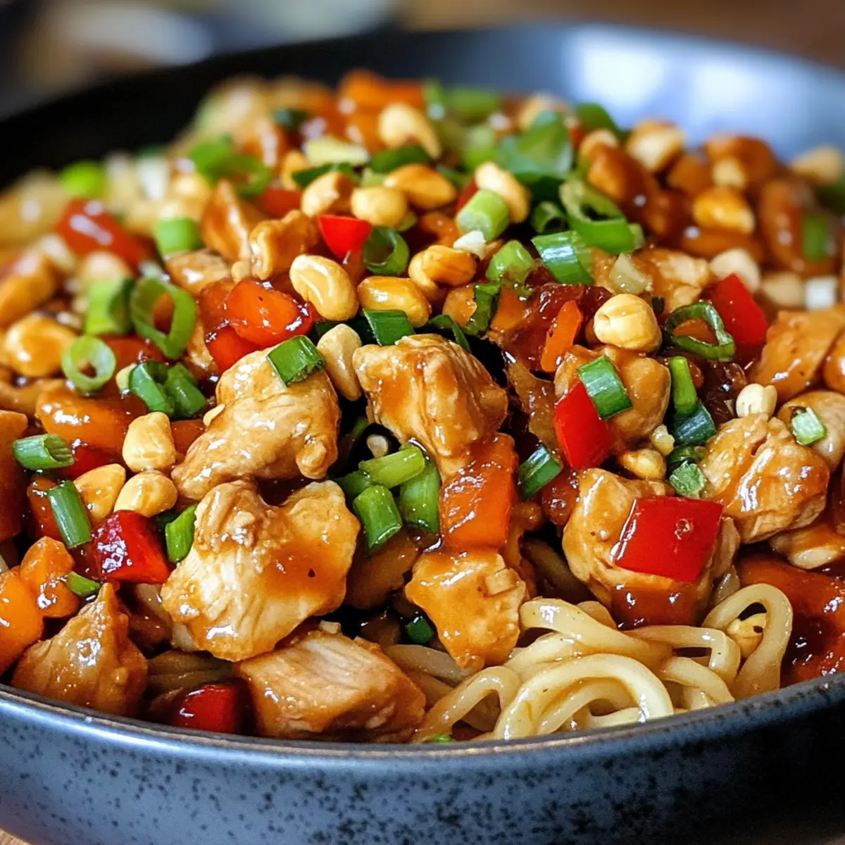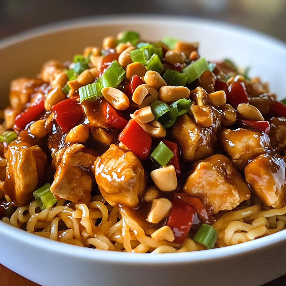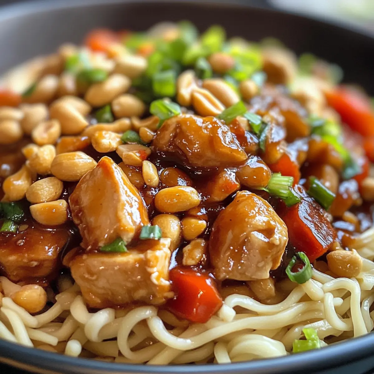 In the heart of every kitchen lies the magic of transforming simple ingredients into something extraordinary. That’s exactly what I felt as I whipped up this Kung Pao Chicken Noodles recipe, a vibrant dish bursting with tender chicken, crunchy peanuts, and slurp-worthy noodles cloaked in a sweet and spicy sauce. Not only does this delightful creation come together in just 40 minutes, making it a perfect escape from the fast-paced weeknight rush, but it also invites customization—swap out chicken for tofu or pile it high with colorful veggies to suit your cravings. This dish is not just about nourishing the body; it’s about creating a cozy meal that brings the family together. Curious about how easy it is to whip this up in your own kitchen? Let’s dive in! Why Choose Kung Pao Chicken Noodles? Quick and Easy: This recipe comes together in just 40 minutes, making it an ideal choice for busy weeknights. Flavor Explosion: The combination of sweet, spicy, and umami flavors will have your taste buds dancing with delight. Customizable: Easily swap chicken for tofu or load up on colorful vegetables to match your dietary preferences. Crowd-Pleaser: Perfect for family dinners, this dish is sure to impress everyone around the table, just like our delicious Buffalo Chicken Taquitos. Noodle Varieties: Feel free to experiment with different noodle types, like udon or rice noodles, for unique textures that suit your style. Healthy Ingredients: Loaded with nutritious vegetables and lean protein, it’s a satisfying meal that doesn’t compromise on health. Kung Pao Chicken Noodles Ingredients • Experience a delightful medley of flavors with these essential ingredients! For the Chicken Chicken Thigh – Provides richness and tenderness; boneless and skin-on ensures a moist texture. Cornstarch – Perfect for marinating chicken and thickening the sauce; no substitutes necessary. For the Noodles Hand Cut Noodles – The main carbohydrate that adds chewiness; feel free to swap with spaghetti or rice noodles. For the Sauce Soy Sauce – Infuses umami flavor; consider low-sodium for a healthier option. Oyster Sauce – Contributes depth and sweetness; vegetarian oyster sauce works as a substitute if needed. Black Vinegar – Enhances the sauce with complexity; rice vinegar can replace it if unavailable. Dark Soy Sauce – Adds color and a richer flavor; reduce the amount if using regular soy sauce. Sugar – Balances the flavors perfectly; honey or sugar alternatives can also be used. Water – Adjust for desired sauce consistency; a thicker sauce packs more flavor! For the Aromatics Ginger (Julienne) – Adds pungency and warmth; fresh ginger is highly recommended. Garlic (Minced) – Elevates aroma; garlic powder can substitute in a pinch. Green Onion (Chopped) – Offers freshness and crunch; both white and green parts are great to use. For the Spiciness Sichuan Peppercorn – Provides a unique numbing spice; omit for less heat or use black pepper as a substitute. Dry Red Chili – Introduces heat and beautiful color; adjust quantity based on your spice preference. Black Pepper – Adds an extra layer of heat; regular black pepper works wonderfully. For the Crunch Crushed Roasted Peanuts – Perfect as a topping for extra crunchiness and nuttiness; swap with other nuts or seeds if desired. Step‑by‑Step Instructions for Kung Pao Chicken Noodles Step 1: Marinate Chicken In a mixing bowl, combine bite-sized pieces of chicken thigh with soy sauce, oyster sauce, black pepper, and cornstarch. Toss the chicken well until evenly coated, then let it marinate for about 10 minutes. This step infuses flavor and ensures a tender texture in your Kung Pao Chicken Noodles. Step 2: Prepare Sauce While the chicken marinates, prepare the sauce by whisking together soy sauce, black vinegar, dark soy sauce, sugar, water, and cornstarch in a bowl. Aim for a smooth consistency with no lumps, which will give your dish a rich coating later. Set this aside, ready to elevate the flavor of your noodles. Step 3: Cook Noodles Bring a pot of salted water to a boil and add your hand cut noodles. Cook for about 4–5 minutes, or until they are al dente. Once cooked, drain the noodles thoroughly to prevent excess water from watering down your Kung Pao Chicken Noodles, then toss them with a teaspoon of oil to keep them separate. Step 4: Sauté Chicken Heat 2 tablespoons of oil in a large skillet or wok over medium-high heat. Once the oil is hot, carefully add the marinated chicken, spreading it out in a single layer. Sauté for about 8–9 minutes, stirring occasionally until the chicken is nicely browned and cooked through, looking crispy on the edges. Step 5: Add Aromatics Once the chicken is cooked, add julienned ginger, Sichuan peppercorn, dry red chili, minced garlic, and the white parts of the chopped green onion to the skillet. Stir-fry these aromatics for 2–3 minutes until fragrant. The vibrant flavors will start to blend, enhancing the depth of your Kung Pao Chicken Noodles. Step 6: Combine Ingredients At this point, add the cooked noodles to the skillet with the sautéed chicken and pour in the prepared sauce. Toss everything together over high heat for 2–3 minutes, allowing the noodles to absorb the sauce. Look for a glossy finish where every noodle is coated and well flavored, showcasing that Kung Pao essence. Step 7: Serve Remove the skillet from heat and transfer the Kung Pao Chicken Noodles to serving plates. Finish by generously topping with crushed roasted peanuts and the green parts of the chopped green onion. This final touch provides a delightful crunch that invites everyone to dig in immediately, savoring the blend of flavors. Kung Pao Chicken Noodles Variations Feel free to let your culinary creativity shine and make these delightful adjustments to the Kung Pao Chicken Noodles recipe! Tofu Substitute: Swap out chicken for firm tofu, offering a plant-based protein that soaks up the flavors beautifully. 