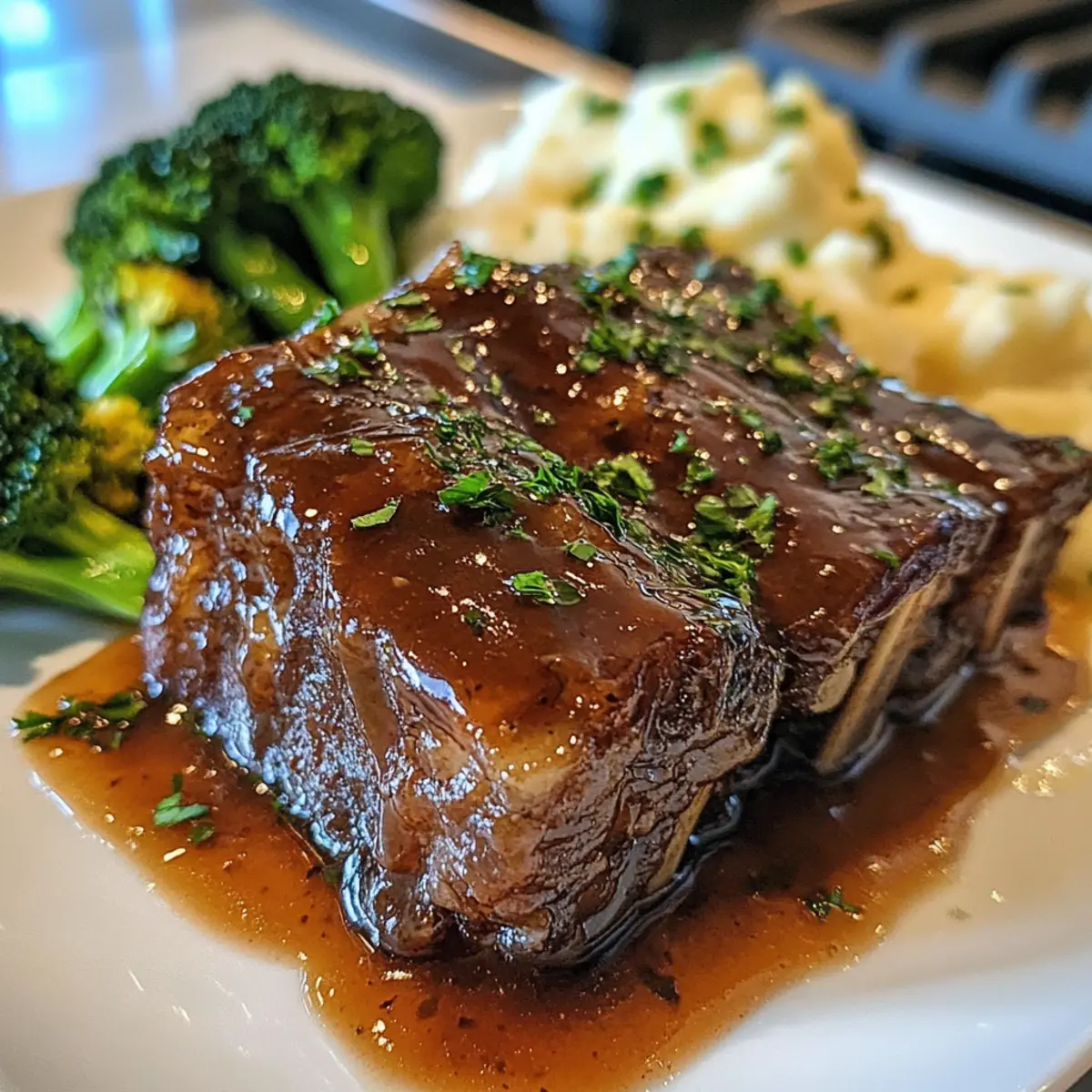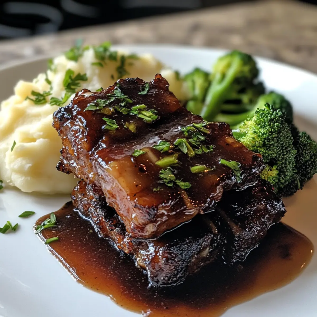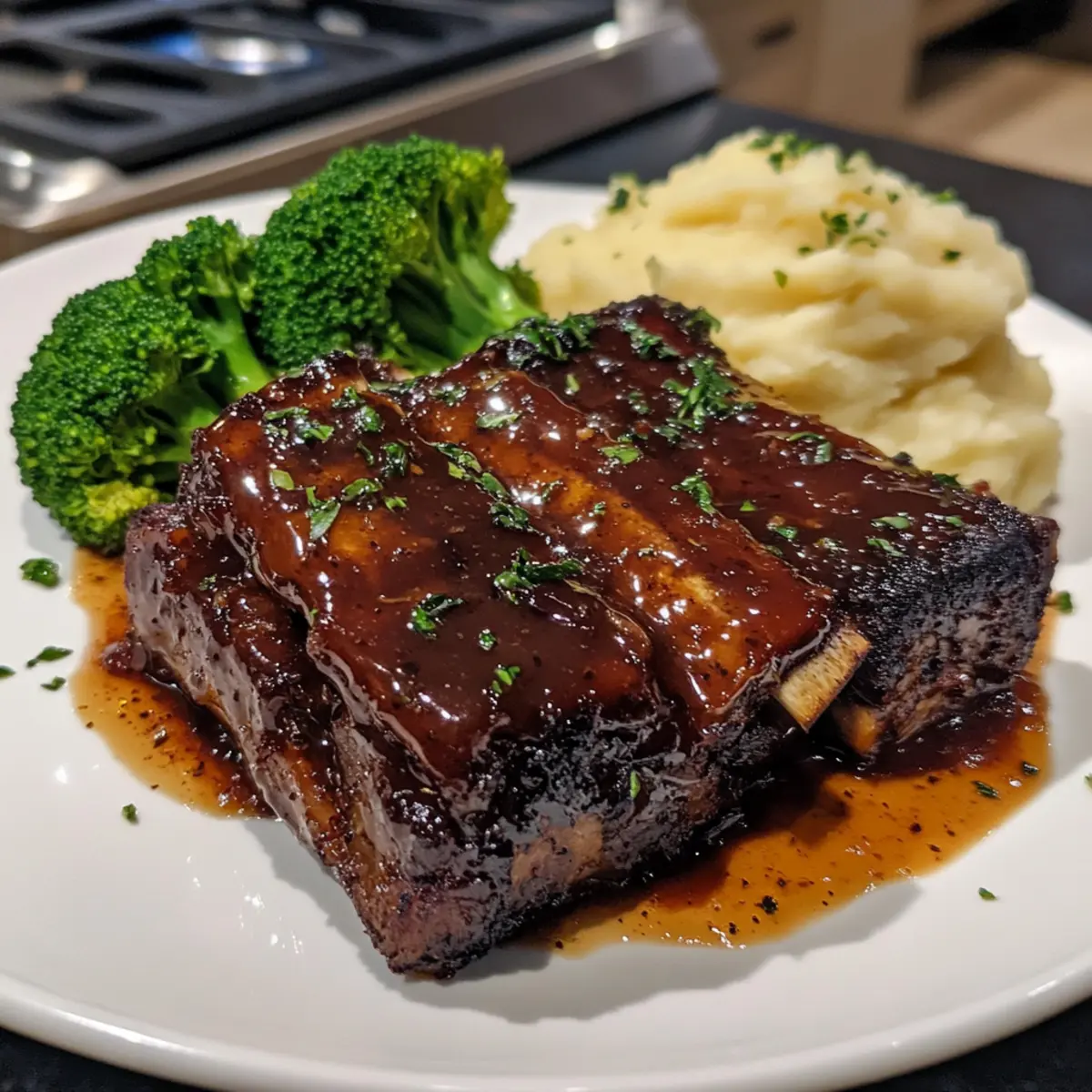 As the rich aroma of maple and bourbon wafts through the kitchen, you’ll understand why these Maple-Bourbon Glazed Short Ribs are my absolute go-to for cozy gatherings. Imagine tender beef slowly braised to perfection, allowing those sweet and savory notes to meld into a sauce that leaves everyone reaching for seconds. With just 15 minutes of hands-on prep time, this gluten-free dish is perfect for busy weeknights and a guaranteed crowd-pleaser, filling your home with warmth and mouthwatering scents. Plus, the cleanup is a breeze, letting you focus on what truly matters—building memories around the dinner table. Ready to savor the comforting embrace of these melt-in-your-mouth ribs? Let’s dive in! Why are these ribs a must-try? Irresistible Flavor: The combination of rich bourbon and sweet maple syrup creates a delightfully unique glaze that enhances the already tender beef, ensuring every bite bursts with flavor. Minimal Effort: With only 15 minutes of prep, you can enjoy gourmet-level short ribs without spending all night in the kitchen, perfect for your busy lifestyle! Comforting Dish: These ribs are the epitome of comfort food, ideal for family gatherings or cozy evenings at home, making them a go-to recipe for any occasion. Versatility: Feel free to swap beef short ribs for pork and adjust cooking times to fit your taste, giving you room to experiment while still delivering a satisfying dish. Crowd-Pleasing Appeal: Whether you’re serving a large group or enjoying leftovers, these glazed ribs are sure to impress, leaving everyone asking for the recipe! Maple-Bourbon Glazed Short Ribs Ingredients For the Ribs • Beef Short Ribs – The main component, providing rich, succulent meat; substitute with pork ribs if desired. • Sea Salt – Enhances the natural flavors of the beef; don’t skimp on this for maximum taste. • Black Pepper – Adds warmth and complexity to the overall flavor profile. • Olive Oil – Used for searing the ribs to develop a savory crust; vegetable oil is a viable alternative. For the Sauce • Yellow Onion – Provides sweetness and depth; ensure a fine, even dice for uniform cooking. • Garlic – Infuses the dish with aromatic flavors; finely minced for maximum flavor release. • Beef Stock – Adds moisture and richness; consider low-sodium beef stock for less salt. • Bourbon Whiskey – Contributes complexity and depth; can be replaced with apple juice or vinegar for a non-alcoholic version. • Pure Maple Syrup – Brings sweetness and balances savory elements; use real maple syrup for the best results. • Tamari Sauce – Adds umami flavor; a gluten-free option when compared to soy sauce. • Apple Cider Vinegar – Introduces acidity to balance flavors; white wine vinegar is a suitable substitute. • Whole Grain Mustard – Adds tangy sophistication; if unavailable, you can use Dijon mustard instead. • Crushed Red Pepper Flakes – Optional for those who crave a spicy kick in their dish. These ingredient elements come together beautifully to make Maple-Bourbon Glazed Short Ribs, ensuring a melt-in-your-mouth experience that’s bound to be a family favorite! Step‑by‑Step Instructions for Maple-Bourbon Glazed Short Ribs Step 1: Preheat Your Oven Begin by preheating your oven to 300°F (150°C). This low temperature is perfect for slowly braising the ribs, allowing the flavors to meld beautifully. While the oven warms, gather your ingredients and prepare for some delightful cooking. Step 2: Season the Ribs Generously season the beef short ribs with sea salt and black pepper on all sides. This initial seasoning step will enhance the natural richness of the meat. Make sure to coat each rib evenly to lock in flavor as they cook. Step 3: Sear the Ribs In a heavy-bottomed pot or Dutch oven, heat 2 tablespoons of olive oil over medium-high heat. Once hot, add the seasoned short ribs and sear them for about 4 minutes on each side, or until they achieve a golden-brown crust. Searing is crucial as it adds depth of flavor while helping to keep the ribs juicy. Step 4: Sauté the Aromatics Remove the seared ribs from the pot and set them aside on a plate. In the same pot, add the diced yellow onion and sauté for 5 minutes until it becomes translucent and slightly caramelized. Add the minced garlic and sauté for an additional minute, allowing the aroma to fill your kitchen. Step 5: Prepare the Glaze Stir in 2 cups of beef stock along with ½ cup of bourbon, ½ cup of pure maple syrup, ¼ cup of tamari sauce, 2 tablespoons of apple cider vinegar, and 2 tablespoons of whole grain mustard. Mix everything well, combining the sweet and savory elements to create a luscious glaze for your Maple-Bourbon Glazed Short Ribs. Step 6: Return Ribs to the Pot Gently place the seared short ribs back into the pot, ensuring they are mostly submerged in the sauce mixture. This allows the succulent flavors to penetrate the meat as it braises, ensuring each rib is infused with that delicious maple-bourbon essence. Step 7: Braise in the Oven Cover the pot with a well-fitting lid and place it in the preheated oven. Allow the ribs to braise for 2.5 to 3 hours, or until they become fork-tender and the meat easily separates from the bone. This slow cooking method will make your Maple-Bourbon Glazed Short Ribs incredibly tender. Step 8: Rest and Skim Fat Once the ribs are done braising, carefully remove the pot from the oven and let it rest for 10 minutes. As it cools slightly, skim off any excess fat from the surface of the sauce to ensure a cleaner presentation. Step 9: Serve and Savor With the ribs resting, prepare your desired sides, such as creamy mashed potatoes or roasted vegetables. Serve the Maple-Bourbon Glazed Short Ribs with a drizzle of the rich sauce and enjoy the comforting flavors that come together in every bite. Maple-Bourbon Glazed Short Ribs Variations Feel free to let your culinary creativity flow and adapt these scrumptious ribs to your liking! Po