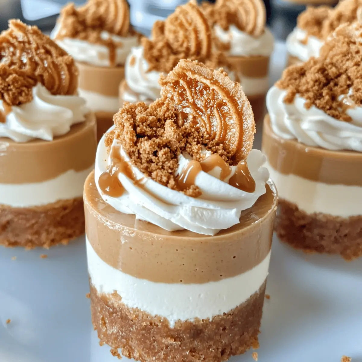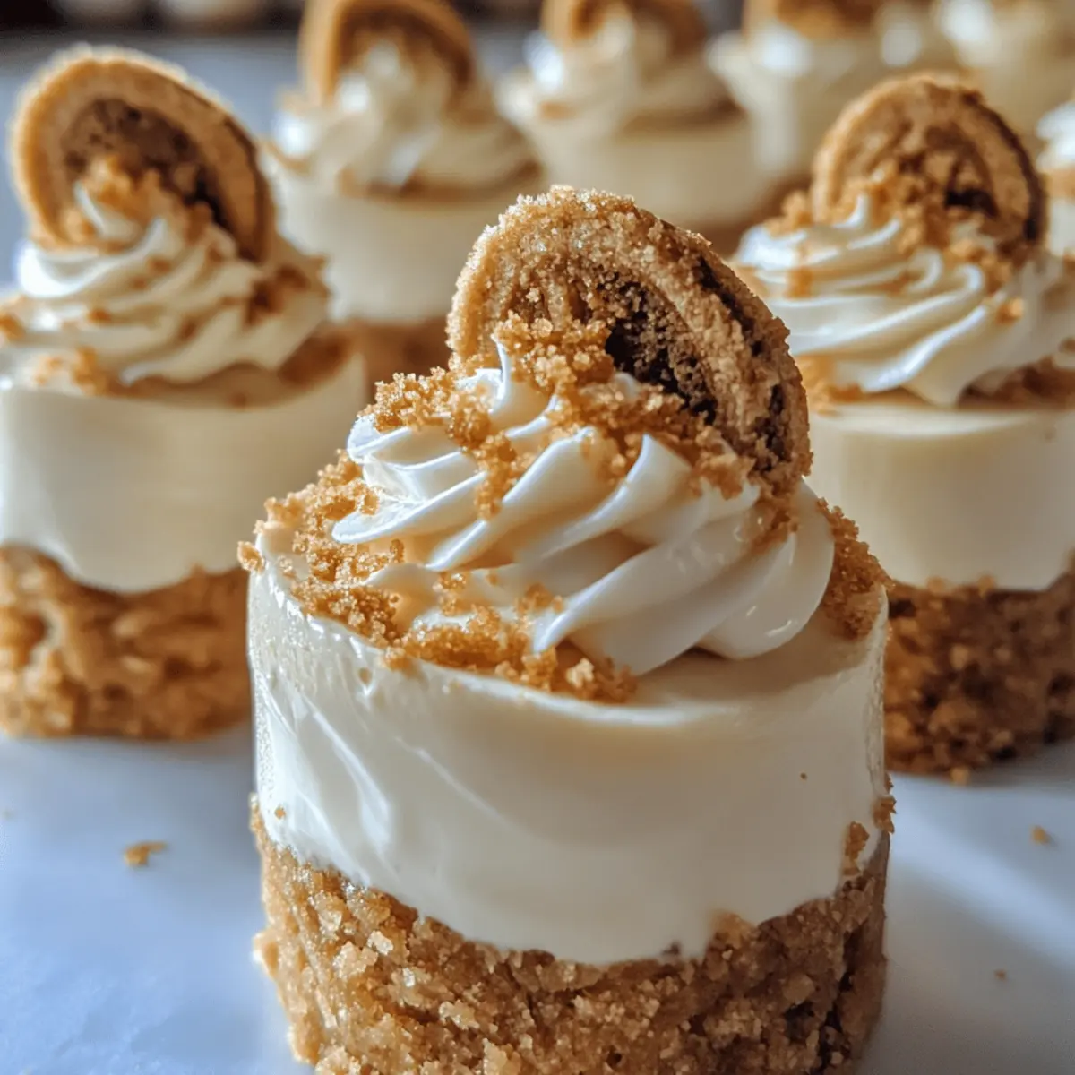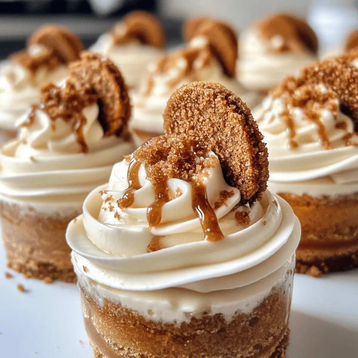 “There’s something undeniably magical about combining creamy desserts with a hint of spice. That’s exactly what you’ll find in these No-Bake Mini Biscoff Cheesecakes. With a luscious cream cheese filling infused with cookie butter, all nestled in a crunchy Biscoff cookie crust, these little delights are both easy to make and utterly captivating. Not only are they a breeze to whip up—perfect for a last-minute gathering—but they also promise to enchant your taste buds with every bite. Picture impressing your friends and family with a dessert that’s as charming as it is delicious. Are you ready to dive into a world where cheesecake meets cookie butter bliss?” Why Are Mini Biscoff Cheesecakes So Special? Irresistible Flavor: These mini cheesecakes combine creamy cream cheese with the warm spice of cookie butter, creating a dessert experience that’s utterly unforgettable. No-Bake Convenience: Perfect for those busy weeknights, you can whip these up in no time and let the fridge do the rest. Crowd-Pleasing Treat: Whether it’s a family gathering or a casual get-together with friends, these delightful bites are sure to impress everyone at the table. Versatile Variations: Feel free to explore! Try substituting with Nutella or incorporate fruit preserves for a unique twist. Gorgeous Presentation: Topped with a drizzle of cookie butter and a decorative Biscoff cookie, they look as stunning as they taste, making them an ideal choice for any occasion. So, if you love indulgent desserts, give these Mini Biscoff Cheesecakes a try and watch them vanish in no time! Mini Biscoff Cheesecake Ingredients • Create these delightful mini Biscoff cheesecakes with this simple ingredient list! For the Crust Biscoff Cookie Crumbs – This base adds sweetness and the signature crunch essential for a great cheesecake crust. Granulated Sugar – Enhances the overall sweetness, making your crust irresistibly tasty. Salted Butter (melted) – Binds the crust ingredients together and lends a rich flavor. For the Cheesecake Filling Cream Cheese (room temperature) – The main ingredient that provides a creamy texture and a rich flavor. Powdered Sugar – Sweetens while stabilizing the cheesecake mixture to prevent it from falling flat. Biscoff Spread (cookie butter) – Infuses the filling with its signature spice; don’t skip this for that cookie butter goodness! Vanilla Extract – Elevates the overall flavor with a warm, comforting note. Heavy Cream – Whipped to ensure your cheesecake is light and fluffy! For the Topping More Biscoff Spread (for drizzle) – Adds an extra layer of flavor and a beautiful finish to your cheesecakes. Biscoff Cookies (halved for decoration) – Crunchy little touches that contribute additional flavor and visual appeal. With these Mini Biscoff Cheesecake ingredients, you’ll be on your way to crafting a dreamy dessert that everyone will love! Enjoy the baking adventure! Step‑by‑Step Instructions for Mini Biscoff Cheesecakes Step 1: Prepare the Crust In a mixing bowl, combine Biscoff cookie crumbs, granulated sugar, and melted salted butter until well blended. Using a small cookie scoop, evenly portion the mixture into mini cheesecake pans, pressing down firmly to create a solid base. Aim for a slightly raised edge that holds its shape well. This process typically takes about 10 minutes, and the golden crust will set up beautifully once chilled. Step 2: Make the Cheesecake Filling In a separate bowl, use an electric mixer to beat the room-temperature cream cheese until smooth and creamy, which should take around 2–3 minutes. Gradually incorporate powdered sugar, Biscoff spread, and vanilla extract, mixing until fully combined. Then, slowly add the heavy cream, continuing to beat until the mixture thickens and becomes fluffy, approximately 4–5 minutes. You’re looking for a light, airy consistency that’s perfect for your Mini Biscoff Cheesecakes. Step 3: Assemble the Cheesecakes Carefully pipe the cheesecake filling onto each prepared cookie crust, slightly overfilling to create a delightful dome shape. Ensure the filling is evenly distributed among the cases. Once assembled, cover the mini cheesecakes with plastic wrap and refrigerate for at least 12 hours—or overnight—for optimal texture and flavor. Patience is key for these Mini Biscoff Cheesecakes, allowing them to set beautifully. Step 4: Prepare Whipped Cream In a clean mixing bowl, whip heavy cream with powdered sugar and vanilla extract until medium-stiff peaks form, roughly 3–5 minutes at high speed. The whipped cream should hold its shape but remain light and airy, perfect for adding that special touch to your cheesecakes. Set aside in the refrigerator until you are ready to finish your Mini Biscoff Cheesecakes. Step 5: Finish Assembly Gently melt additional Biscoff spread in the microwave for about 15–20 seconds, just until pourable. Drizzle the melted spread generously over the chilled cheesecakes, allowing it to cascade beautifully down their sides. Top each cheesecake with a dollop of whipped cream, sprinkle finely crushed Biscoff cookie crumbs over the cream, and finish with half a Biscoff cookie for eye-catching decoration. These visual cues will make your Mini Biscoff Cheesecakes irresistible! How to Store and Freeze Mini Biscoff Cheesecakes Fridge: Keep mini Biscoff cheesecakes in an airtight container, where they’ll stay fresh for up to 3 days. This ensures they retain their creamy texture and delightful flavor. Freezer: For longer storage, you can freeze these cheesecakes! Wrap each cheesecake individually in plastic wrap and place them in an airtight container. They can be frozen for up to 2 months. Thawing: To enjoy, simply move the cheesecakes from the freezer to the fridge and let them thaw overnight. Refrain from refreezing after they’ve been thawed for the best taste and texture. Reheating: Enjoy these cheesecakes chilled right from the fridge—there’s no need to he