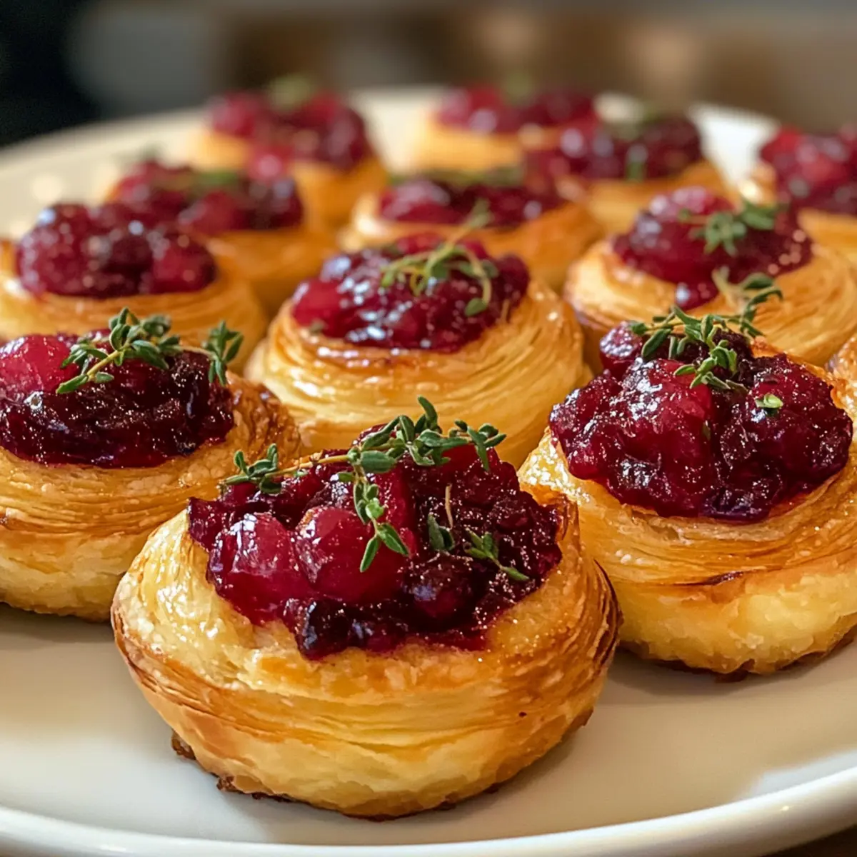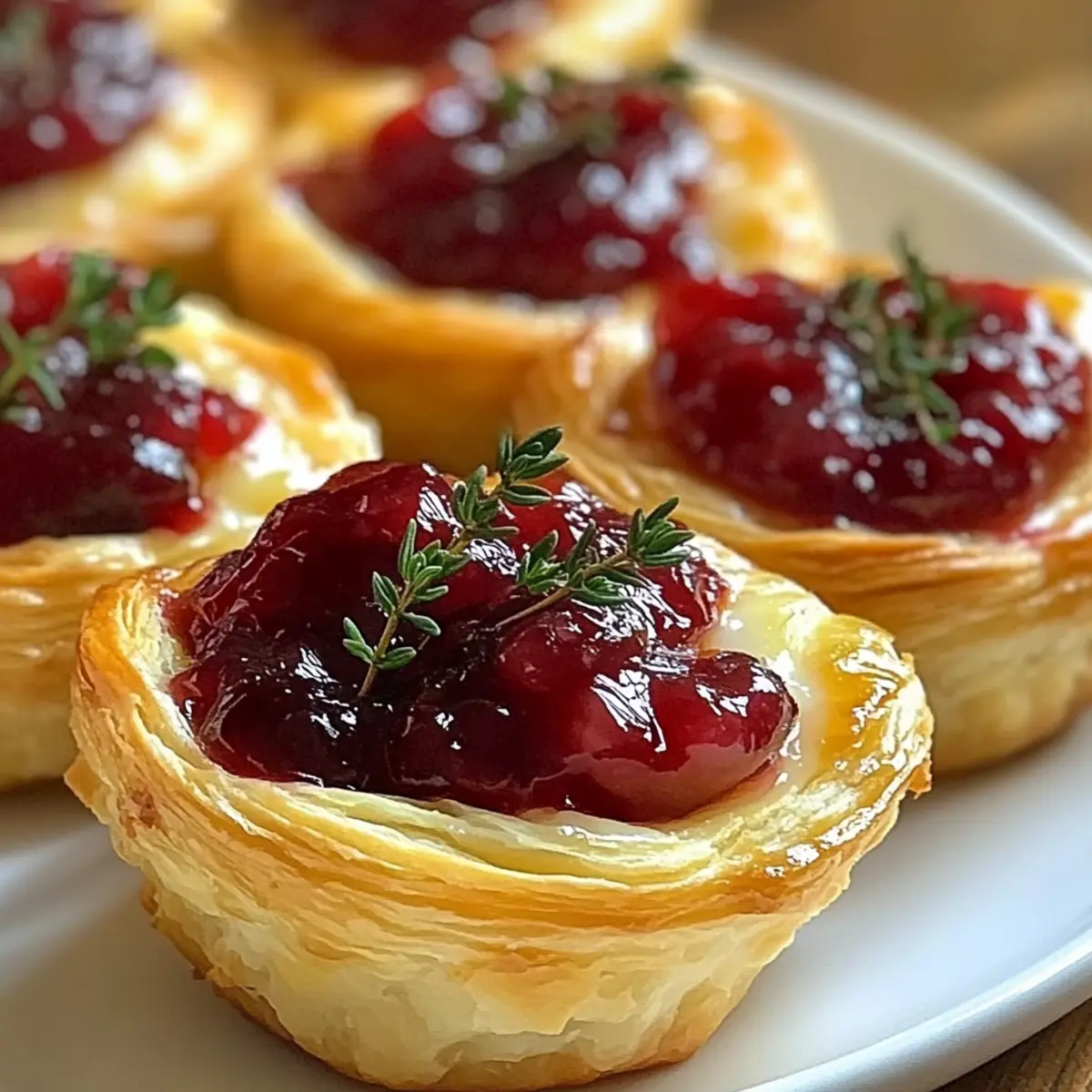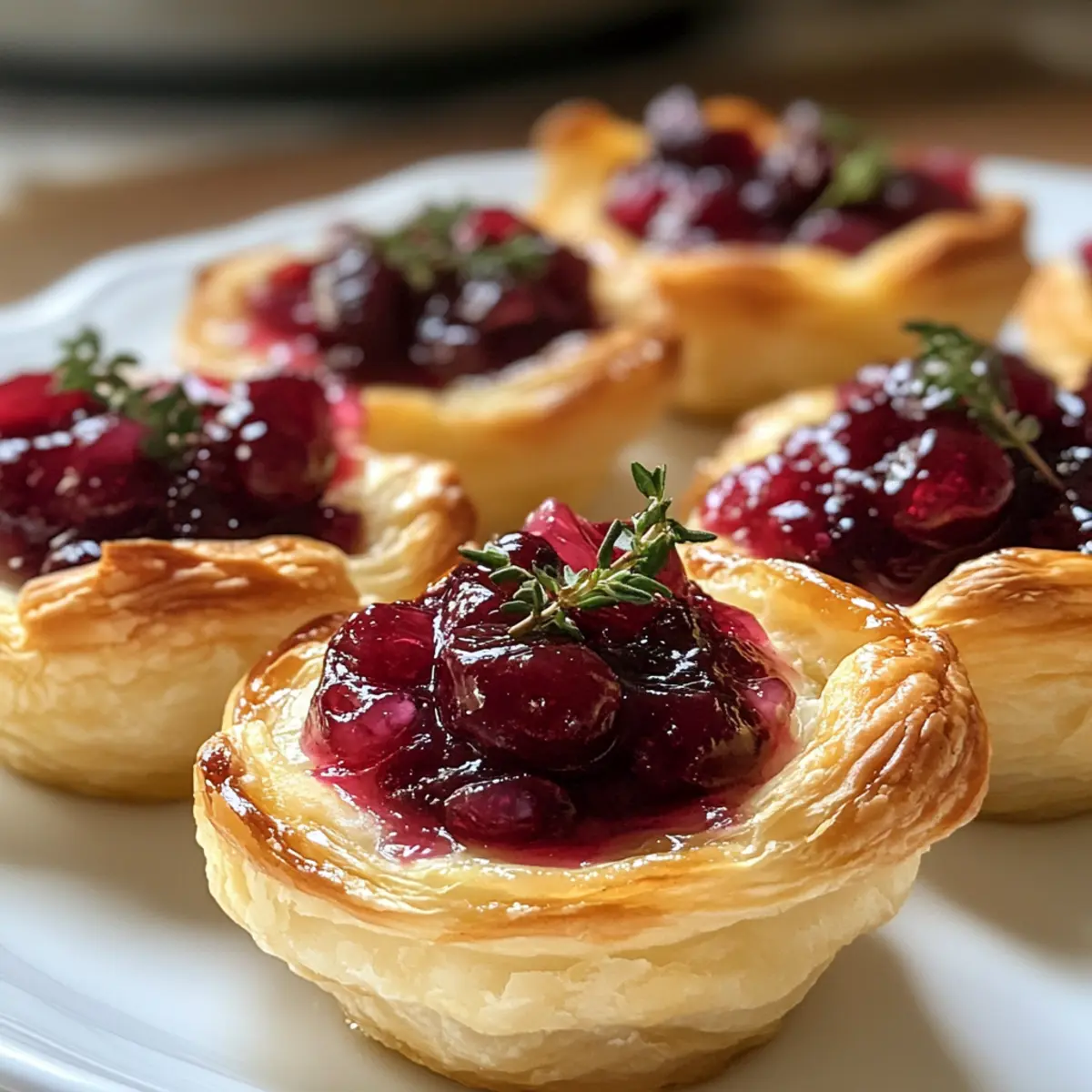 The aroma of baking pastry wafts through the kitchen, instantly transporting me to festive gatherings filled with laughter and joy. One of my go-to holiday appetizers is the irresistible Mini Cranberry Brie Bites with Puff Pastry. These delightful little treats are an absolute crowd-pleaser, featuring warm, creamy brie enveloped in flaky pastry and topped with tangy cranberry sauce. What I love most is that they come together in just 25 minutes, making them perfect for those spontaneous get-togethers. Plus, they can be easily made ahead of time, allowing you to spend more moments enjoying the company of friends and family rather than stressing in the kitchen. Curious about how to elevate your next celebration with these festive bites? Let’s dive into the recipe! Why Are Mini Cranberry Brie Bites Irresistible? Simplicity at Its Best: These Mini Cranberry Brie Bites require minimal effort—just a quick 25 minutes from start to finish. Crowd-Pleasing Appeal: They are the perfect starter for holiday gatherings, loved by both kids and adults alike. Unique Flavor Combination: The blend of creamy brie and tart cranberry sauce creates a delightful explosion of taste in every bite. Make Ahead Magic: Assemble these bites a day in advance and pop them in the oven just before serving, so you can focus on enjoying the festivities. Versatile Options: Feel free to swap out the cranberry sauce for fig jam or caramelized onions to add your own twist! Elevate your holiday gatherings with these delectable bites. If you’re also looking for something sweet, don’t miss out on my Mini Rolo Cheesecakes for a fabulous dessert option. Mini Cranberry Brie Bites Ingredients • Prepare to delight your guests with these irresistible treats! For the Pastry Puff Pastry – Ensure it’s thawed for easy handling; frozen pastry works best here. Egg (for wash) – Use for a beautiful golden finish; omit for a vegan option. For the Filling Brie Cheese – Cut into small cubes to encourage easy melting; a vegan brie is a fantastic substitute. Cranberry Sauce – Adds the perfect sweet and tangy flavor; feel free to swap it with fig jam or caramelized onions for a unique twist. Fresh Thyme – Imparts aromatic notes that enhance the overall taste; consider chopped pistachios for a crunchy alternative. Prepare these Mini Cranberry Brie Bites with Puff Pastry and watch them disappear at your next festive gathering! Step‑by‑Step Instructions for Mini Cranberry Brie Bites with Puff Pastry Step 1: Preheat the Oven and Prepare the Muffin Tin Start by preheating your oven to 400°F (200°C). While the oven warms up, take a mini muffin tin and grease it lightly with cooking spray or line it with paper liners. This will help the pastry release easily after baking and ensure every bite is perfectly crispy and delicious. Step 2: Roll Out the Puff Pastry Once your oven is preheated, roll out the thawed puff pastry on a lightly floured surface. Use a round cookie cutter or a glass to cut out 24 circles, each about 2 inches in diameter. Make sure you aim for uniform circles, as they will shape the cups to hold the rich brie and cranberry filling just right. Step 3: Form the Pastry Cups Gently press each puff pastry circle into the wells of the greased muffin tin, making sure to shape them into cups that hug the sides. Be careful not to stretch the dough too thin; it should be snug but still maintain its flakiness. This forms the perfect little harbor for the warm, melty brie and tart cranberry sauce. Step 4: Add the Brie and Cranberry Sauce Into each pastry cup, place a single cube of brie cheese, allowing its creamy goodness to shine. Follow this by adding a teaspoon of cranberry sauce on top of the brie. For added flavor, sprinkle a pinch of salt and pepper over each bite, enhancing the delightful contrast of flavors in these Mini Cranberry Brie Bites with Puff Pastry. Step 5: Brush with Egg Wash In a small bowl, beat an egg to create an egg wash, which enhances the golden color of your bites. Using a pastry brush, gently brush the edges of the pastry cups with the egg wash, ensuring every nook is covered. This step not only elevates the appearance but also adds a delicious richness to the finished product. Step 6: Bake to Perfection Place the muffin tin in the preheated oven and bake for 12–15 minutes, or until the pastry becomes golden brown and puffs up beautifully. Keep an eye on them as they bake; the visual cue of puffing and a golden hue will tell you when they’re ready. Step 7: Cool and Garnish Once baked to perfection, remove the mini muffin tin from the oven and let the bites cool for about 2 minutes. This slight cooling will make them easier to handle. For a finishing touch, garnish with fresh thyme or a sprinkle of chopped nuts, adding a lovely aroma and extra flavor to your festive appetizers. What to Serve with Mini Cranberry Brie Bites with Puff Pastry Creating the perfect holiday spread is all about pairing flavors and textures that delight the senses and bring warmth to every gathering. Crispy Green Salad: A fresh salad with crisp greens and a tangy vinaigrette balances the richness of the bites, adding a refreshing contrast to every bite. Savory Meat Platter: Include a selection of cured meats like prosciutto or salami that perfectly complements the creamy brie and sweet cranberry, inviting guests to savor each option. Roasted Veggies: Roasted Brussels sprouts or carrots drizzled with honey add earthy flavors and enhance the holiday vibe, making your table feel vibrant and full of life. Creamy Mashed Potatoes: The velvety texture of buttery mashed potatoes complements the crispiness of the bites, creating a comforting and satisfying experience all around. Sparkling Cider: Pouring a glass or two of bubbly sparkling cider adds a festive touch, balancing the savory with a sweet fizz that’s pleasing to all palates. Chocolate Fondue: For a sweet ending to your gathering, serve a chocolate fondue with assor