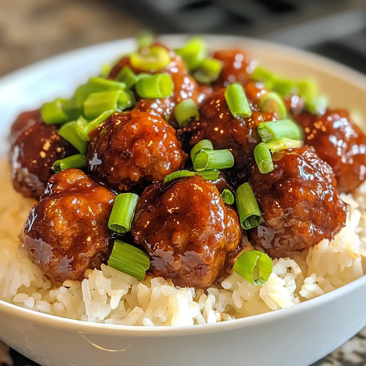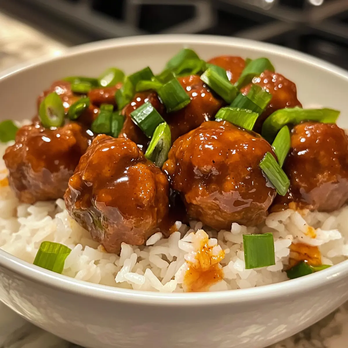 6. Serve meatballs hot over rice, garnished with sliced green onions.