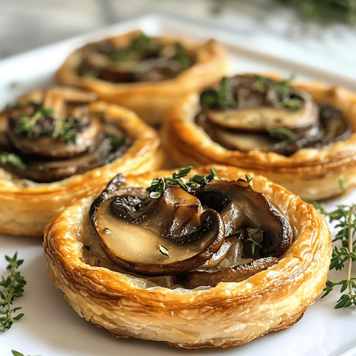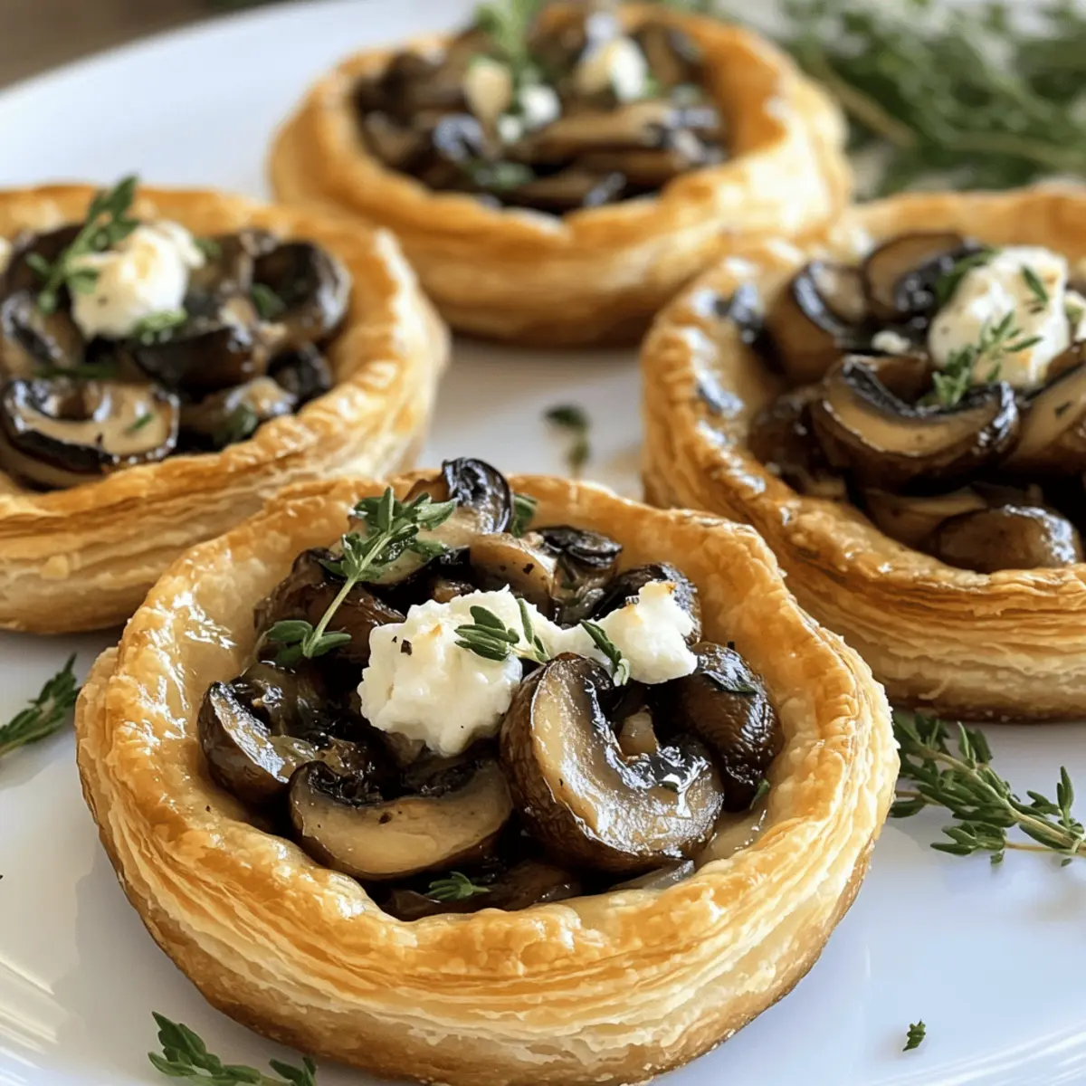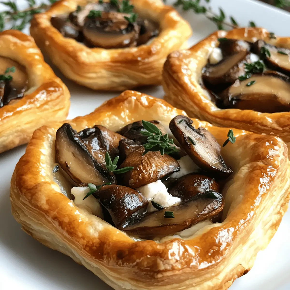 As I stood in my kitchen, the golden hue of the setting sun streamed through the window, casting a warm glow over my ingredients. A perfect moment for preparing Mushroom, Shallot, and Herbed Goat Cheese Tarts. This elegant appetizer marries the rich, earthy flavors of sautéed mushrooms with the creamy tang of goat cheese, all encased in a flaky puff pastry that practically melts in your mouth. With their quick prep time and stunning presentation, these tarts are ideal for impressing guests at dinner parties or elevating a cozy night in. Plus, they are vegetarian-friendly, making them a hit with everyone around the table! Who wouldn’t want to dive into a delicious bite of these delightful tarts? Why are Mushroom Goat Cheese Tarts a must-try? Irresistible Flavors: The combination of rich, earthy mushrooms and creamy goat cheese creates a flavor explosion that’s simply addictive. Easy Prep: With minimal ingredients and straightforward steps, you’ll have this stunning appetizer ready in no time—perfect for busy weeknights or last-minute gatherings. Versatile Options: Feel free to customize these tarts with different herbs or cheese varieties, just like our delicious Pistachio Mushroom Cheesecake or use seasonal veggies for a fresh twist. Crowd-Pleasing Appeal: They’re not just visually appealing; they tantalize your taste buds and impress your guests! Serve with a side of fresh salad or charcuterie for an elegant dining experience. Perfect for Any Occasion: Whether it’s a fancy party or a casual get-together, these tarts adapt effortlessly to any event, making them a necessity in your recipe repertoire! Mushroom Goat Cheese Tarts Ingredients For the Pastry • Puff Pastry – 1 sheet; ensures a light and flaky base, simply thaw if frozen. For the Filling • Mushrooms – 8 ounces, finely chopped (cremini or button); adds depth of flavor; shiitake or portobello can be richer alternatives. • Shallots – 2 medium, finely diced; offers a milder onion flavor; can swap with sweet onions if preferred. • Garlic – 2 cloves, minced; infuses aromatic depth; feel free to use garlic powder as a substitute. • Goat Cheese – 8 ounces, softened; the star ingredient for creaminess; ricotta or a mix of cheeses can enhance flavor variety. • Fresh Herbs – 2 tablespoons (thyme, rosemary, or parsley), chopped; elevates flavor and presentation; dried herbs can stand in at one-third the amount. • Olive Oil – 2 tablespoons; ideal for sautéing the vegetables; butter is a lovely alternative for added richness. • Salt and Pepper – To taste; essential for balancing flavors in your Mushroom Goat Cheese Tarts. Feel free to customize as you go, but these ingredients will give you a perfect starting point for a delightful experience! Step‑by‑Step Instructions for Mushroom Goat Cheese Tarts Step 1: Preheat Oven Begin by preheating your oven to 400°F (200°C) to create the perfect environment for the puff pastry to rise beautifully. This initial step ensures that your Mushroom Goat Cheese Tarts will achieve that delightful golden and flaky texture. As the oven warms, gather your ingredients and prepare your work surface for rolling out the puff pastry. Step 2: Prepare Puff Pastry On a lightly floured surface, roll out the thawed sheet of puff pastry to about 1/8 inch thick. Use a sharp knife or pizza cutter to slice the pastry into 3–4 inch squares or circles. This size will provide a generous base for your filling. Make sure the dough stays cool; if it gets too warm, refrigerate while you prepare the filling for the Mushroom Goat Cheese Tarts. Step 3: Sauté Vegetables In a large skillet, heat 2 tablespoons of olive oil over medium heat. Once shimmering, add the finely diced shallots and sauté for about 2–3 minutes, or until they become translucent. Next, stir in the minced garlic and chopped mushrooms. Cook everything together for an additional 5–7 minutes until the mushrooms are tender and any released moisture has evaporated. Season with salt and pepper to elevate the flavors. Step 4: Mix Filling After the sautéed mixture has cooled slightly, transfer it to a mixing bowl. Add 8 ounces of softened goat cheese and 2 tablespoons of your choice of fresh herbs—such as thyme, rosemary, or parsley. Blend everything together until well combined, creating a creamy and flavorful filling for the Mushroom Goat Cheese Tarts. This step is crucial for ensuring that every bite is packed with delicious flavor. Step 5: Assemble Tarts Line a baking sheet with parchment paper to prevent sticking. Lay the pastry squares or circles on the sheet, making sure to leave enough space between each piece. Using a fork, gently prick the center of each pastry, creating a border for the filling. Spoon a generous amount of the goat cheese mixture into the center of each tart, ensuring to leave a small border around the edge for a perfectly puffy crust. Step 6: Bake Carefully place the baking sheet in your preheated oven and bake the tarts for 15–20 minutes. Keep an eye on them as they cook; you want a beautiful golden brown color with a puffed-up appearance. This is the moment when your Mushroom Goat Cheese Tarts transform into delightful bites of elegance. Step 7: Cool and Serve Once baked, remove the tarts from the oven and allow them to cool on the baking sheet for a few minutes. This brief cooling period helps the filling set slightly, making them easier to serve. Enjoy the tarts warm or at room temperature, savoring the harmonious blend of textures and flavors in every mouthful. Make Ahead Options These Mushroom Goat Cheese Tarts are perfect for busy home cooks looking to save time without sacrificing flavor! You can prepare the filling of sautéed mushrooms, shallots, garlic, and goat cheese up to 3 days in advance. Store it in an airtight container in the refrigerator to maintain its creamy texture. Additionally, you can cut and shape the puff pastry up to 24 hours ahead; simply keep it wrapped