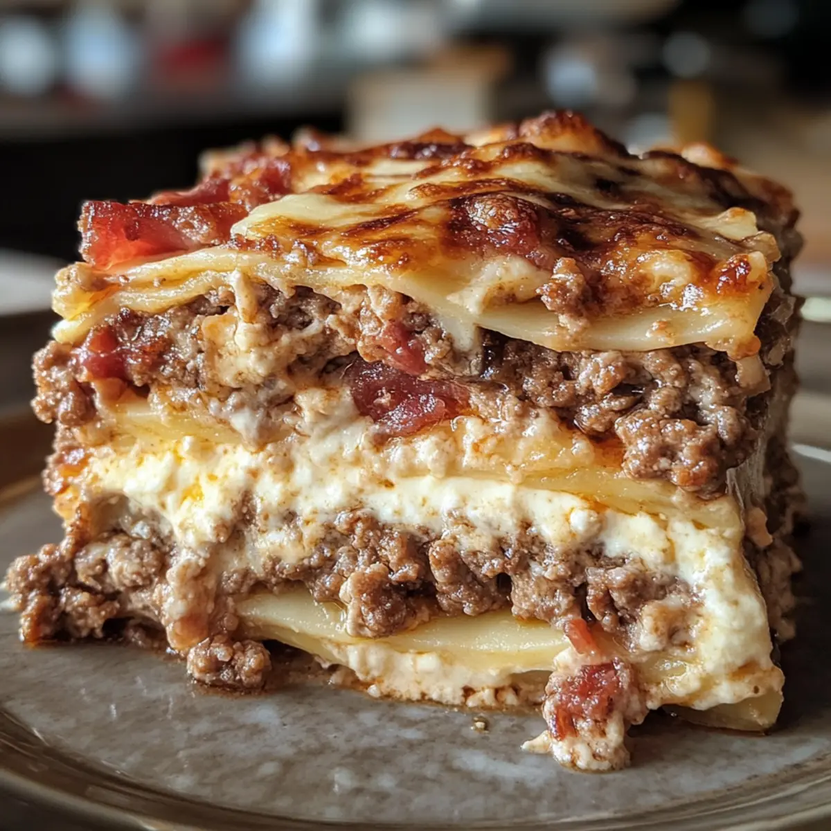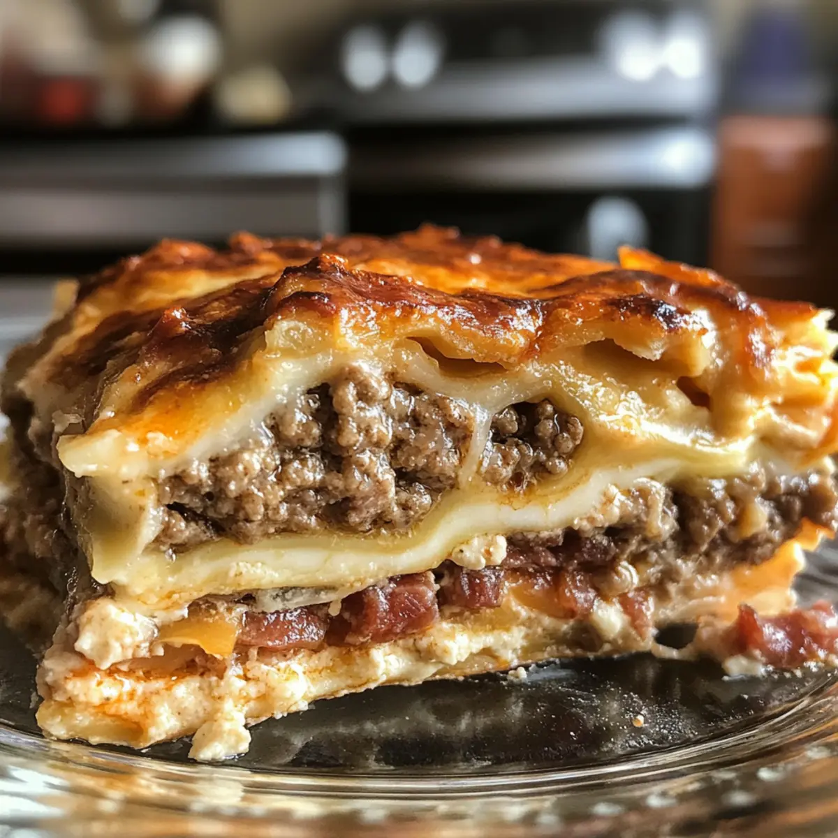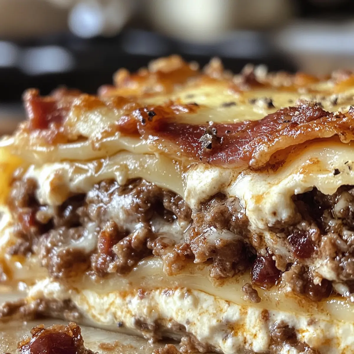 Walking into my kitchen one rainy afternoon, the aroma of sizzling bacon and garlic whisked me back to my childhood, where comfort food reigned supreme. Today, I’m thrilled to share my take on a classic: Parmesan Garlic Bacon Cheeseburger Lasagna. This dish is a beautiful mashup that marries the heartiness of a juicy cheeseburger with the warm, welcoming layers of lasagna. With the crunch of crispy bacon and a creamy Parmesan garlic béchamel, it’s a family-friendly delight that’s customizable to fit any dietary preference. Whether you’re hosting a cozy dinner with loved ones or simply craving hearty comfort food, this lasagna is sure to be a hit. Who’s ready to dive into this flavor-packed journey? Why Is This Lasagna a Must-Try? Comforting Fusion: This Parmesan Garlic Bacon Cheeseburger Lasagna combines the best elements of two beloved comfort foods, making it perfect for satisfying those cozy cravings. Family-Friendly Fun: Kids and adults alike will love the playful twist on classic flavors, ensuring everyone gathers around the table for seconds! Customizable Delight: Whether you want to go gluten-free or vegetarian, this recipe easily adapts to suit your dietary needs. Swap the ground beef for lentils or use zucchini noodles for a fresh twist! Quick to Prepare: Efficient cooking steps mean you’ll have this delicious dish in the oven in no time—ideal for busy weeknights when you need to feed the family. Irresistible Layers: The combination of creamy béchamel, crispy bacon, and cheesy goodness will have everyone grinning from ear to ear, making it a crowd-pleaser at any gathering! For more delicious variations, check out Garlic Shrimp Mashed or Cheesy Garlic Butter for a flavorful twist! Parmesan Garlic Bacon Cheeseburger Lasagna Ingredients For the Meat Sauce • Ground Beef – Primary protein source, creating a meaty base for flavor; substitute with plant-based ground to make vegetarian. • Small Onion – Adds sweetness and depth to the meat sauce; use shallots for a milder flavor. • Garlic Cloves – Provides aromatic flavor; use garlic powder if fresh garlic isn’t available. • Crispy Cooked Bacon – Contributes a crunchy texture and smoky flavor; turkey bacon can be used as a lighter alternative. • Marinara Sauce – Base for the meat sauce for moisture and acidity; substitute with homemade tomato sauce for a fresher taste. • Italian Seasoning – Enhances flavor profile of meat sauce; mix of dried herbs can be used if unavailable. • Smoked Paprika – Adds a subtle smokiness to the dish; regular paprika can be used in its place. • Salt & Pepper – Essential for seasoning; adjust according to taste. For the Béchamel Sauce • Unsalted Butter – Base for the béchamel sauce; can be replaced with olive oil for a healthier option. • All-Purpose Flour – Used to thicken béchamel sauce; use a gluten-free flour blend for a gluten-free version. • Whole Milk – Creates creamy béchamel texture; substitute with almond or oat milk for a non-dairy version. • Grated Parmesan Cheese – Key flavor in béchamel and topping; adds nuttiness. • Garlic Powder – Compliments the béchamel with garlic flavor; can be omitted if fresh garlic is used. For Assembly • Lasagna Noodles – Forms the layered structure of the dish; zucchini noodles may substitute for a low-carb option. • Shredded Mozzarella – Provides meltiness and creaminess; substitute with provolone for a different flavor. • Shredded Cheddar – Adds sharpness and flavor; Monterey Jack or Gouda can be used instead. • Grated Parmesan (for topping) – Finishing touch for flavor and texture. • Chopped Fresh Parsley (optional) – Adds freshness and color; can be omitted. This Parmesan Garlic Bacon Cheeseburger Lasagna is a delightful dish that promises warmth and comfort with every bite! Step‑by‑Step Instructions for Parmesan Garlic Bacon Cheeseburger Lasagna Step 1: Prepare the Meat Sauce In a large skillet over medium heat, brown 1 pound of ground beef along with a finely chopped small onion for about 4-5 minutes until the meat is no longer pink. Stir in 2 minced garlic cloves and sauté for another minute. Next, add in the marinara sauce, crumbled crispy cooked bacon, Italian seasoning, smoked paprika, salt, and pepper. Let the mixture simmer for 10 minutes, allowing the flavors to meld, then set aside. Step 2: Make the Béchamel Sauce In a saucepan, melt 4 tablespoons of unsalted butter over medium heat. Whisk in ¼ cup of all-purpose flour and cook gently for 1-2 minutes until bubbly. Gradually pour in 2 cups of whole milk while whisking constantly until the mixture thickens, which should take about 5 minutes. Once thickened, remove it from heat, and stir in 1 cup of grated Parmesan cheese, garlic powder, salt, and pepper, creating a creamy béchamel sauce. Step 3: Preheat the Oven Now that your sauces are ready, preheat your oven to 375°F (190°C). This ensures that your Parmesan Garlic Bacon Cheeseburger Lasagna bakes evenly. While the oven heats, gather all your components for assembling the layers, making the process smooth and efficient. Step 4: Assemble the Lasagna In a 9×13-inch baking dish, begin by spreading a generous layer of the meat sauce evenly on the bottom. Place a layer of cooked lasagna noodles over the meat sauce, followed by a layer of the béchamel sauce, then sprinkle some shredded mozzarella and cheddar cheese on top. Repeat these layers until all ingredients are used, finishing with a generous layer of cheese and a sprinkle of grated Parmesan on top. Step 5: Bake the Lasagna Cover the baking dish tightly with aluminum foil and bake in the preheated oven for 30 minutes. After 30 minutes, carefully remove the foil and bake uncovered for an additional 15 minutes, or until the cheese is bubbly and golden brown. Keep an eye on it to achieve a perfectly melted top. Step 6: Let It Rest Once baked, take the lasagna out of the oven and let it rest for about 